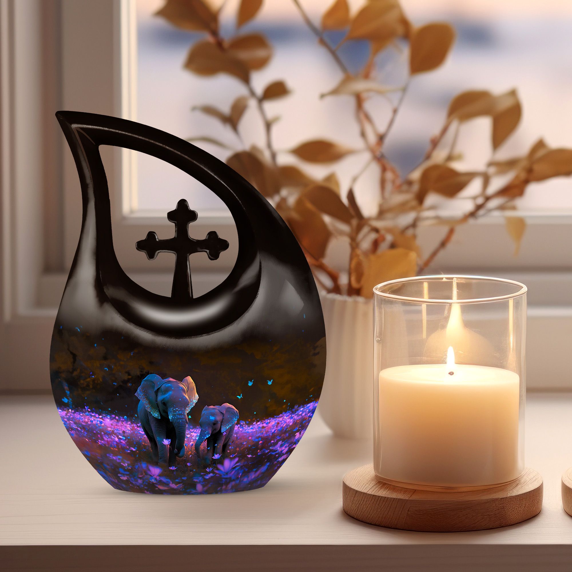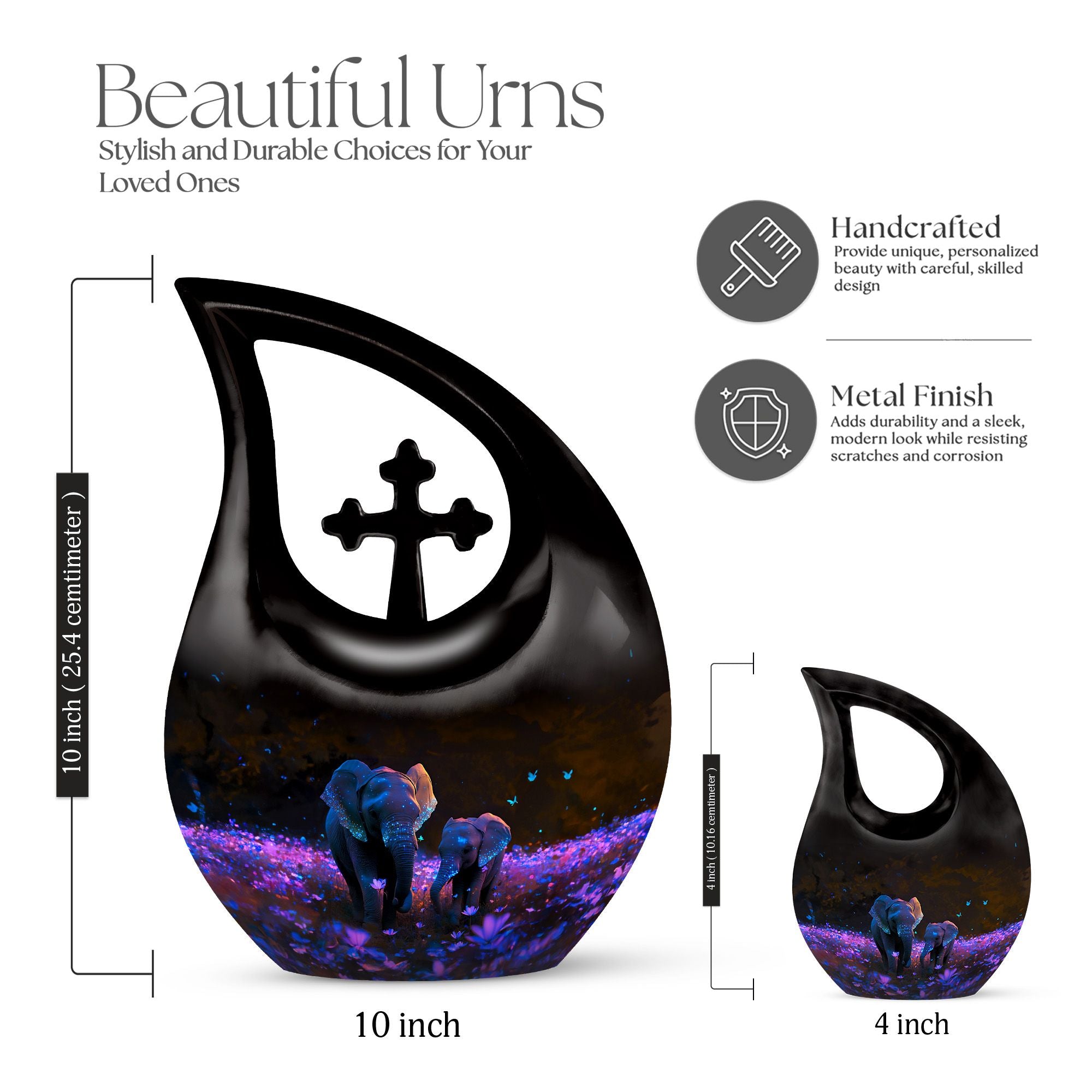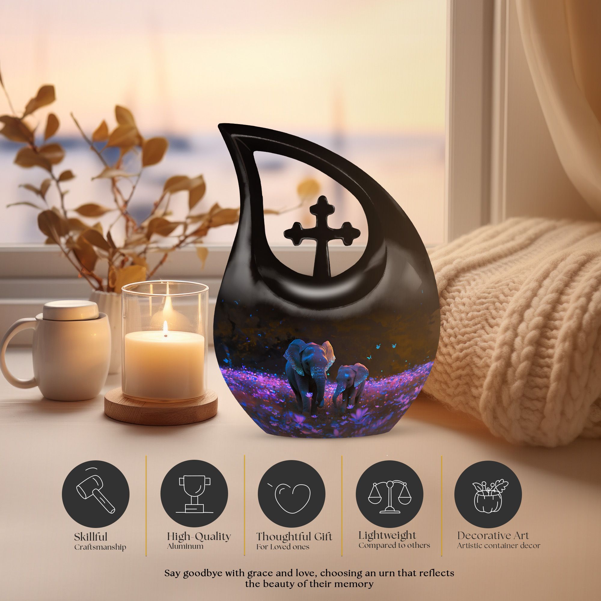 Crafted from premium aluminum, this human cremation urn features a stunning night meadow design illuminated by soft tones of indigo and silver. Two intricately engraved elephants stand side by side beneath a moonlit sky, symbolizing unity and peace. The polished surface and secure screw-top lid ensure safety and elegance, making it perfect for display or burial. Available as a single urn or cremation urns set, it provides a meaningful memorial for those who journeyed through life together.