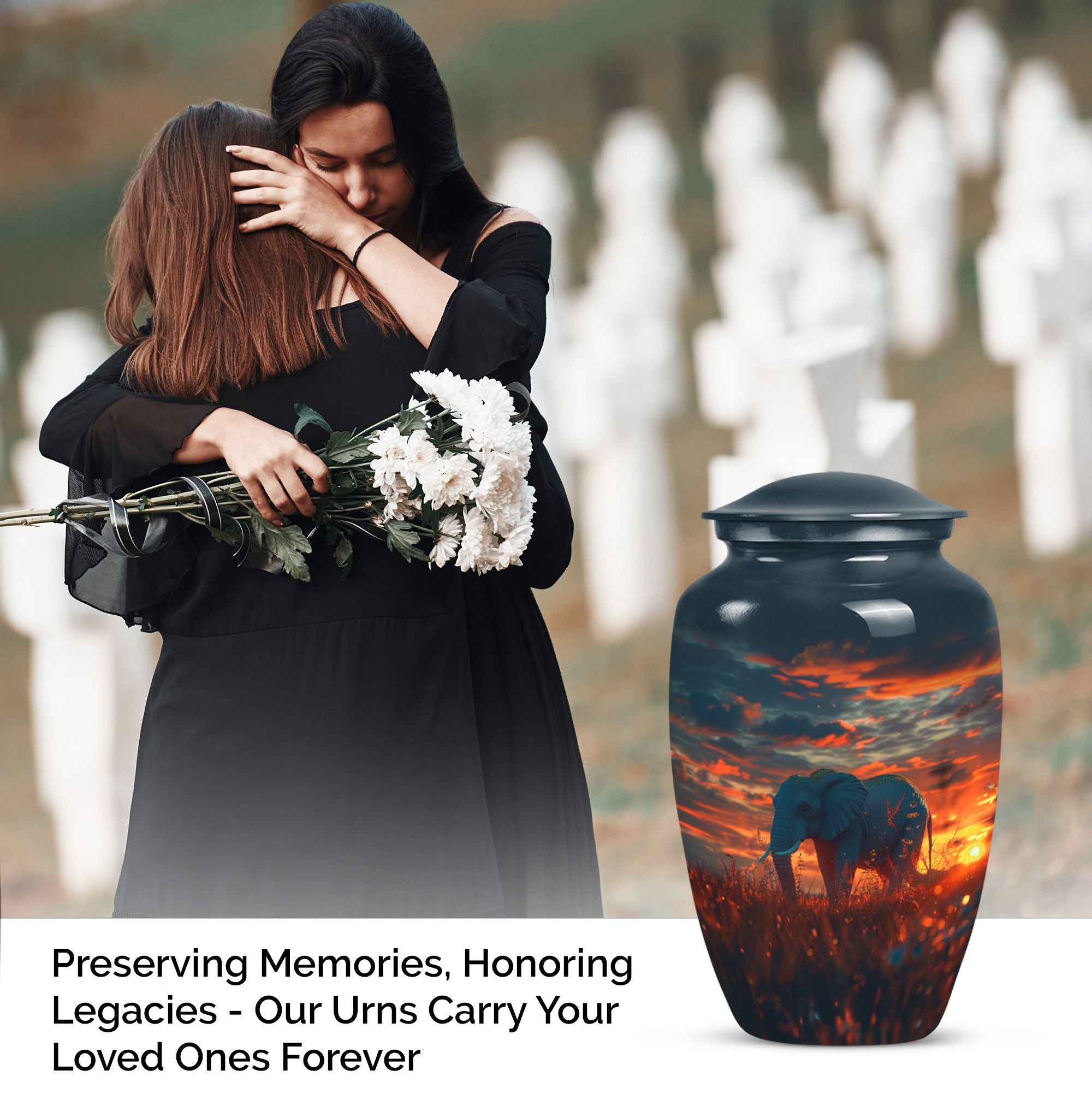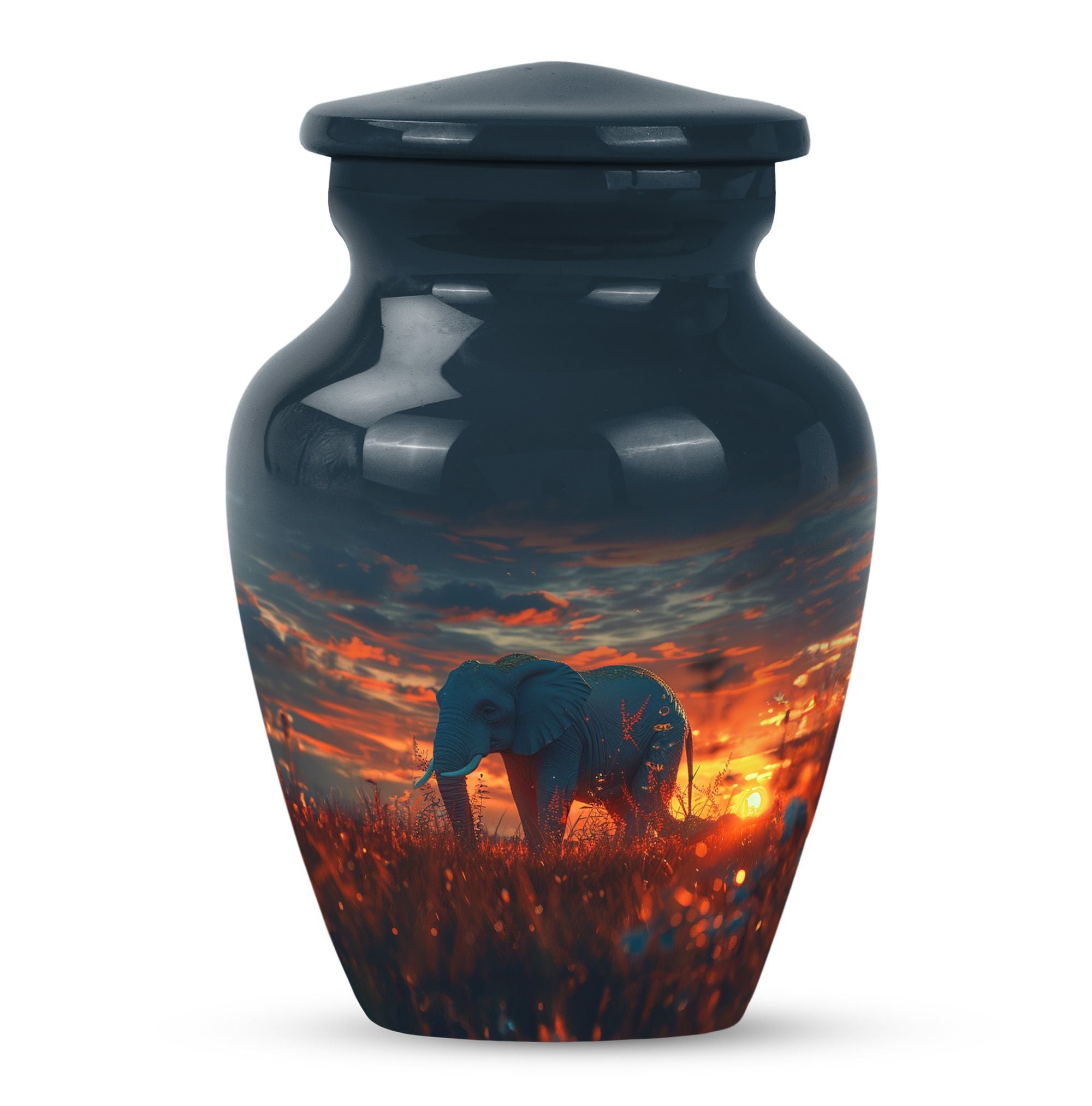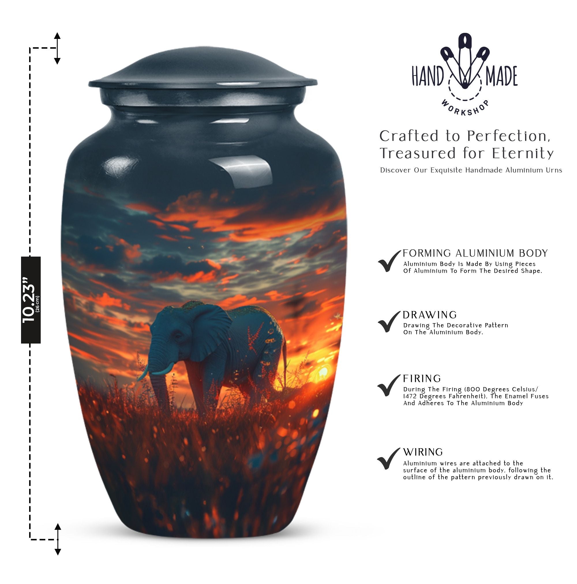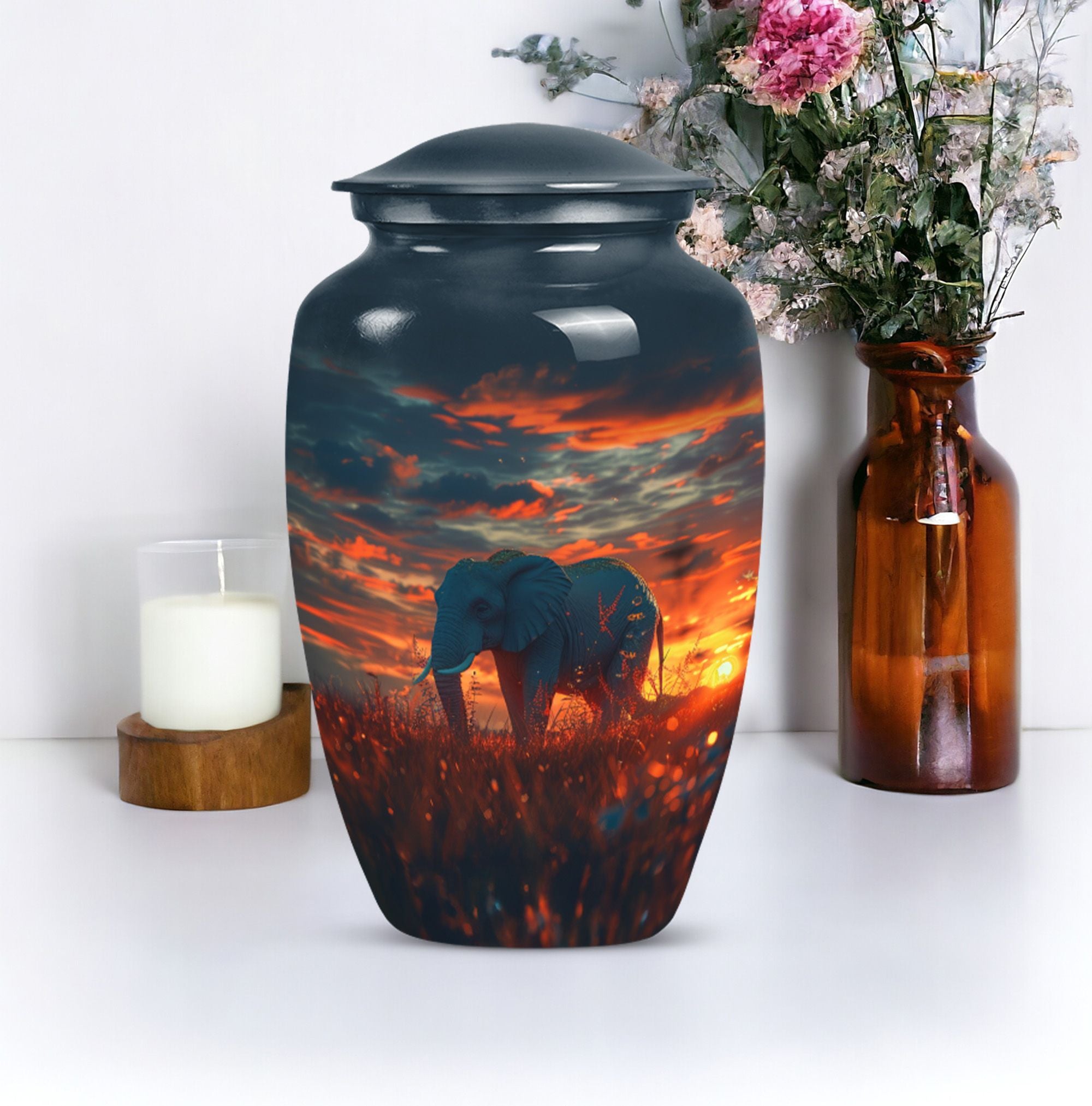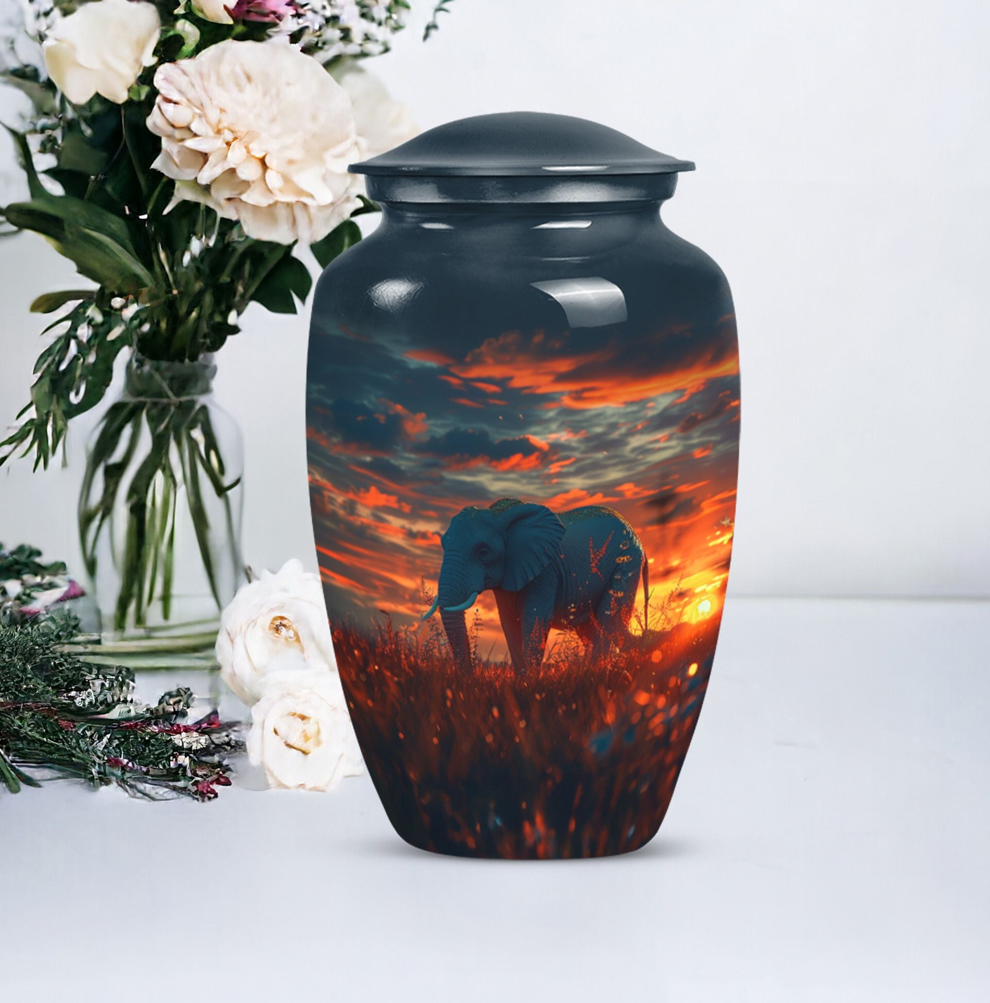 Experience a sense of solace and remembrance with our delicatelycrafted elephant urn. This 'Butterfly' themed memorial urn for women ashes provides an ethereal resting place for your beloved ones. Made from sturdy aluminium, this 10-inch Large Urn weighs a substantial 3.3 pounds and exhibits a 'Classic Urn' style. Its formidable dimensions and capacity of 200 cubic inches denote space ample enough to hold respectfully, the ashes of an adult female. Our cremation urn is customizable, allowing room for engraved names that would eternally symbolize your bond. Accompanied with a velvet pouch for containment of ashes, the utmost care is evident in our packaging. Elegant yet poignant, this elephant urn offers more than just a container for ashes; it offers a token of love and memory. This large urn, apt for ground burial, is designed while keeping in mind the needs of those searching for women urns, urns for human ashes and metal urns for human ashes of an adult female. Add this timeless piece to your memorial ceremony supplies, providing an embodiment of memory and emotion.