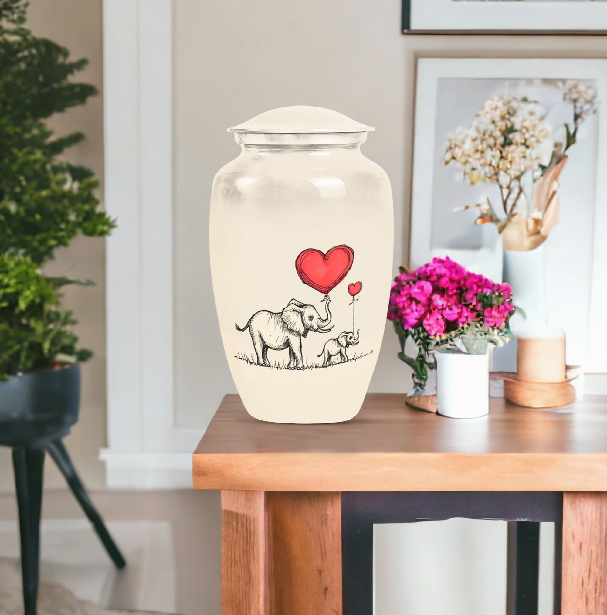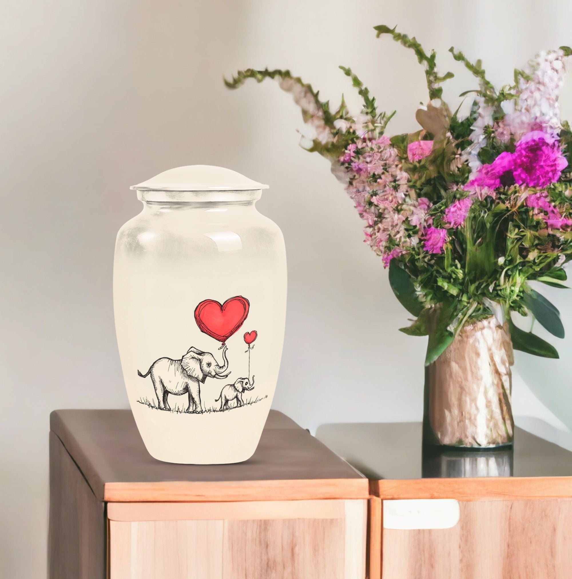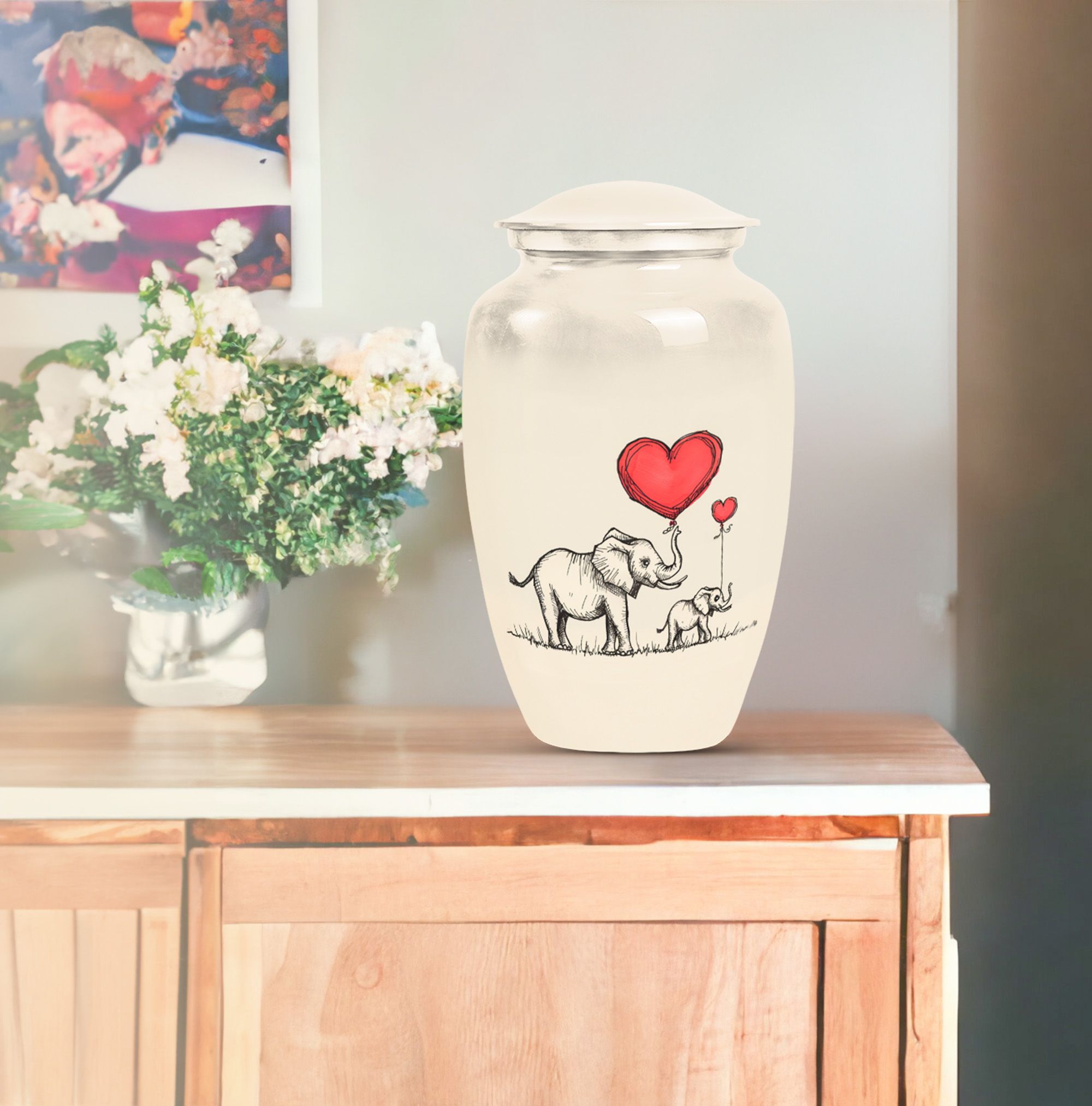 Elevate your tribute to your loved ones with our meticulously fashioned 10 Inch Elephant Family Urn. Crafted from robust aluminium, this large urn weighs a study 3.3 pounds and stands at a dignified height of 10 inches. Able to hold up to 200 cubic inches of remains, it offers ample space for adult human ashes, making it an apt choice for either men or women. The abstract theme adds an artistic touch to the classic urn design, which is further accentuated by the option to personalize it with engraved names. Each purchase includes a sumptuous velvet pouch, providing a delicate containment for the ashes. Ideal for anyone on the lookout for 'burial ash urns for humans', this 'cremation urn' perfectly balances tradition with modernity. The 'elephant family urn' captures a sense of unity and eternal connection, serving as a beautiful symbol of your everlasting bond with the departed.