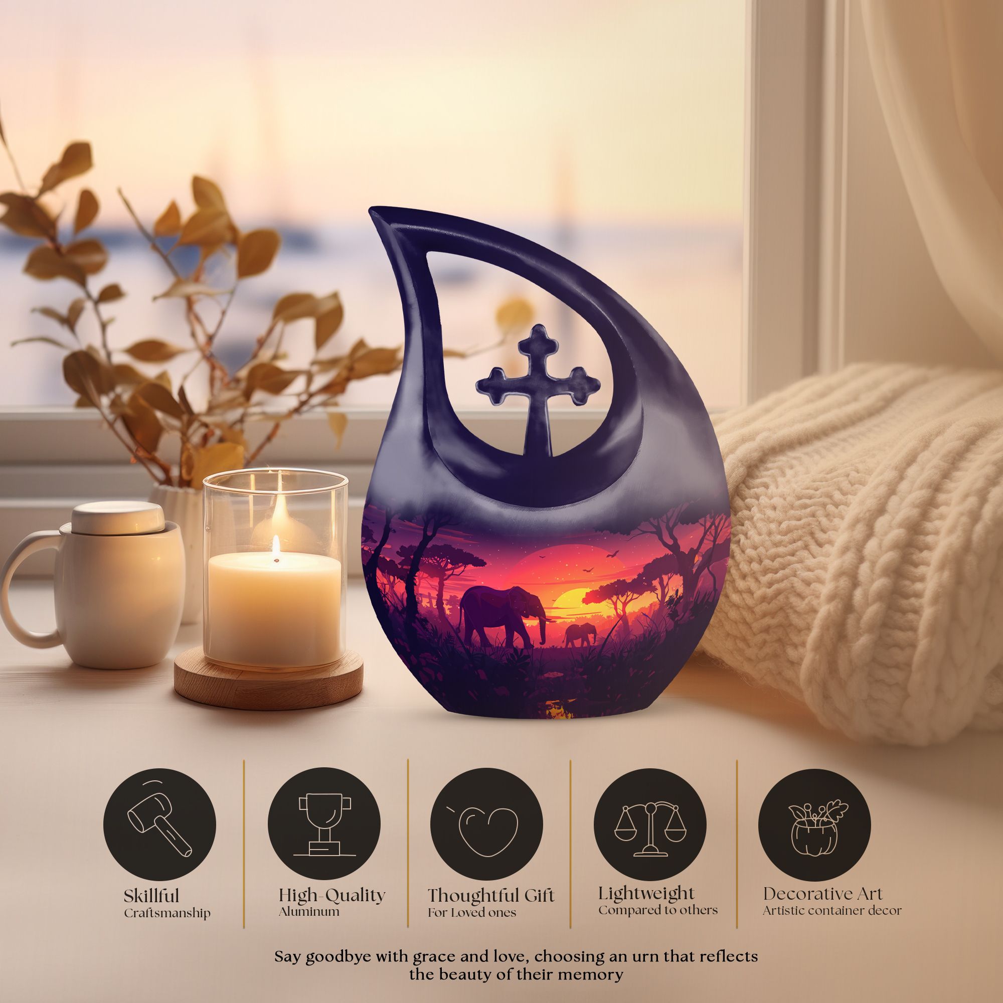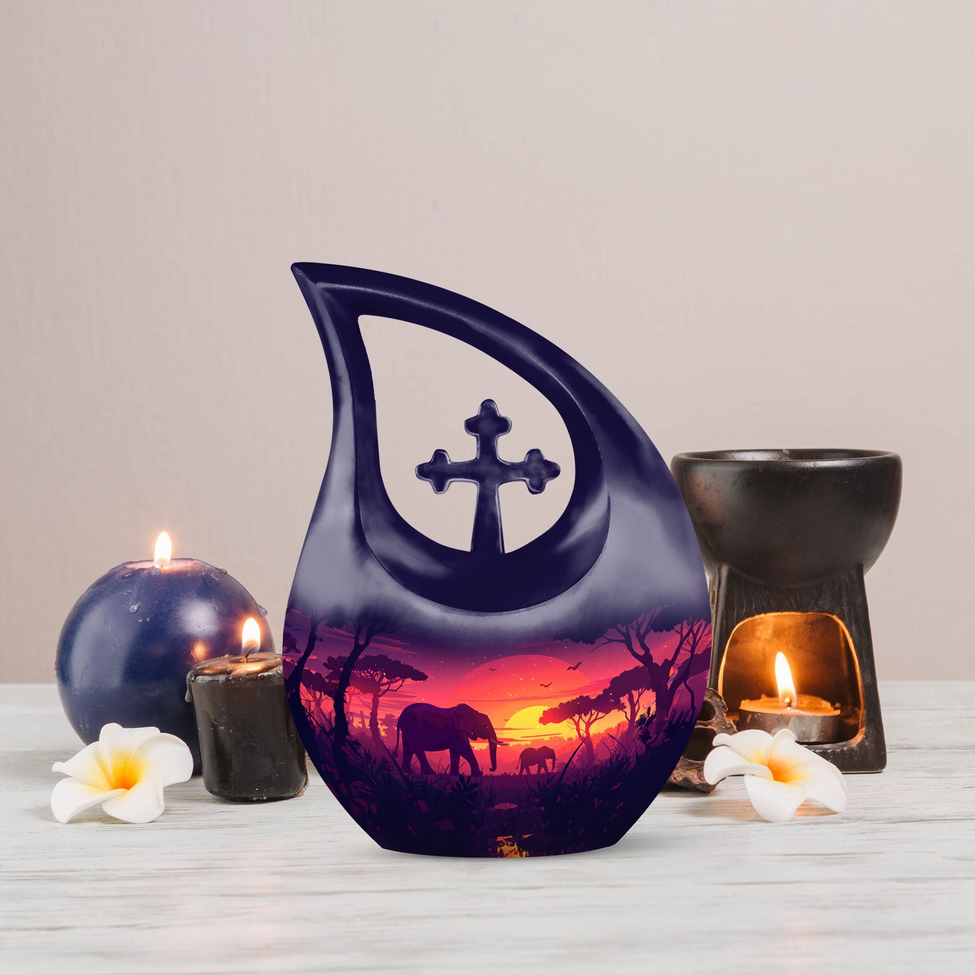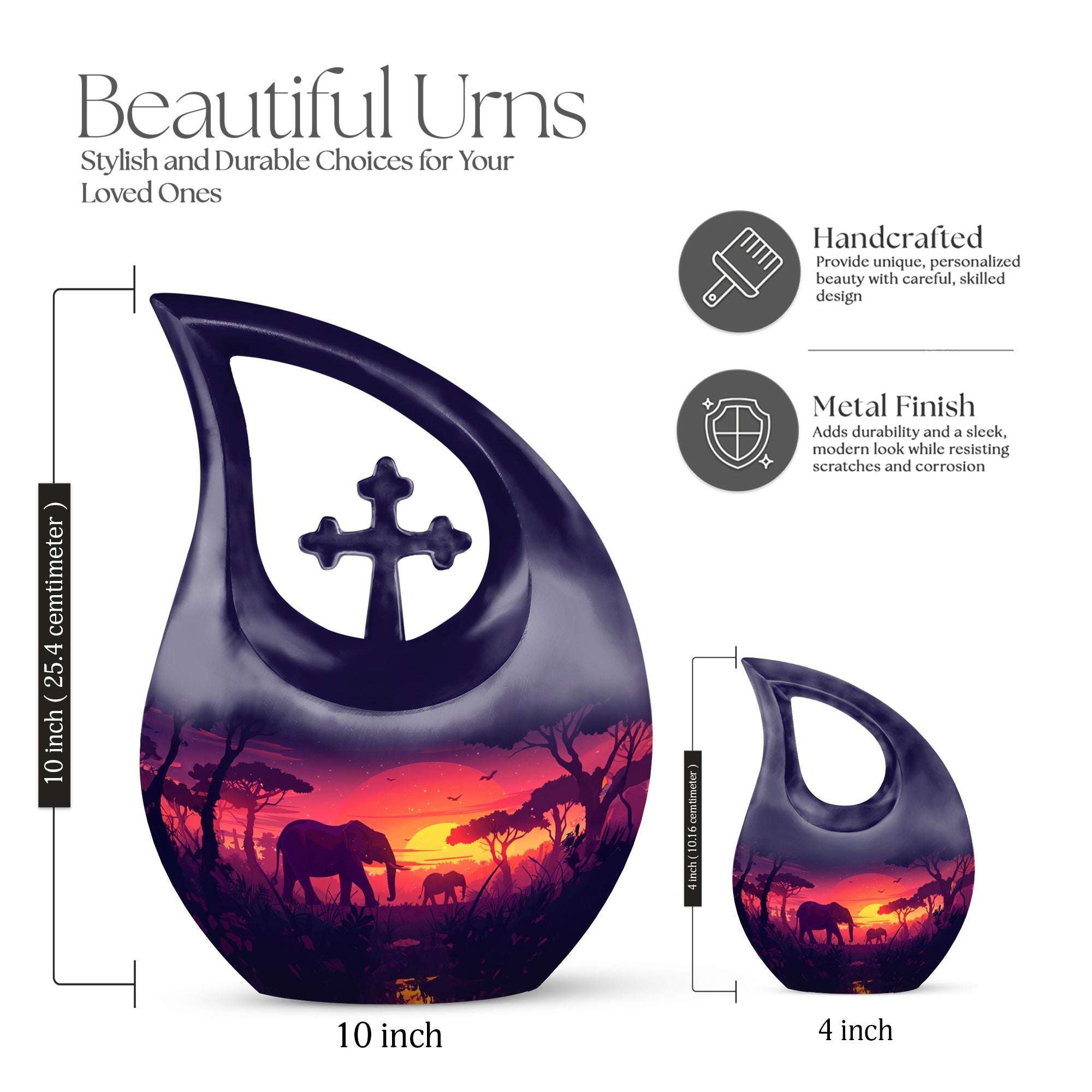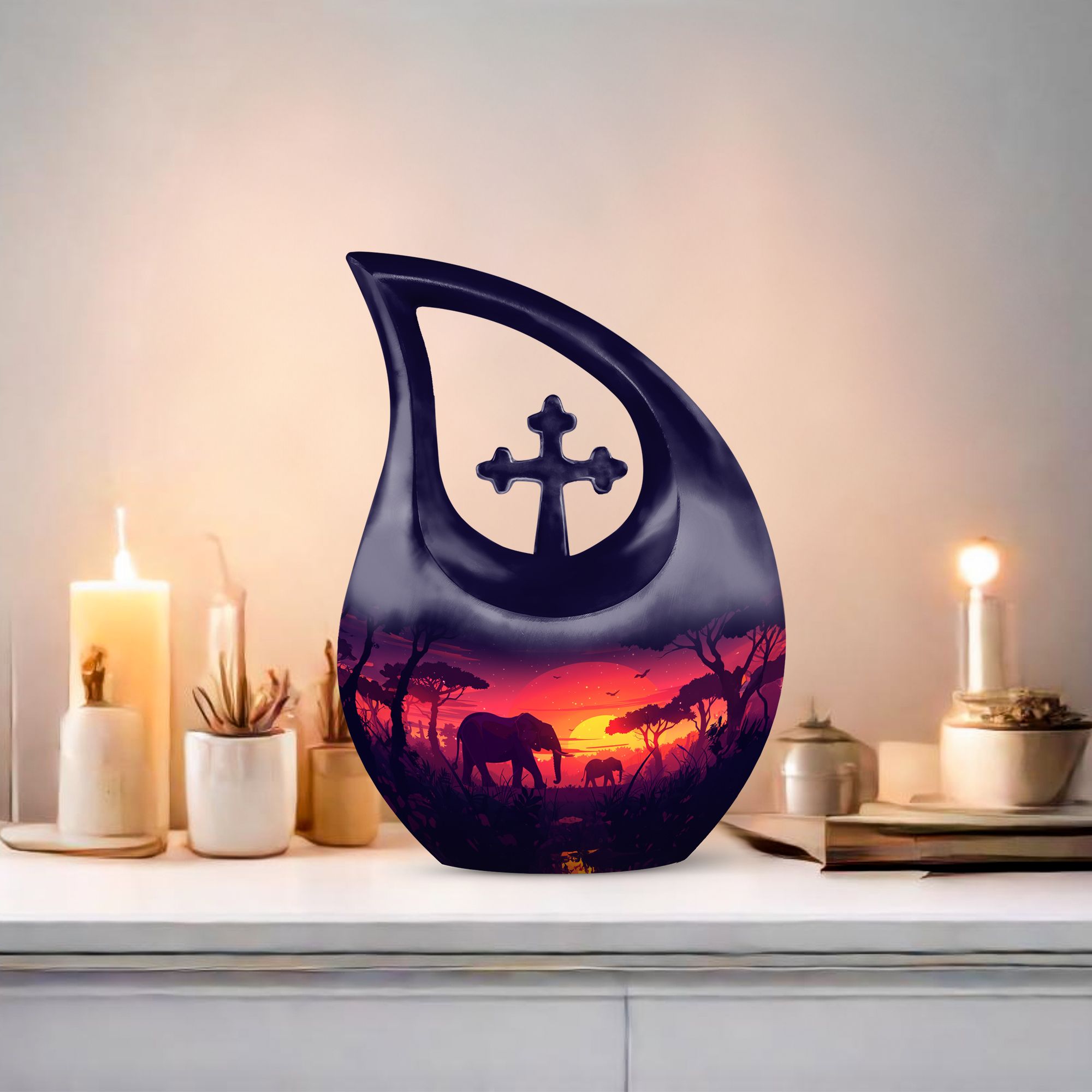 Honoring a loved one's memory becomes a dignified affair with this unique Elephant Family Urn. Made from high-grade Aluminium, this Large Urn stands 10 inches tall and weighs 3.3 pounds, offering a generous capacity of 200 cubic inches. The craftsmanship embraces an extraordinary Cross Drop theme that flawlessly incarnates the eternal familial bond of an elephant family. Its style is not just in its visuals, as it also comes with a velvet pouch, ensuring the safe containment of your beloved's ashes. A prominent advantage of this Urn is its customization feature, where engraved names truly personalize the memorial experience. Despite being a Cheap Cremation Urn, it does not compromise on quality, making it a popular choice in memorial urns. Additionally, it serves well in the categories of Urns For Human Ashes, Low Cost Cremation Urn, Cremation Containers, and Urns For Ashes.