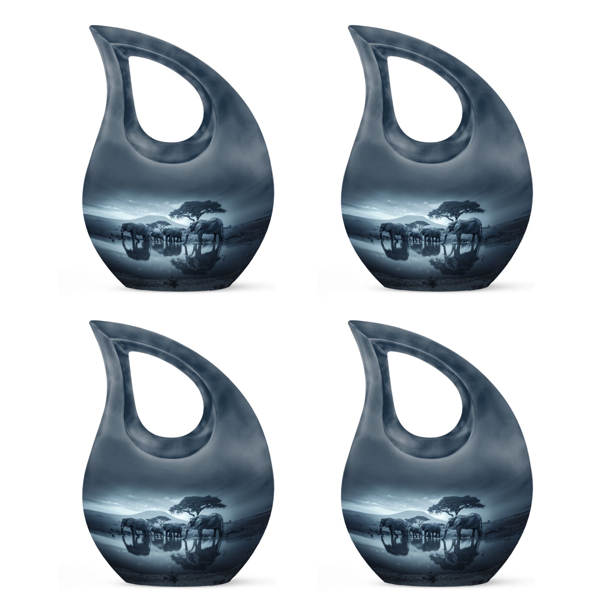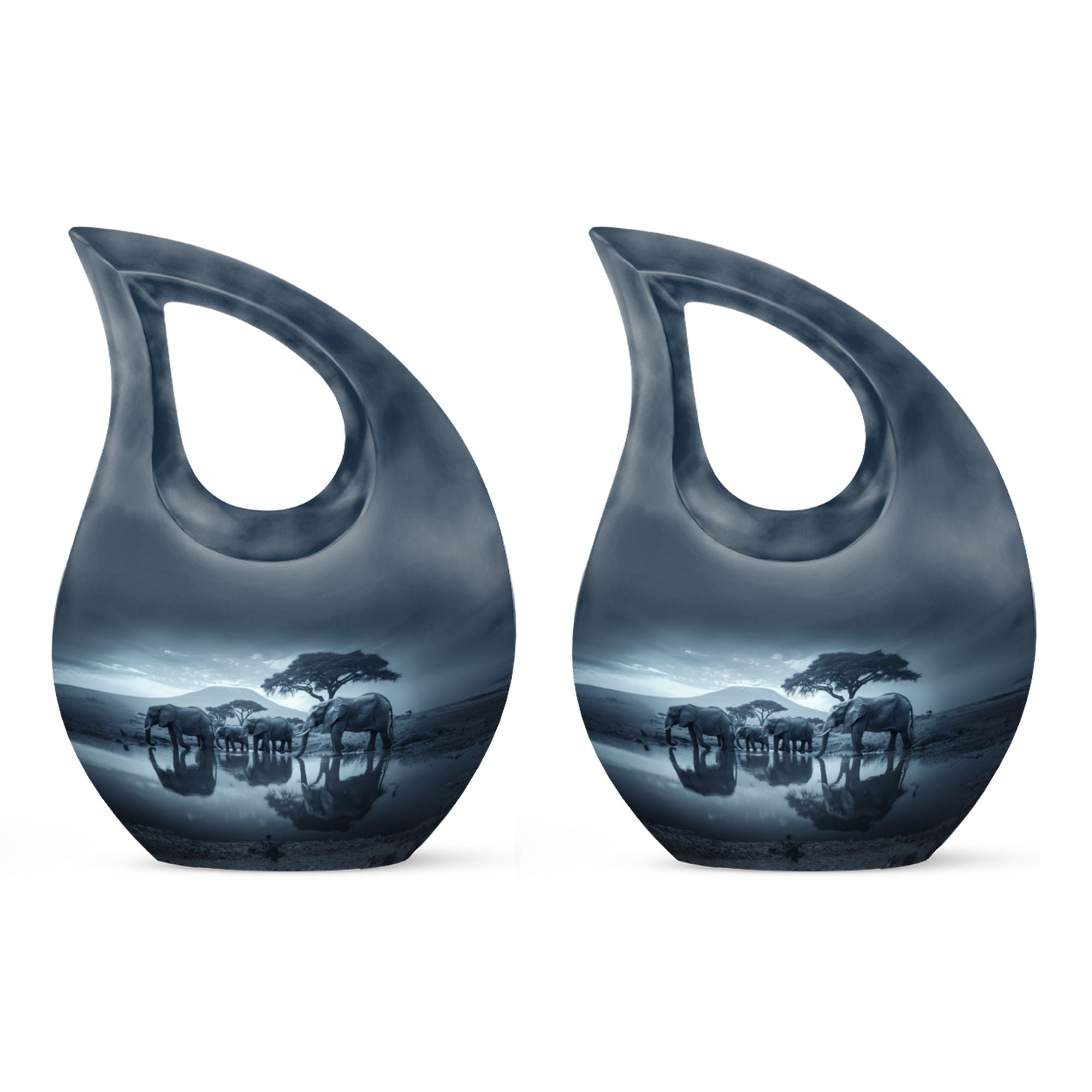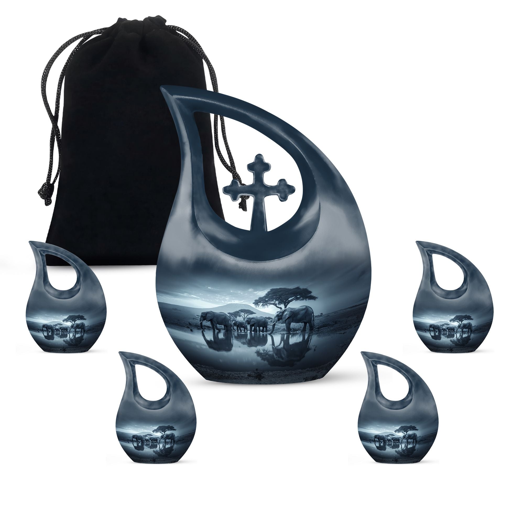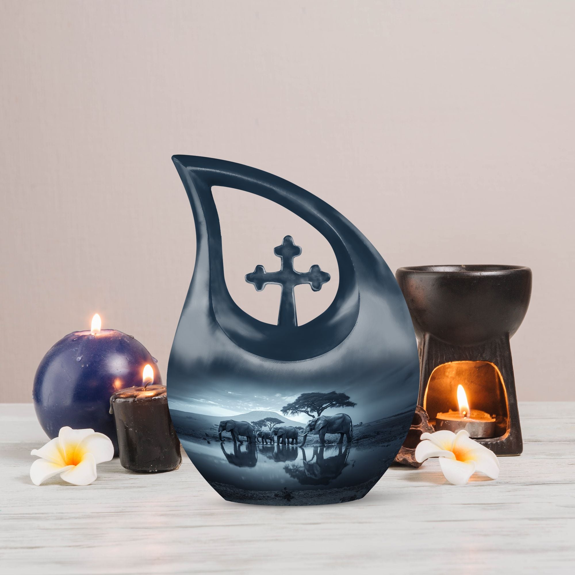 Embrace the eternal serenity with our 'Elephant Family Urn', a beautifully crafted aluminium large urn, exhibiting an exquisite 'Cross Drop' theme, enhancing its elegance and the spirituality of its purpose. Sized at a practical 10 inches in height, the Urn weighs 3.3 pounds, rightfully meeting requirements for 'Extra Large Urns'. With a generous capacity to hold up to 200 cubic inches, this urn extensively caters to the need for 'Memorial Urns For Human Ashes'. Along with the urn, you receive a velvet pouch, offering a respectful containment for the beloved's ashes. A distinctive feature of our urn is its customization - enrich its uniqueness by personalizing it with engraved names. Reflecting love, unity, and resilience, the 'Elephant Family' theme diverges from the usual, bringing solace and strength. This specially designed 'Metal Cremation Urn' is more than a container; it’s a tribute to the everlasting bond with your loved ones.