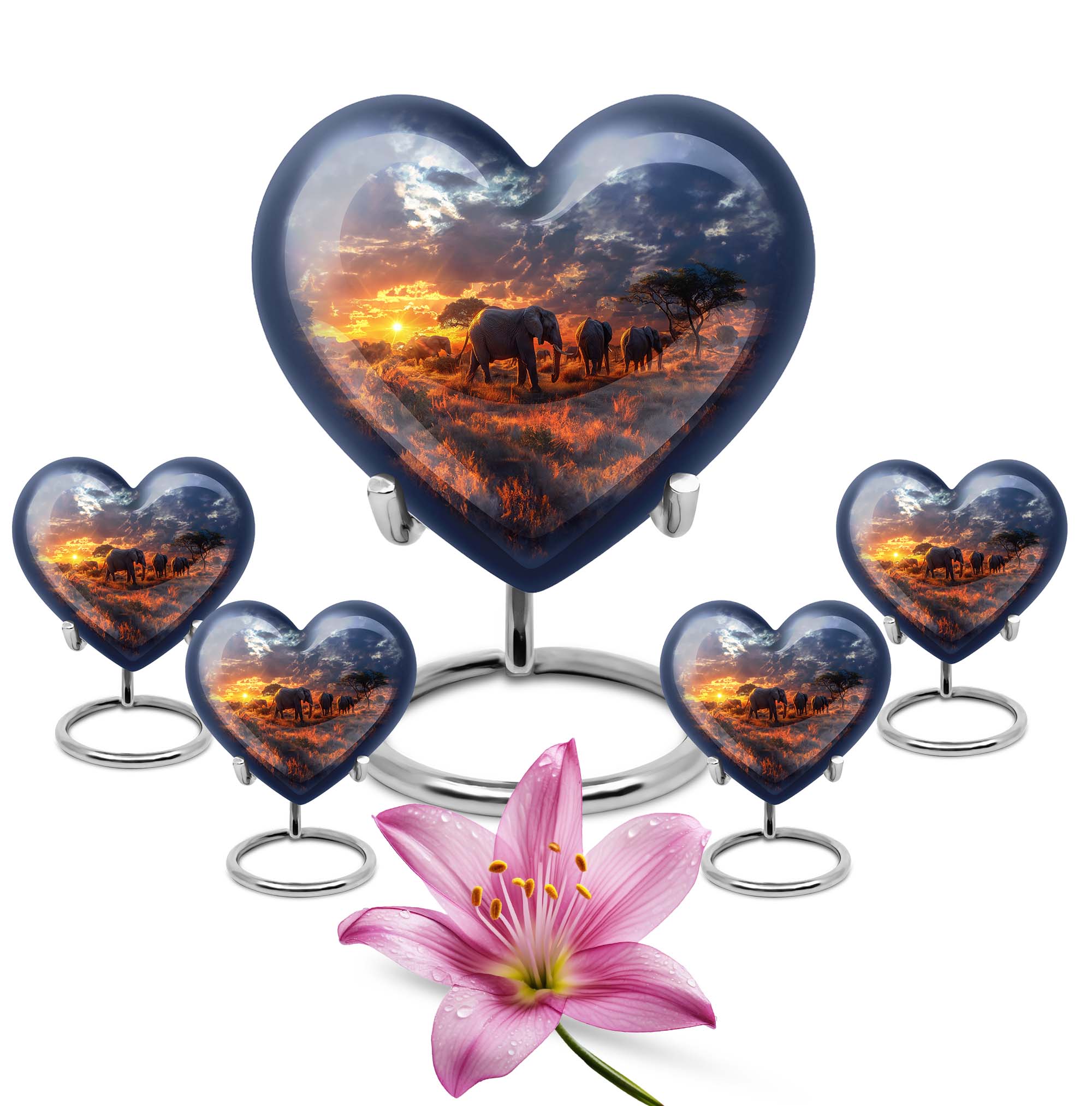 Preserve cherished memories with our Elephant Family Urn from the Memorial Ceremony Supplies collection. Crafted for dimensions of 10 inches in height, this abstract-themed urn offers you an intimate way to remember a loved one. This aluminium large urn, substantial with a weight of 3.3 pounds, ideally holds up to 200 cubic inches. Making it a preferred choice for adult urns for human ashes, notably for both women and men. Our Memorial Urn is meticulously fashioned in an appealing Heart Urn design, ensuring it provides a dignified resting place for your loved one's ashes. The included velvet pouch allows for conserved containment of ashes providing an extra level of respect. Leverage our customization options, and personalize the urn with engraved names, adding a touch of individuality and sentiment. Our Elephant Family Urn perfectly blends aesthetic beauty with thoughtful functionality. It is more than just a product, it's a tribute to the life lived.