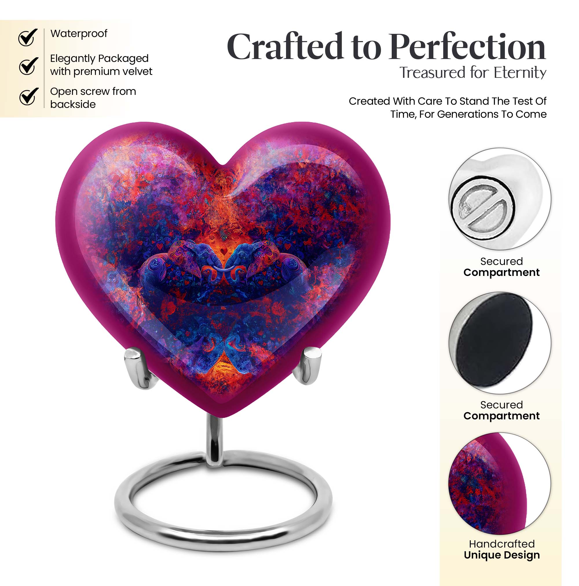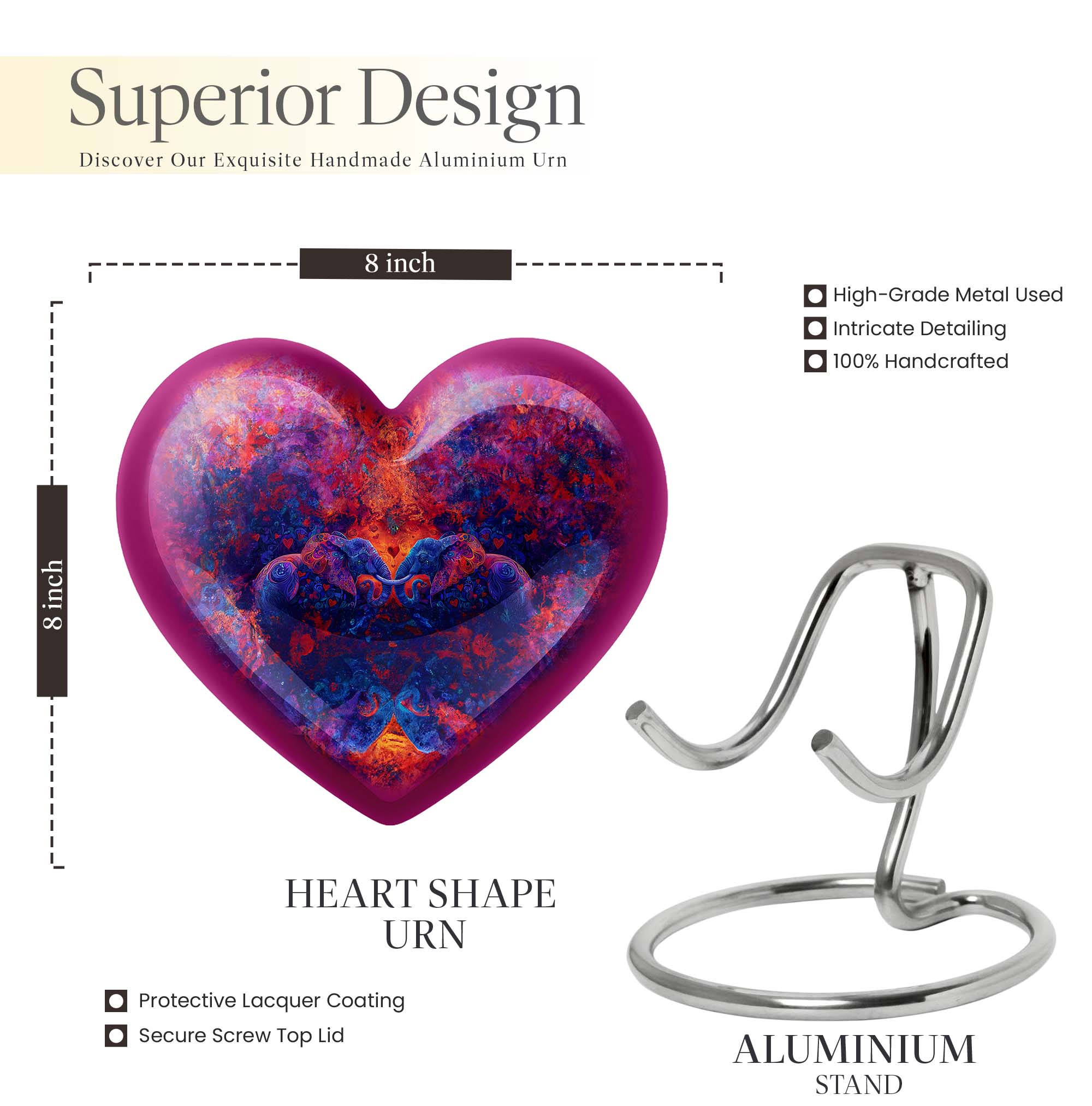 Honor your departed loved one with our remarkable 'Elephant Family Urn.' Crafted with the highest precision using high-grade aluminium for long-lasting durability, this distinguished funeral urn for human ashes is not just a memorial urn but a befitting tribute of enduring love and memories. With a sizeable 10-inch dimension, it is sturdy and weighs about 3.3 pounds. It offers a generous capacity of 200 cubic inches to securely hold the ashes. The urn's theme is accentuated by a beautiful butterfly, adding to its aesthetic beauty. This Large Urn comes with an exquisite velvet pouch for safe containment of ashes. To add more sentiment to this timeless stone urn, one can personalize it with engraved names as a beautiful keepsake. Embrace the uniqueness and cherish cherished memories with our elegant funeral urn.
