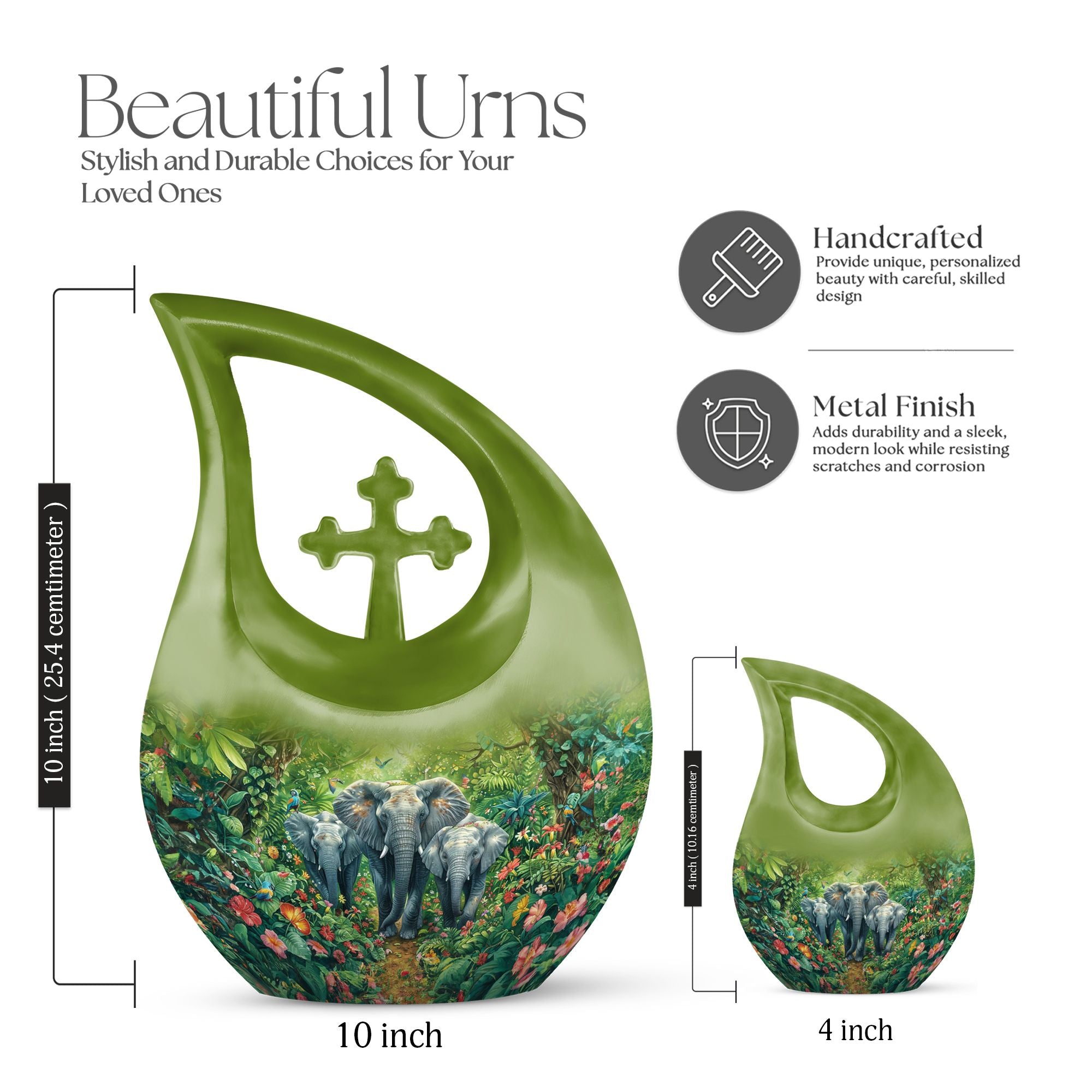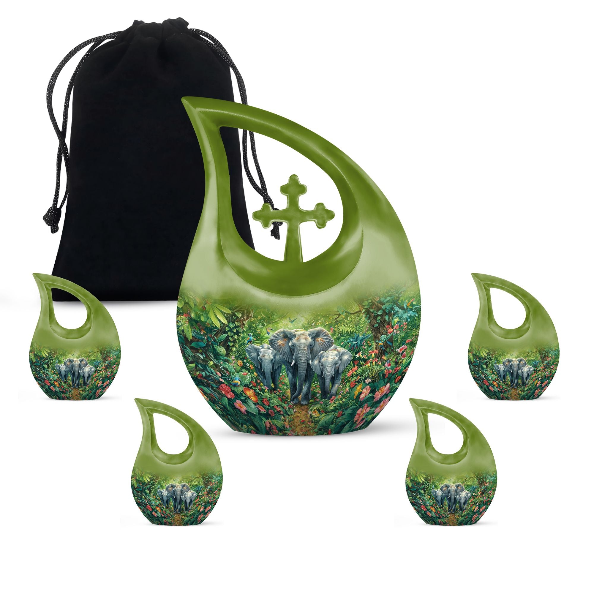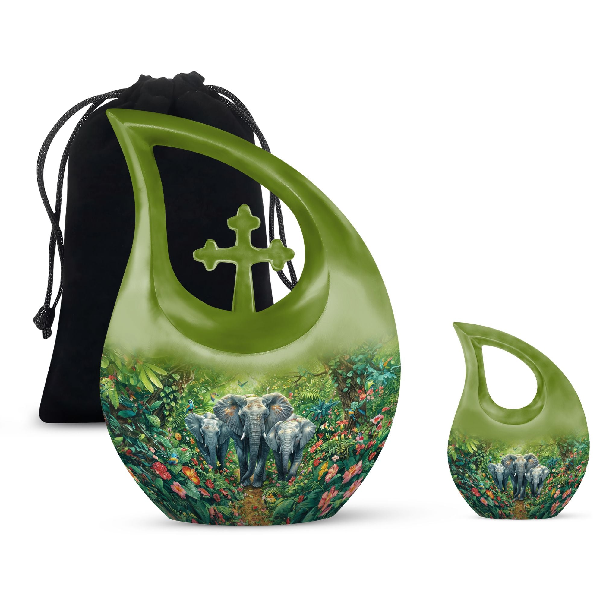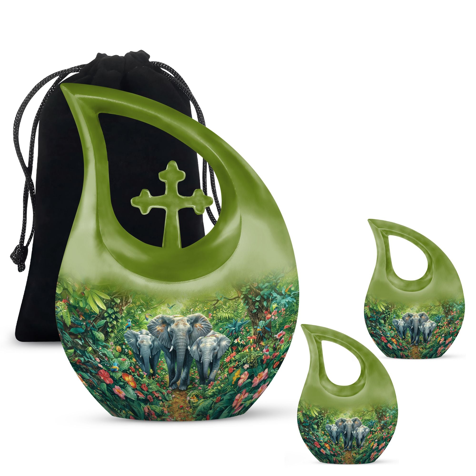 Exhibit your lasting tribute to your loved one with our Elephant Family Urn. As an exceptional piece amid our customized urns for ashes for adults, it brings together both solemnity and intricacy in its design. This Large Urn stands tall at 10 inches, has a weight of 3.3 pounds, and holds up to 200 cubic inches of ashes. The exterior reveals the distinctive Elephant Family Theme, crafted meticulously using reliable aluminum, ensuring long-lasting durability. Included in your purchase is a velvet pouch perfect for secure containment of ashes. Infuse a personal touch to this cremation monument with our customization feature. Personalize your urn with engraved names, truly unique to you. Steer away from the mundane with our unforgettable Cross Drop urn design, a must-have addition in the realm of memorial urns. Keywords: Unique Urns For Dad, Memorial Urns For Human Ashes, Cremation Monuments, Personal Urns.