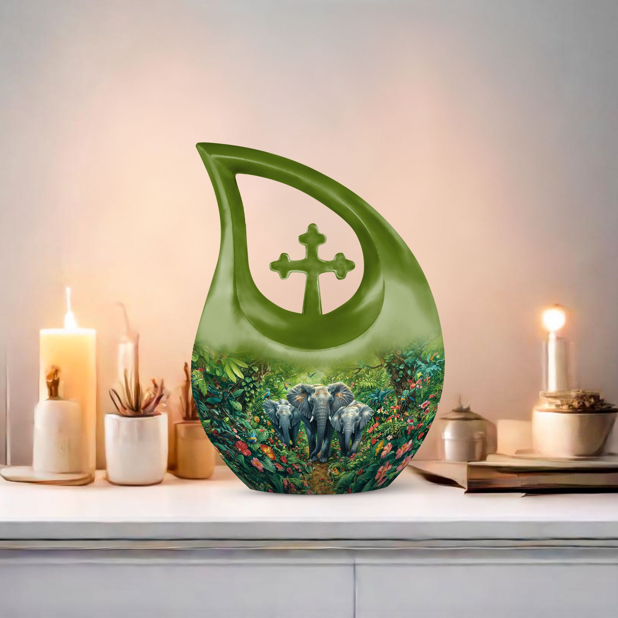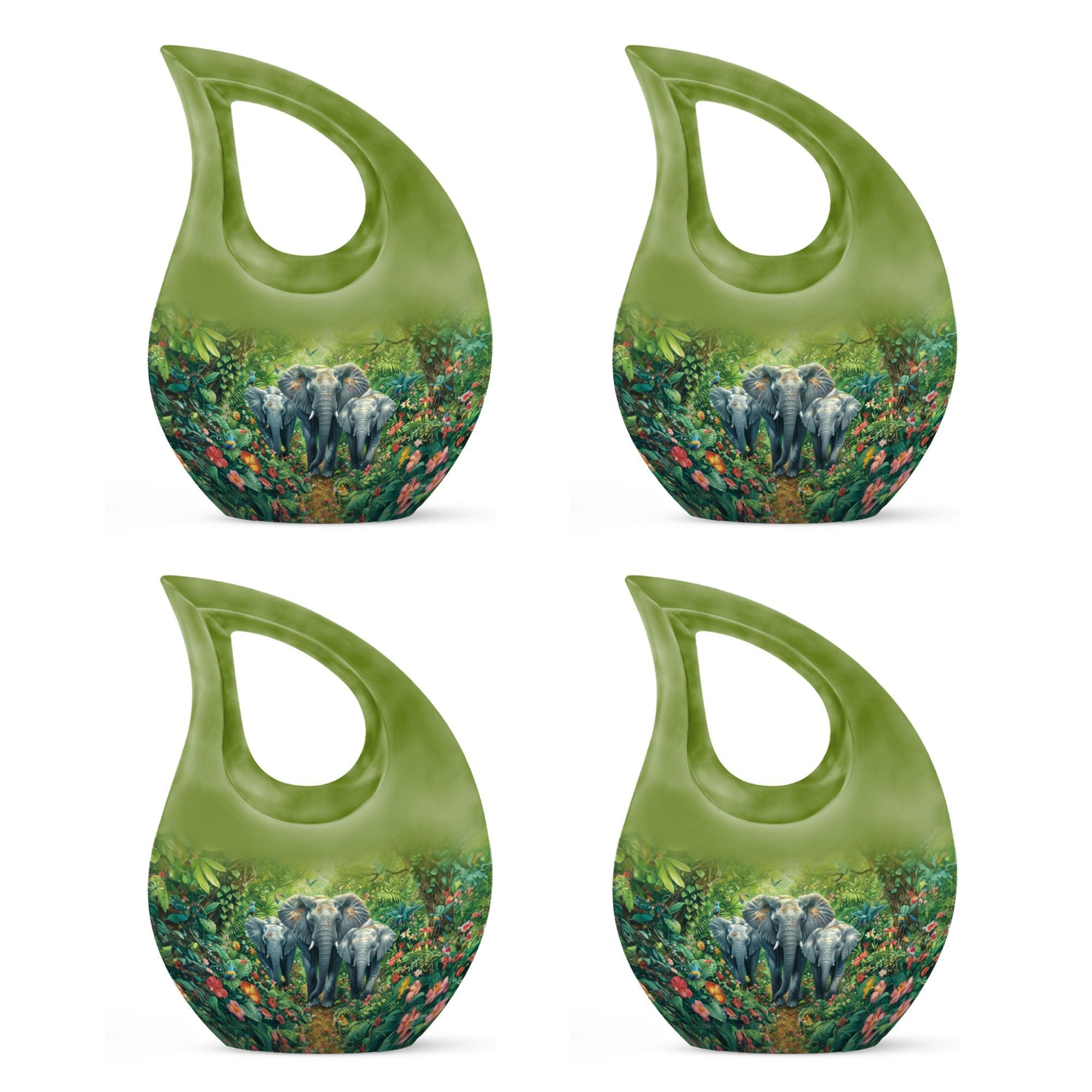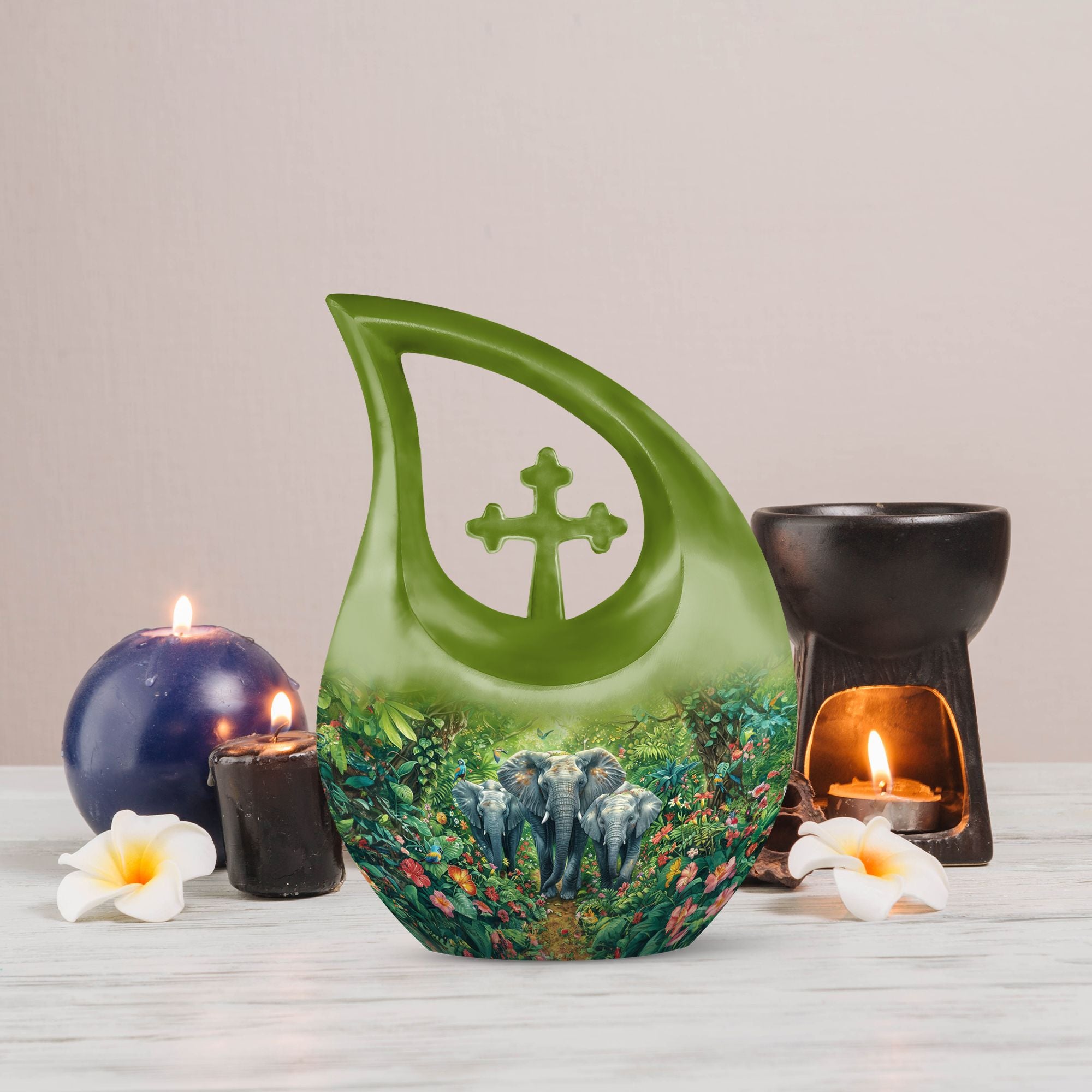 Exhibit your lasting tribute to your loved one with our Elephant Family Urn. As an exceptional piece amid our customized urns for ashes for adults, it brings together both solemnity and intricacy in its design. This Large Urn stands tall at 10 inches, has a weight of 3.3 pounds, and holds up to 200 cubic inches of ashes. The exterior reveals the distinctive Elephant Family Theme, crafted meticulously using reliable aluminum, ensuring long-lasting durability. Included in your purchase is a velvet pouch perfect for secure containment of ashes. Infuse a personal touch to this cremation monument with our customization feature. Personalize your urn with engraved names, truly unique to you. Steer away from the mundane with our unforgettable Cross Drop urn design, a must-have addition in the realm of memorial urns. Keywords: Unique Urns For Dad, Memorial Urns For Human Ashes, Cremation Monuments, Personal Urns.