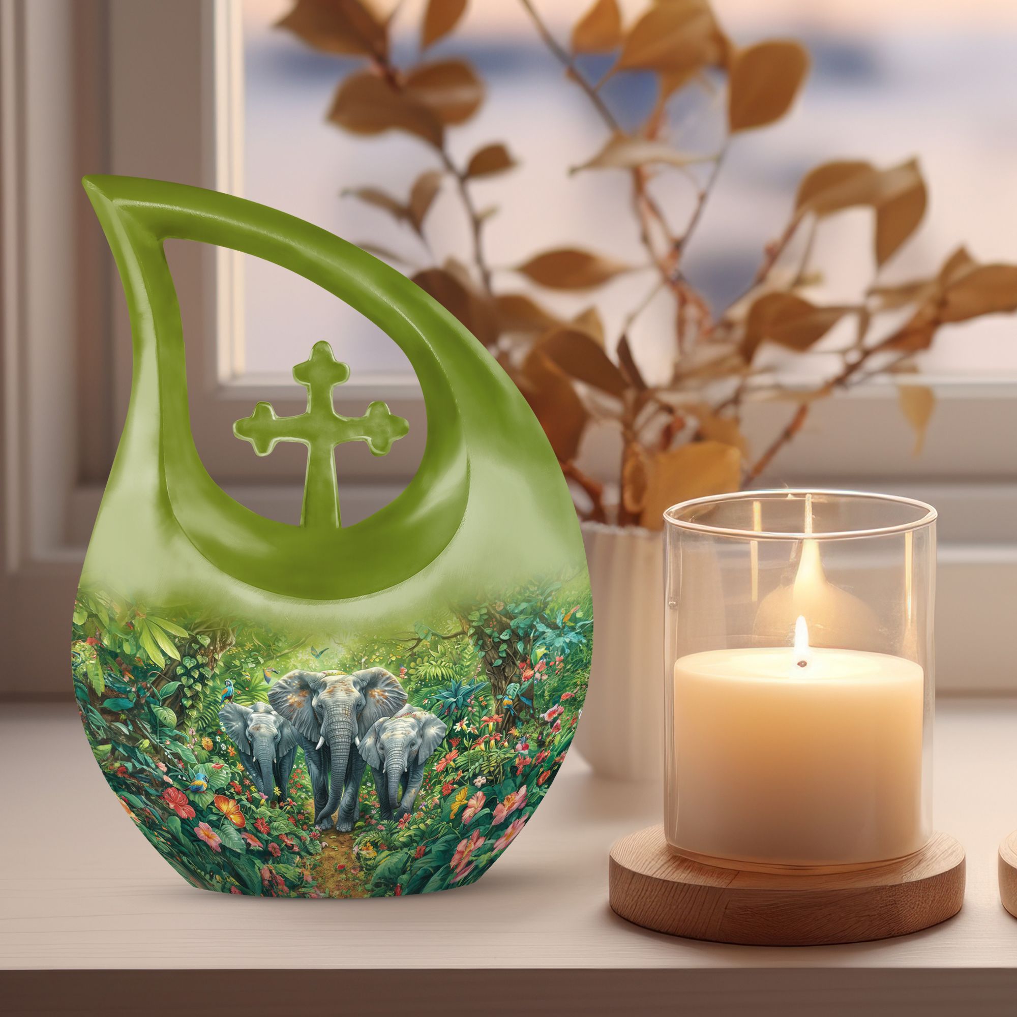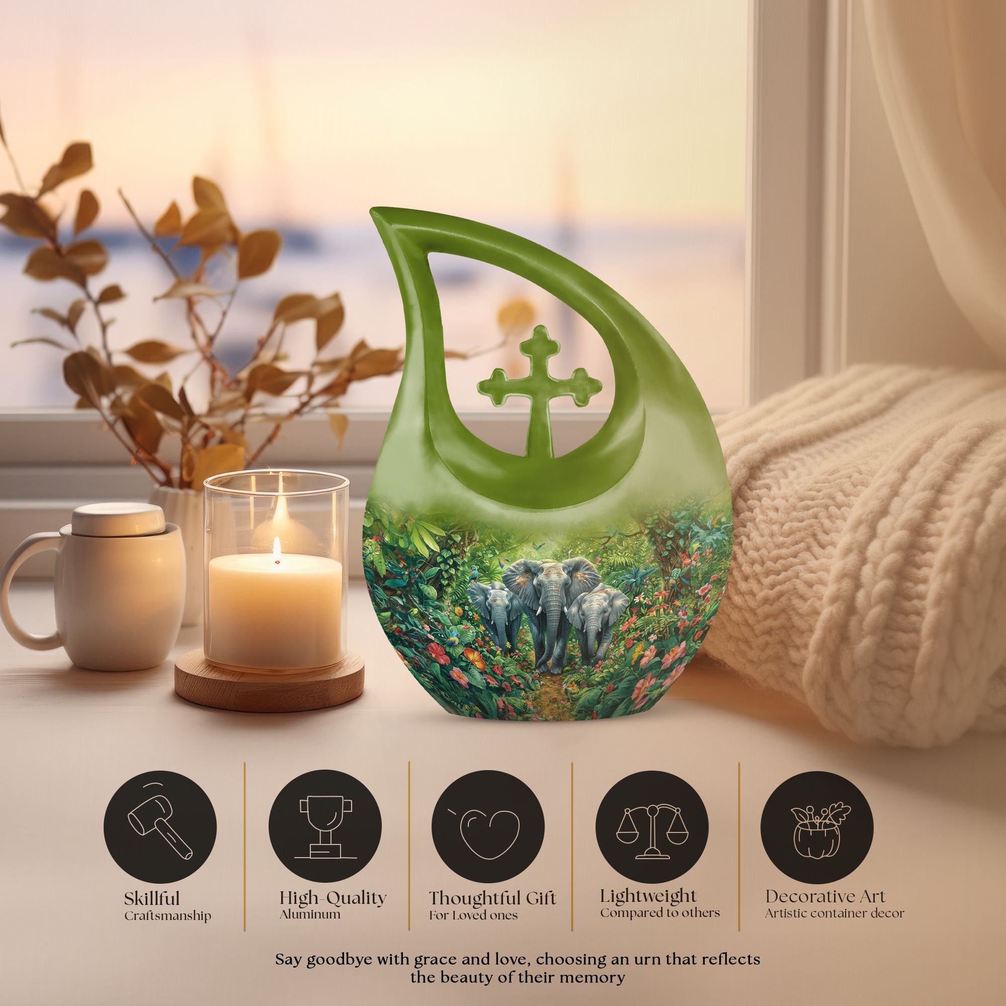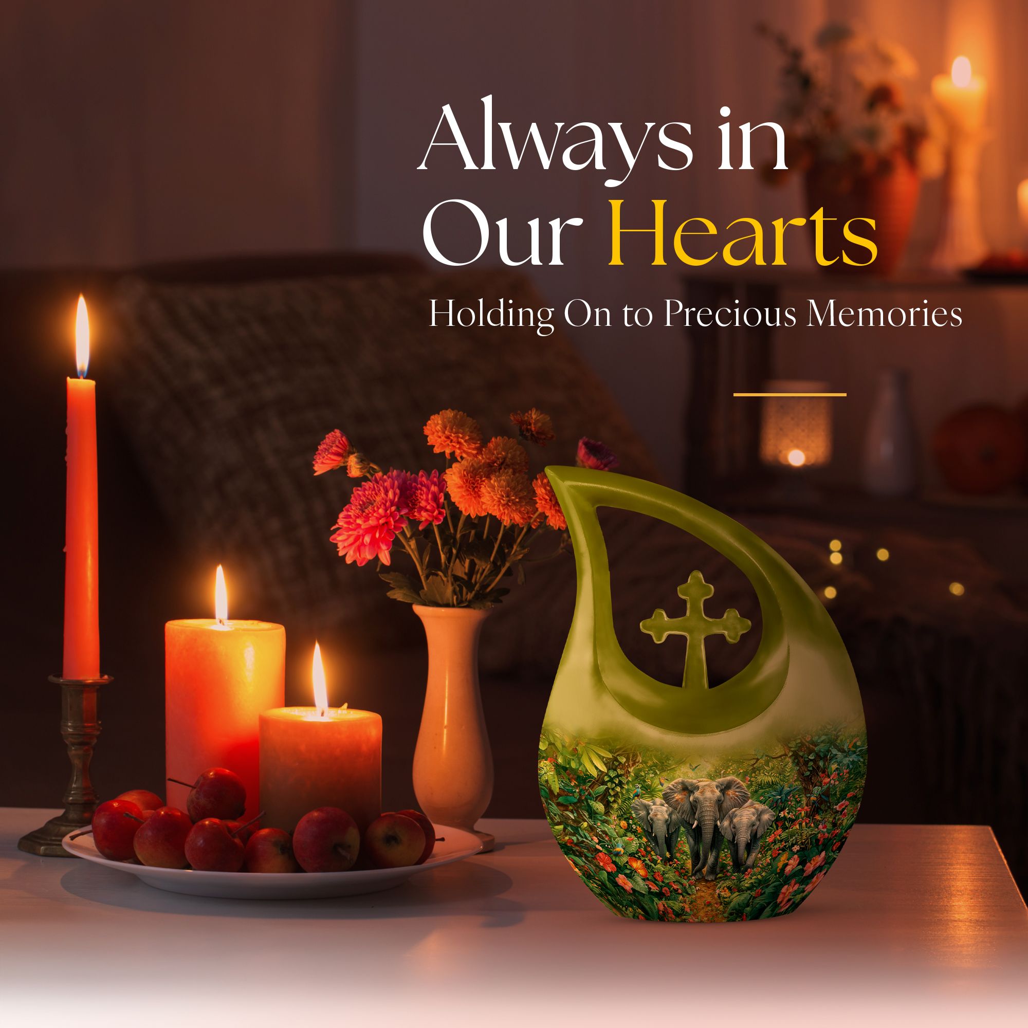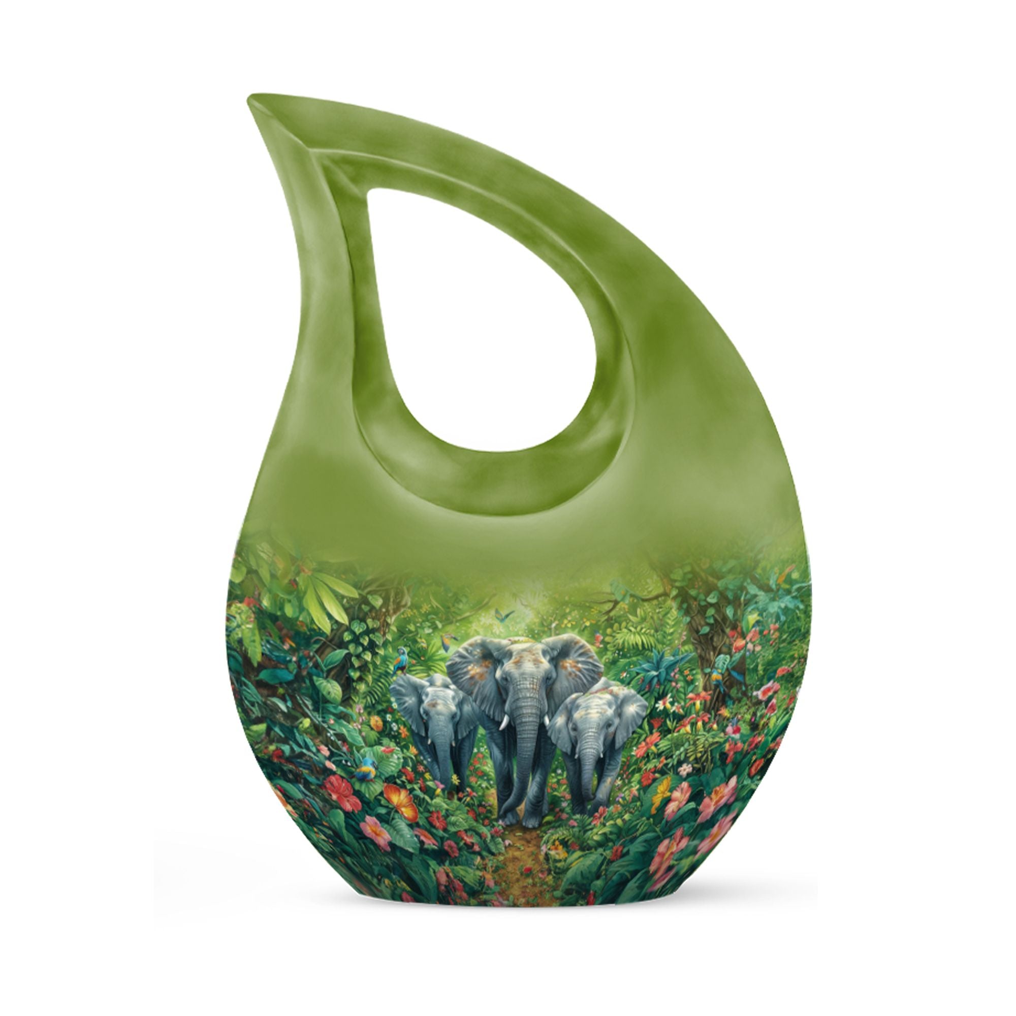 Exhibit your lasting tribute to your loved one with our Elephant Family Urn. As an exceptional piece amid our customized urns for ashes for adults, it brings together both solemnity and intricacy in its design. This Large Urn stands tall at 10 inches, has a weight of 3.3 pounds, and holds up to 200 cubic inches of ashes. The exterior reveals the distinctive Elephant Family Theme, crafted meticulously using reliable aluminum, ensuring long-lasting durability. Included in your purchase is a velvet pouch perfect for secure containment of ashes. Infuse a personal touch to this cremation monument with our customization feature. Personalize your urn with engraved names, truly unique to you. Steer away from the mundane with our unforgettable Cross Drop urn design, a must-have addition in the realm of memorial urns. Keywords: Unique Urns For Dad, Memorial Urns For Human Ashes, Cremation Monuments, Personal Urns.