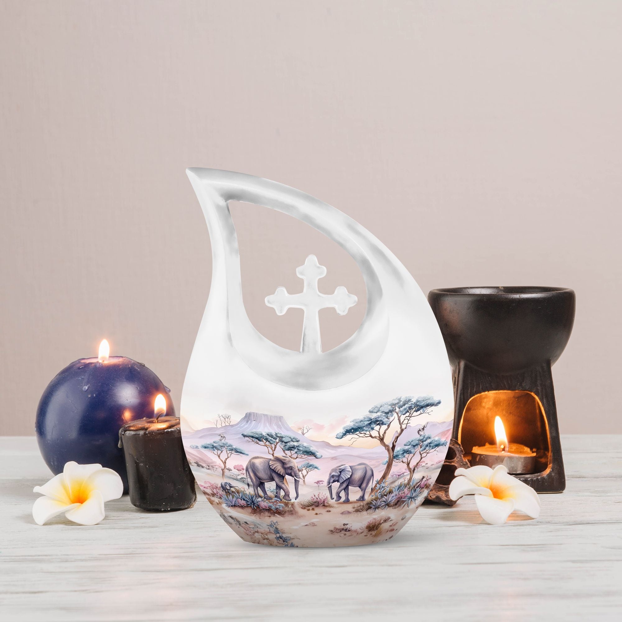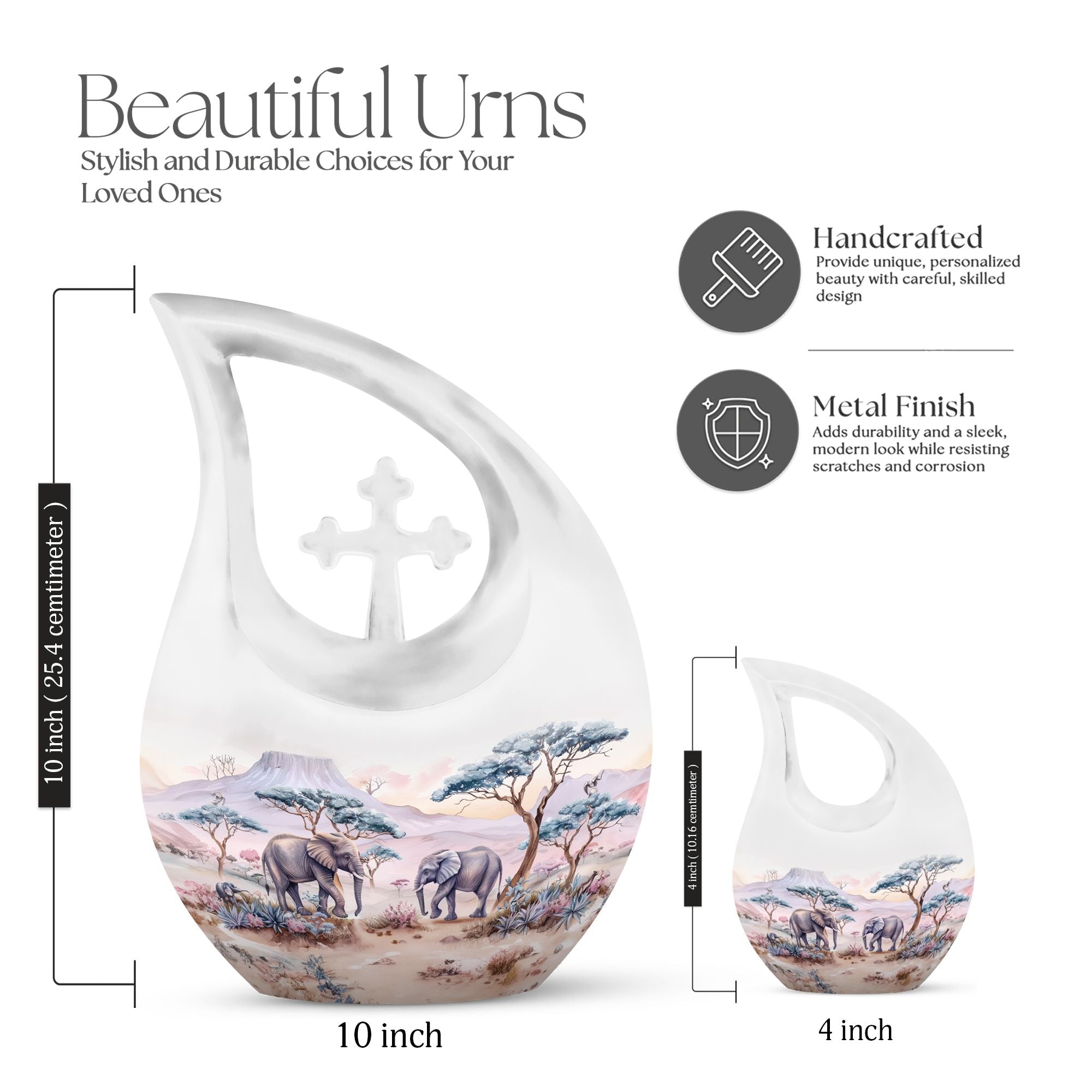 Honor your dearly departed with our Elephant Family Urn, an exquisite display of symbolic warmth and fervent devotion. Crafted diligently from durable aluminum, this 10-inch Metal Cremation Urn is amicably sturdy and has a reassuring weight of 3.3 pounds. The notable size pairs with a generous capacity of 200 cubic inches, ample space to cherish the remnants of your precious loved one. Adorned with an emotionally moving 'Cross Drop' inset, this Large Urn carries a heartening semblance of resolute faith. Personalize your memorial with engraved names, and receive a velvet pouch for containment of ashes, an inclusion underlining the due dignity and respect. Integral terms like 'miniature urns for ashes', and 'garden urns for ashes' convey an encouraging resonance with our expertly crafted Elephant Family Urn. Embrace the sublime presence of your loved ones with our Metal Cremation Urns, a touching testament echoing their perennial importance.