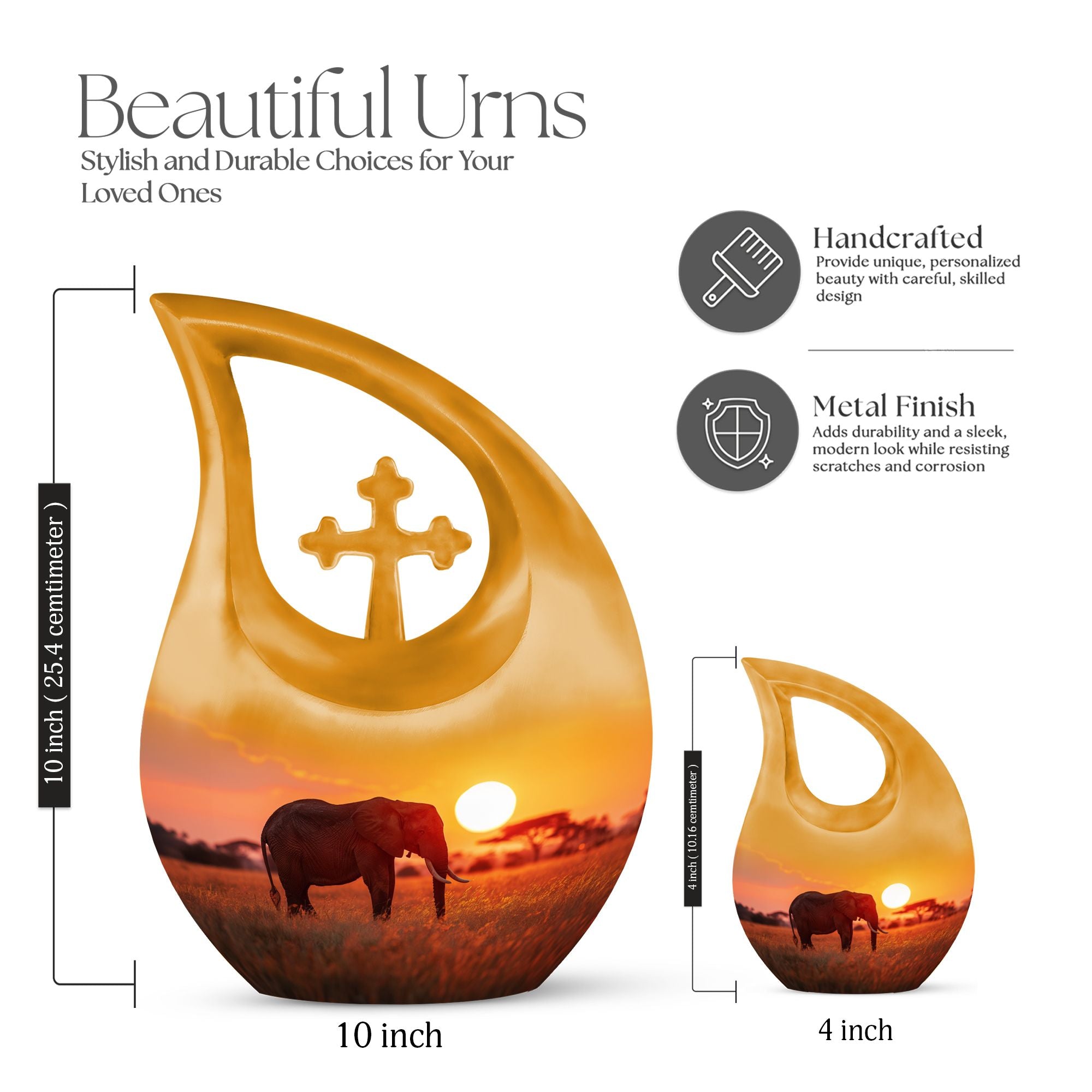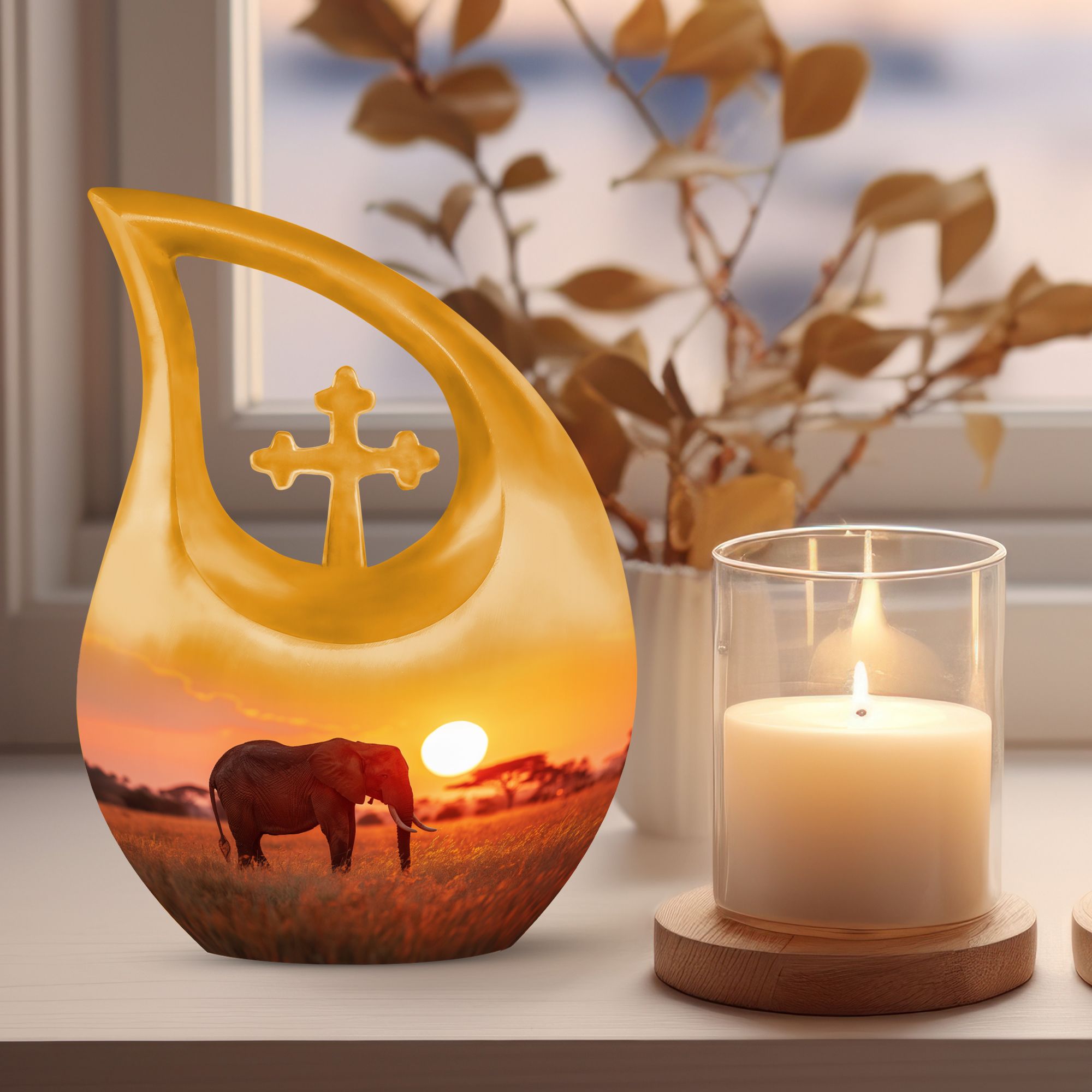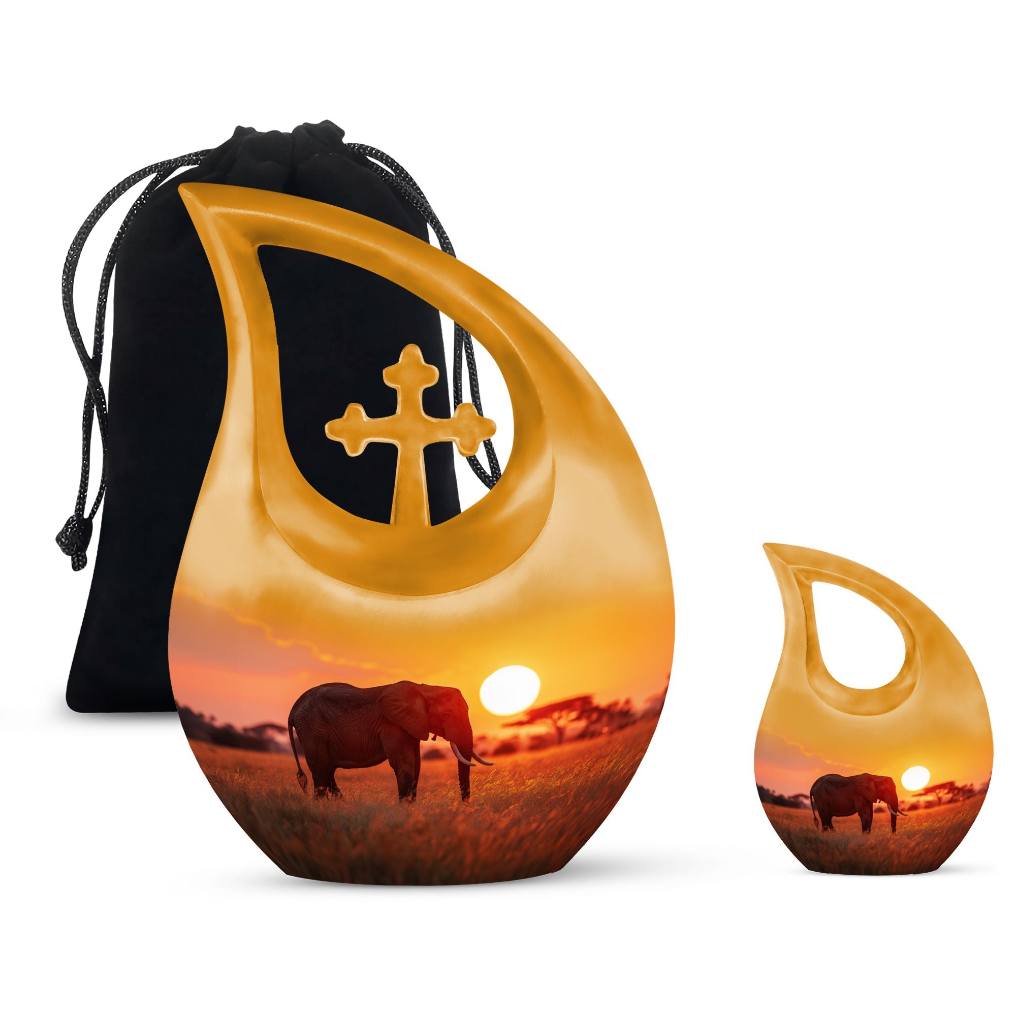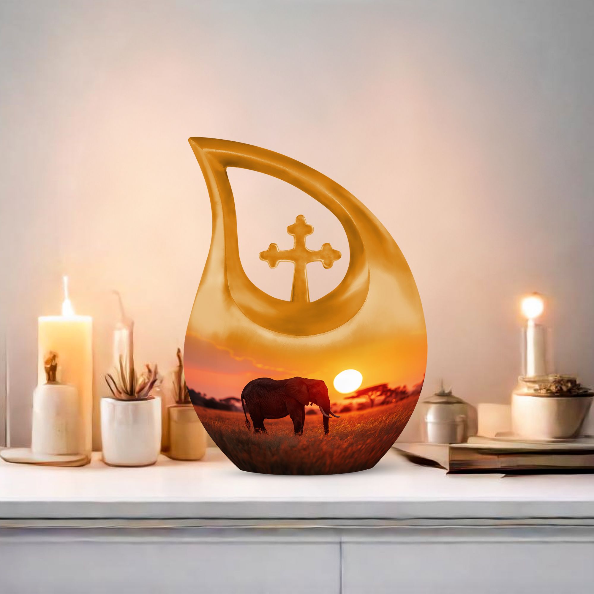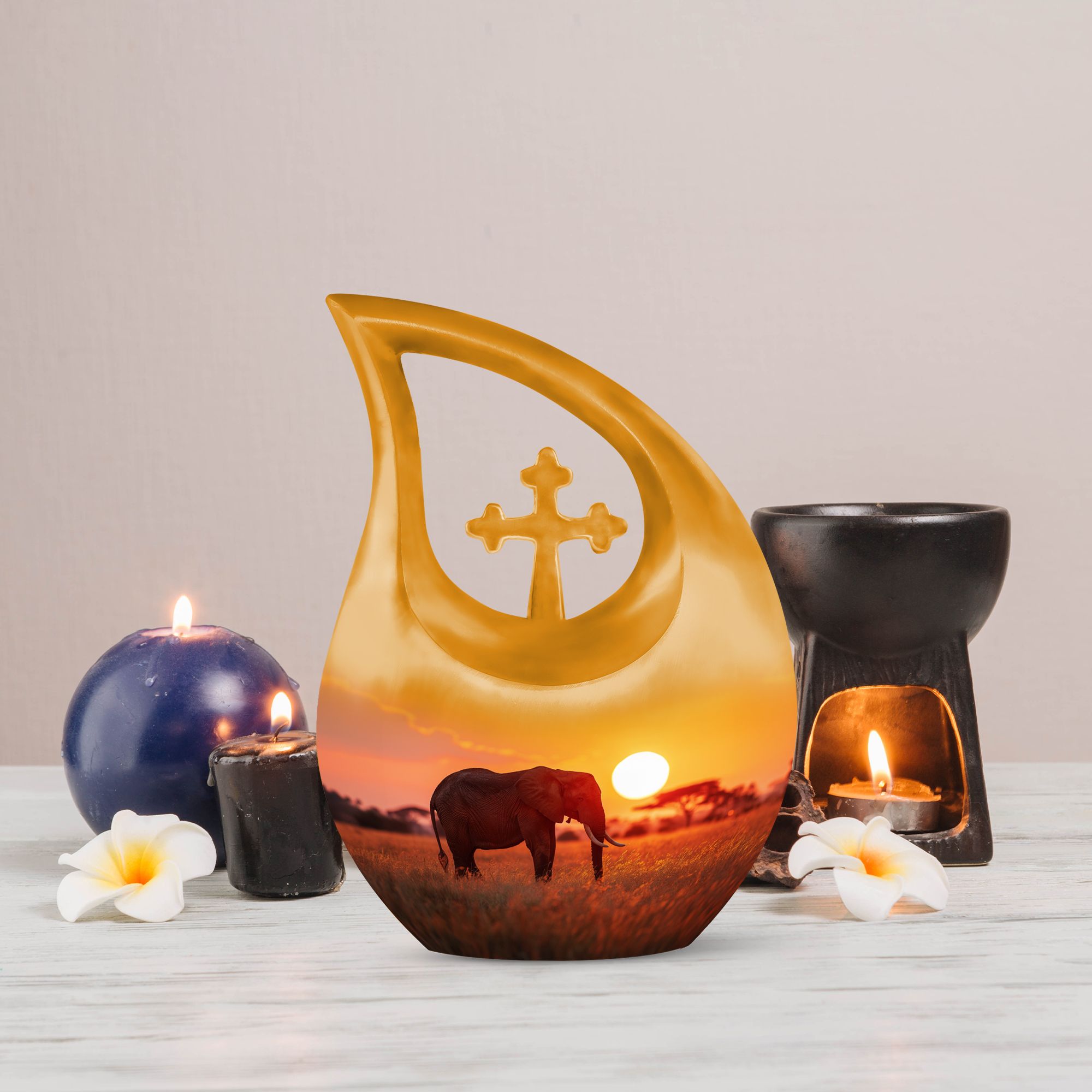 Find solace in our Extra Large Elephant Urn, a dignified and timeless way to preserve the memory of your loved one on a grand scale. This exemplar of memorial urns stands at 10 inches tall, featuring an intricately depicted Elephant theme, symbolizing strength and wisdom. Every detail is lovingly crafted from durable Aluminum, weighing a sturdy 3.3 pounds. The Cross Drop design offers a comforting touch to this resting place, symbolizing faith and hope. With a generous capacity of 200 cubic inches, it is highly suitable for larger individuals or for holding the remains of two individuals who wish to be together in eternity. Along with the urn, you will receive a soft velvet pouch, providing a respectful containment for ashes. For that extra personal touch, you can customize the urn by engraving names on it. This urn isn't just a container, it's a majestic testimony of a life well-lived. Ideal for those searching to Buy Urn or seeking the Best Urns, our Elephant Urn truly stands out in the Metal Urns For Ashes category, perfectly blending elegance with an enduring sentiment.