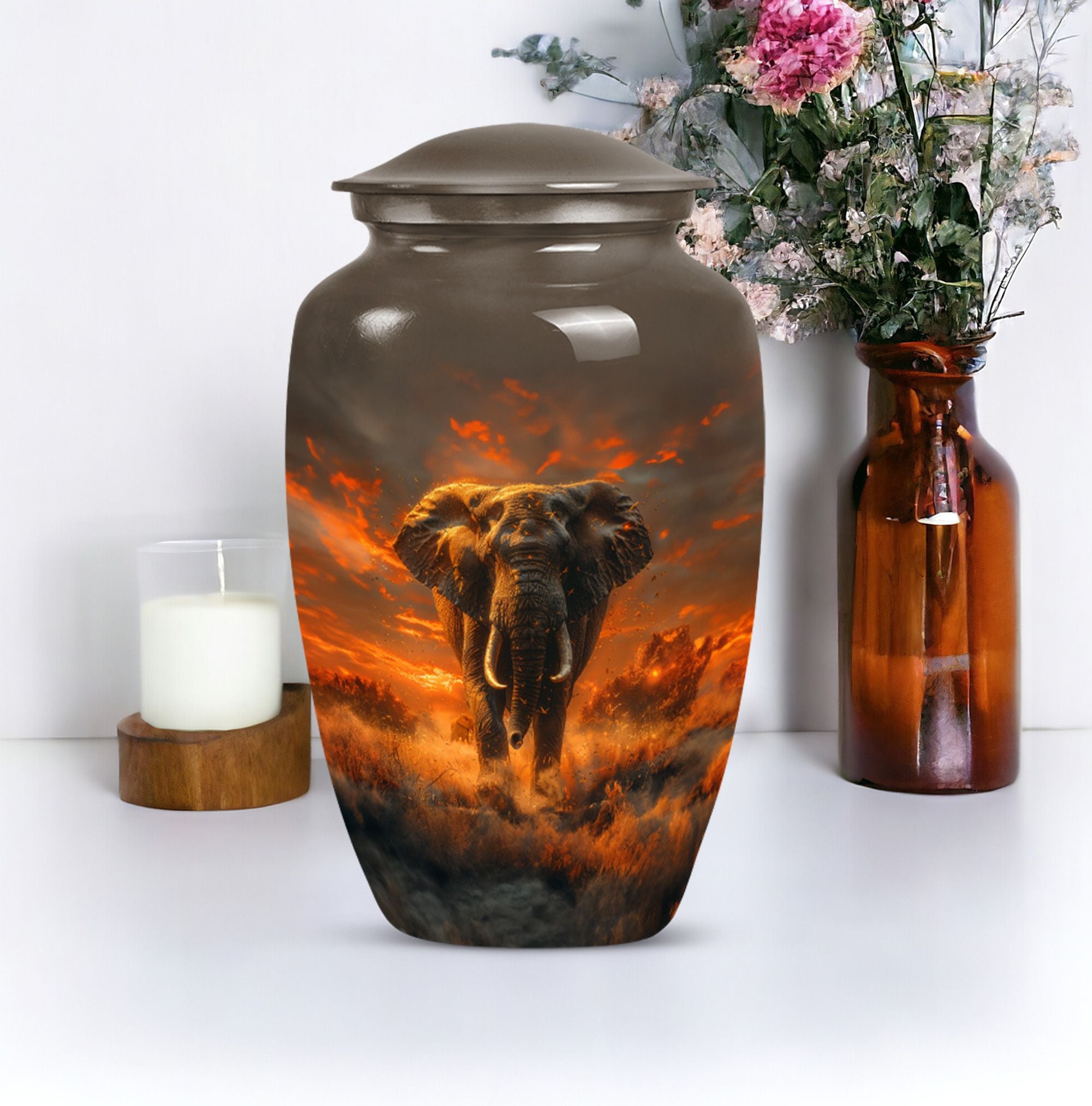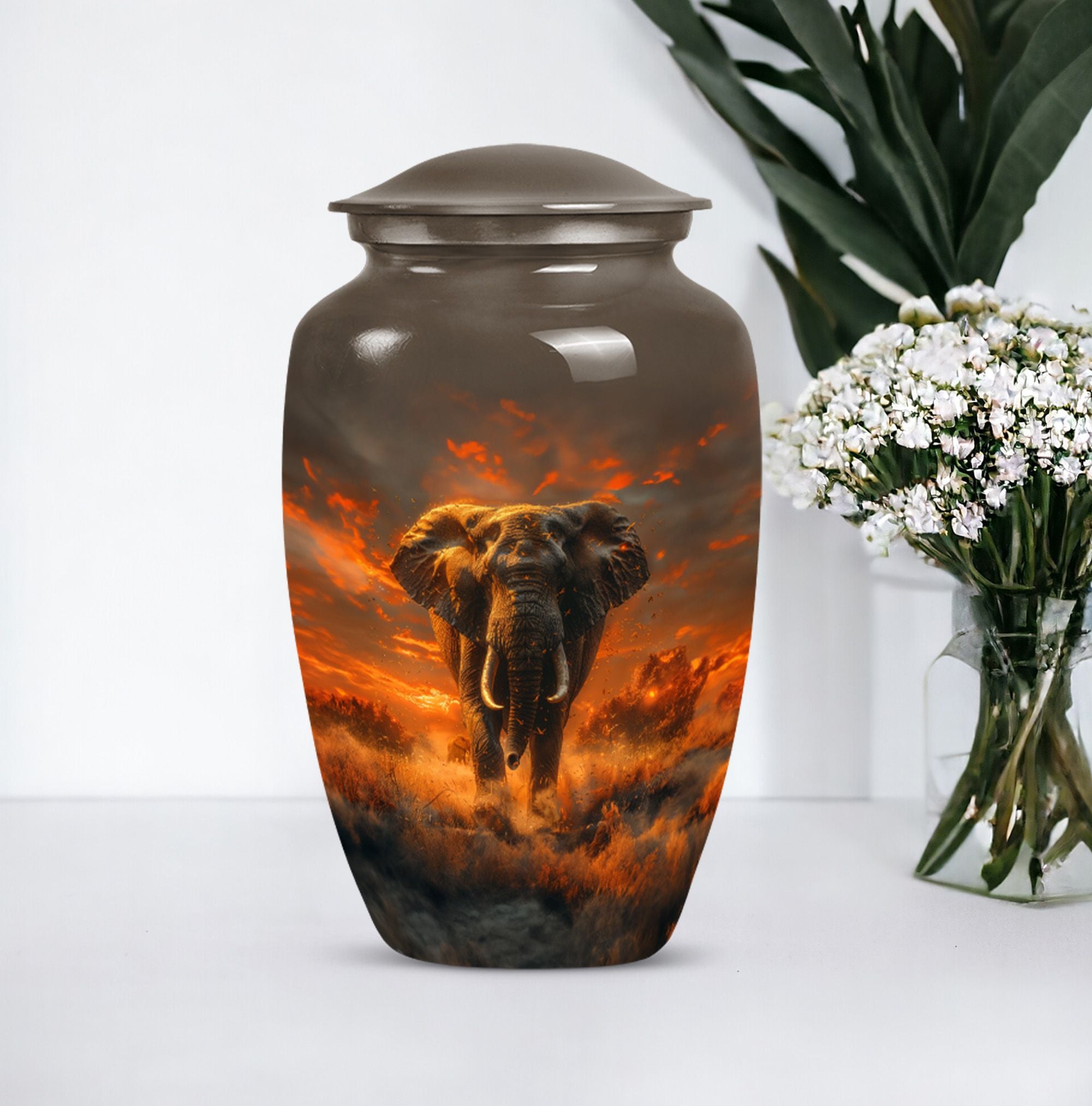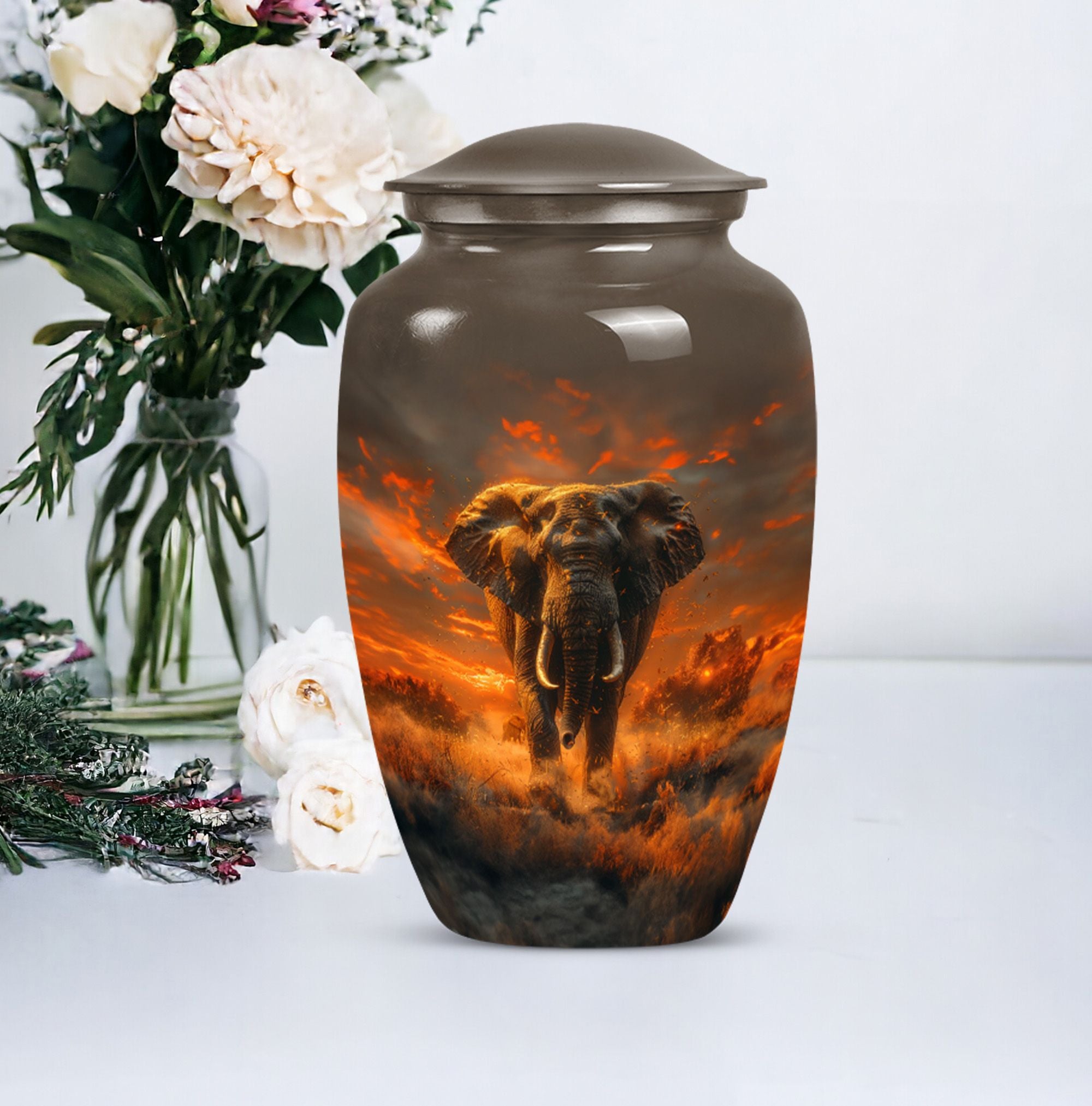A tribute worthy of fond memories, this 10 inch elephant urn is a beautiful repository to memorialize your loved ones. Crafted from high-grade aluminium for strength and longevity, this large urn weighs a substantial 3.3 pounds and accommodates up to 200 cubic inches of ashes, making it suitable for adult funeral services. True to its classic urn styling, featuring elegantly designed flowers to bring a sense of peace and solace. Each urn comes with a delicate velvet pouch that provides a protective home for the ashes. Personalize this memorial urn with engraved names, adding an intimate touch to this commemoration of life's journey. Ideal for those seeking 'forever urns' or 'urns for mom,' its elegant structure and thoughtful design are a testament to individuality and memory. Offering reassurance and comfort, our elephant urn, specifically crafted with human ashes in mind, aims to love and honour for a lifetime.