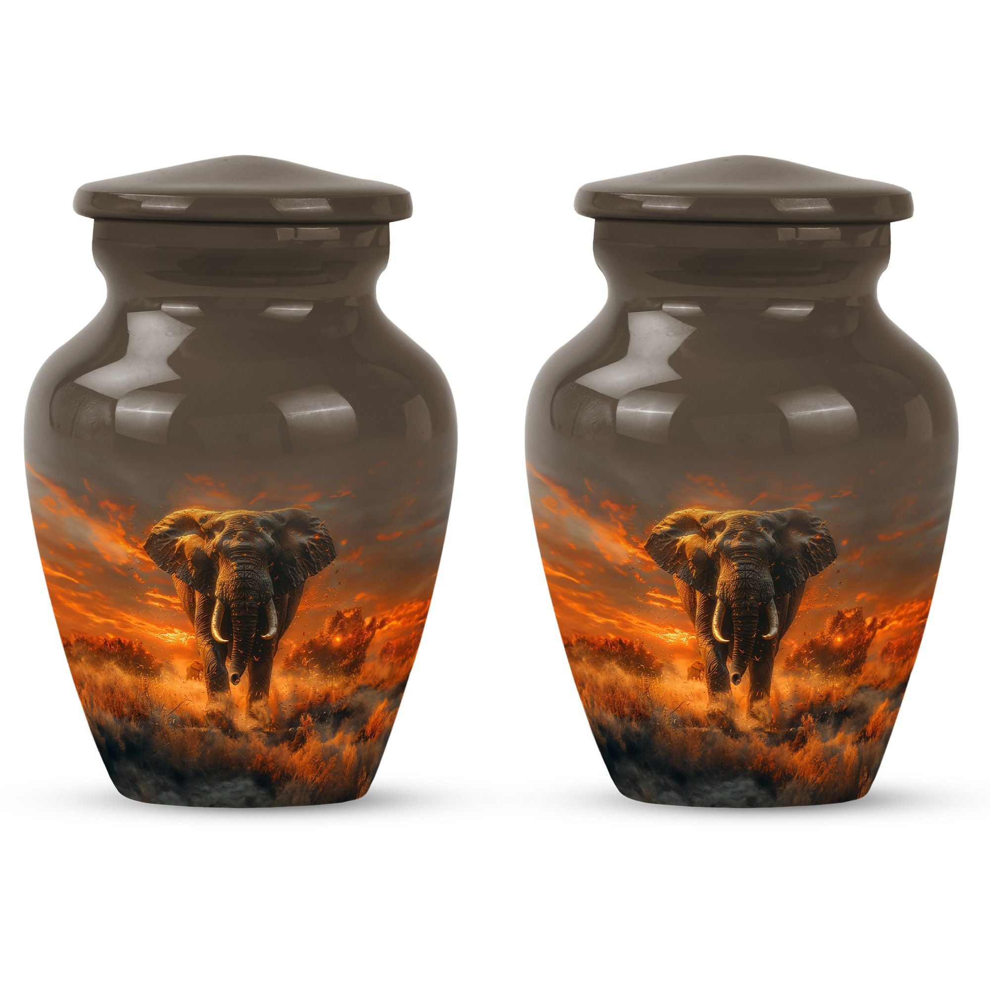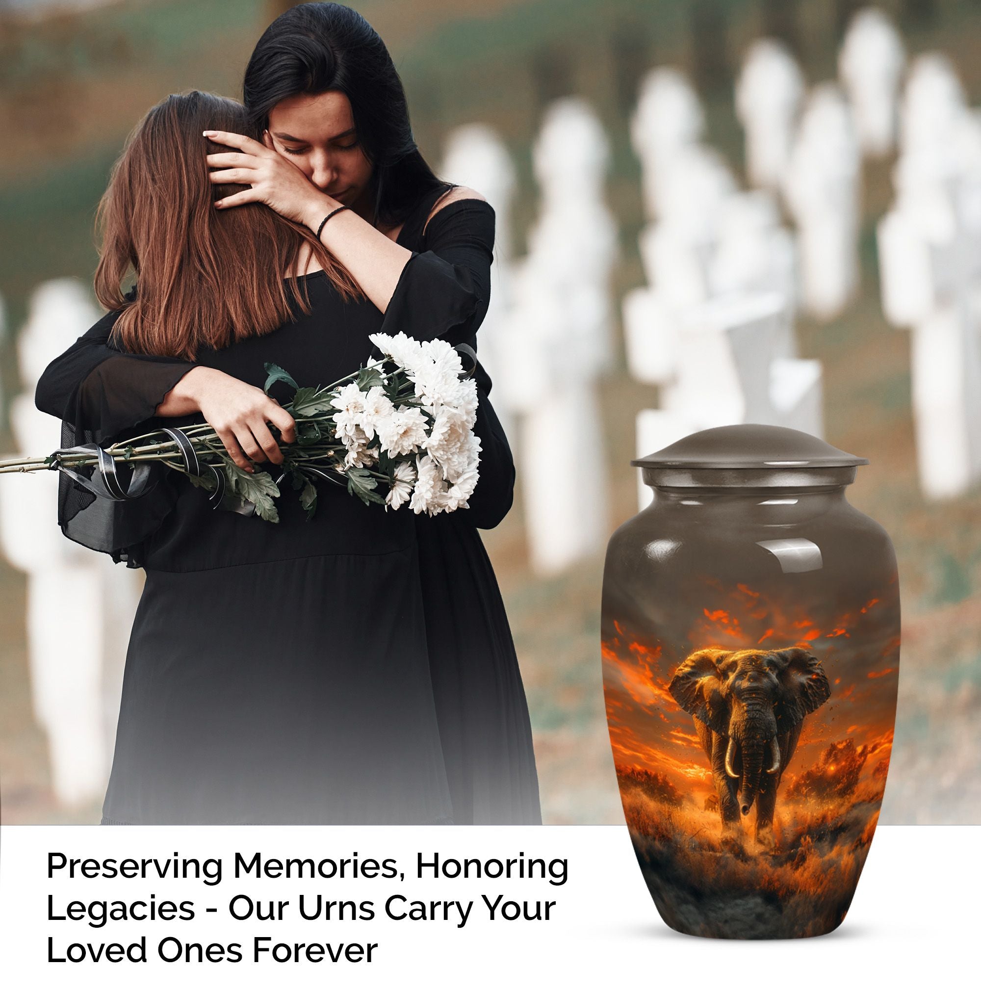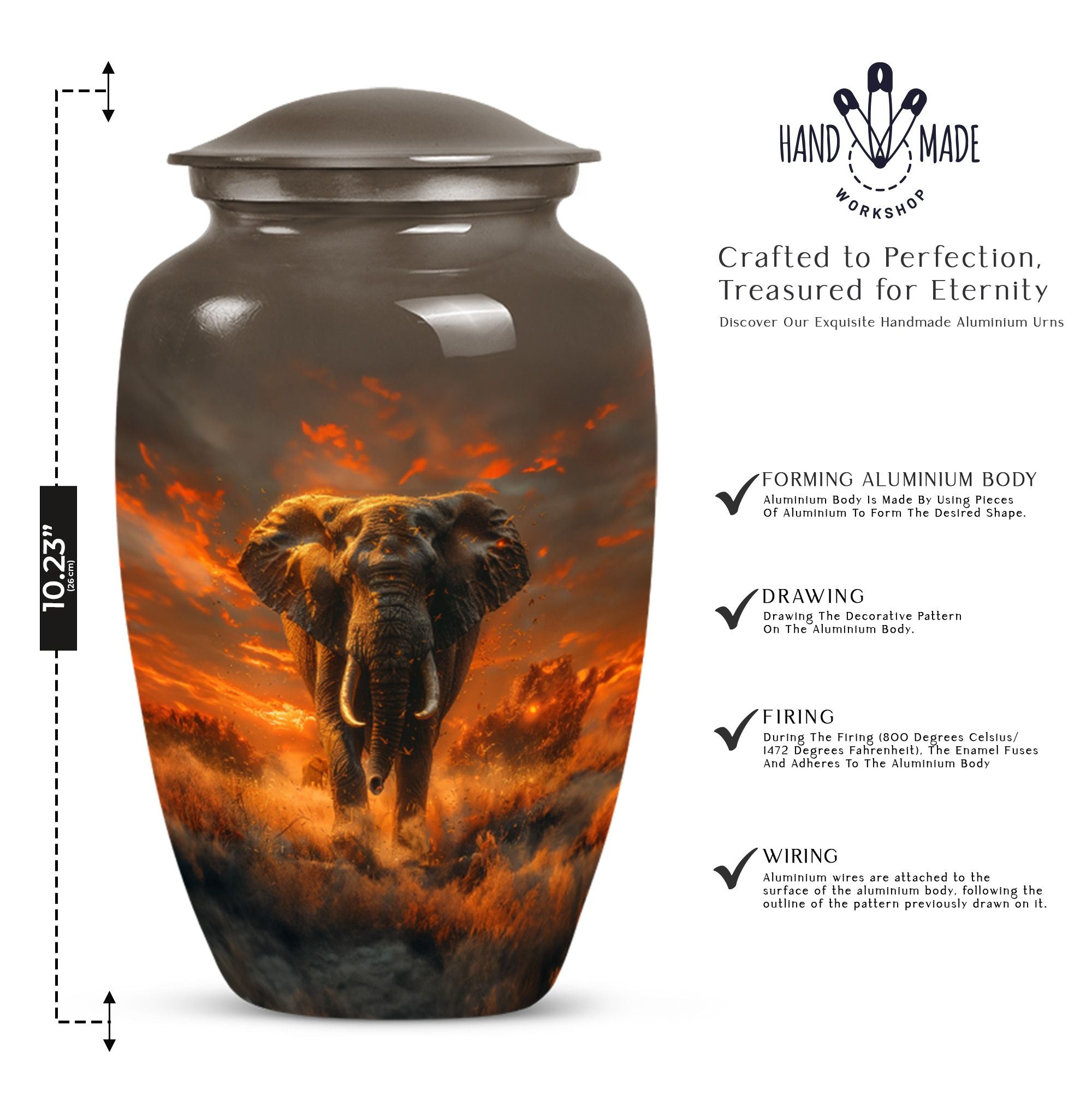 A tribute worthy of fond memories, this 10 inch elephant urn is a beautiful repository to memorialize your loved ones. Crafted from high-grade aluminium for strength and longevity, this large urn weighs a substantial 3.3 pounds and accommodates up to 200 cubic inches of ashes, making it suitable for adult funeral services. True to its classic urn styling, featuring elegantly designed flowers to bring a sense of peace and solace. Each urn comes with a delicate velvet pouch that provides a protective home for the ashes. Personalize this memorial urn with engraved names, adding an intimate touch to this commemoration of life's journey. Ideal for those seeking 'forever urns' or 'urns for mom,' its elegant structure and thoughtful design are a testament to individuality and memory. Offering reassurance and comfort, our elephant urn, specifically crafted with human ashes in mind, aims to love and honour for a lifetime.
