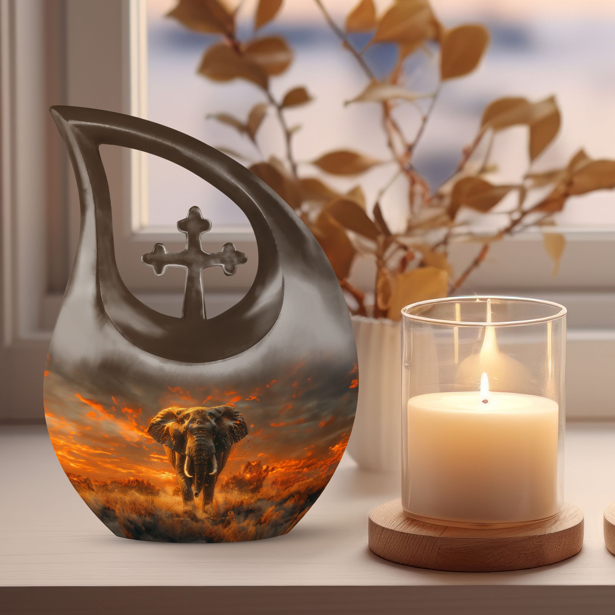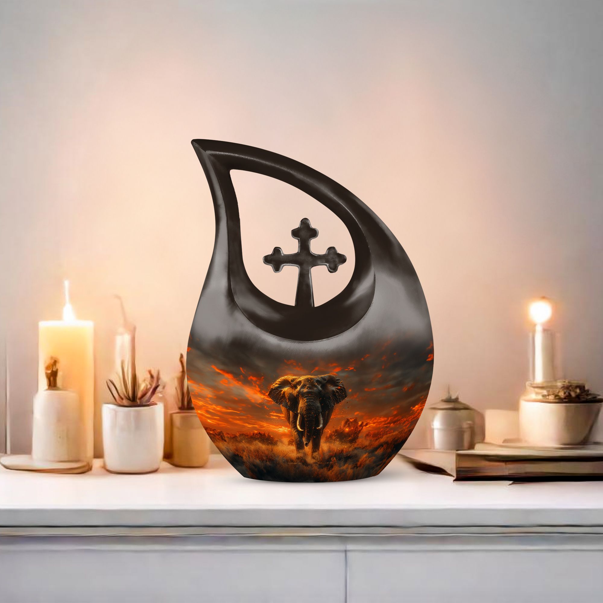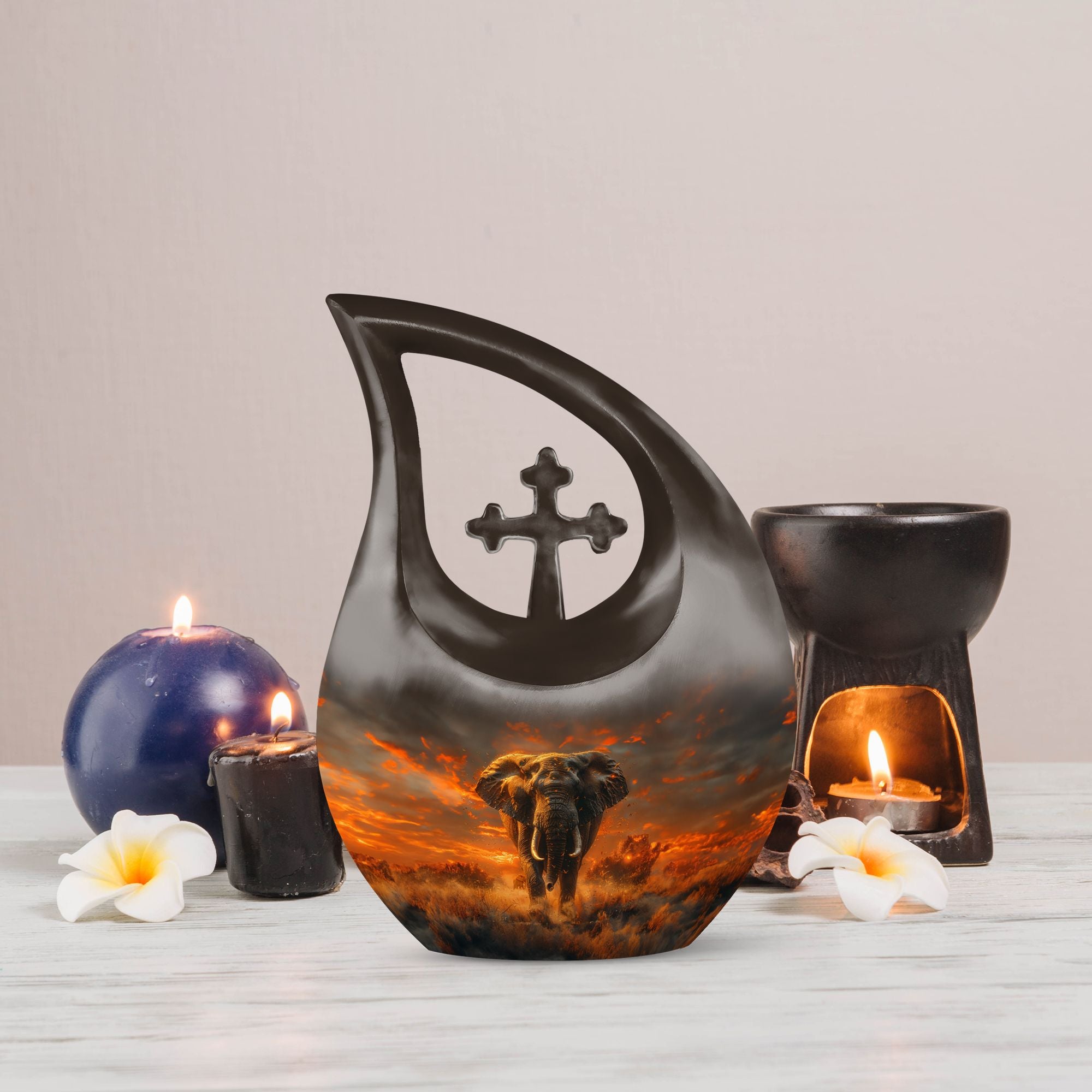 Cherish the memory of your loved one with our large 'Elephant Urn,' thoughtfully chosen from our Urns for Angels collection. The urn's captivating 'Cross Drop' theme exemplifies strength and respect, ideal for a peaceful and dignified resting place. Beautifully fashioned with strong and resilient aluminium, the piece exhibits exquisite craftsmanship. Its dimension stands regal at 10 inches, possessing a capacity of 200 cubic inches, suitable for human ashes. The urn weighs 3.3 pounds, symbolic of the solid, enduring love and memories it encapsulates. A velvet pouch is provided for careful containment of the ashes. Furthermore, our urn allows for customization, offering an opportunity to personalize its appearance with engraved names, reflecting a tribute that's uniquely yours. Incorporate this blend of functional and aesthetic appeal in your memorial tribute with our modern urns, either as a burial urn or a remembrance urn for ashes. Let this well-crafted piece in your memorabilia bring solace and celebrate love beyond life.