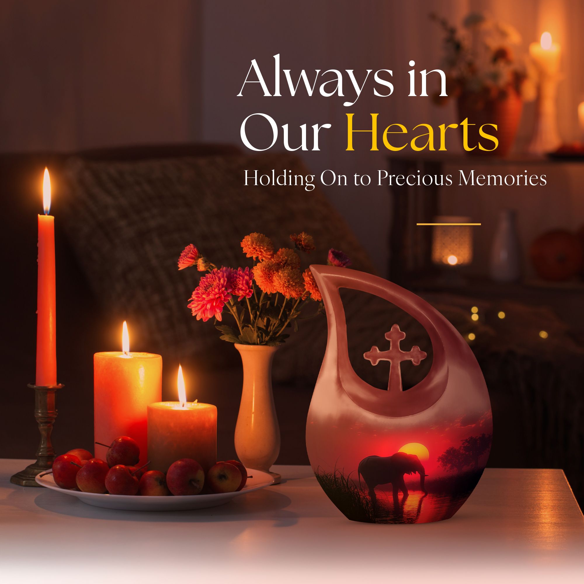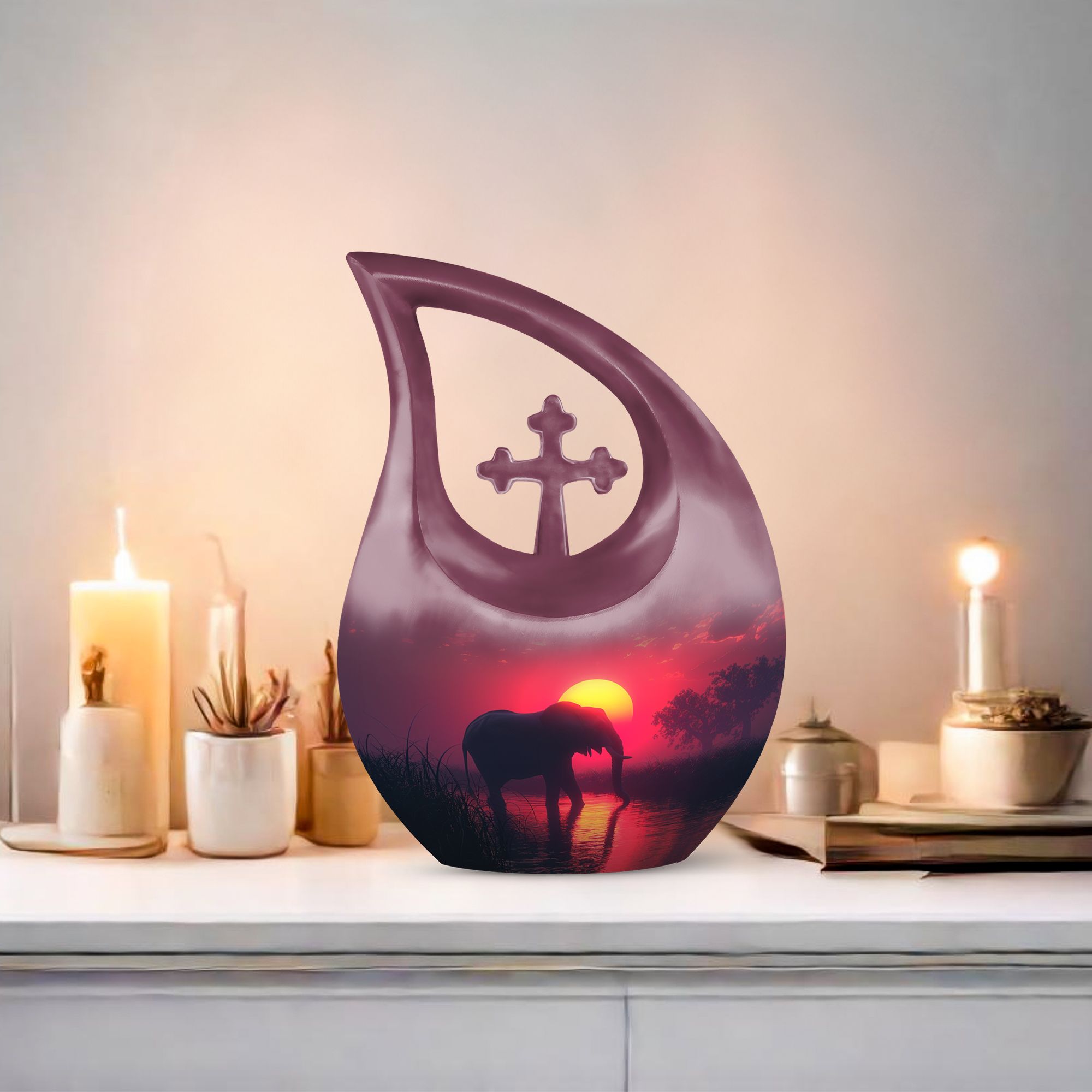 Exemplify your reverence and honor towards your beloved ones with our exquisite Elephant Urn. Handcrafted in durable aluminium, this cremation container measures 10 inches in height and weighs a substantial 3.3 pounds. It can hold up to 200 cubic inches of ashes, perfect for large urn requests. The urn magnificently integrates a Cross Drop concept, offering a unique and passionate way to memorialize your cherished ones. Our robust elephant theme captures the essence of strength, loyalty, and remembrance, making this urn a highly significant keepsake. As an added touch, we offer you the possibility to personalize this memorial urn with engraved names. Also, each Elephant Urn comes with a velvet pouch, ensuring proper containment and respect for the ashes. Whether you are after an urn for dad or a large urn for ashes, our Elephant Urn offers you not just a product but a tangible rememberance of your loved one's spirit and life.
