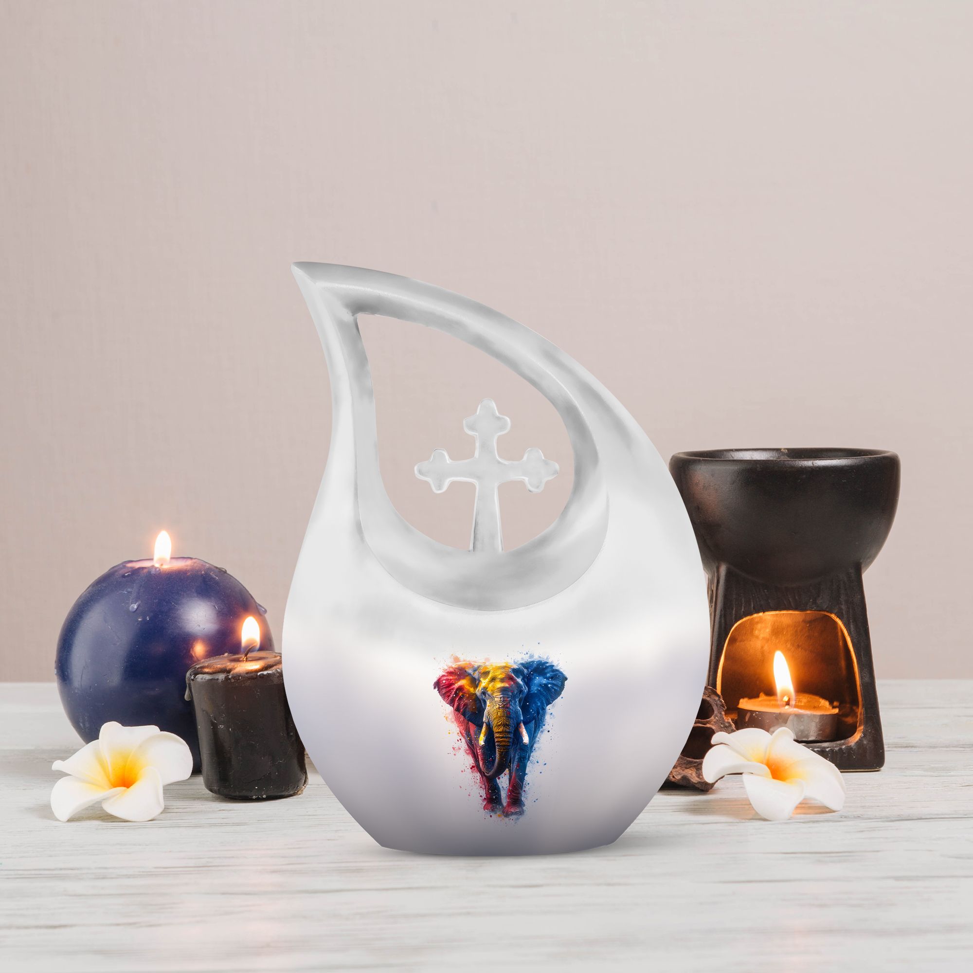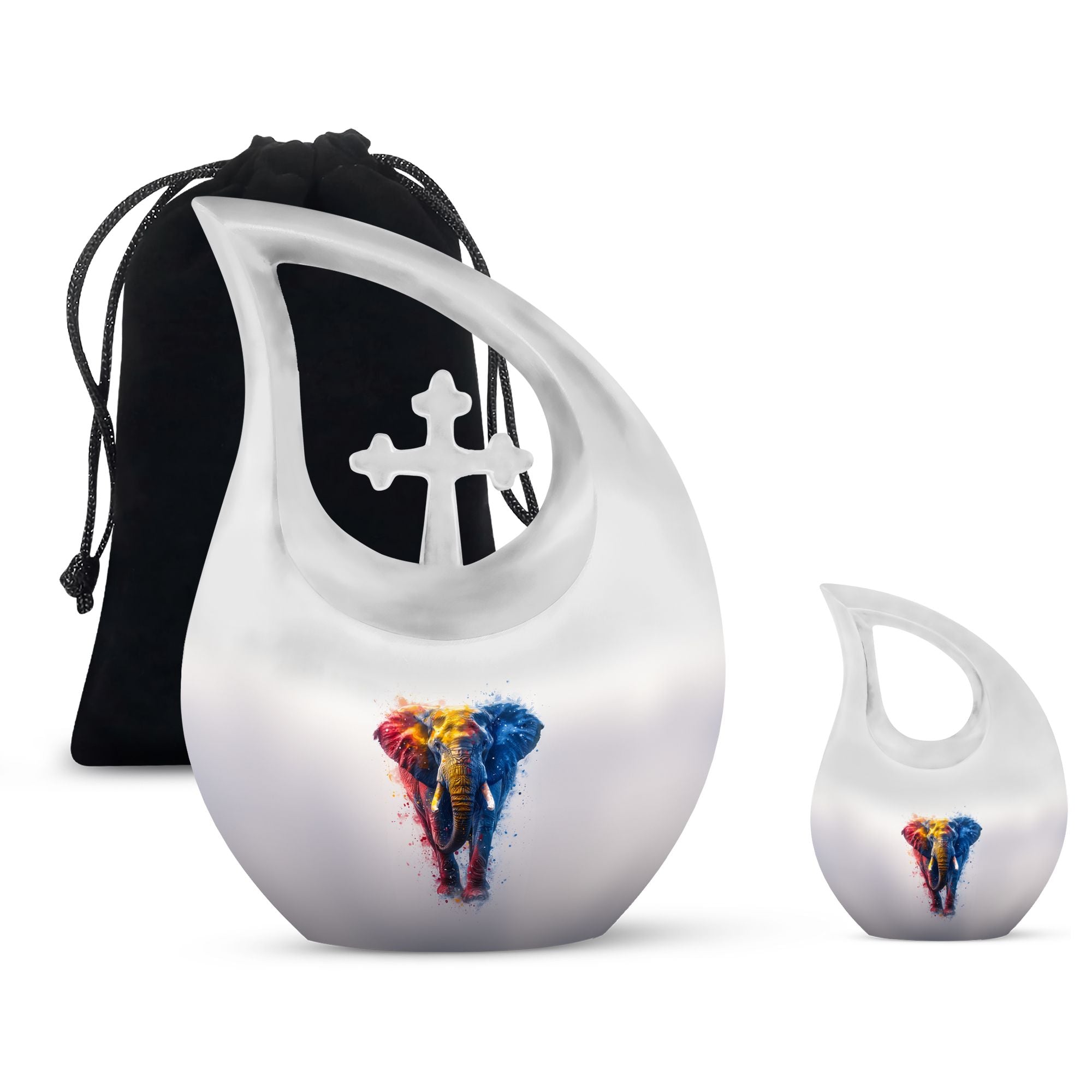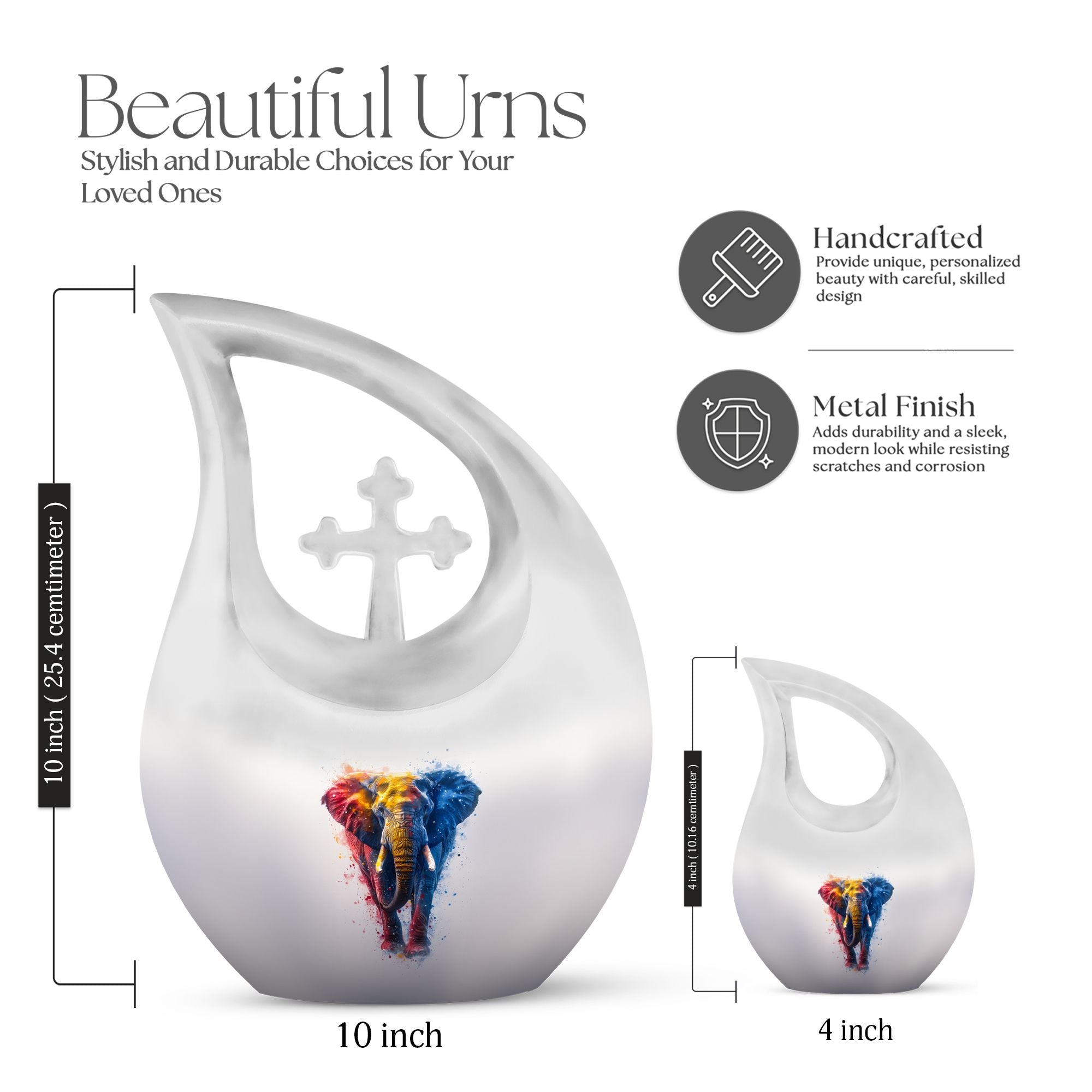 Appealing to the eye and heart, this 10-inch Elephant Themed Urn is an ideal choice for religious and ceremony purposes. Uniquely crafted with an 'Elephant' theme, this large urn is made from high-quality aluminium promising durability and long-lasting use. Weighing at a mere 3.3 pounds, this urn embodies the 'Cross Drop' motif giving it a distinct design and touch. The urn offers an impressive capacity of 200 cubic inches, ensuring sufficient space for containment of ashes. The urn comes with a soft velvet pouch adding an extra layer of protection and respect. It offers scope for personalization where you can engrave the names of your beloved, making it more personal and memorable. This product serves as a perfect symbol of tribute and respect, encapsulating the essence of your love for the departed soul. Perfect for online purchase, this 'Elephant Urn' is a stand-out value proposition in 'Urns Online'. Enhance your memorial experience by choosing our urns, where the combination of class and reverence is unparalleled.