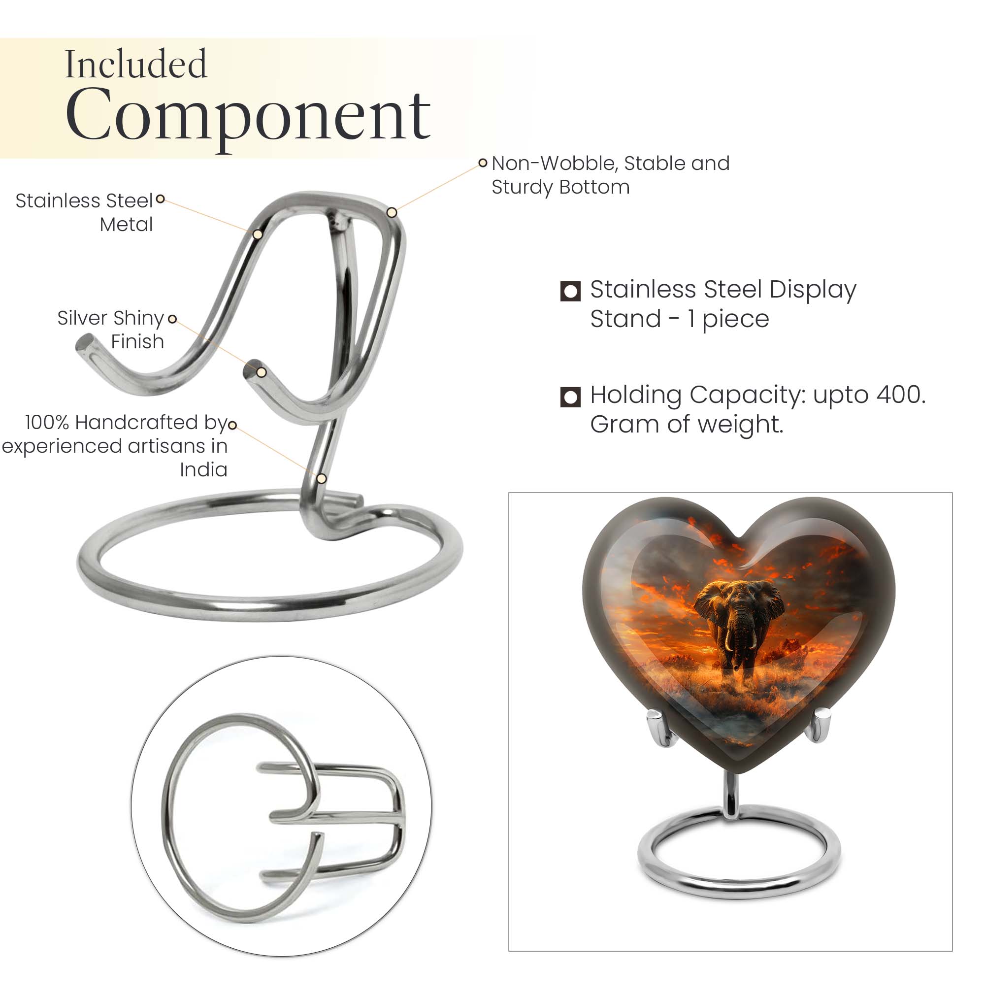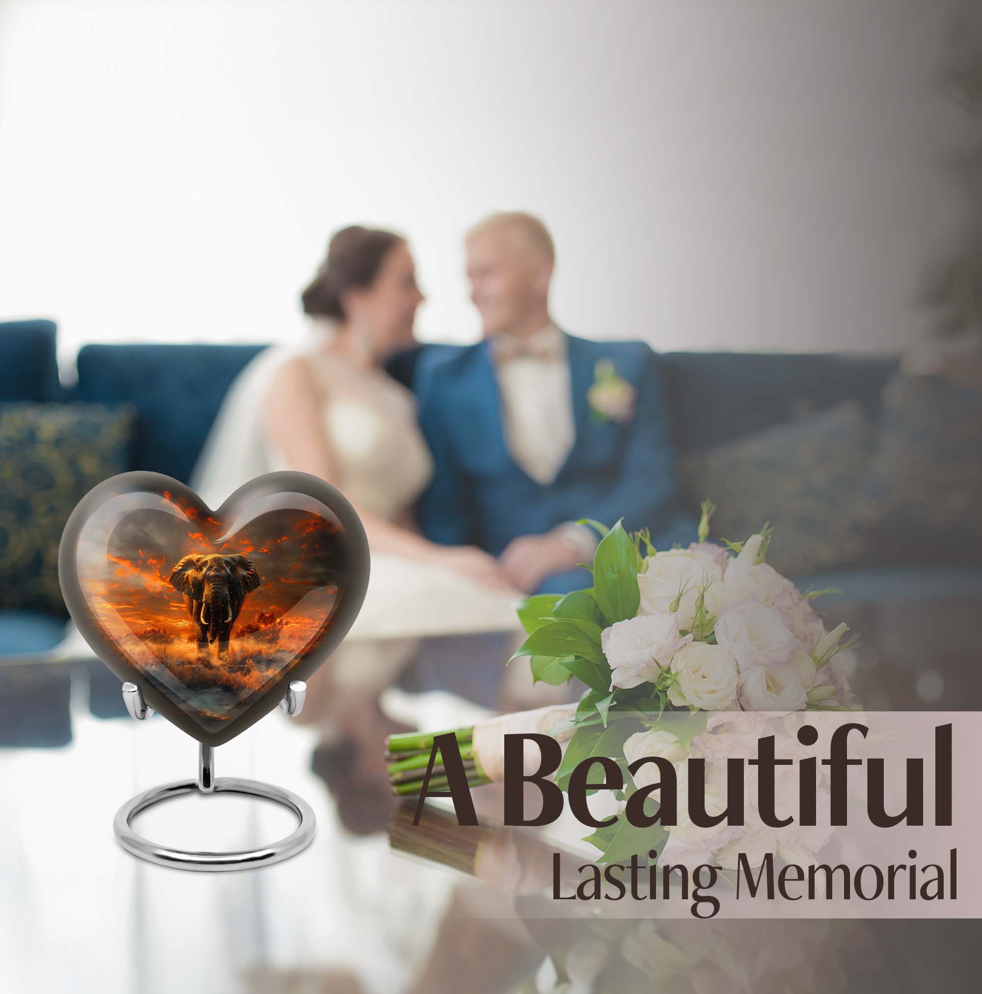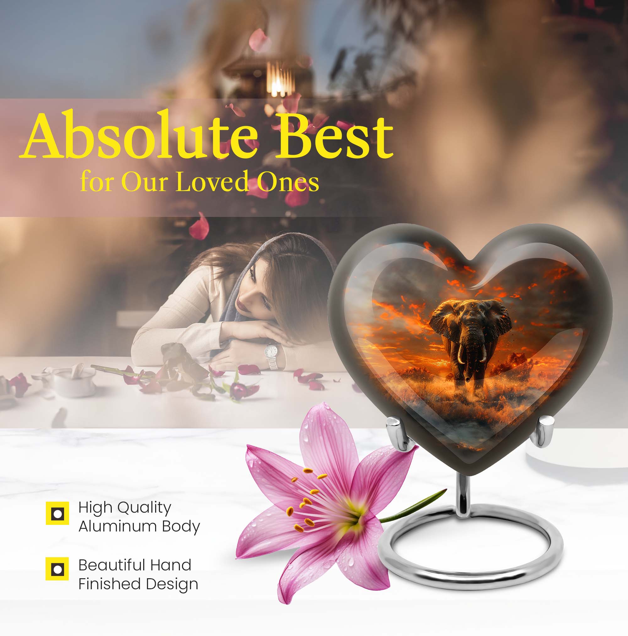 A cherished symbol of rest, this large-sized 'Heart Urn' is more than a resting place for your loved one, it’s a beautiful piece of art. Crafted from sturdy aluminum with an intricate floral theme, this urn serves as a heart-touching tribute. Standing at a substantial 10 inches in height and accommodating an impressive 200 cubic inches in capacity, it's exceptionally suited to serve as a memorial urn for human ashes. Weighing a sturdy 3.3 pounds, the urn adds gravitas to your memorial display. The touching homage extends to a beautiful velvet pouch that elegantly contains the ashes. For an intimate touch, the urn also allows for personalization. Engrave it with the dearly departed's name to create a unique testament to their life. Perfectly fitting keywords to search for this product include 'elephant urn', 'funeral adult urns for human ashes', 'memorial forever urns', 'urn human women', 'urns for mom', and 'funeral urns for ashes'. Honor your loved one's memory - choose our Heart Urn today.