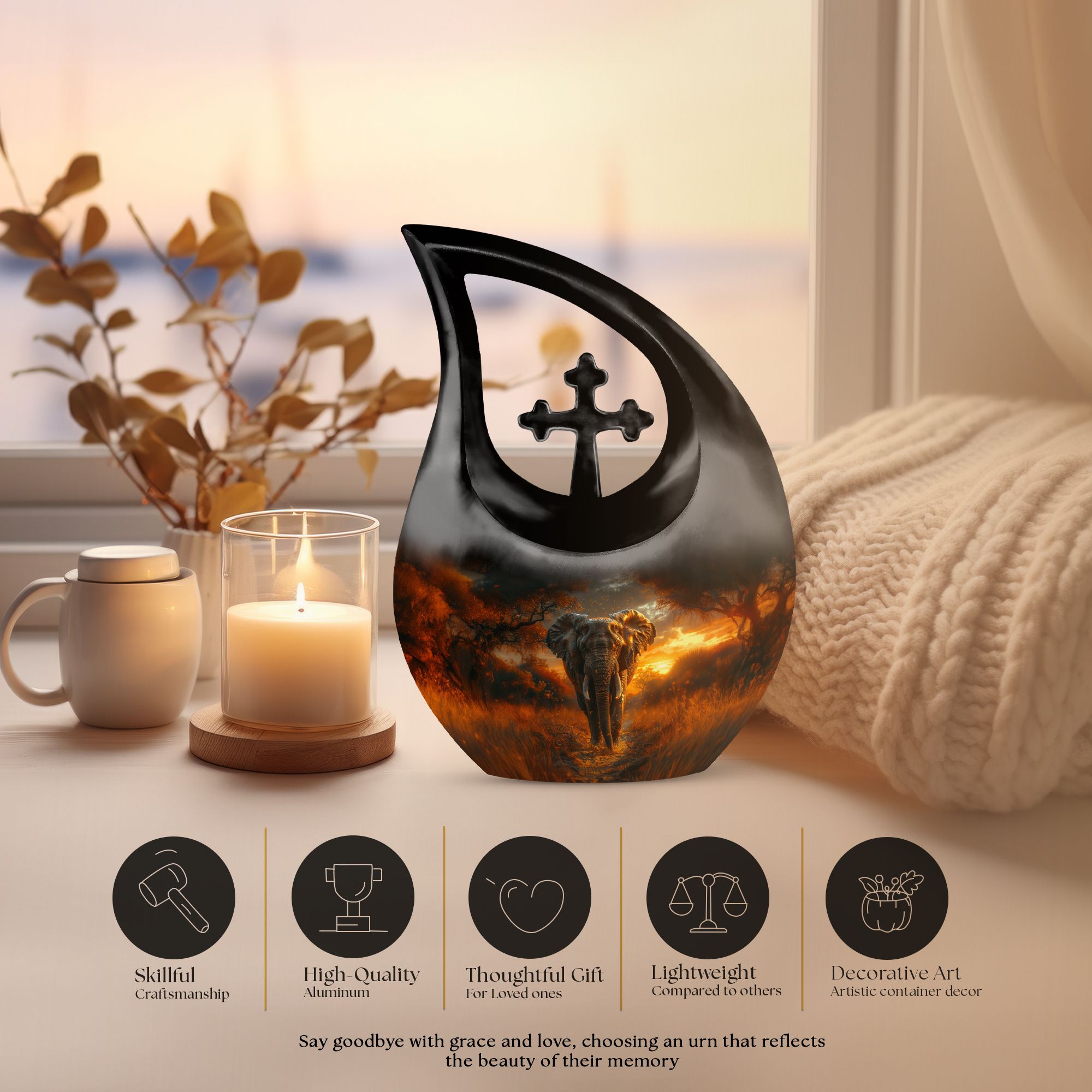 Introducing our strikingly unique, tailor-made Elephant Urn. Designed to treasure your beloved's ashes, this companion urn, fashioned from top-grade aluminium, provides a poignant, tender touch to any memorial ceremony. Ideal for adults, its elephant theme resonates with longevity, strength and dignity. Its large size of 10 inches, and weight of a solid 3.3 pounds, ensures an ample capacity of 200 cubic inches - sufficient for the cherished remains of your dearly departed. The urn's stunning 'Cross Drop' aesthetic imparts an edifying nobility, and for a personal touch, it can be personalized by engraving names. Ensuring convenience, it comes with a velvet pouch for tasteful containment of ashes. This memorial urn, a tribute to the deceased, balances reverence and remembrance perfectly. Moreover, this urn serves as a remarkable choice for 'Urn for Dad', 'Box urns for Human ashes', and 'Unique urns for Dad' seekers. Create an unforgettable tribute with our Elephant Urn.