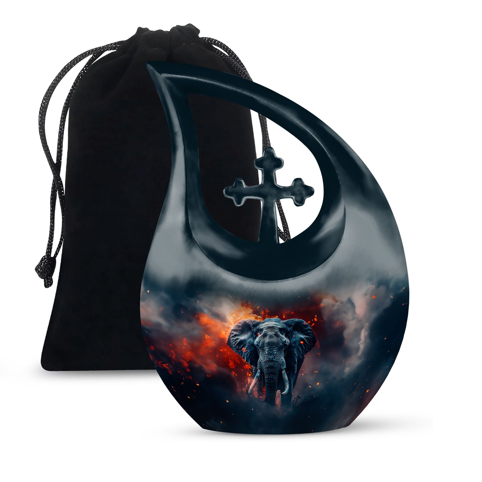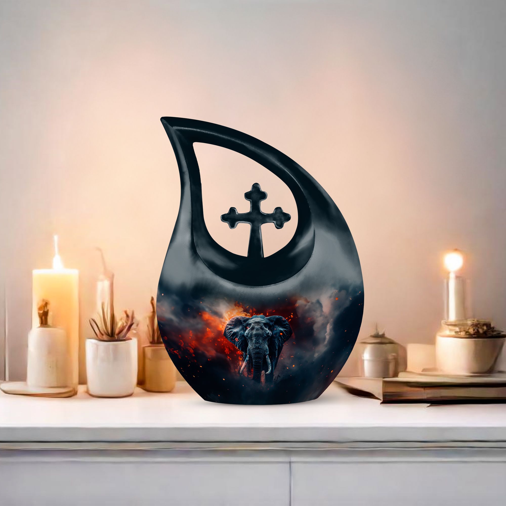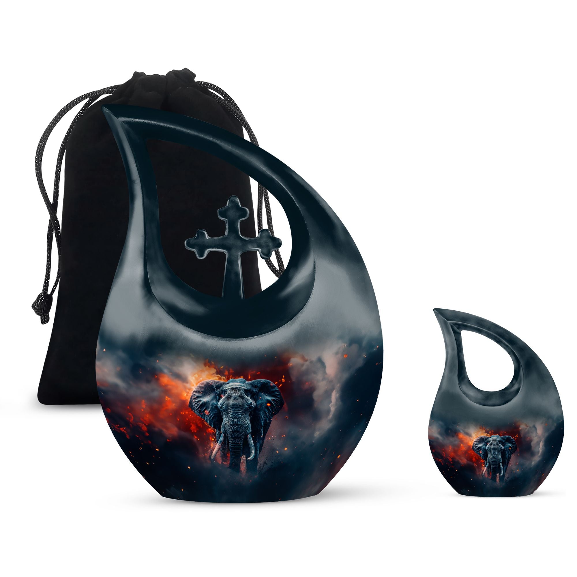 Elevate a memorial ceremony with a uniquely designed Elephant Urn. This 10-inch memorial urn weights 3.3 pounds, meticulously crafted from high-quality aluminium. It stands out not just in size, but also in the attention to detail which provides a beautiful closure to a life well-celebrated. Praised for its large capacity, it adequately accommodates up to 200 cubic inches of remains. A lovely and thoughtful aspect of this urn is the 'Cross Drop' motif that adorns its surface, exuding peace and tranquility, subtly elevating its sacred purpose. Personalization is available to inscribe the names of your loved one, making it a one-of-a-kind memento. This product comes with a velvet pouch for containment of the ashes, rounding off its supreme functionality with a touch of elegance. Explore our selection for more beautiful urns, decorative urns, burial urns for human ashes, and full size urns for human ashes.