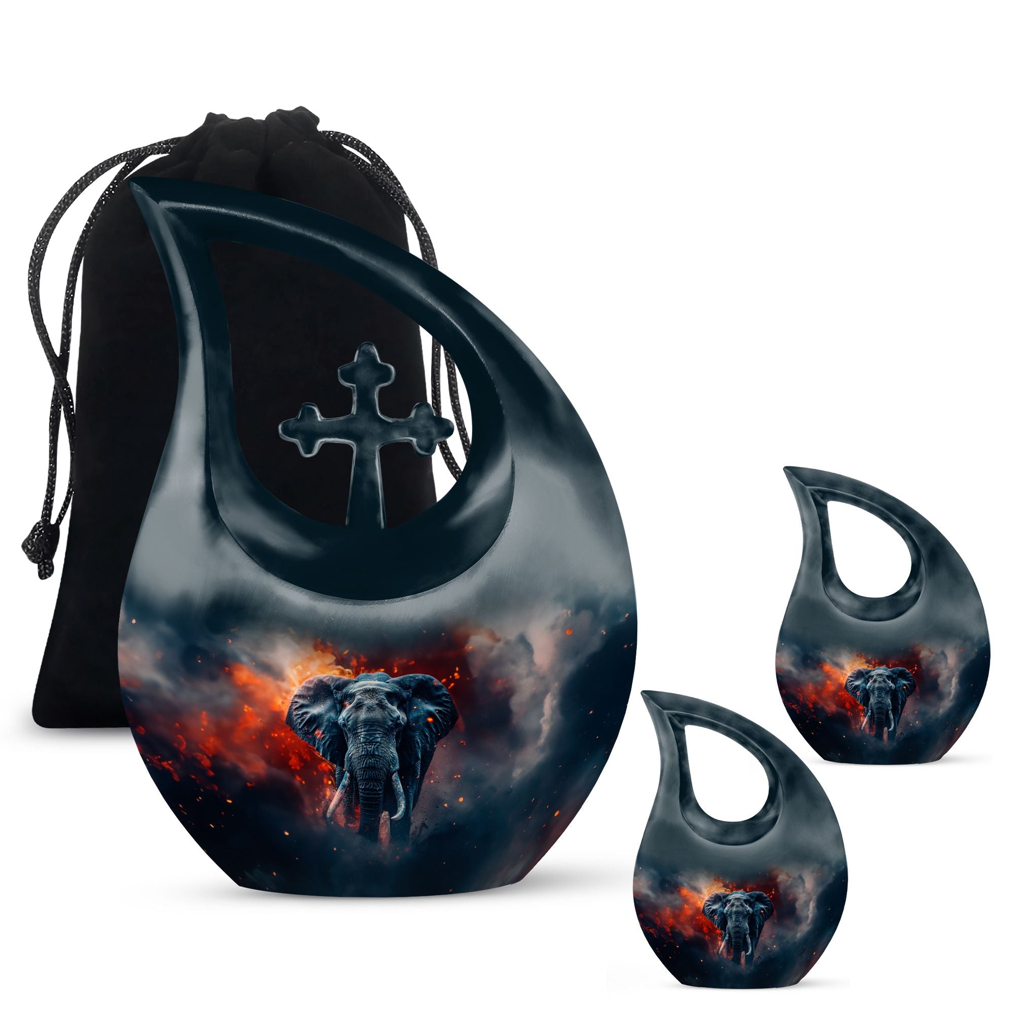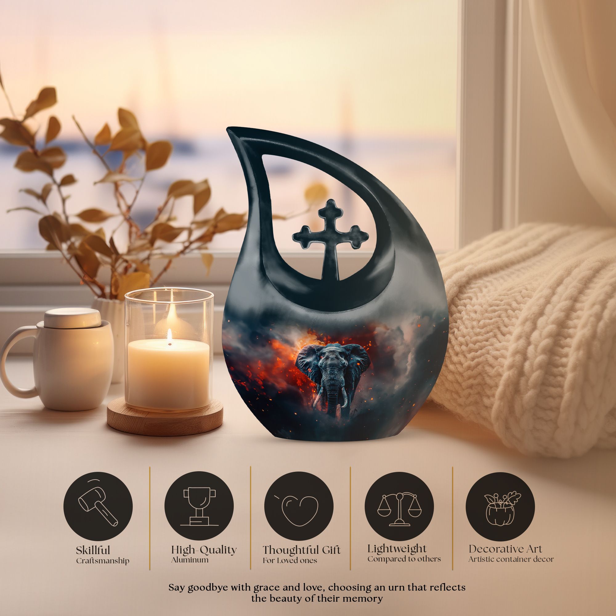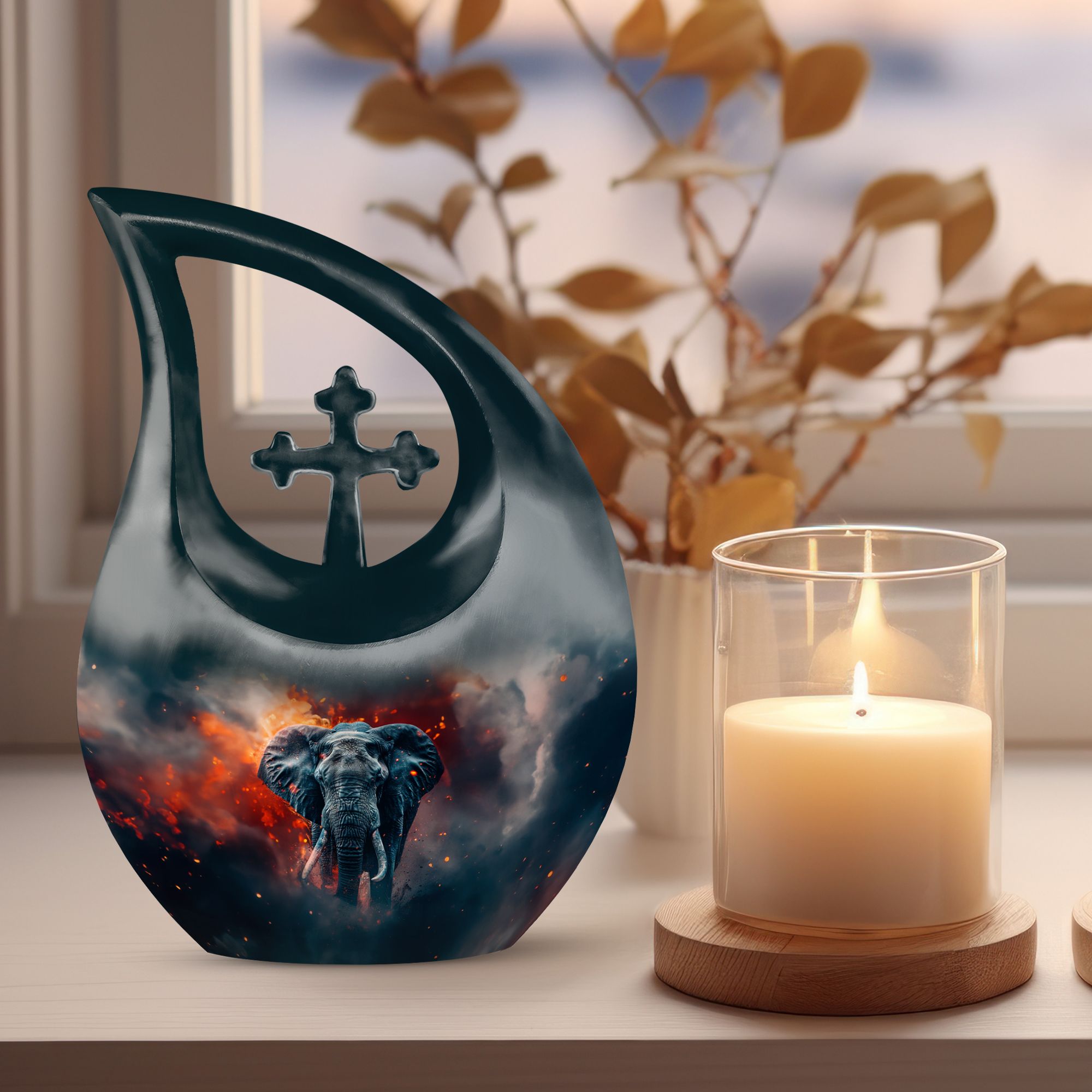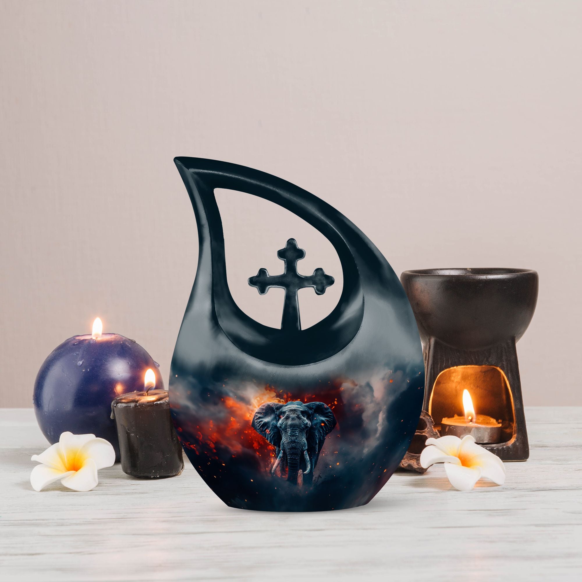 Elevate a memorial ceremony with a uniquely designed Elephant Urn. This 10-inch memorial urn weights 3.3 pounds, meticulously crafted from high-quality aluminium. It stands out not just in size, but also in the attention to detail which provides a beautiful closure to a life well-celebrated. Praised for its large capacity, it adequately accommodates up to 200 cubic inches of remains. A lovely and thoughtful aspect of this urn is the 'Cross Drop' motif that adorns its surface, exuding peace and tranquility, subtly elevating its sacred purpose. Personalization is available to inscribe the names of your loved one, making it a one-of-a-kind memento. This product comes with a velvet pouch for containment of the ashes, rounding off its supreme functionality with a touch of elegance. Explore our selection for more beautiful urns, decorative urns, burial urns for human ashes, and full size urns for human ashes.