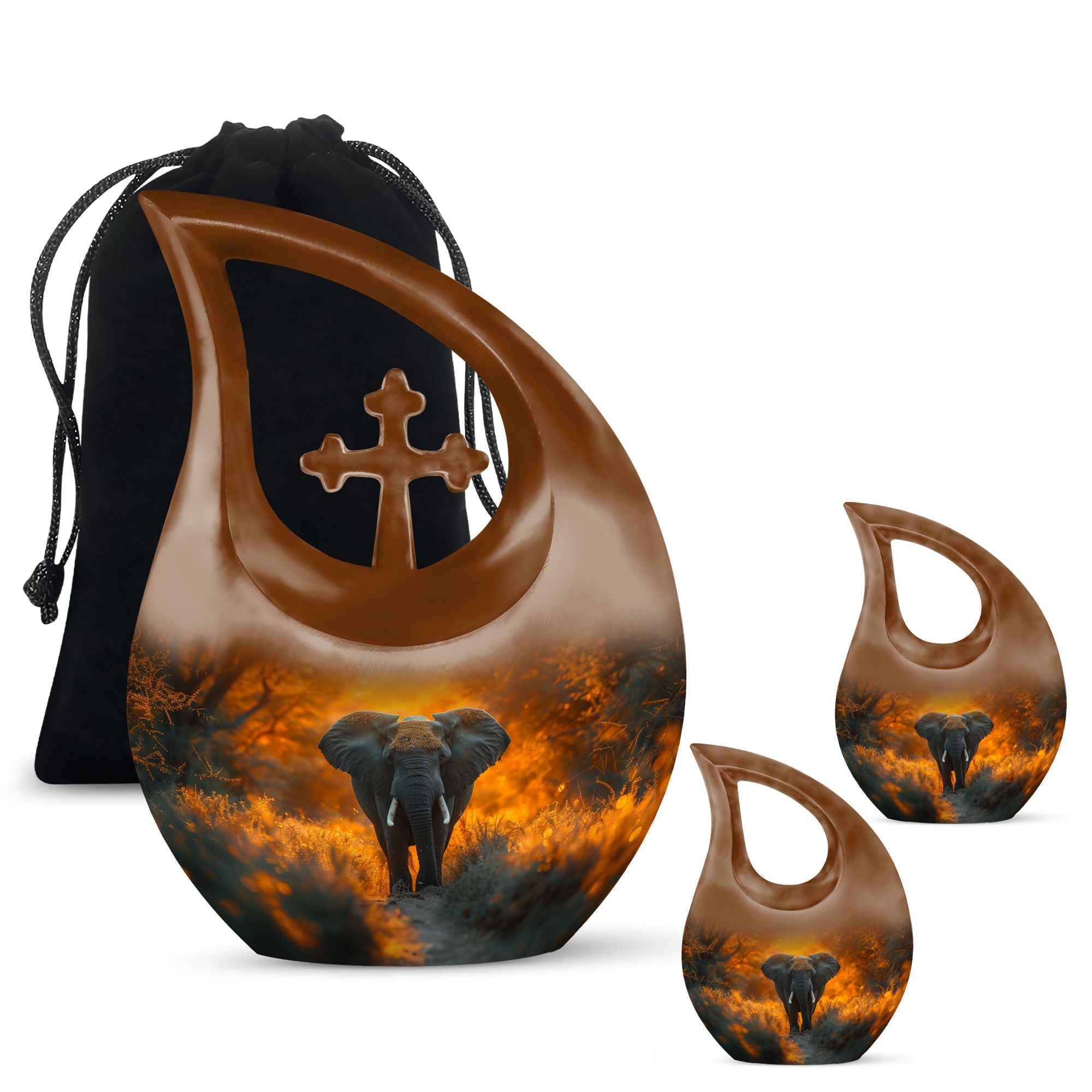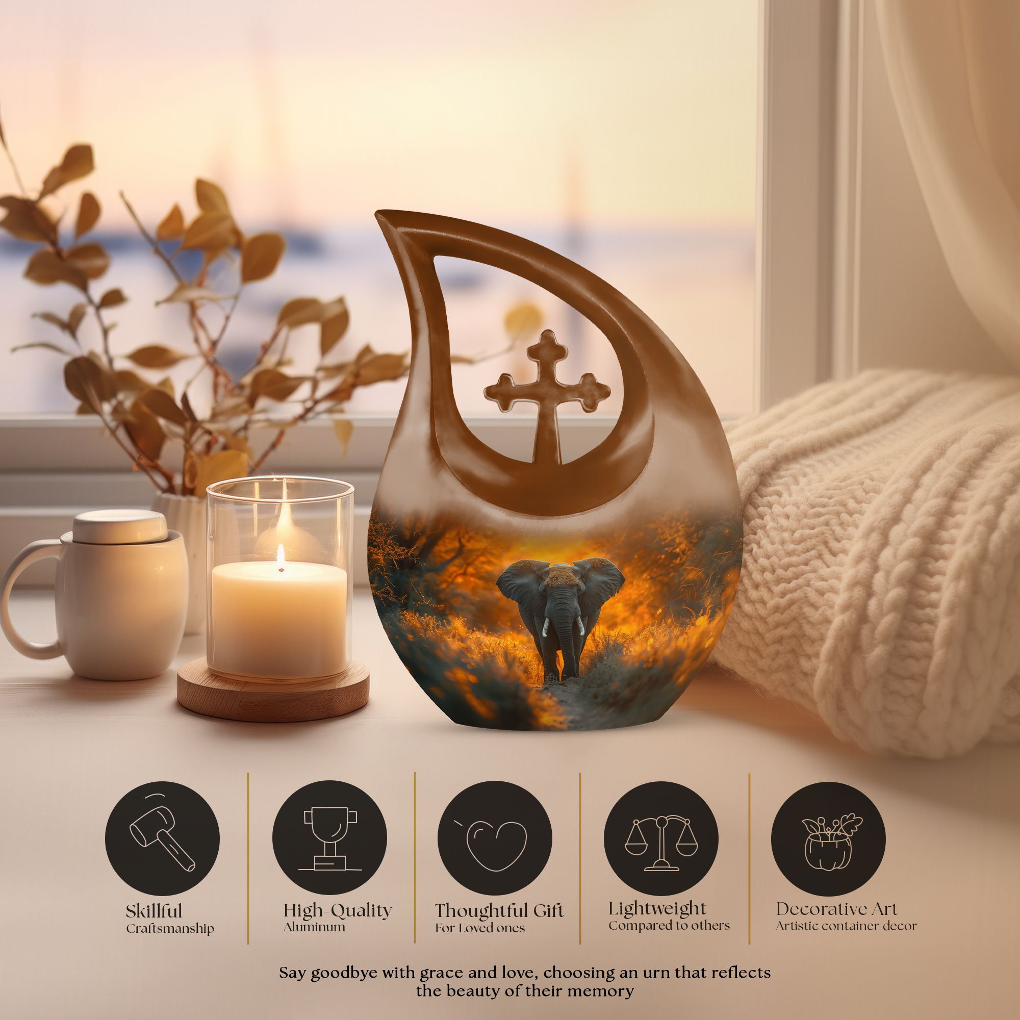 Dignify the memory of a loved one with this beautifully crafted Elephant Urn, a refined and fitting keepsake for ashes. Manifesting a tasteful Cross Drop ensemble, this Aluminium-made, large-sized urn is a testimony of longevity and strength, akin to the noble creature it's themed after. With an expansive capacity of 200 cubic inches and dimensions of 10 inches in height, it securely embraces the mortal remains of a man, with respect and honour. The urn weighs a mere 3.3 pounds, making it both easy to handle and substantial in weight. Provided along is a sumptuous velvet pouch specifically for containment of the ashes, underlining the sanctity of the cherished possession. Plus, emphasize the individuality and imprint traces of your loved one on the urn, thanks to the customization option of engraved names. This offering is truly one of the most distinctively cool urns and a tribute to remember. Perfect if you're researching memorial urns, urns for men's ashes, companion urns for ashes, or urn vaults for sale.