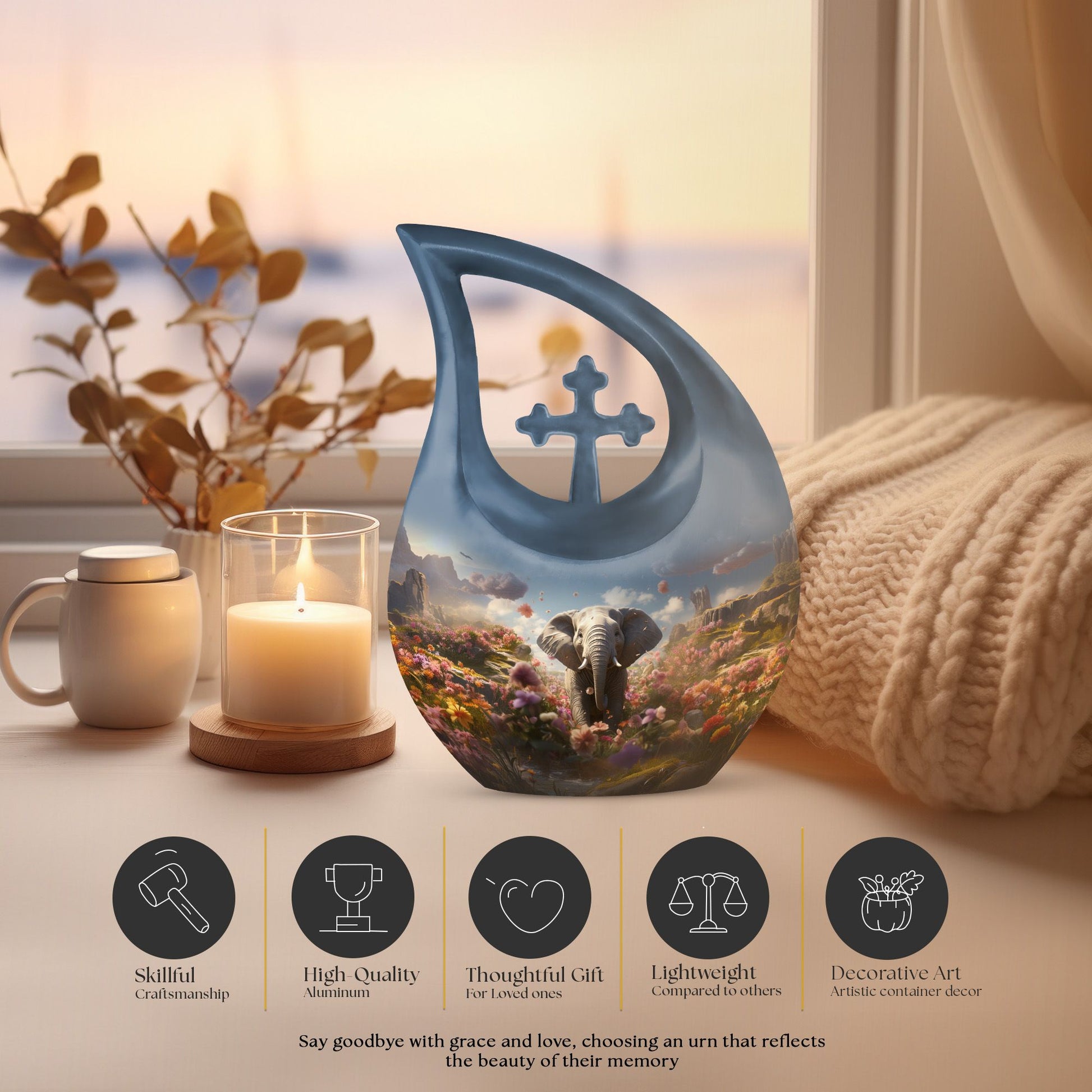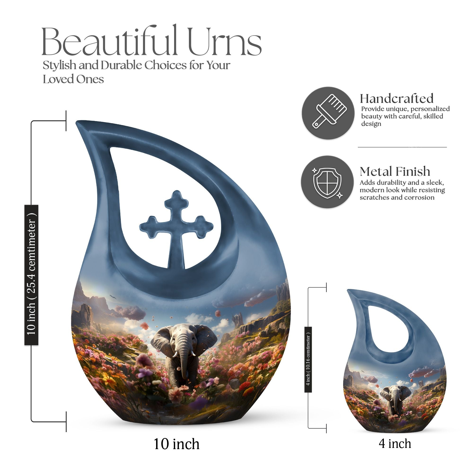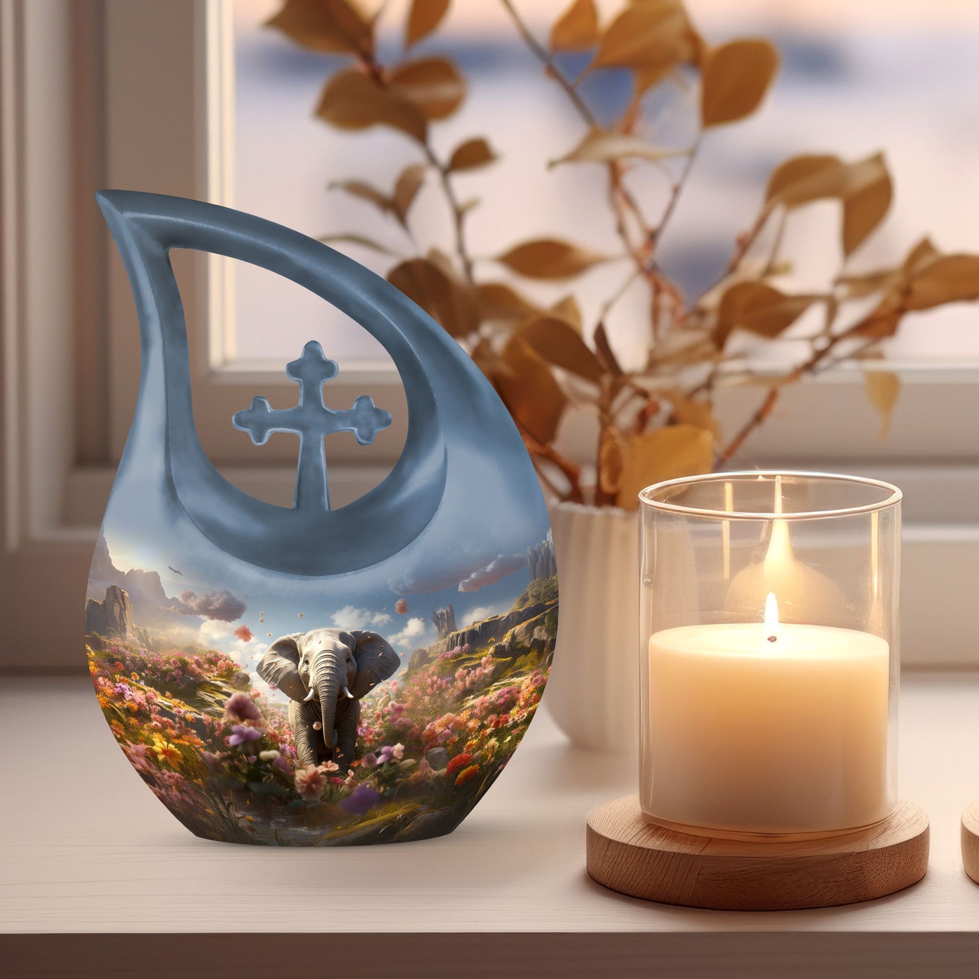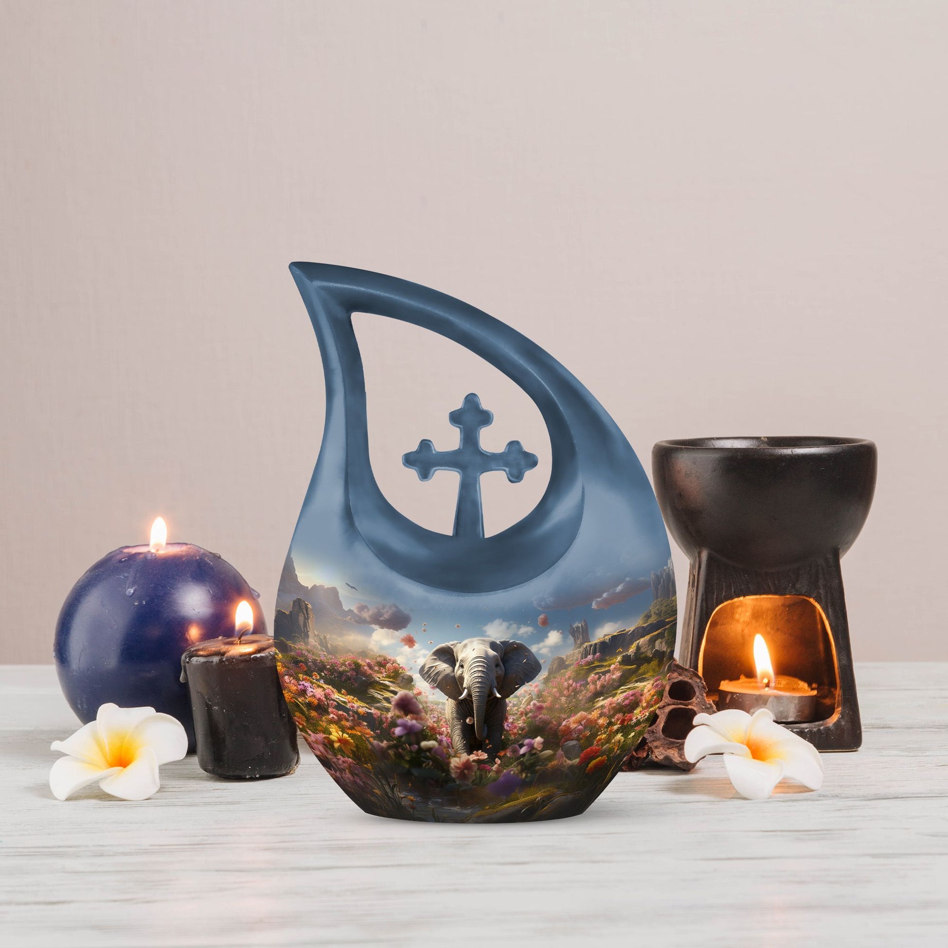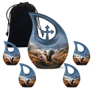 Celebrate the life of your loved one with the Elephant Floral Hillside Cremation Urn, a stunning symbol of peace, beauty, and eternal love. The graceful blue teardrop form evokes serenity and calm, making it a perfect choice among large cremation urns for human ashes and urns for human ashes large. This memorial piece honors life’s journey while offering comfort and elegance.