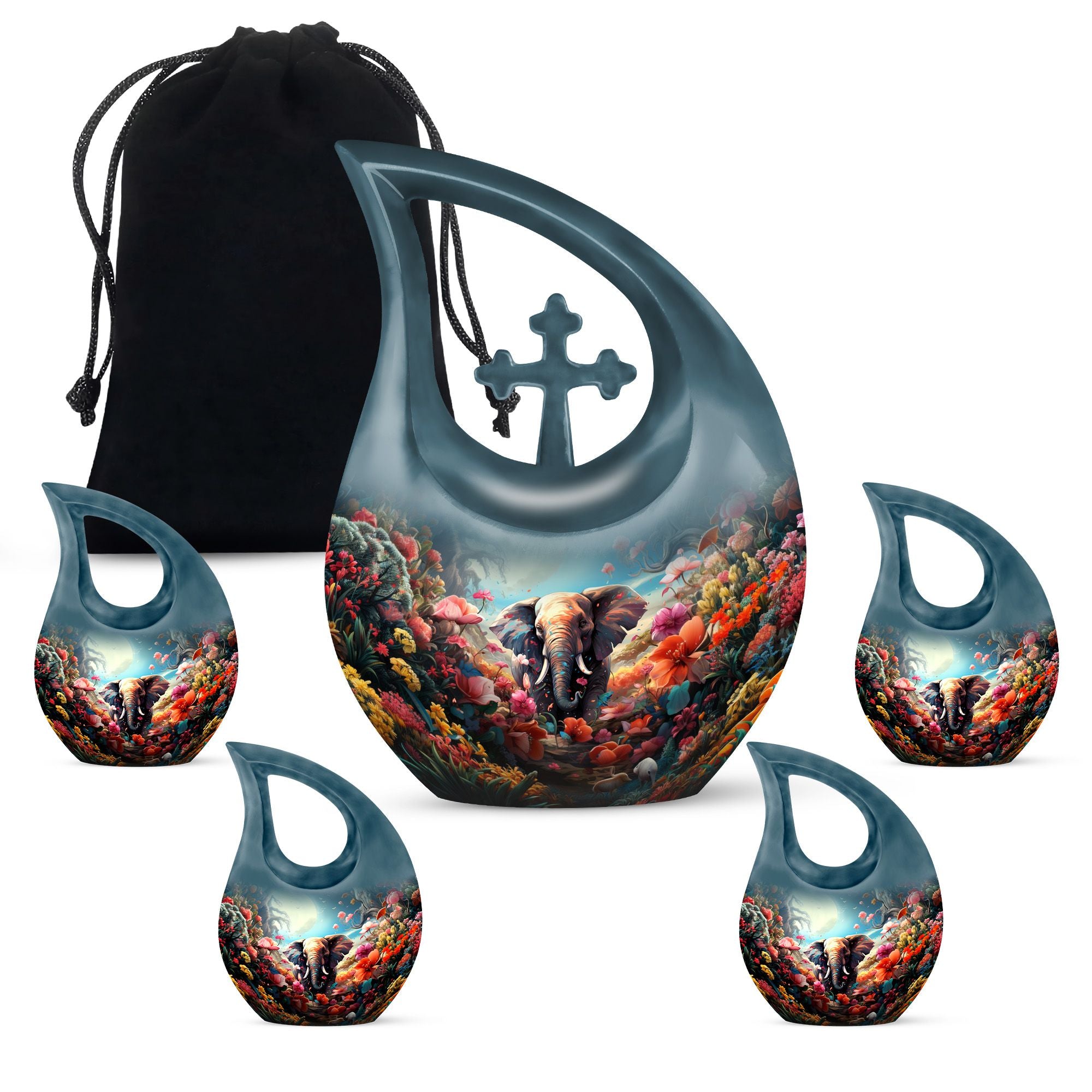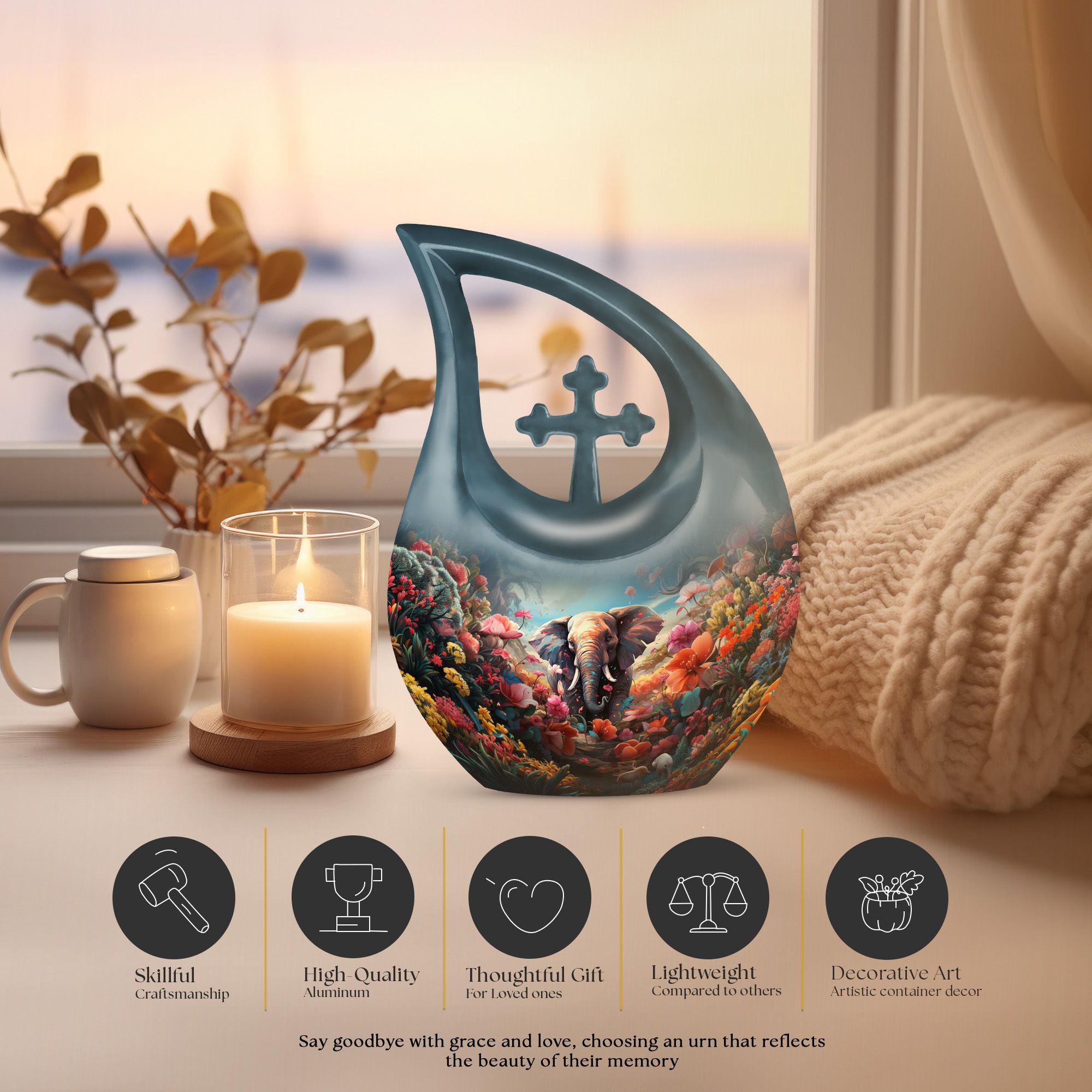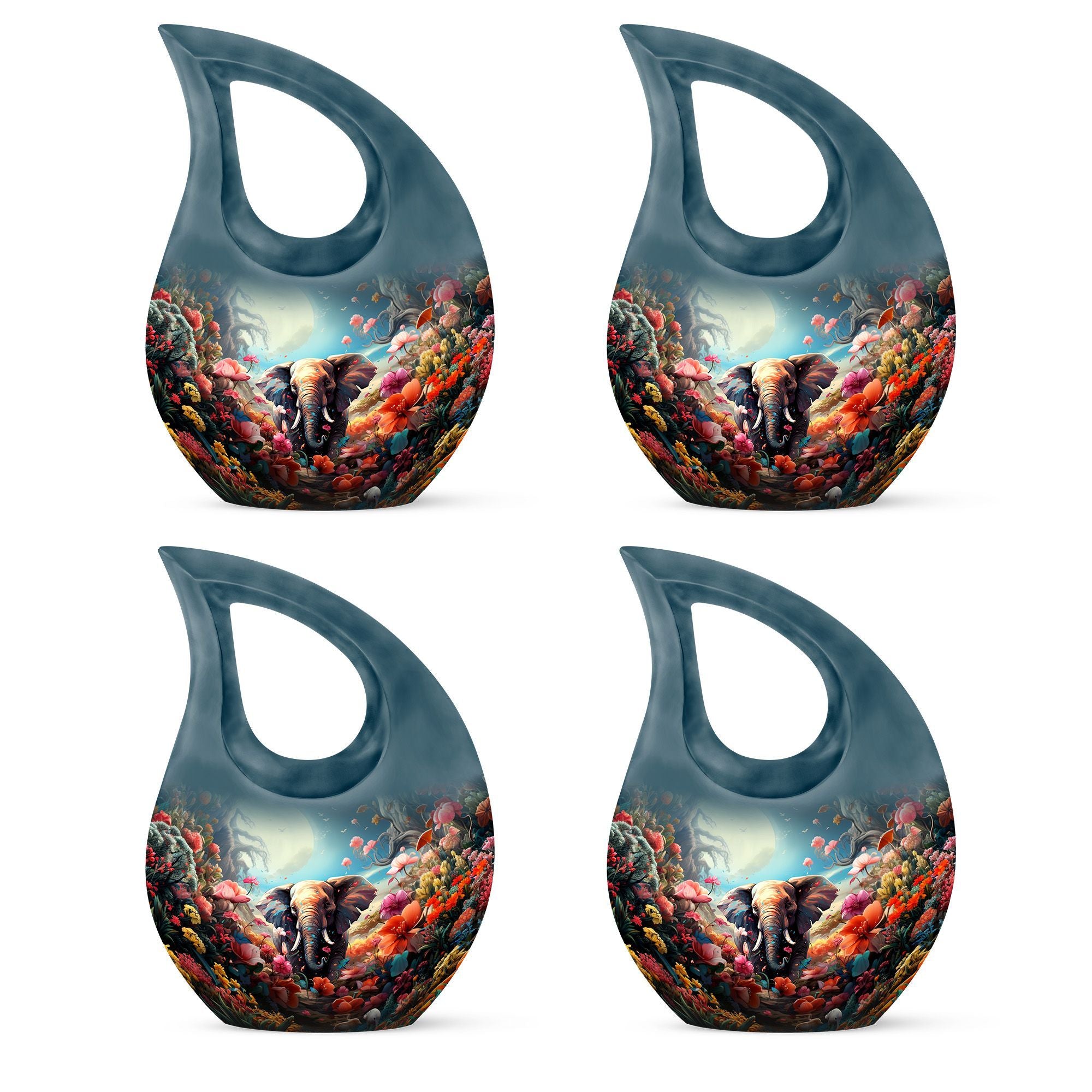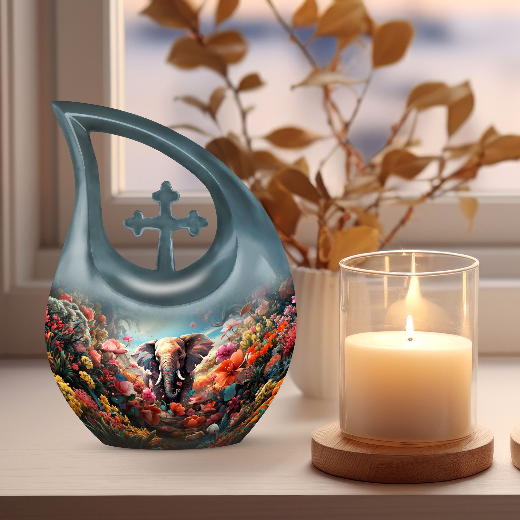 This urn for human ashes adult women is crafted from durable aluminum with a glossy, hand-polished finish. The teardrop silhouette enhances its elegant presence, while the floral and elephant design adds emotional depth and symbolic meaning. With a secure screw-top lid, this urn for women ashes offers both safety and serenity. Its versatile beauty also makes it suitable as one of the most refined funeral urns for men or small urns for women human ashes in a memorial collection.