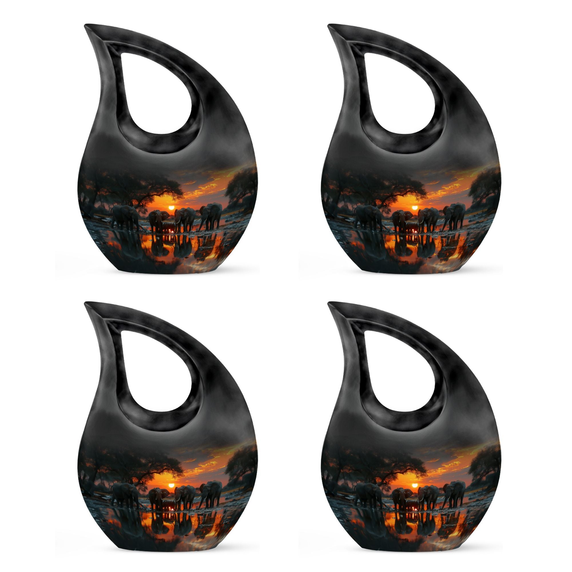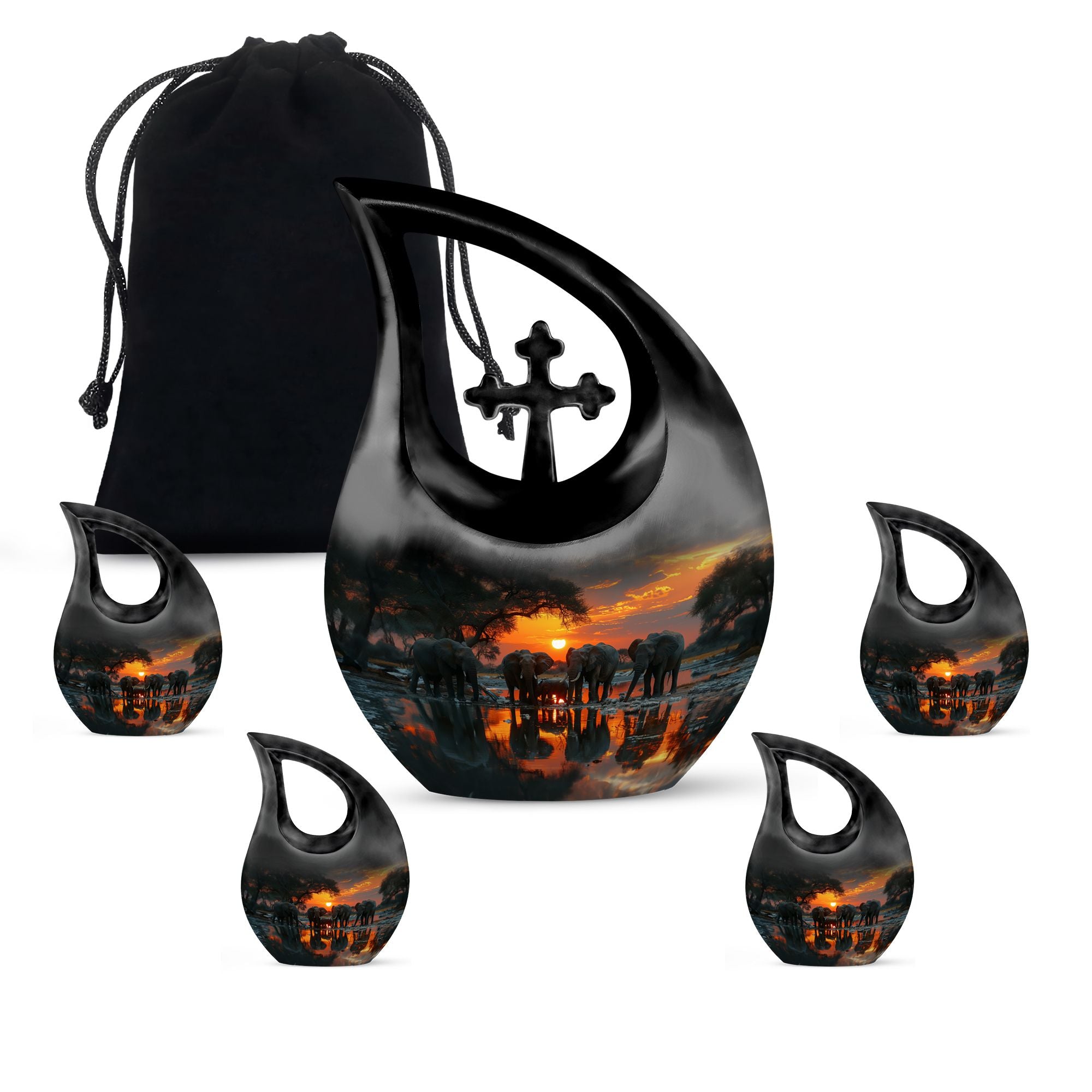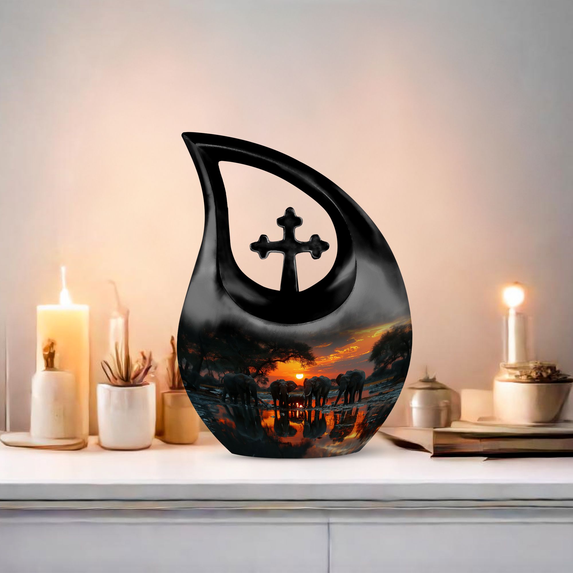 The Elephant Family Urn is a sincerely special memorial piece for your dear one. Crafted in a size of 10 inches, this urn has a capacity of 200 cubic inches, making it an excellent choice for extra large urns. The Cross Drop design is meticulously crafted on the exteriors, symbolizing peace, faith, and the journey of life and death. This unique urn weighs 3.3 pounds, assuring its durability while maintaining a delicate touch. Fashioned from resilient aluminium, it preserves the ashes with grace and longevity. The urn additionally comes with a velvet pouch for containment of ashes, offering an elegant and safe enclosure. For that added pit of personal touch, this urn can be customized with engraved names, making it a truly individual memory of the departed. Perfect for those searching for memorial urns for human ashes, personalized urns, or unique urns for dad, the Elephant Family Urn is the extraordinary remembrance piece you have been looking for.
