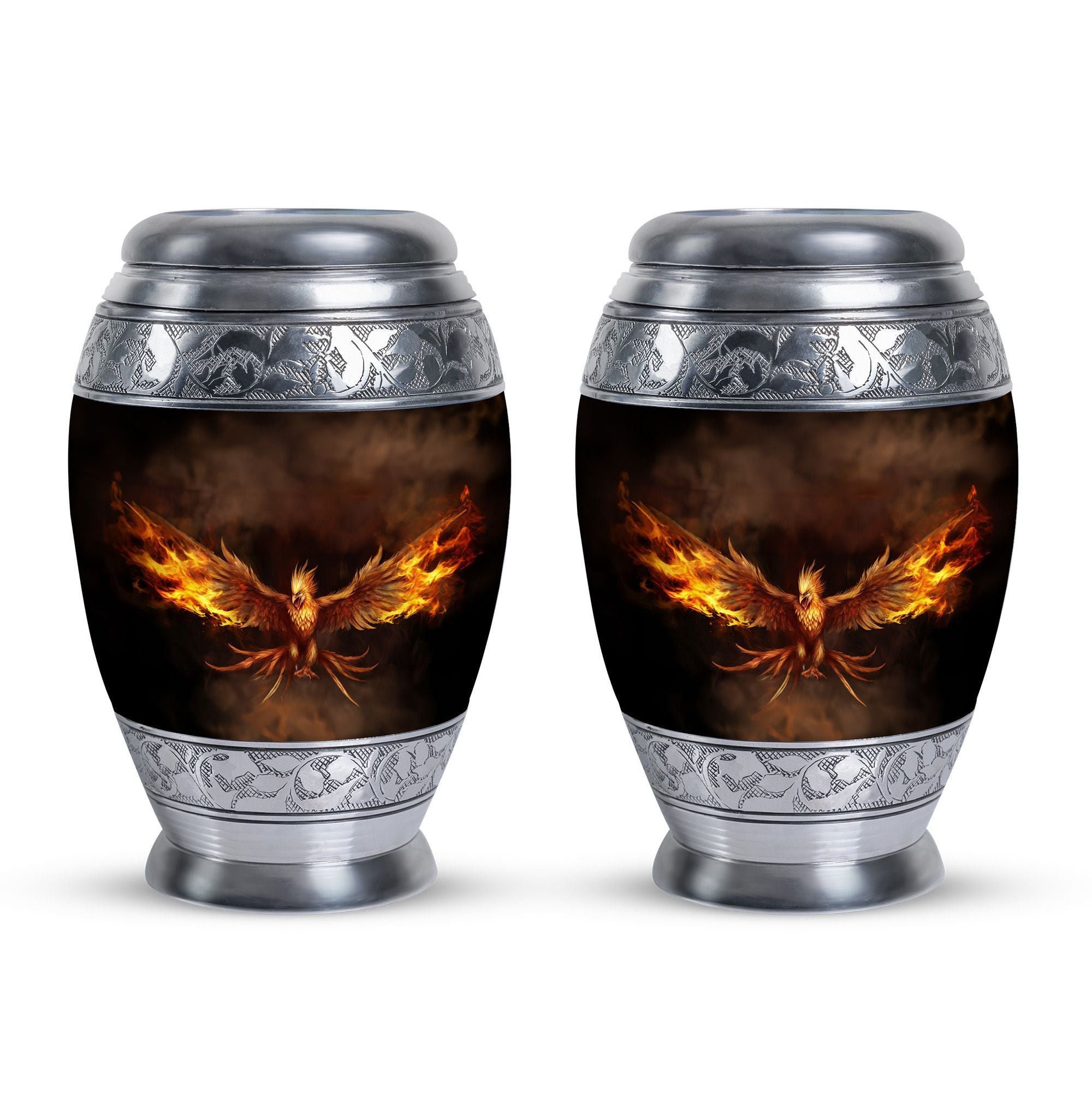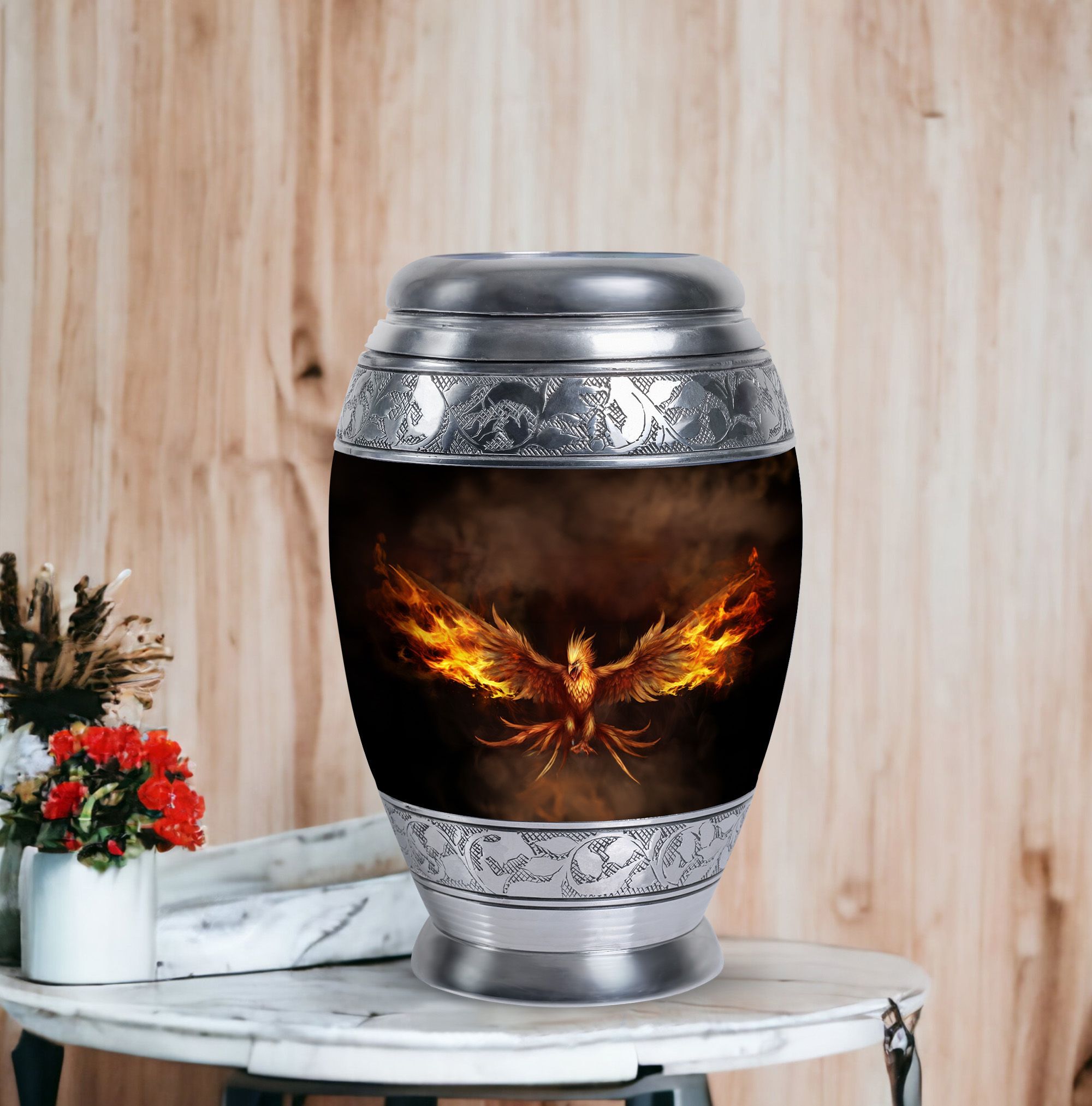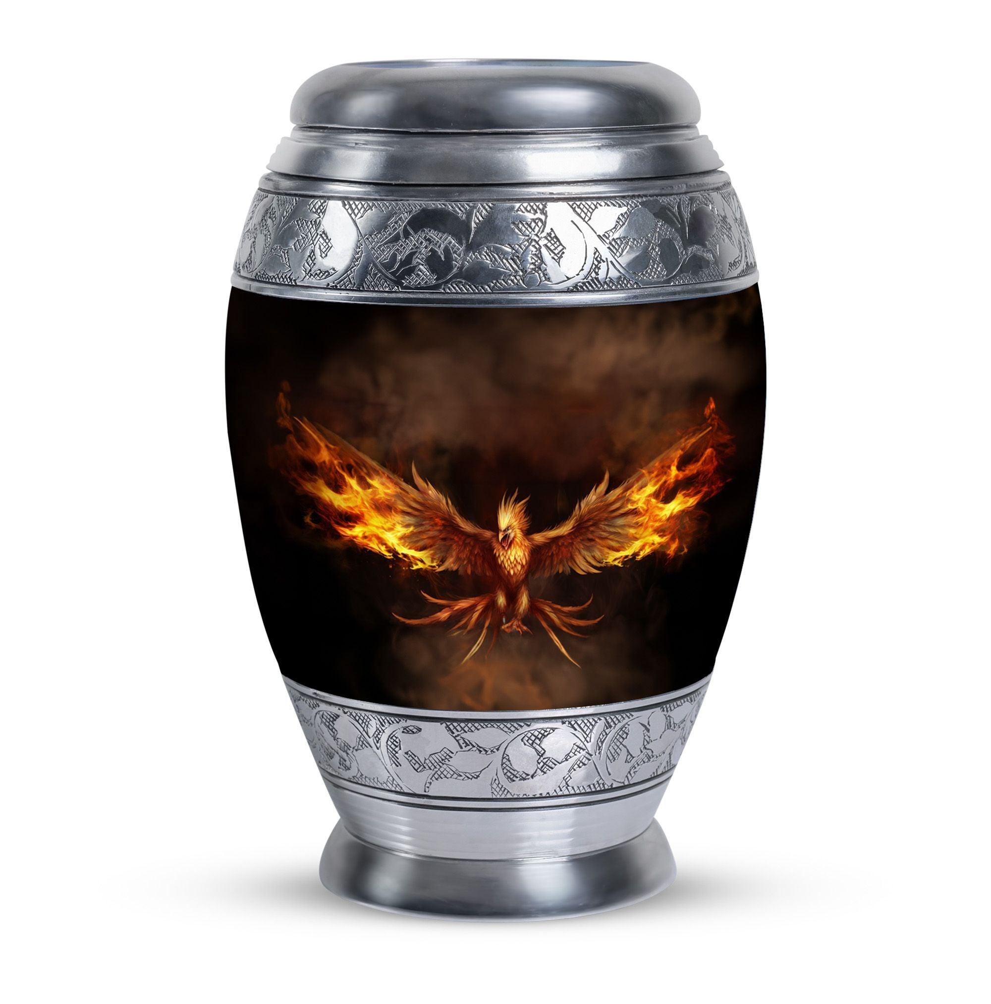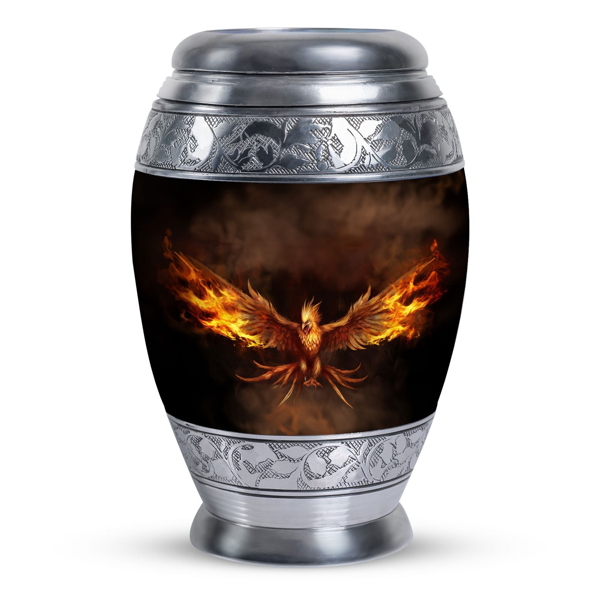 Embrace the memory of your loved ones with the beautifully crafted Angry Phoenix Urn. A prominent choice in memorial urns, this high-quality Aluminium container stands at a considerable 10 inches in height and weighs a substantial 3.3 pounds, ensuring a firm, unshakeable presence in any setting. It can comfortably accommodate up to 200 cubic inches of ashes. The sleek, sober design of the Classic Urn and its 3-inch size add to its visual appeal, making it an apt commemoration of the departed. This large urn allows you to personalize rememberance through engraved names. It also comes with a velvet pouch, providing a dignified containment for the ashes. A unique alternative in Urns for Human Ashes, the Angry Phoenix Urn truly respects and honors the memory of your departed. This urn is also an ideal choice as Urns for Ashes for Dad, or Urns for Men's Ashes. So treasure your lost ones in our beautifully designed urn, honoring their memory in a classic, dignified manner.