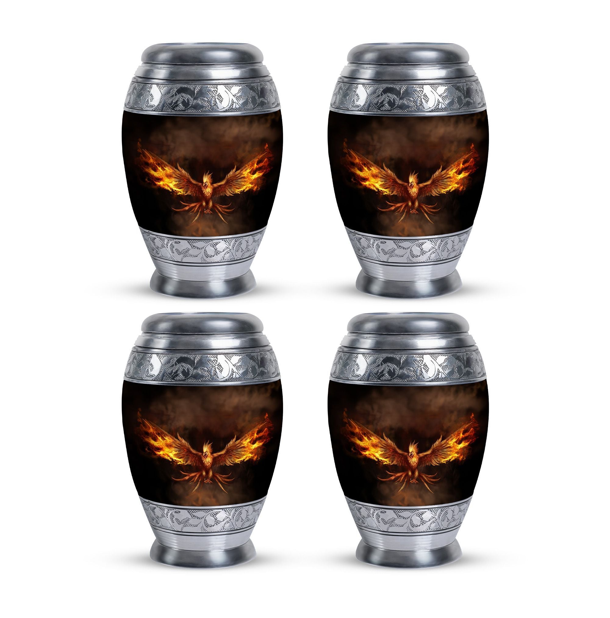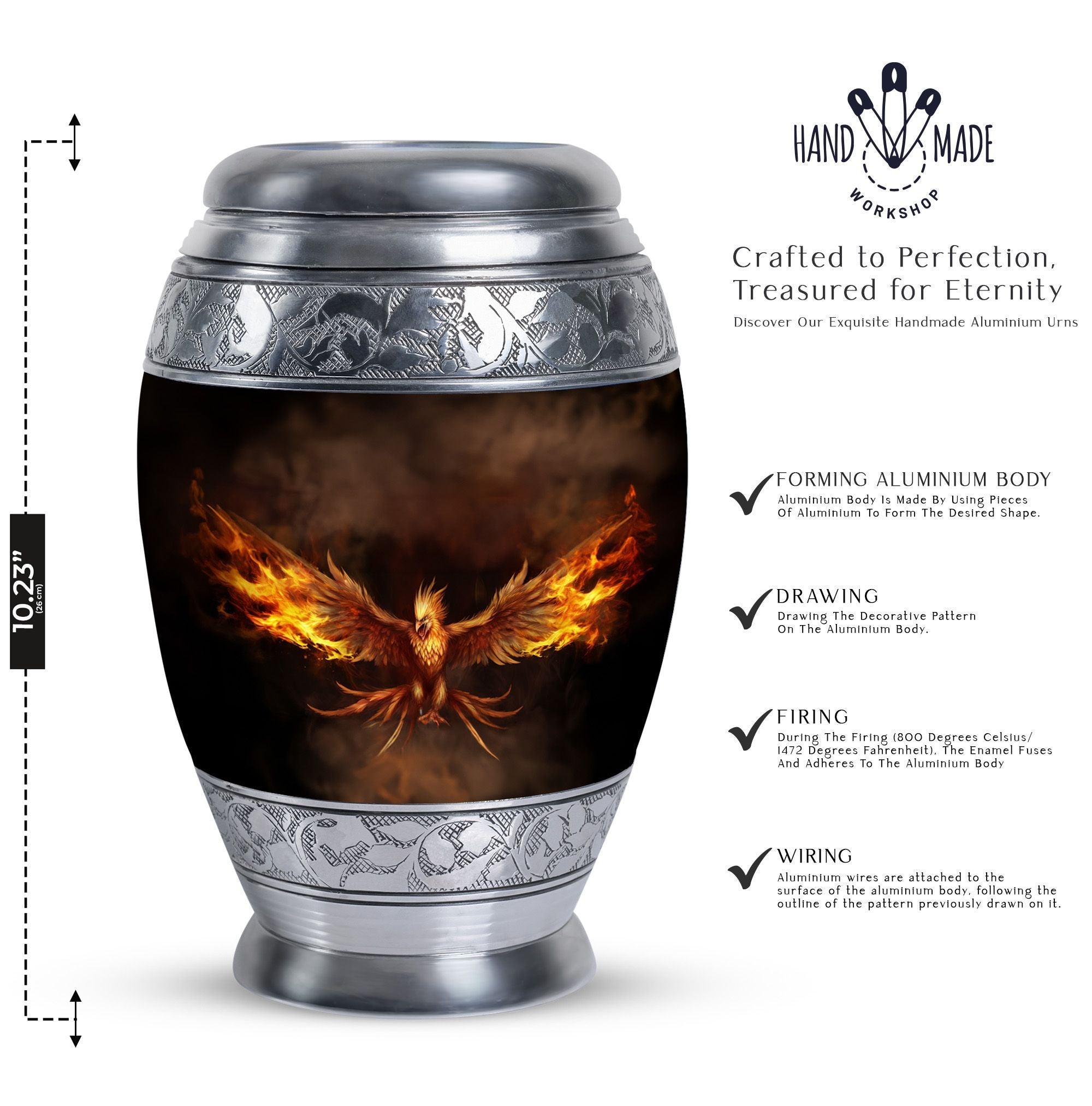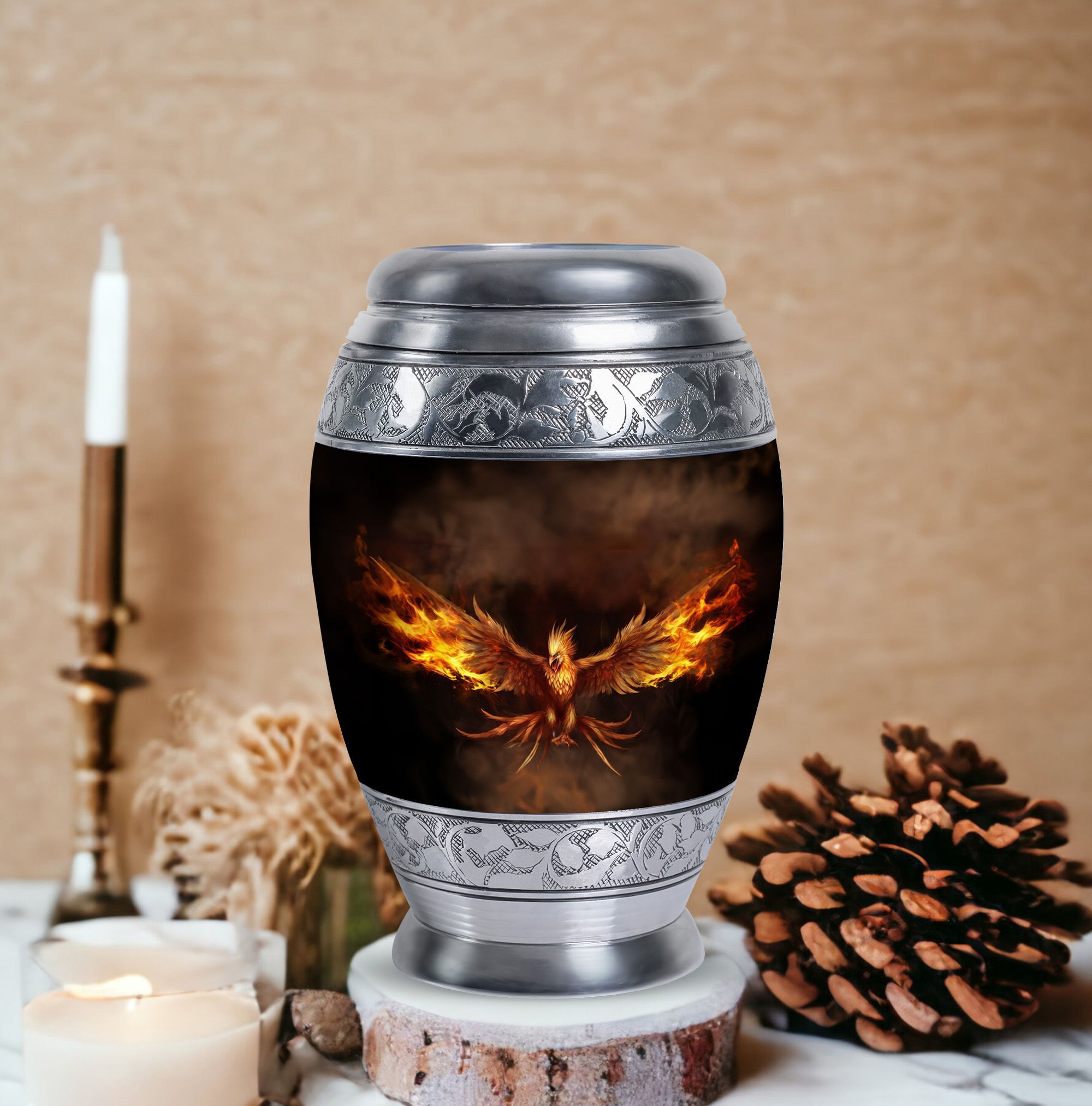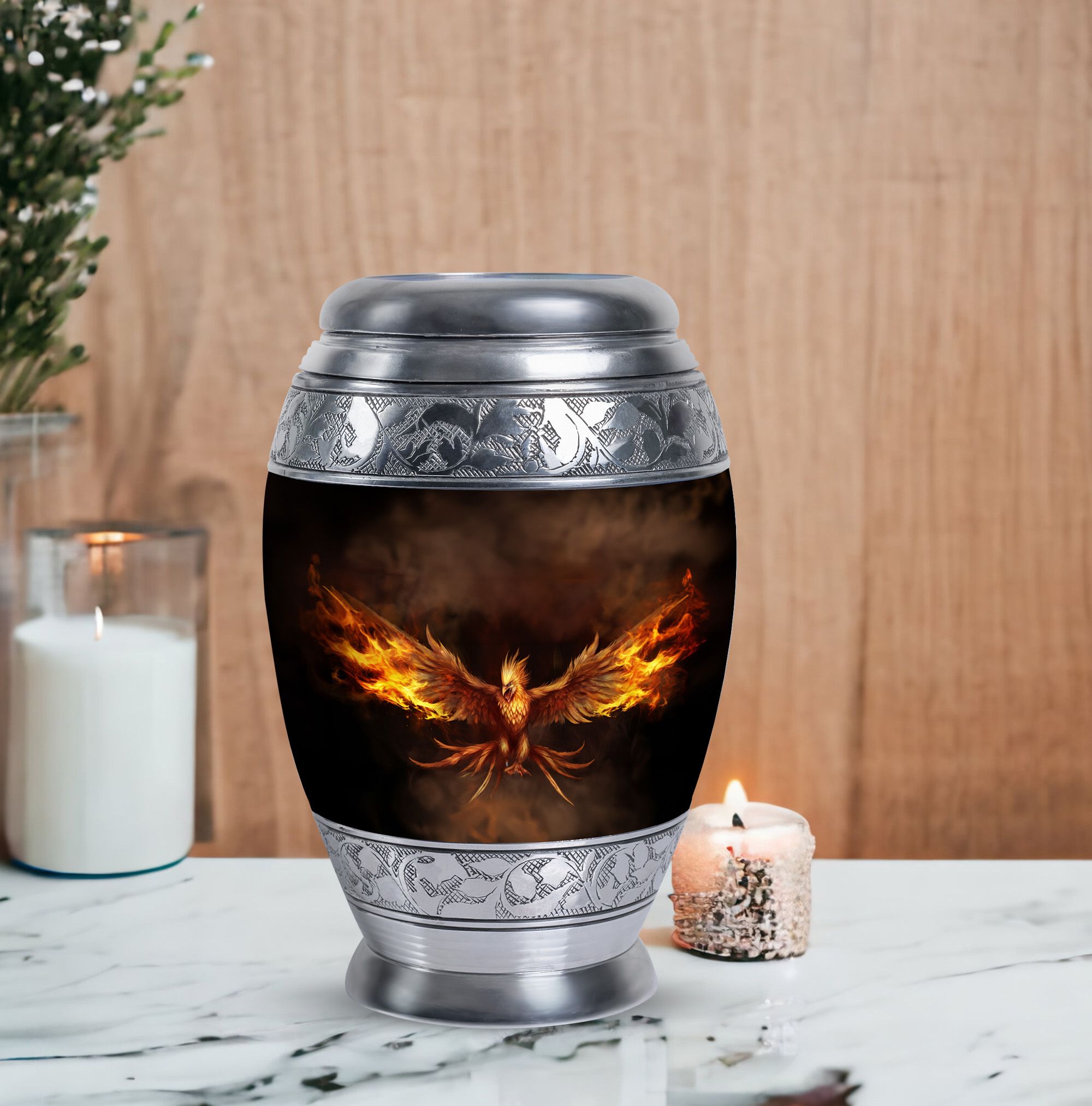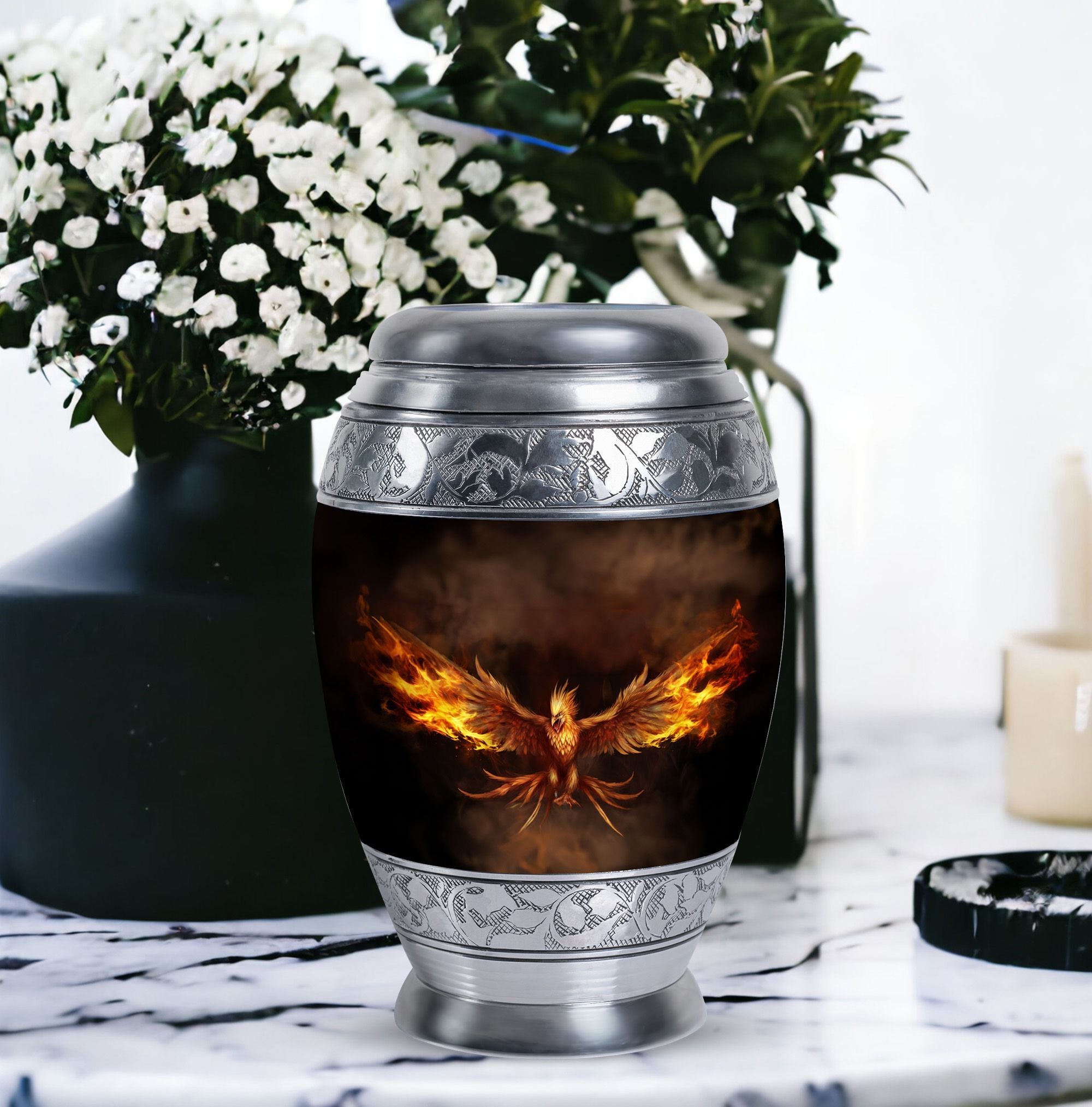 Embrace the memory of your loved ones with the beautifully crafted Angry Phoenix Urn. A prominent choice in memorial urns, this high-quality Aluminium container stands at a considerable 10 inches in height and weighs a substantial 3.3 pounds, ensuring a firm, unshakeable presence in any setting. It can comfortably accommodate up to 200 cubic inches of ashes. The sleek, sober design of the Classic Urn and its 3-inch size add to its visual appeal, making it an apt commemoration of the departed. This large urn allows you to personalize rememberance through engraved names. It also comes with a velvet pouch, providing a dignified containment for the ashes. A unique alternative in Urns for Human Ashes, the Angry Phoenix Urn truly respects and honors the memory of your departed. This urn is also an ideal choice as Urns for Ashes for Dad, or Urns for Men's Ashes. So treasure your lost ones in our beautifully designed urn, honoring their memory in a classic, dignified manner.