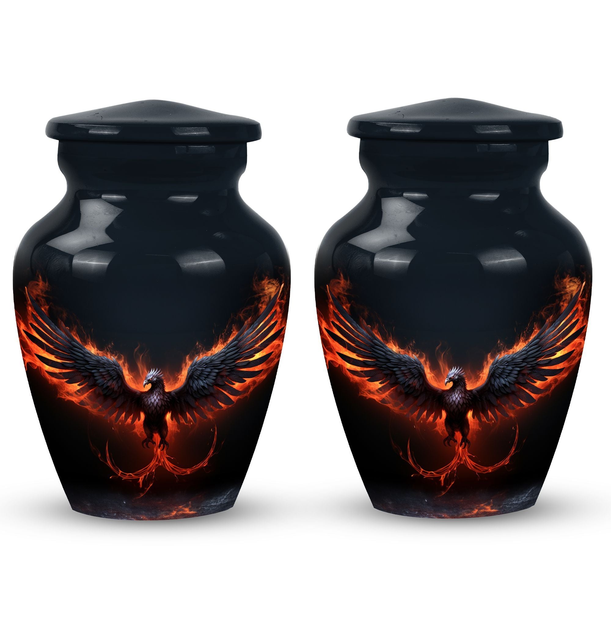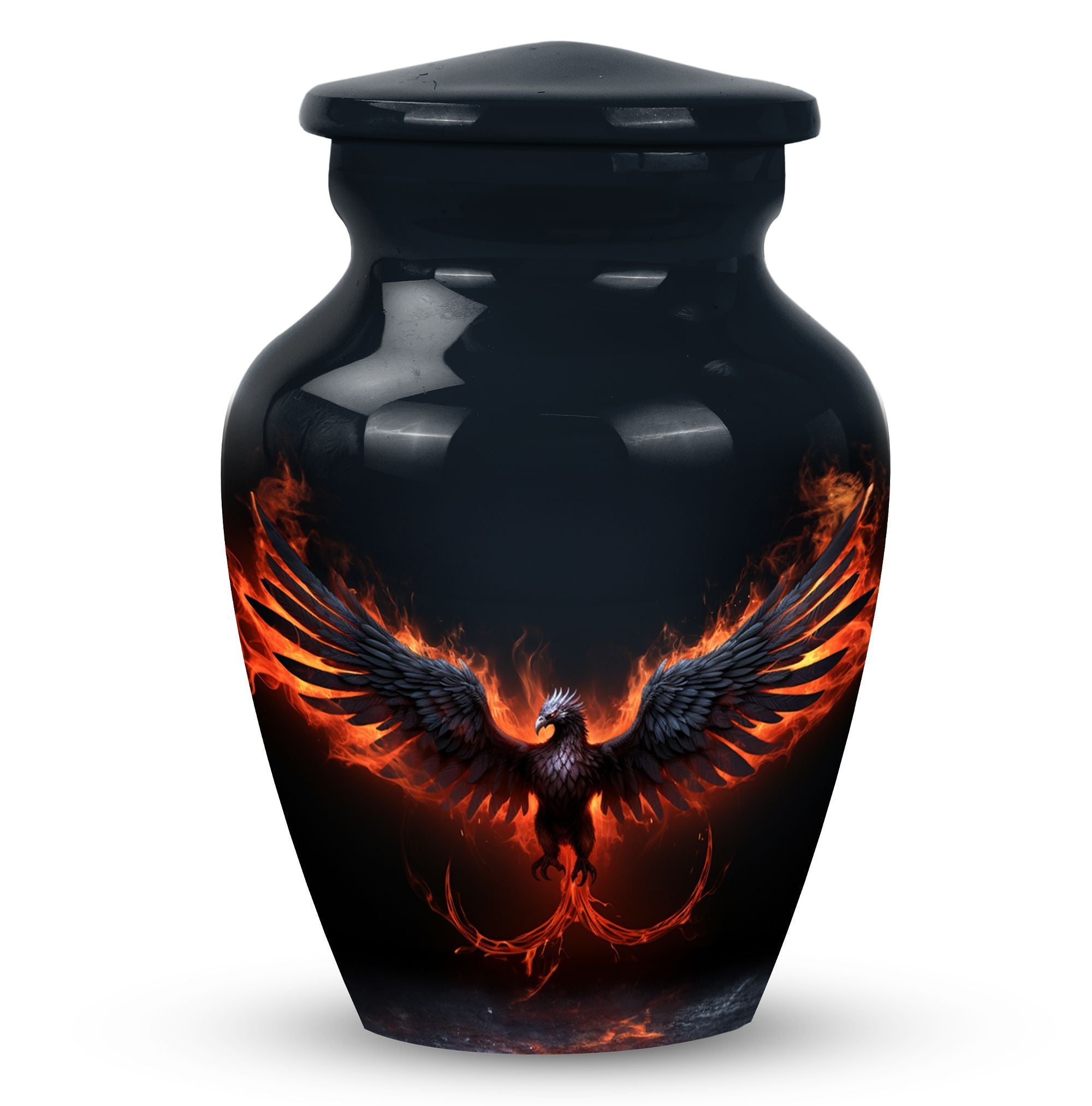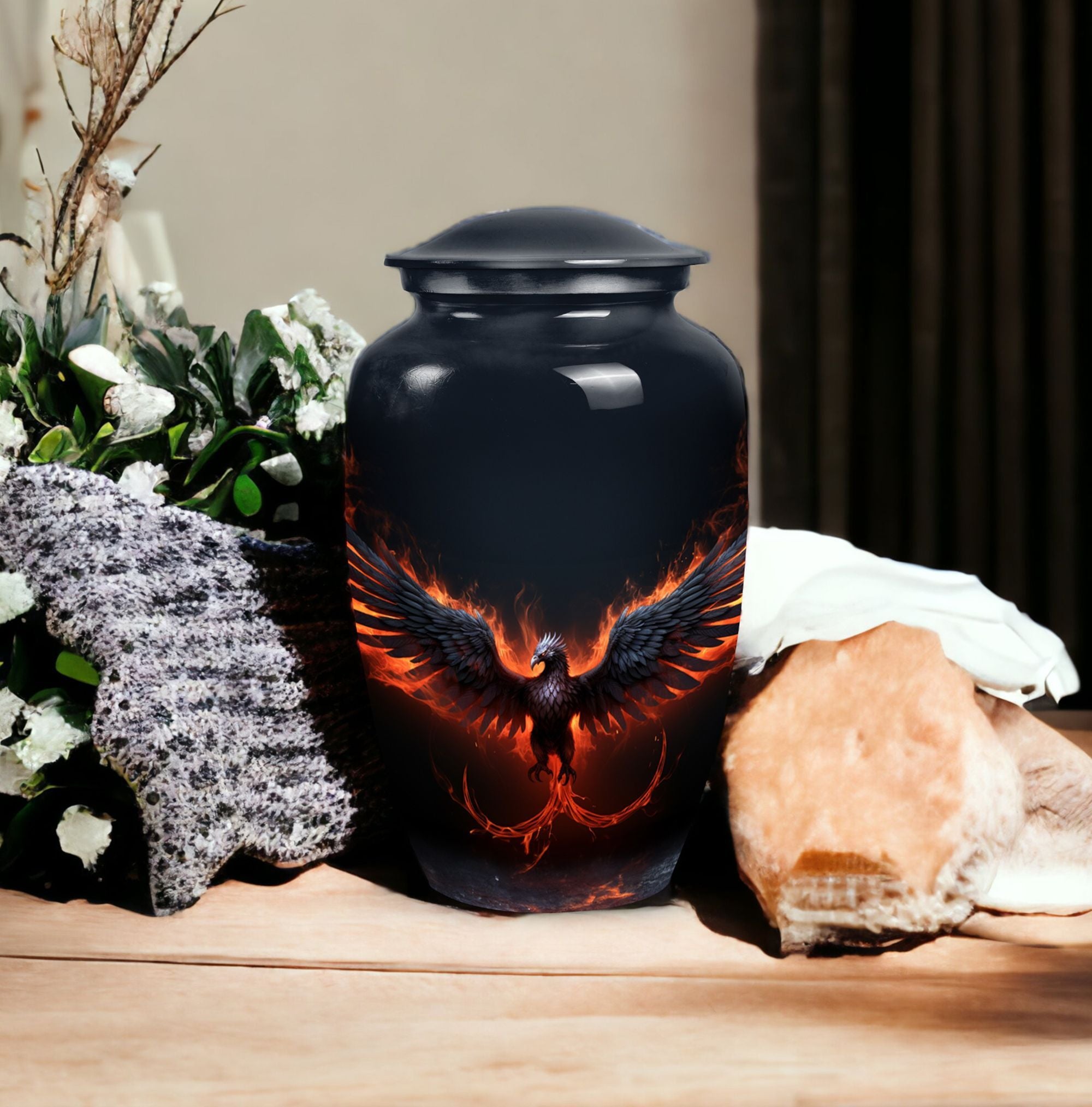 Discover beauty in remembrance with our Black Phoenix Memorial Urn, an evocative ashes container harking back to the timeless, Classic Urn design aesthetic. With a tasteful balance of form and functionality, this Large Urn elegantly houses up to 200 cubic inches of ashes. A convenient 10 inches in height and weighing a substantial 3.3 pounds, each urn is meticulously crafted from high-quality Aluminium. Carefully encased within a velvet pouch, your loved one's remains will find a dignified final resting place. Add a touch of personal homage with our customization option; engrave the names of your cherished ones for a truly unique memorial. This stunning cremation urn transcends ordinary Human Urns and transforms memorial observances. Notably designed for adults, its 3-inch size is reminiscent of larger urns for human ashes that are typically sought after in the market, making it an unparalleled choice in the realm of Memorial Ceremony Supplies. Please note that this urn container's distinctive charm lies not just in its design, but in its very essence - an embodiment of love, memory, and respect.