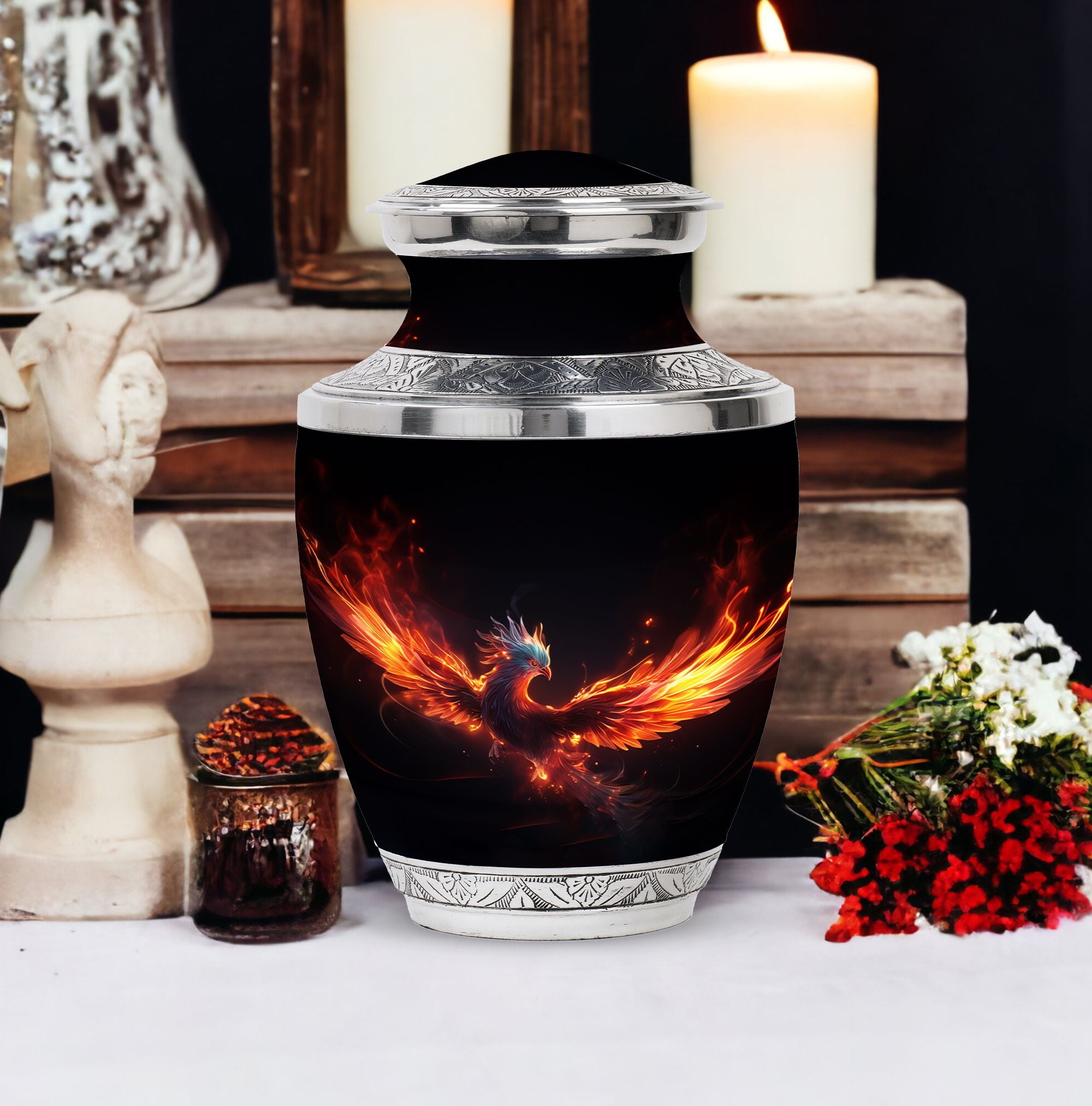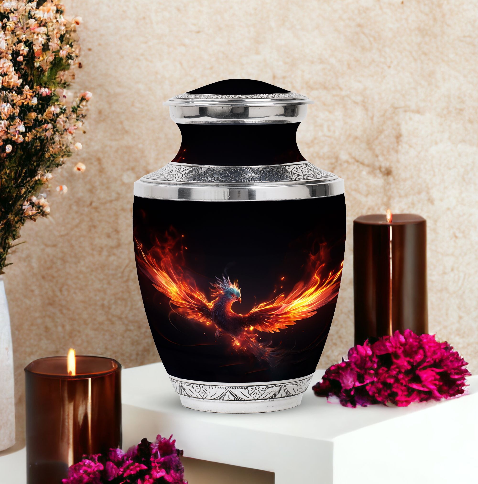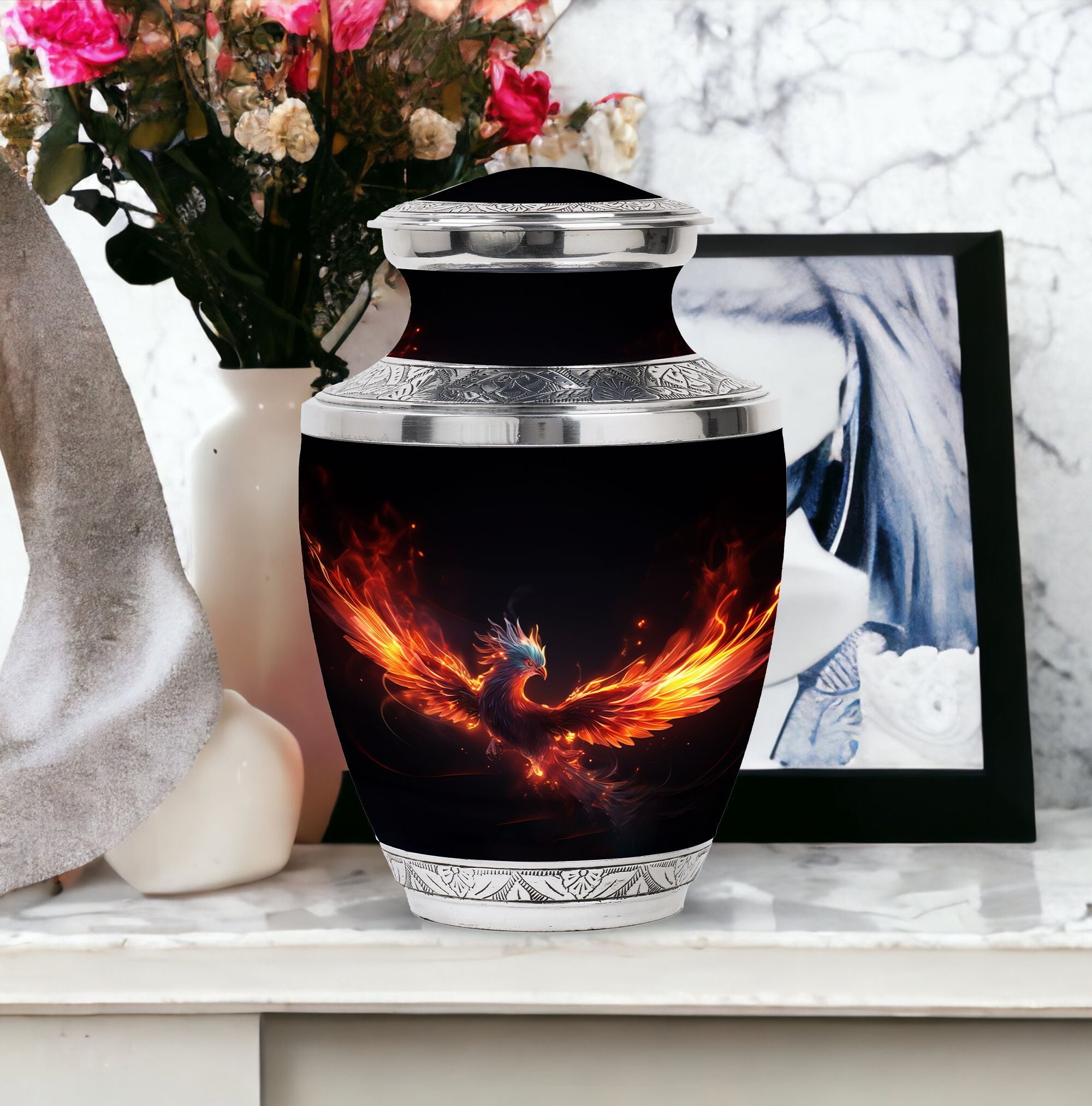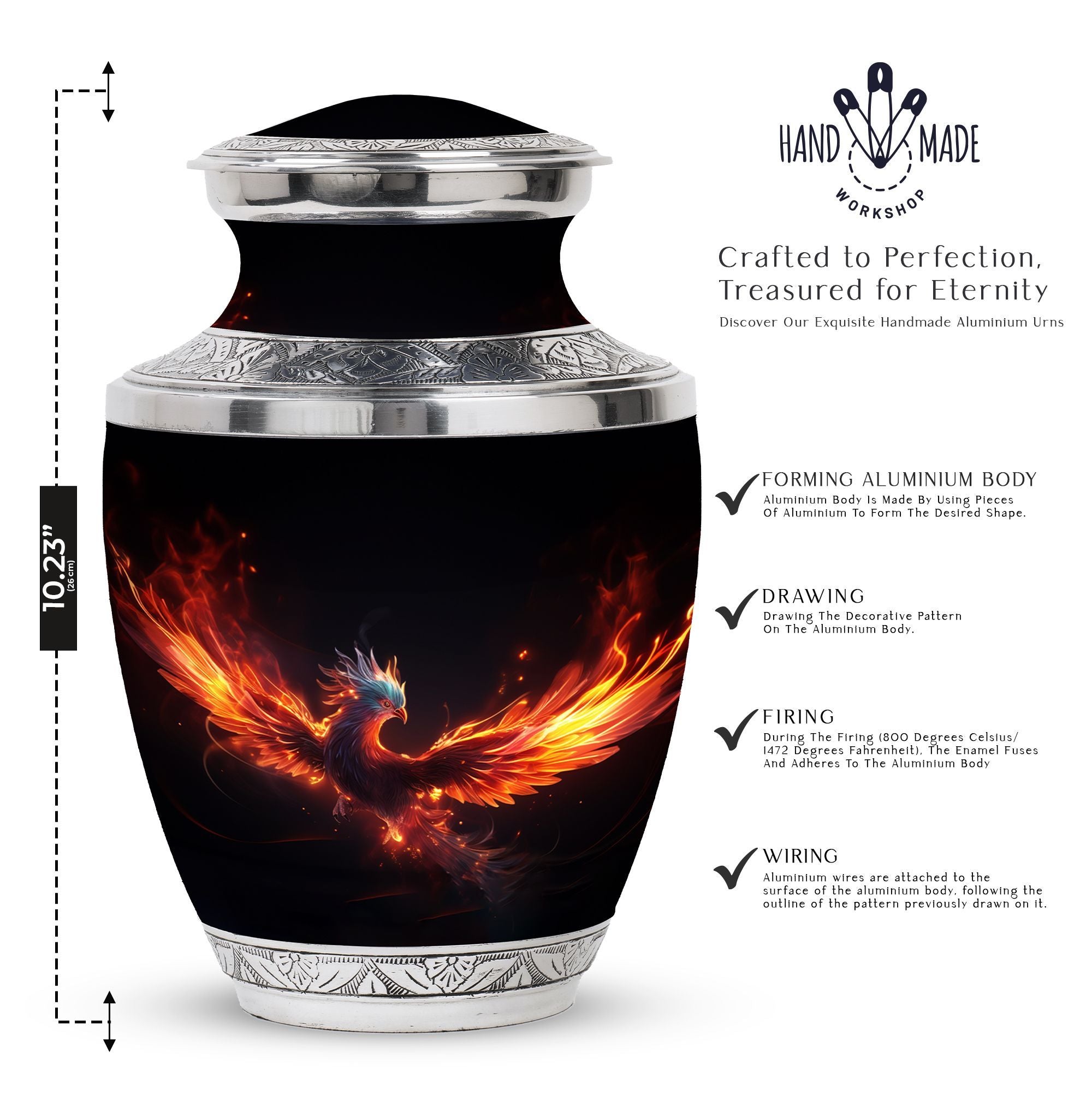 Discover peace and tranquility with our Blue Phoenix Urns for Ashes. These large, 10-inch tall Custom Urns are perfect for commemorating the life of a loved one. Crafted from durable aluminium, the Classic Urn offers the perfect balance of strength and elegance. This cremation urn can be personalized with engraved names, making it a truly unique memorial. With a generous capacity of 200 cubic inches, it has plenty of space to securely contain the ashes. Weighing in at 3.3 pounds and having a compact size of 3 inches, it's easy to handle and store. It comes with a velvet pouch for containment of ashes, resulting in an enhanced and dignified presentation. Our Metal Cremation Urns are more than just vessels, they are timeless keepsakes that remember loved ones in the most respectful way. Perfect for burial ceremonies or as a keepsake at home, our Personalized Urns for Human Ashes resonate with memorable legacies and lasting love.
