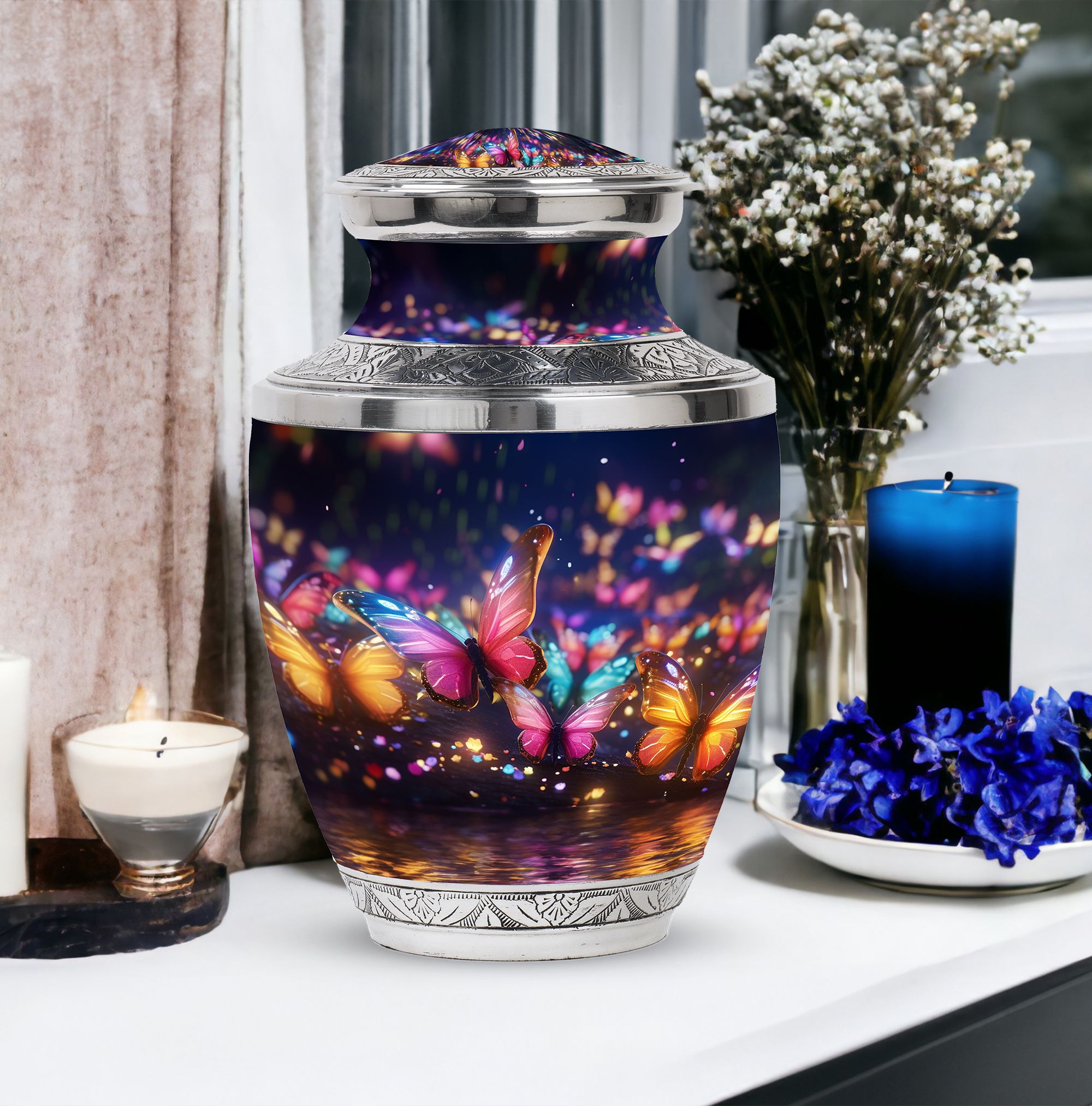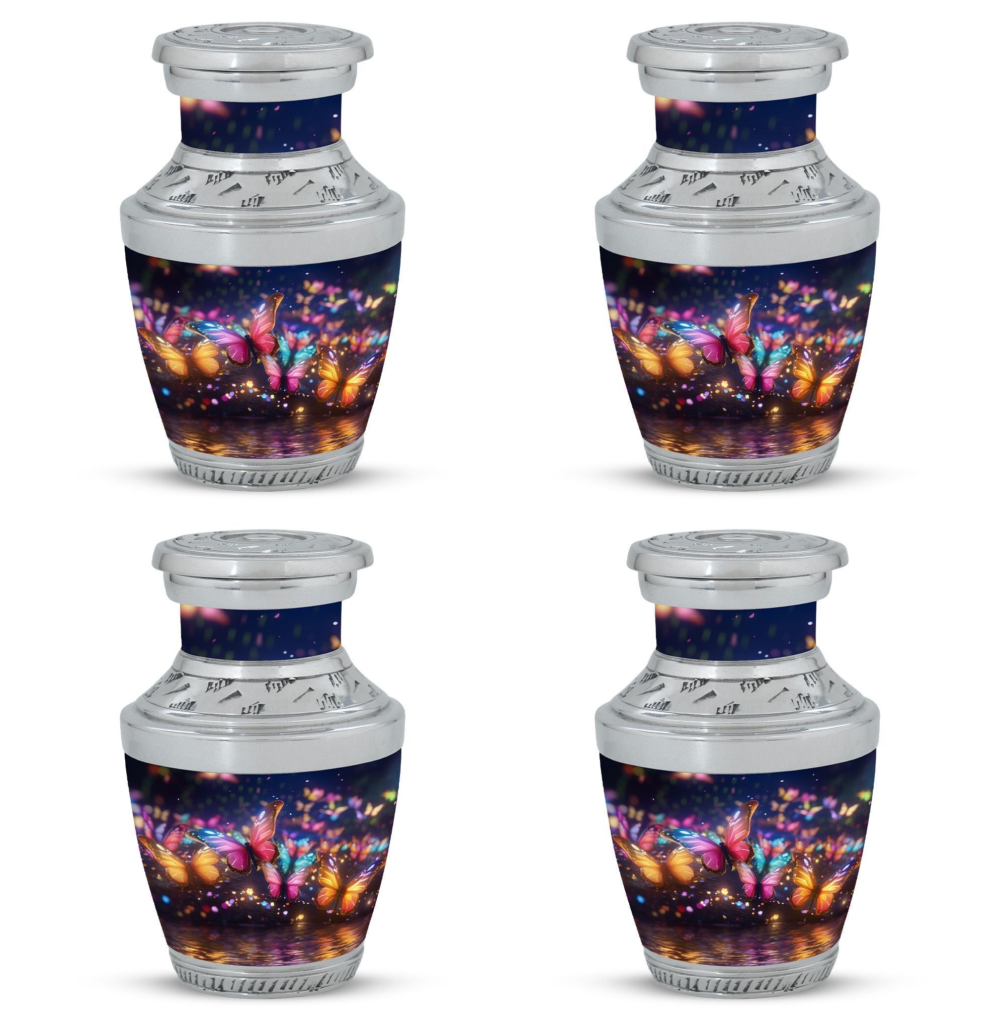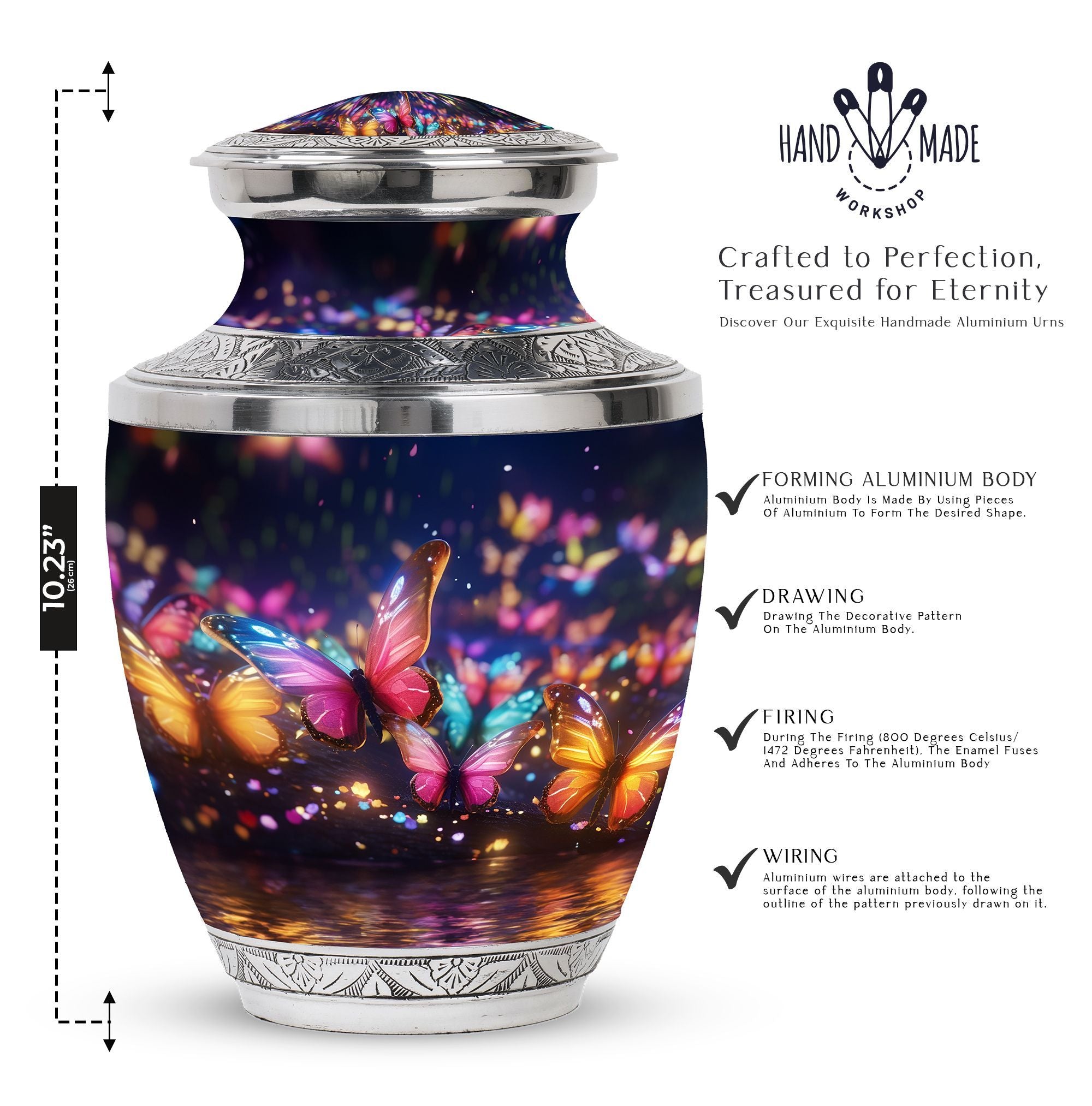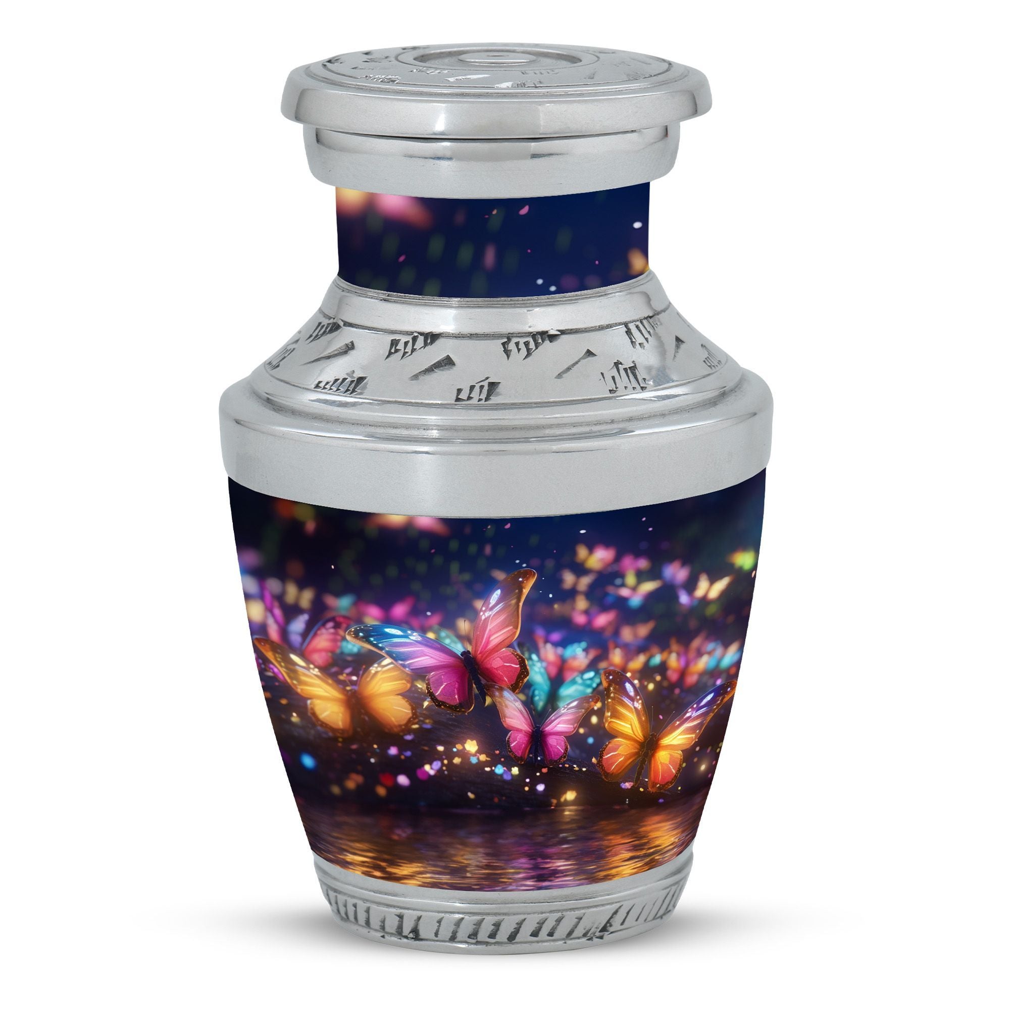 Exhibit your graceful tribute to a lost loved one with our meticulously constructed 'Butterflies in Forest Memorial Urn'. Specifically designed for adult and senior citizens seeking for an elegant repository, this cremation urn renders more than the mere retention of ashes. Standing 10 inches high with a weight of 3.3 pounds, the 3-Inch urn boasts a captivating capacity of 200 cubic inches. Crafted from robust Aluminium, our 'Classic Urn' design delivers both glamour and durability, a timeless memorial piece for your cherished memories . Along with the urn comes a refined velvet pouch, providing a sophisticated enclosure for the ashes. Personalize it with engraved names to add a warm, personal touch. Immerse yourself in the symbolism of the 'Butterflies in Forest Memorial Urn.