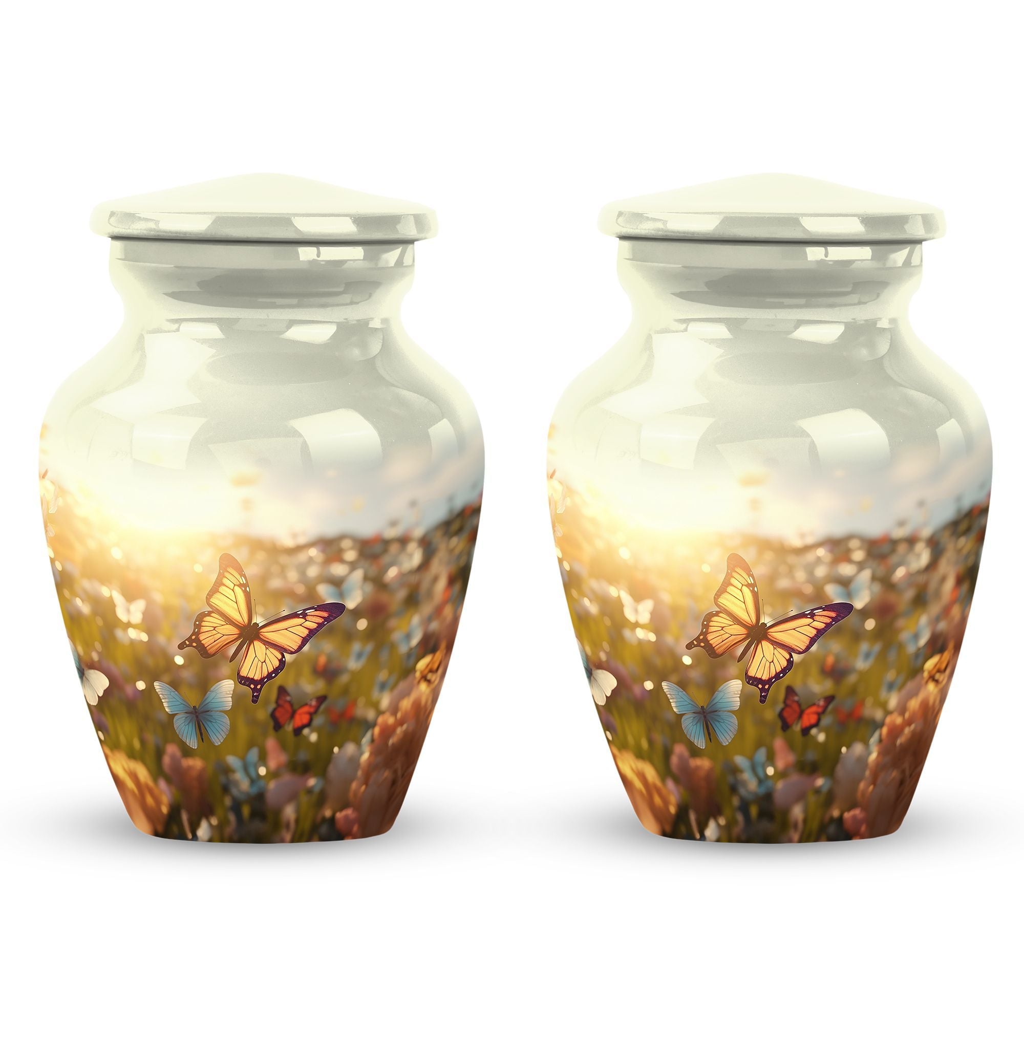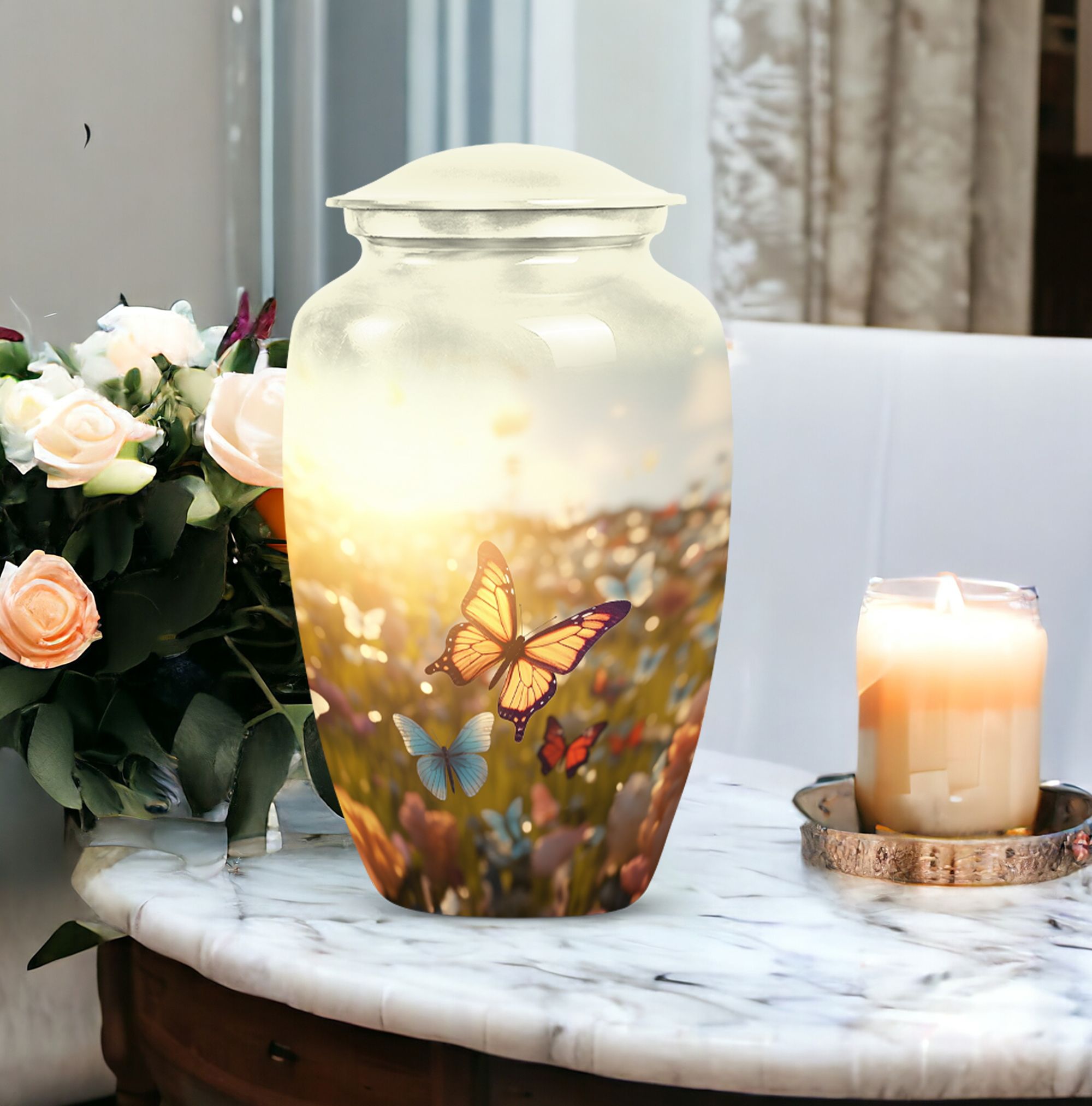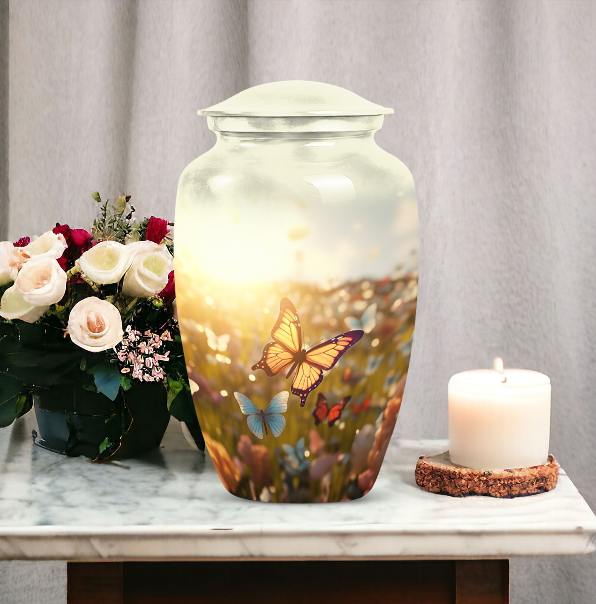 Preserve your cherished memories with our Butterflies Memorial Urn, a quintessential symbol of rebirth and new beginning. Crafted from robust aluminum, it is sturdy and designed to stand the test of time. The urn is 10 inches in height, weighs 3.3 pounds, and has a large capacity of 200 cubic inches, aptly sized for adult human remains. It comes with a divine velvet pouch that offers an elegant and respectful means to contain the ashes. This 3-inch cremation urn provides the opportunity to personalize with engraved names, permitting a unique and meaningful memorial. With our product, honor your loved one with dignity and grace, making it the quintessential urn for ashes. Its universal design is suitable for any memorial ceremony and seamlessly aligns with different decors. Moreover, our urn is suitable as an urn for ashes of dad and other loved ones. A beautiful and enduring choice for those seeking personalized urns, decorative urns for ashes, or urns for human remains.