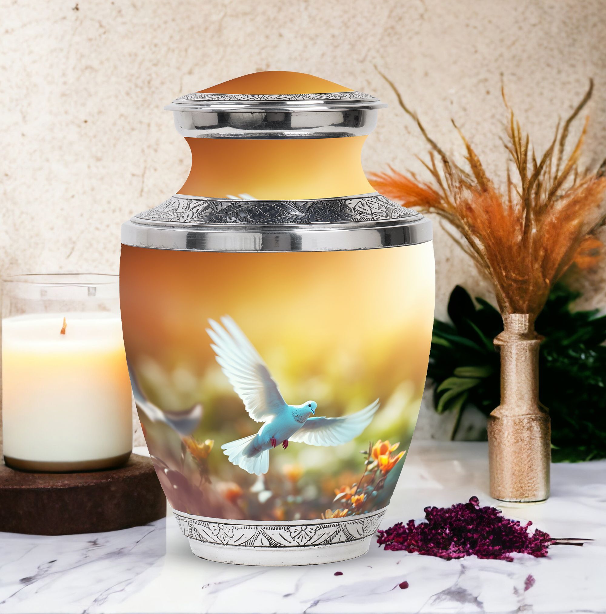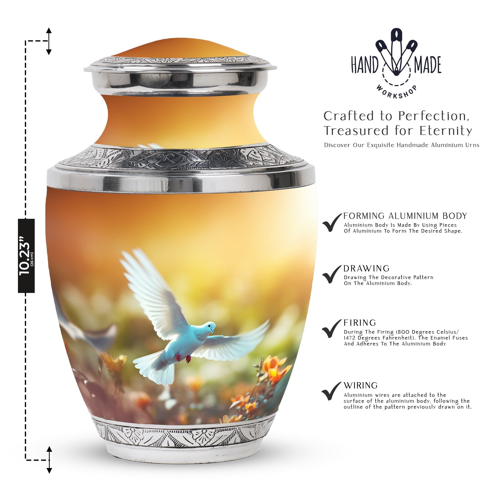 Embodying quiet elegance, our Dove Urn is a tasteful selection for memorial urns, designed for those seeking tastefully curated memorial ceremony supplies. Measuring 3 inches in size and weighing a solid 3.3 pounds, this Large Urn is a substantial vessel creating a profound memorial for a loved one. Skilfully crafted from sturdy aluminum, this Classical Urn showcases a dignified silhouette at 10 inches in height, offering a capacity of 200 cubic inches. Each urn comes with a soft velvet pouch for diligent containment of ashes. The Dove Urn elevates its value with the possibility of personalisation, allowing users to etch engraved names - a heartfelt touch to a timeless memento. Search under Urns for Cremated Remains, Urns for Mom's Ashes, Human Cremation Ashes, and Burial Urns for Human Ashes, as this product delivers on these areas whilst seamlessly transitioning into your life as a cherished keepsake.