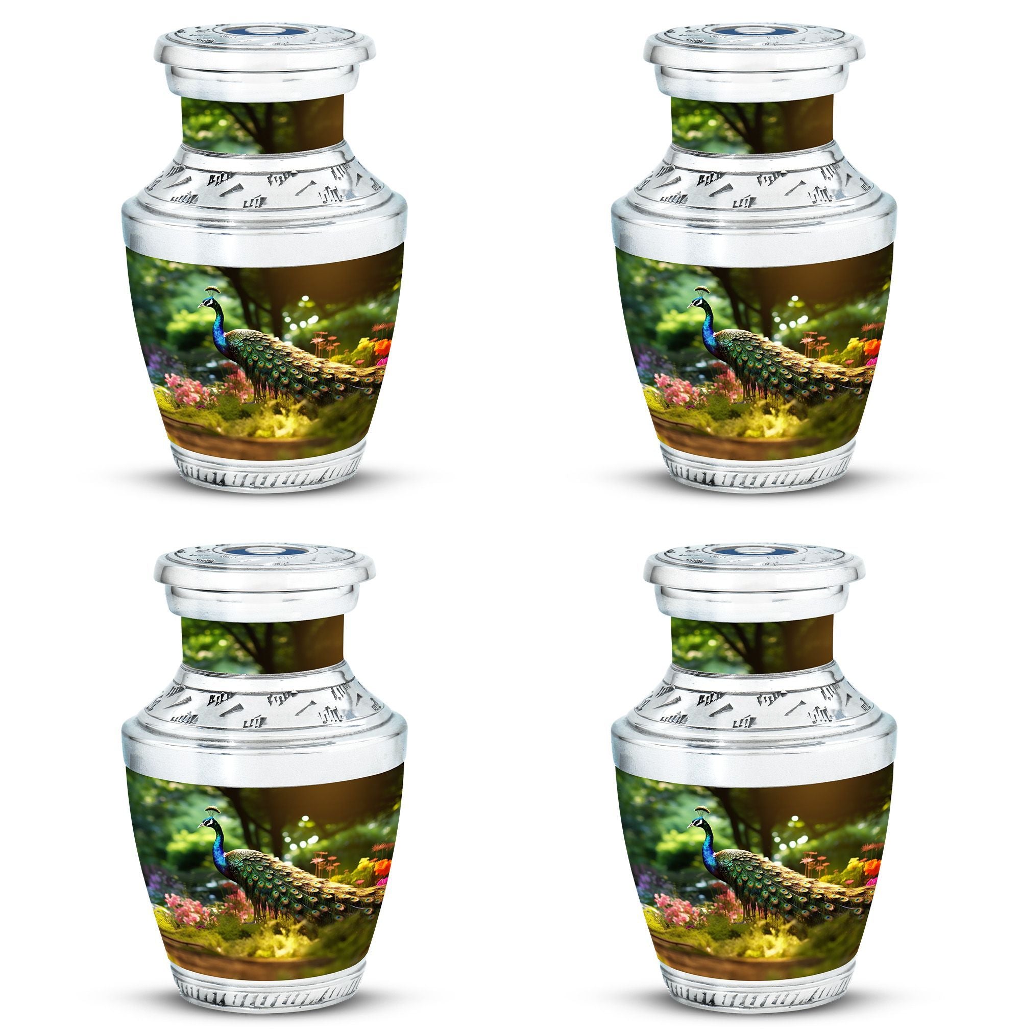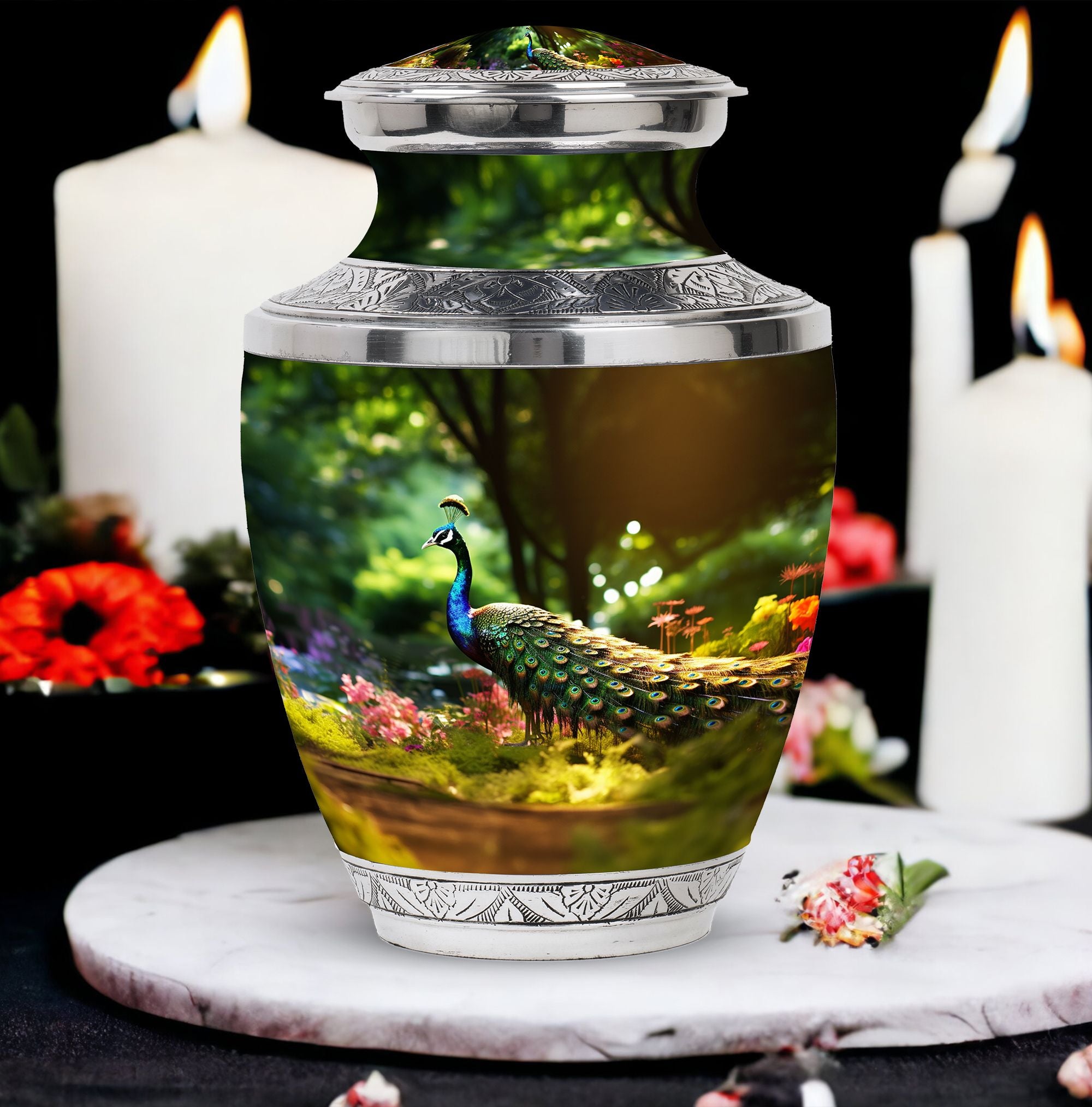 Introducing the Peacock Memorial Urn, an elegant and dignified choice in cremation containers. This large-sized urn, standing 10 inches in height, is designed with an eloquent classic urn style, crafted from durable Aluminium material. Its solid weight of 3.3 pounds speaks for its sturdiness. The urn has a capacity of 200 cubic inches, making it a perfect ashes holder for a loved one. Inside the package, you'll find a soft velvet pouch for discreet containment and cherished safeguarding of ashes. Personalize this piece with engraved names, making it a truly one-of-a-kind memorial. With an appealing design and packaged in a size of merely 3 inches, it complements myriad domestic environments. Ideal for households looking for decorative urns for human ashes or urns for moms' ashes. This eminence embodied product speaks volumes about your love and respect for the departed. Treasure their memory with this exclusive piece.