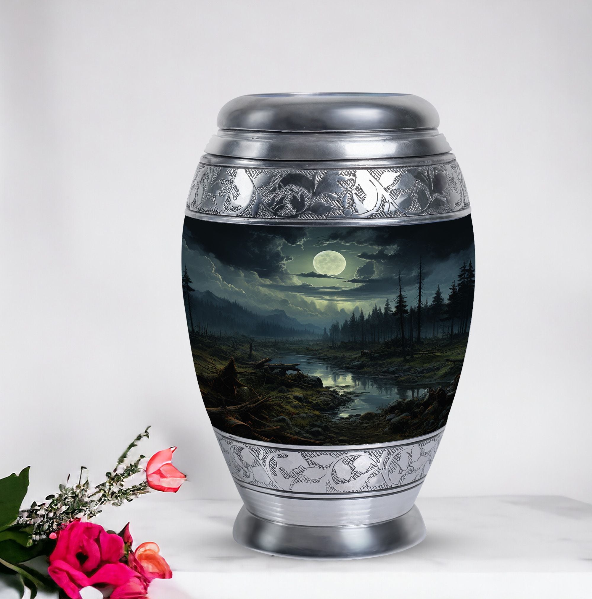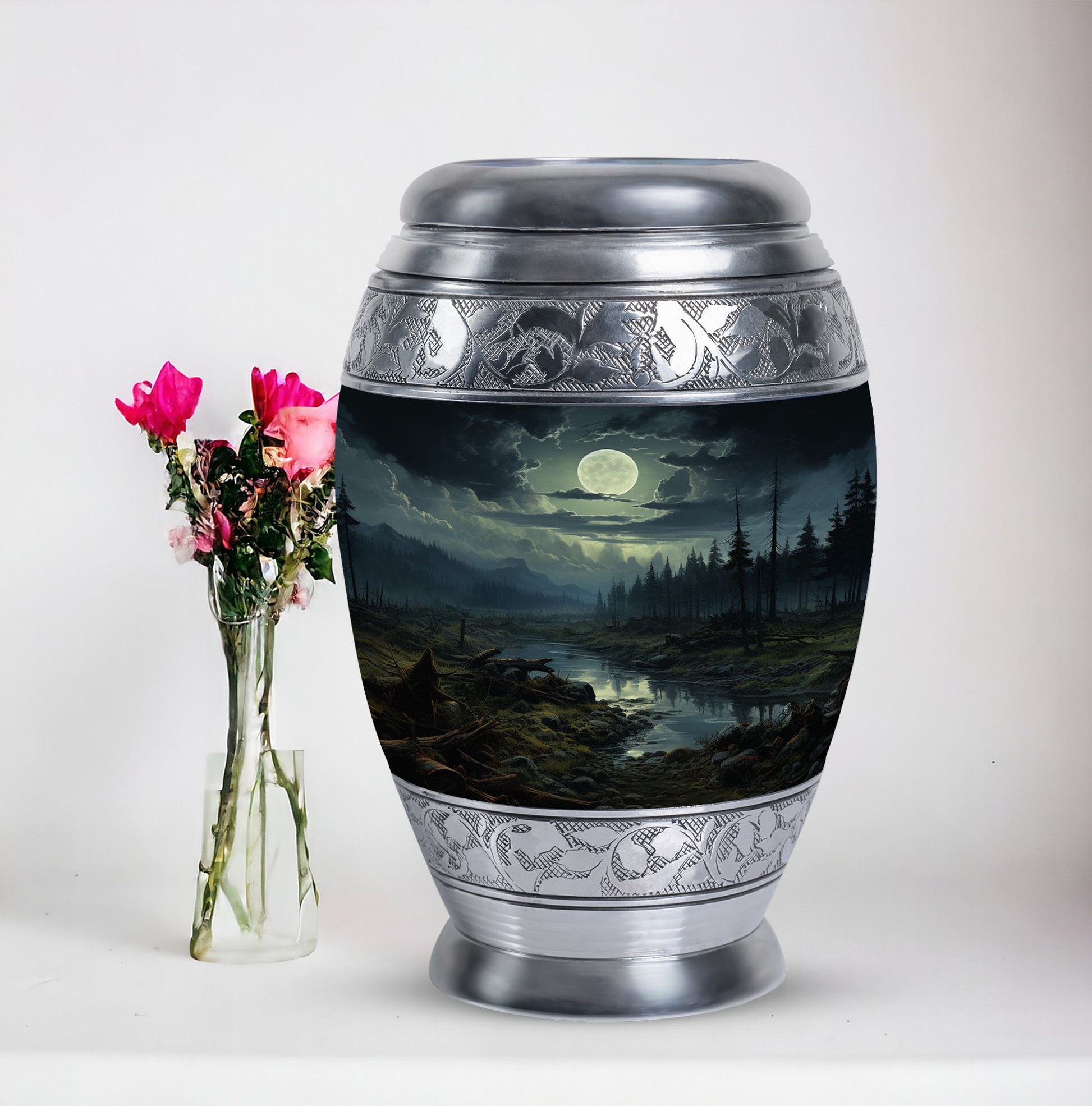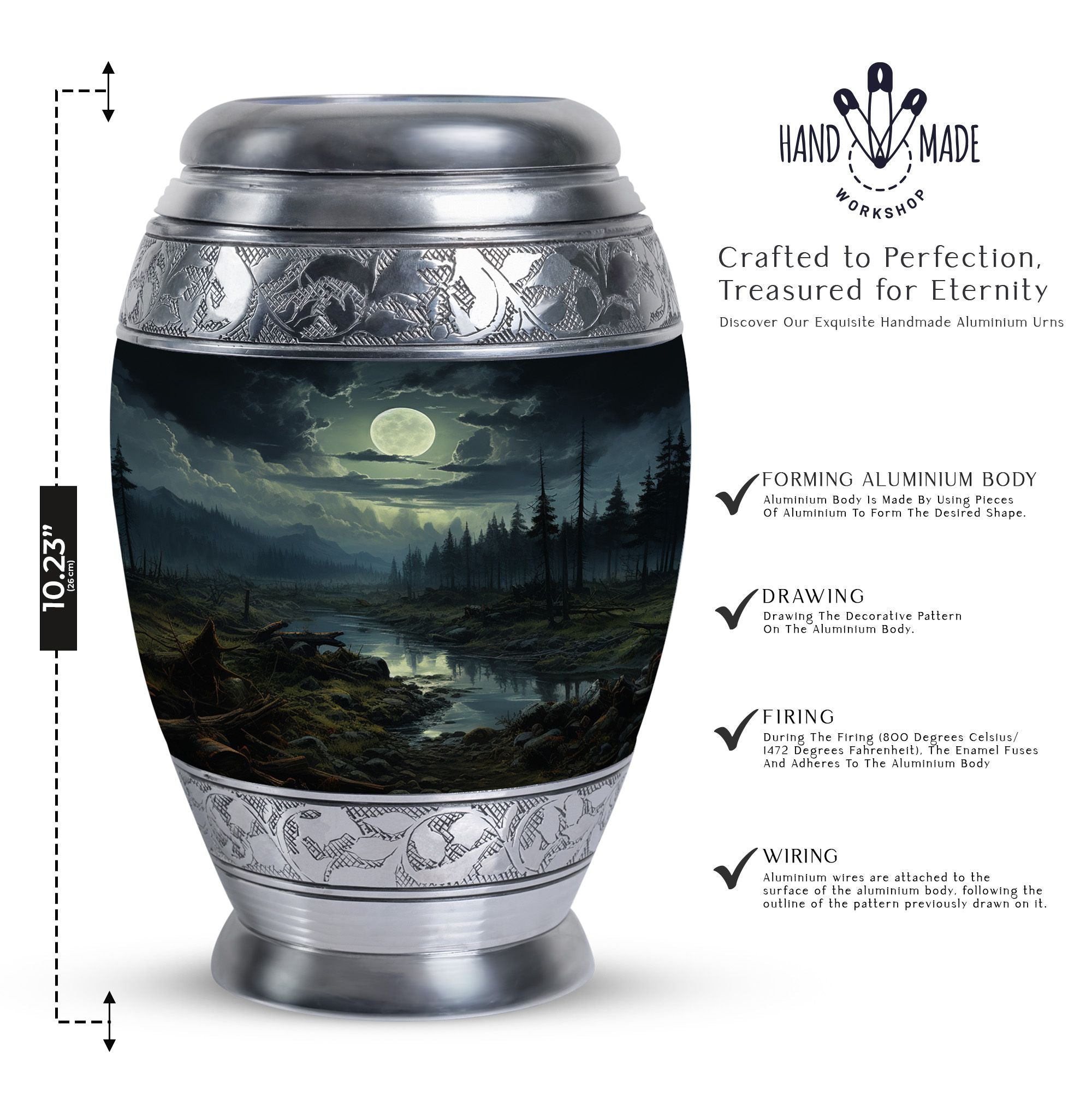 Experience a blend of solace, tradition, and elegance with our Moonlit Urns for Ashes. Crafted exquisitely with high-quality Aluminium , these large cremation urns have the capacity of 200 cubic inches, perfect for an adult's sacred remains. Personalize your urn with engraved names to create a unique, inimitable memorial for your loved one. With dimensions of 10 inches in height and 7 inches in diameter, these large urns are an attractive and respectful addition to any household or memorial space. Our Monar_Urn design incorporates a timeless, classic style suitable for both men and women. The package contains one urn, a velvet pouch for containment of ashes, and necessary care and handling instructions. Nestle your cherished memories in these large decorative urns that bridge the gap between fashion, function, and feeling. This urn for ashes is not only a stately tribute to your dearly departed but also a beautiful art piece to adorn your home.