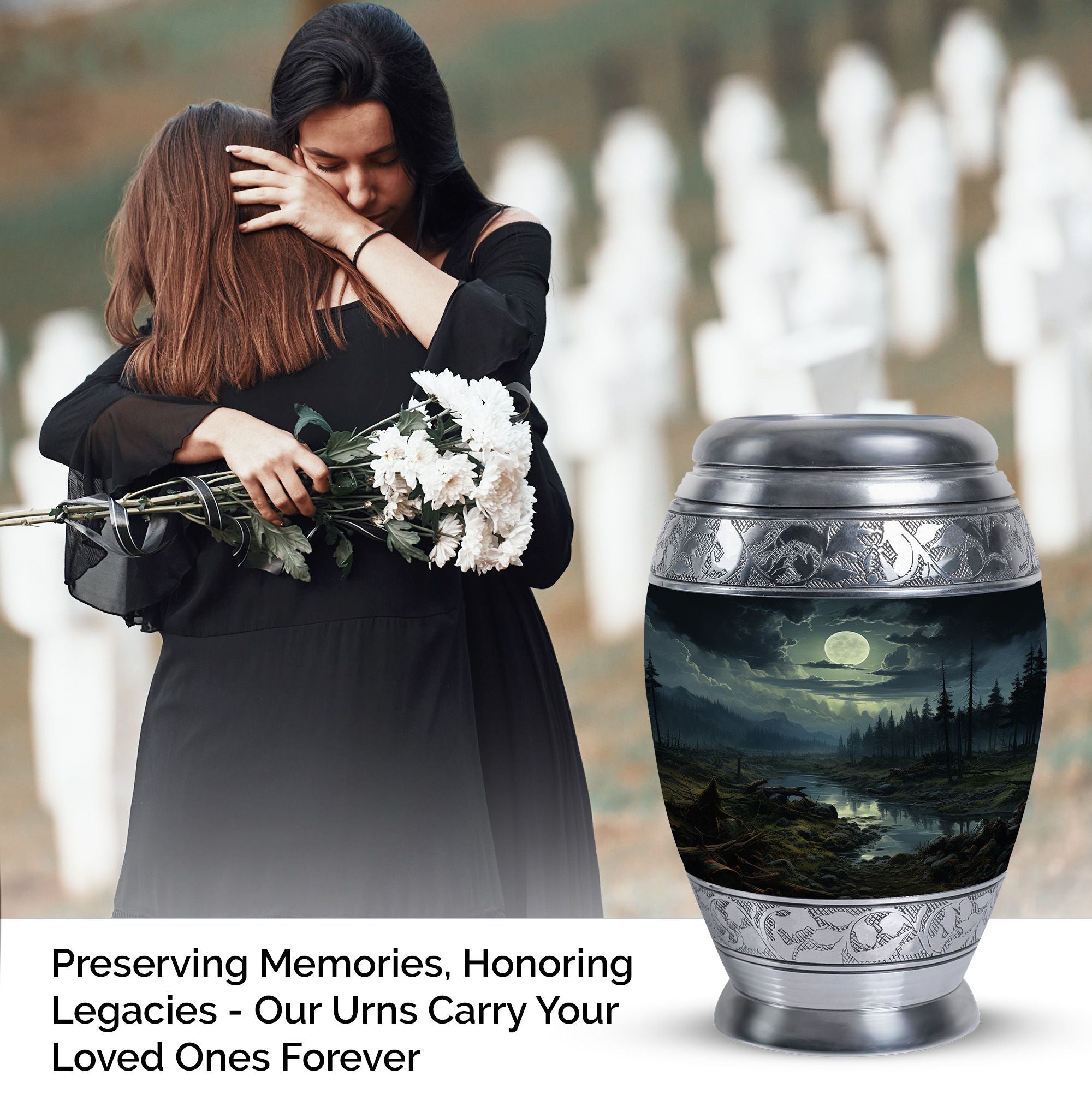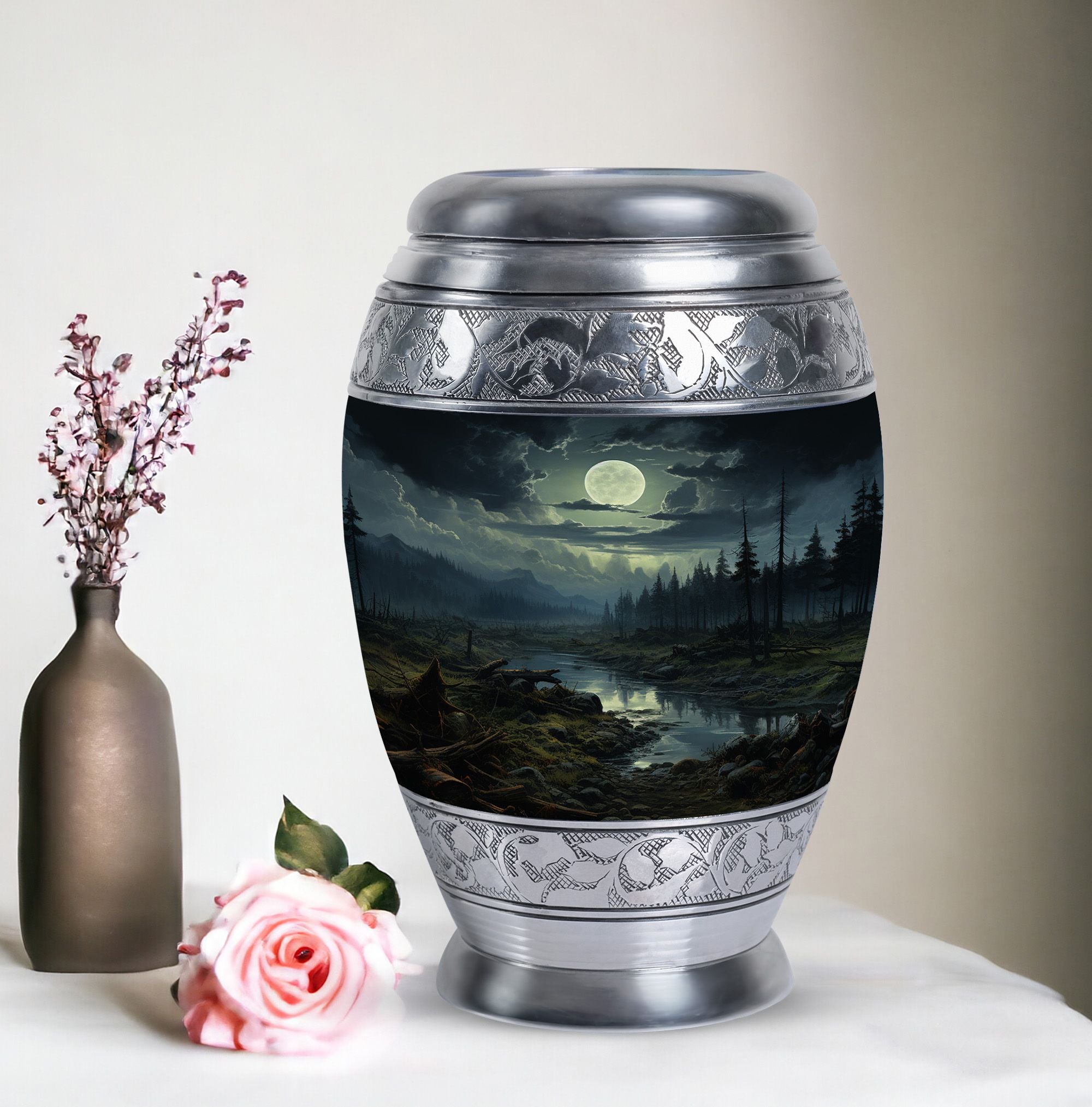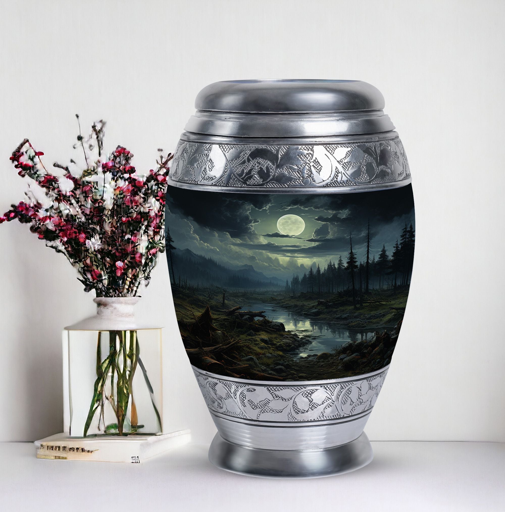 Experience a blend of solace, tradition, and elegance with our Moonlit Urns for Ashes. Crafted exquisitely with high-quality Aluminium , these large cremation urns have the capacity of 200 cubic inches, perfect for an adult's sacred remains. Personalize your urn with engraved names to create a unique, inimitable memorial for your loved one. With dimensions of 10 inches in height and 7 inches in diameter, these large urns are an attractive and respectful addition to any household or memorial space. Our Monar_Urn design incorporates a timeless, classic style suitable for both men and women. The package contains one urn, a velvet pouch for containment of ashes, and necessary care and handling instructions. Nestle your cherished memories in these large decorative urns that bridge the gap between fashion, function, and feeling. This urn for ashes is not only a stately tribute to your dearly departed but also a beautiful art piece to adorn your home.