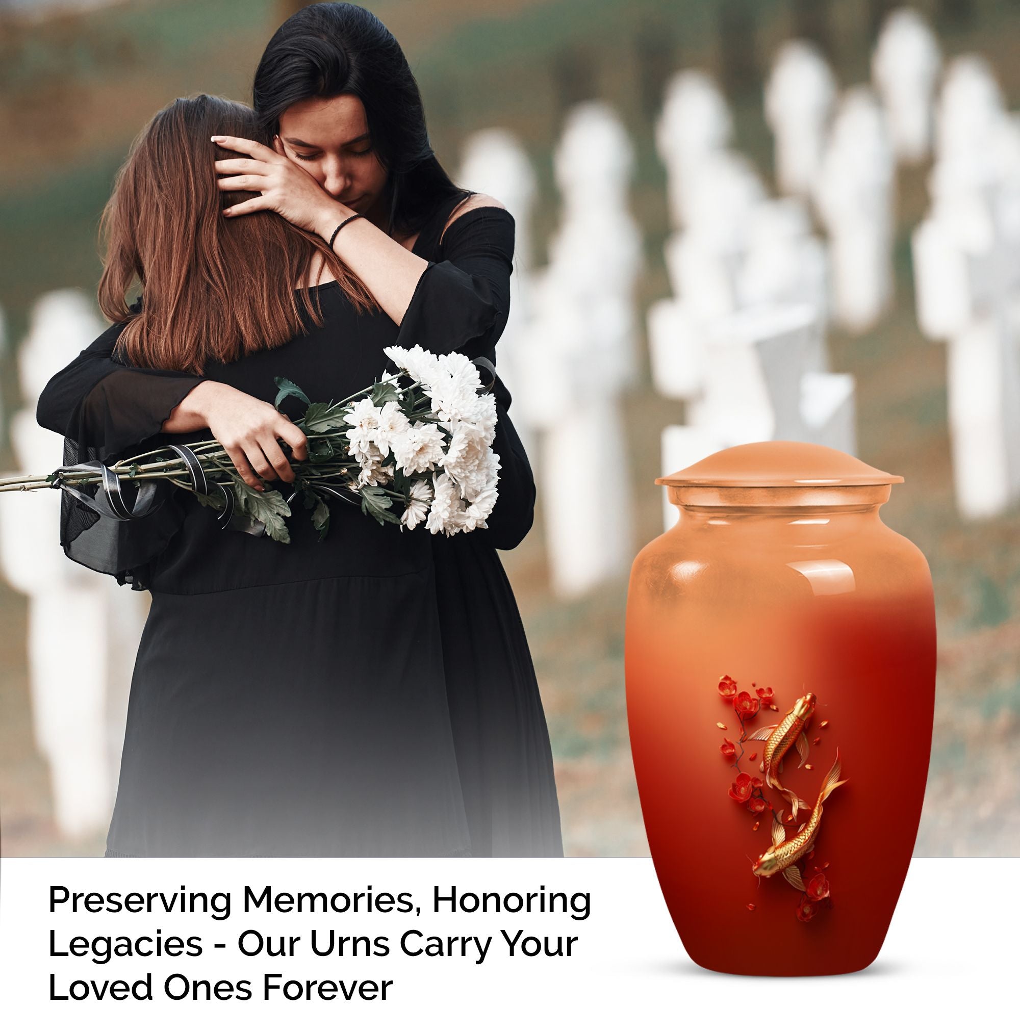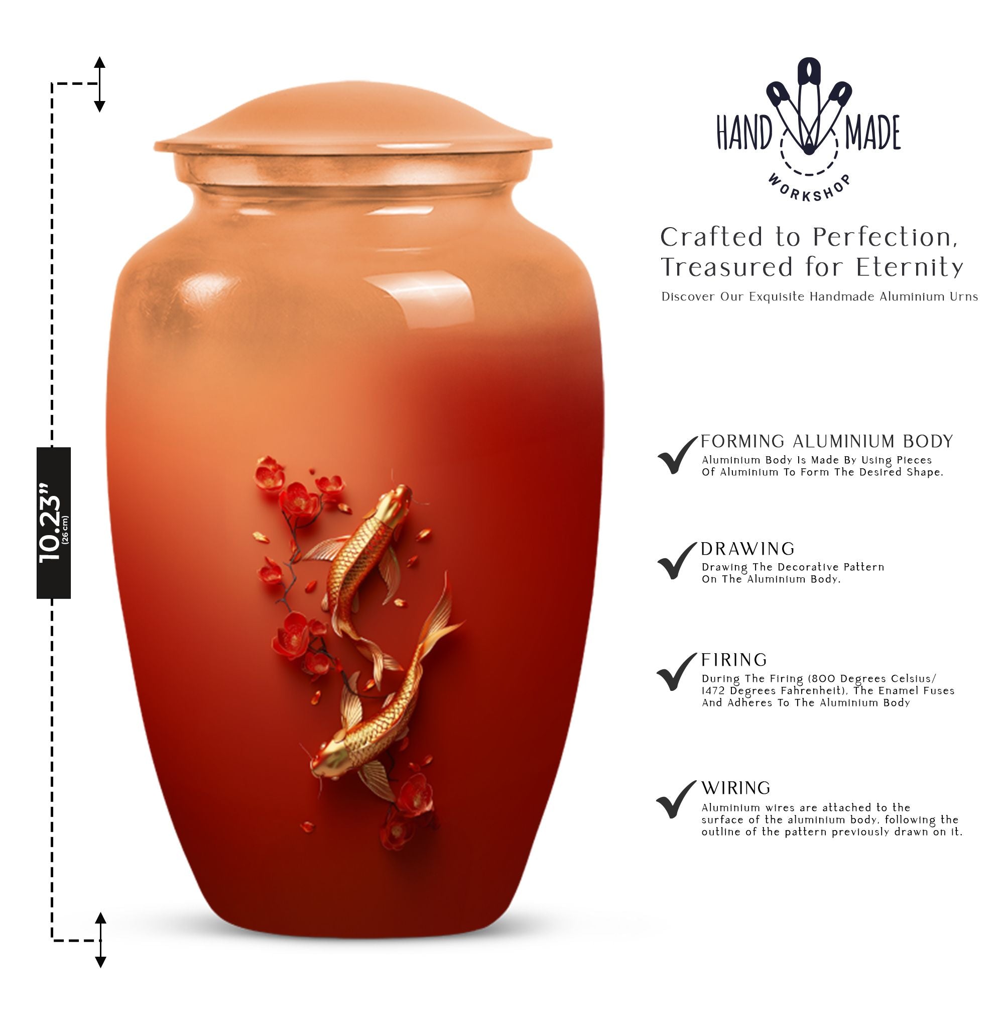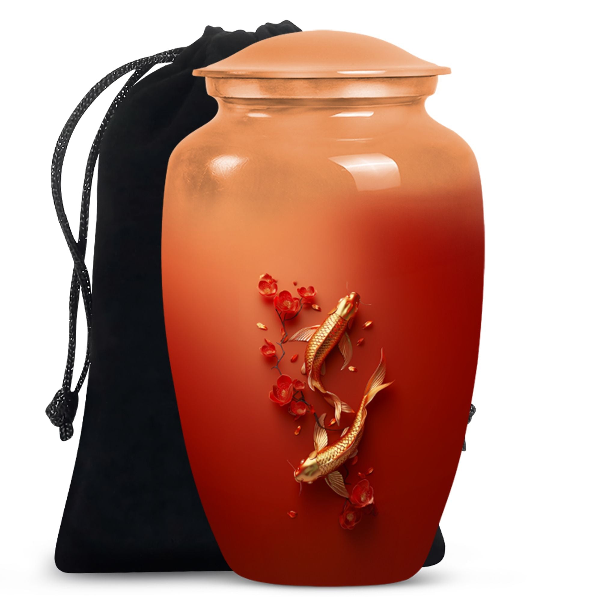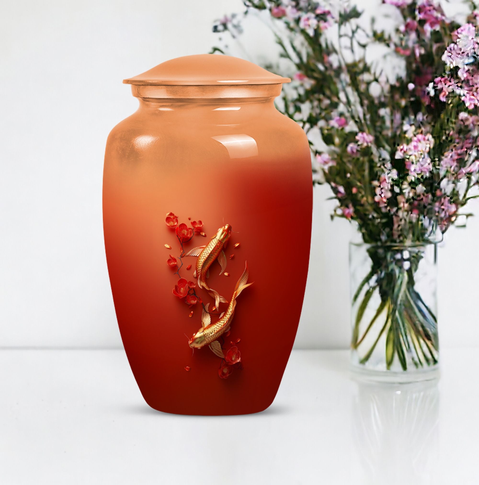 Find solace in your loved one's memory with our 'Goldfish Urn', a token of eternal rest crafted from high-quality Aluminium. This Large Urn, standing at a stature of 10 inches, is designed to cater to adults and senior citizens, providing 200 cubic inches of containment capacity for the ashes. With a weight of 3.3 pounds, this memorial urn for ashes offers a substantial feel, signifying the substance of the memories it embodies. To enhance this urn's significance, you have the opportunity to personalize it with engraved names, giving it an intimate touch that hails from your heart. Accompanying the Urn is a velvet pouch, ensuring a dignified containment of your loved one's ashes. This urn features a Butterfly theme, symbolizing the timelessness of the soul's journey. Remember, it's not just an urn; it's a tribute to life lived and a beacon for the soul's lasting peace. Steer away from traditional funeral urns with this unique memorial piece. Please note: Design is CLASSIC URN.