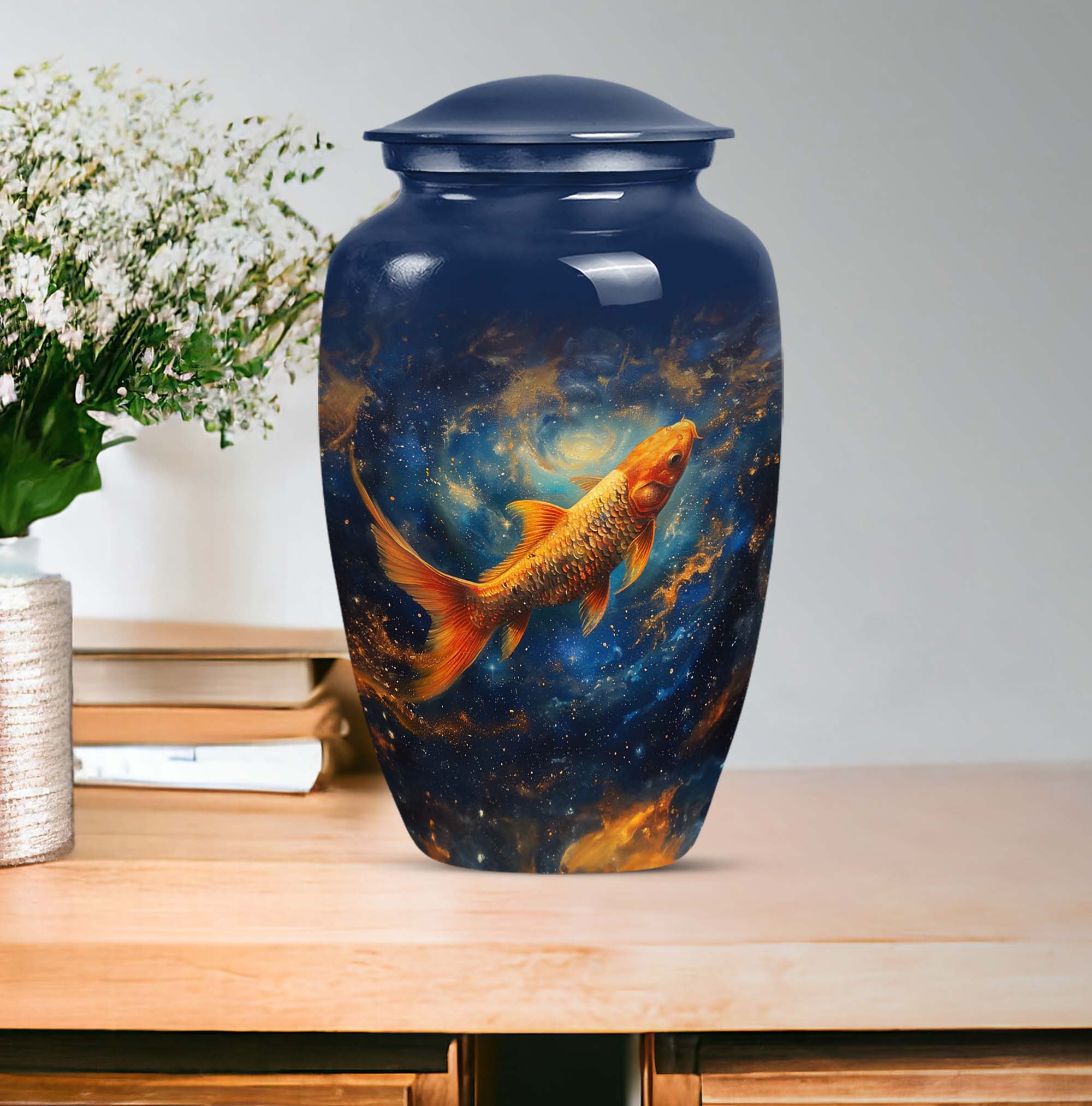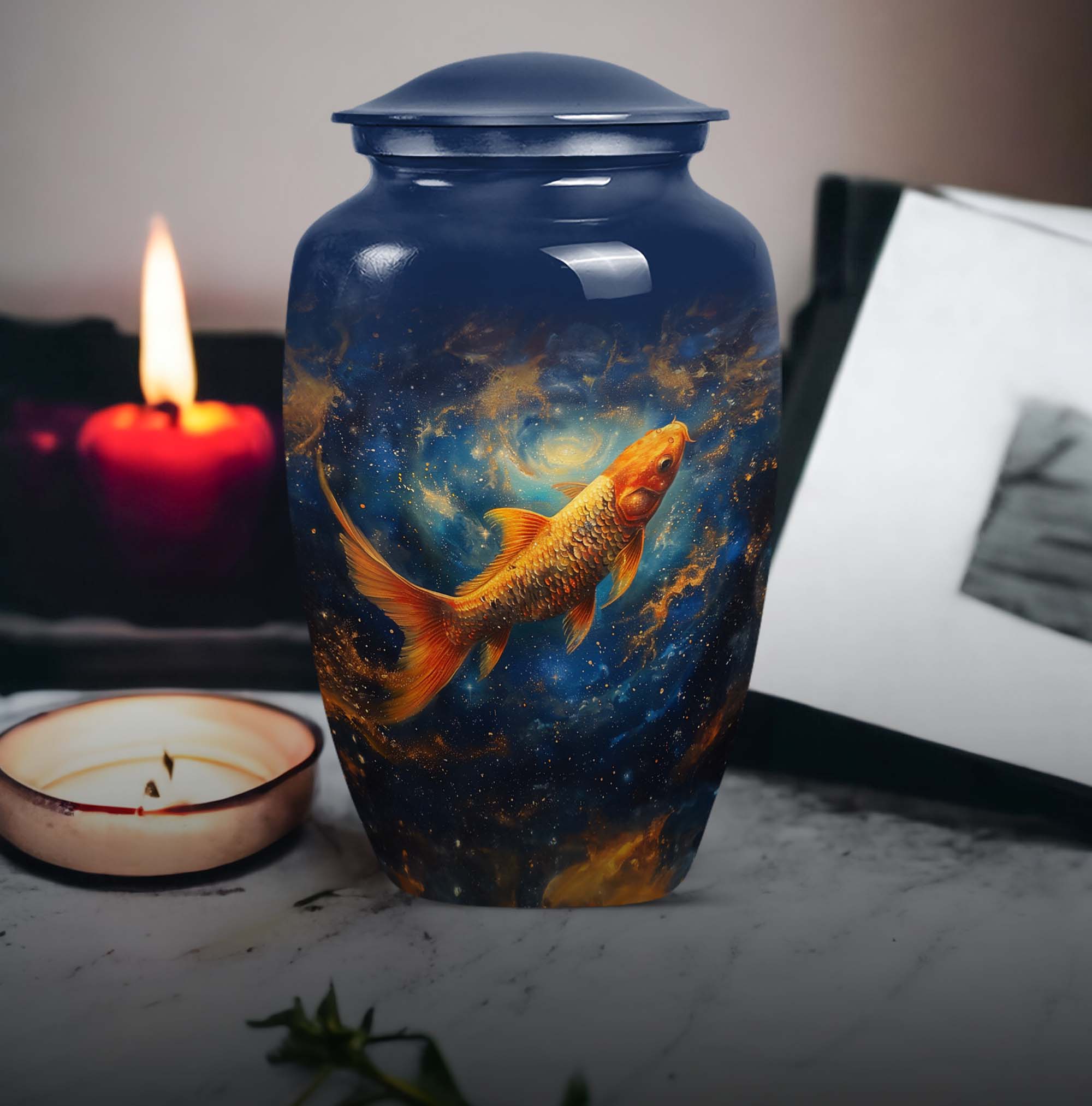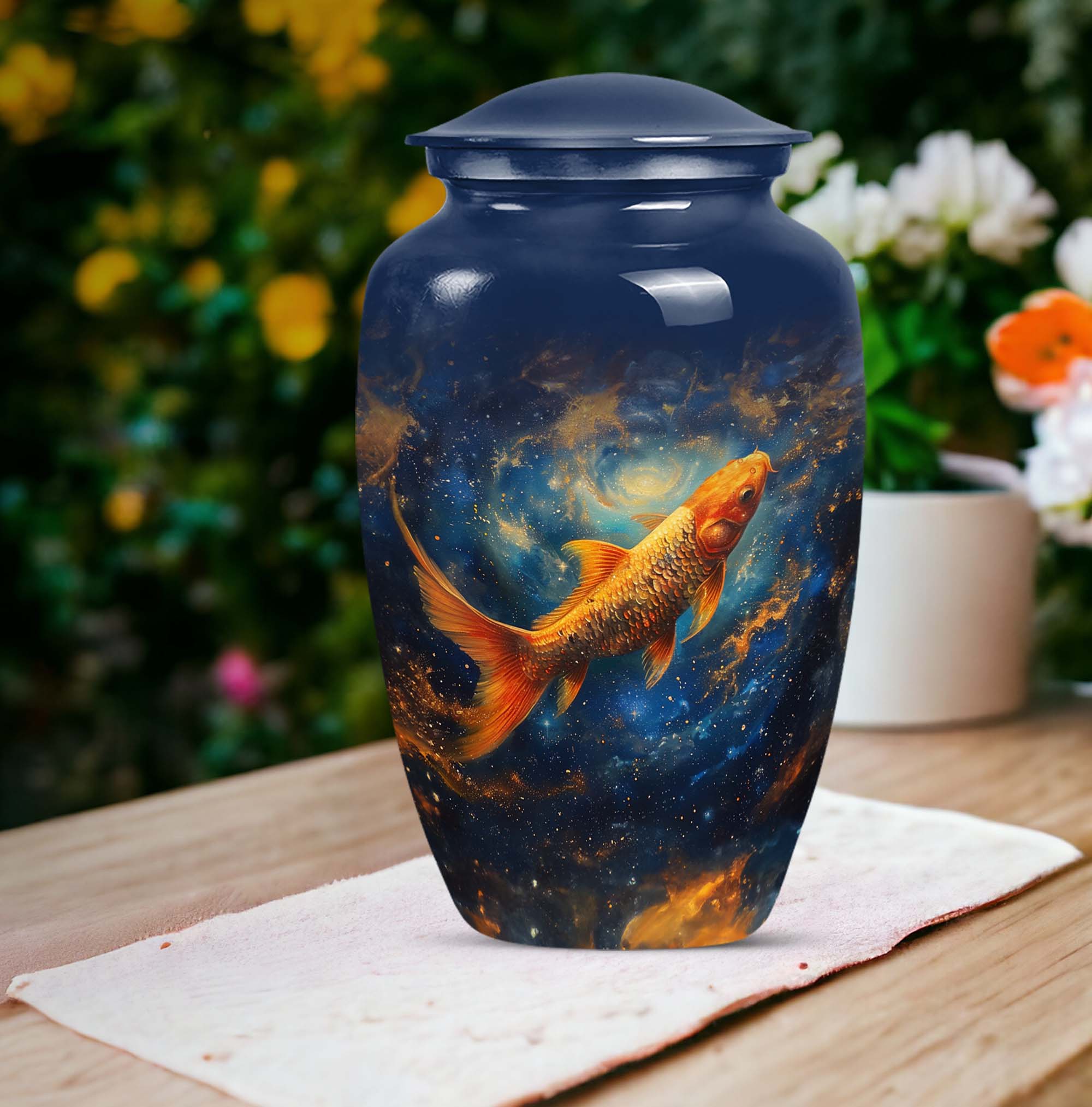 Our 10-inch large fish urn is more than just a memorial item, it's a respectful and honoring statement for your dearly departed. Crafted from refined and durable aluminium, this large urn has been designed with meticulous attention to detail. Its weight of 3.3 pounds testifies to its robust make, designed to stand the test of time. The abstract theme of the urn speaks volumes about the enigmatic journey of life making it well suited for adults and seniors seeking an artistic approach to memorialization. This memorial human urn has a significant capacity of 200 cubic inches, ensuring ample space for ashes. Unlike many other urns, this vital piece comes with a velvet pouch for the containment of ashes, adding an extra layer of care and respect with which we approach the sacred task of memorialization. The urn is also customizable, with the option to personalize it with engraved names, subtly adding a personal touch. This item belongs to the category of memorial funeral urns for ashes and it elevates the adult burial urn tradition by incorporating modern stylistic elements. This transcendent piece, also related to 'ashes of love', is appreciated by customers searching for unique, metal large urns. Note: the design element of the product has not been considered in this description.