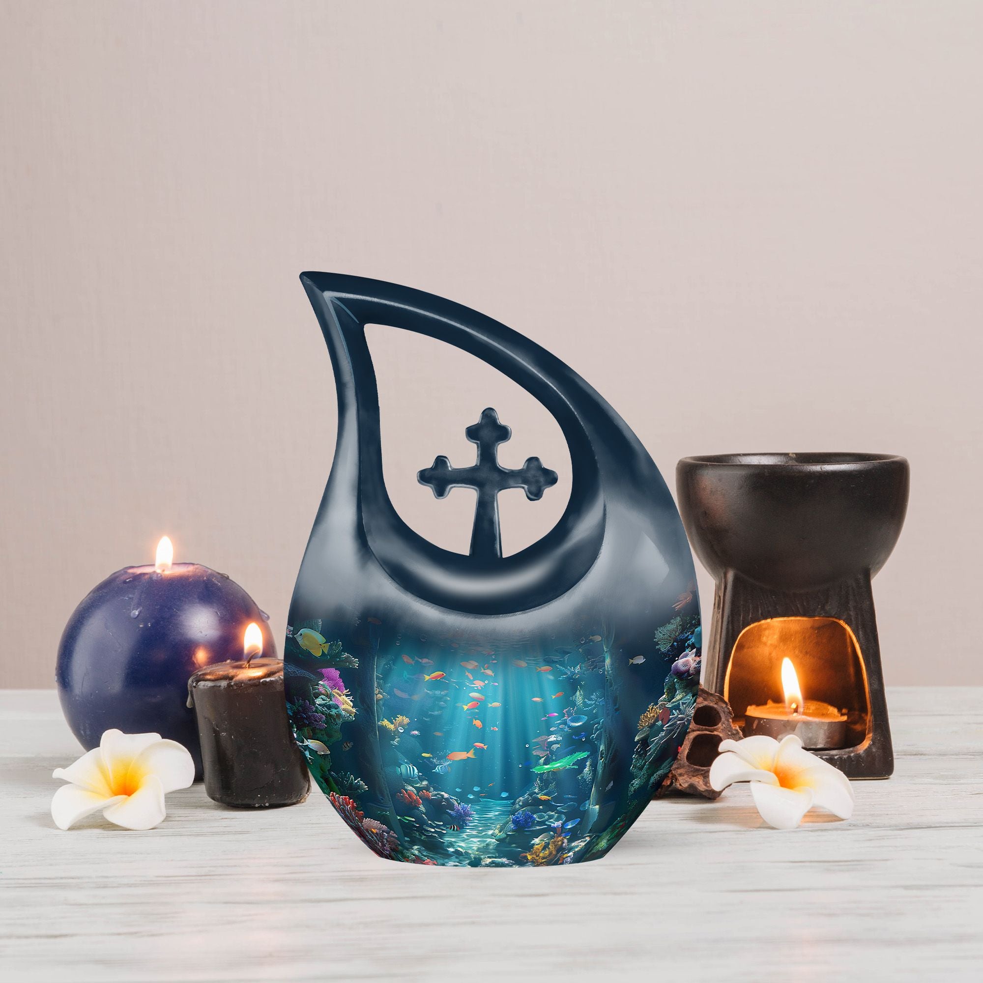 Expertly handcrafted from durable aluminum, this cremation urn adult large features a rich deep blue finish accented by an elegant fish design, symbolizing serenity and spiritual continuity. Its sleek, polished surface and secure screw-top lid ensure long-lasting preservation, making it one of the finest large cremation urns for human ashes available. Perfect for both men and women, this urn radiates grace and strength.