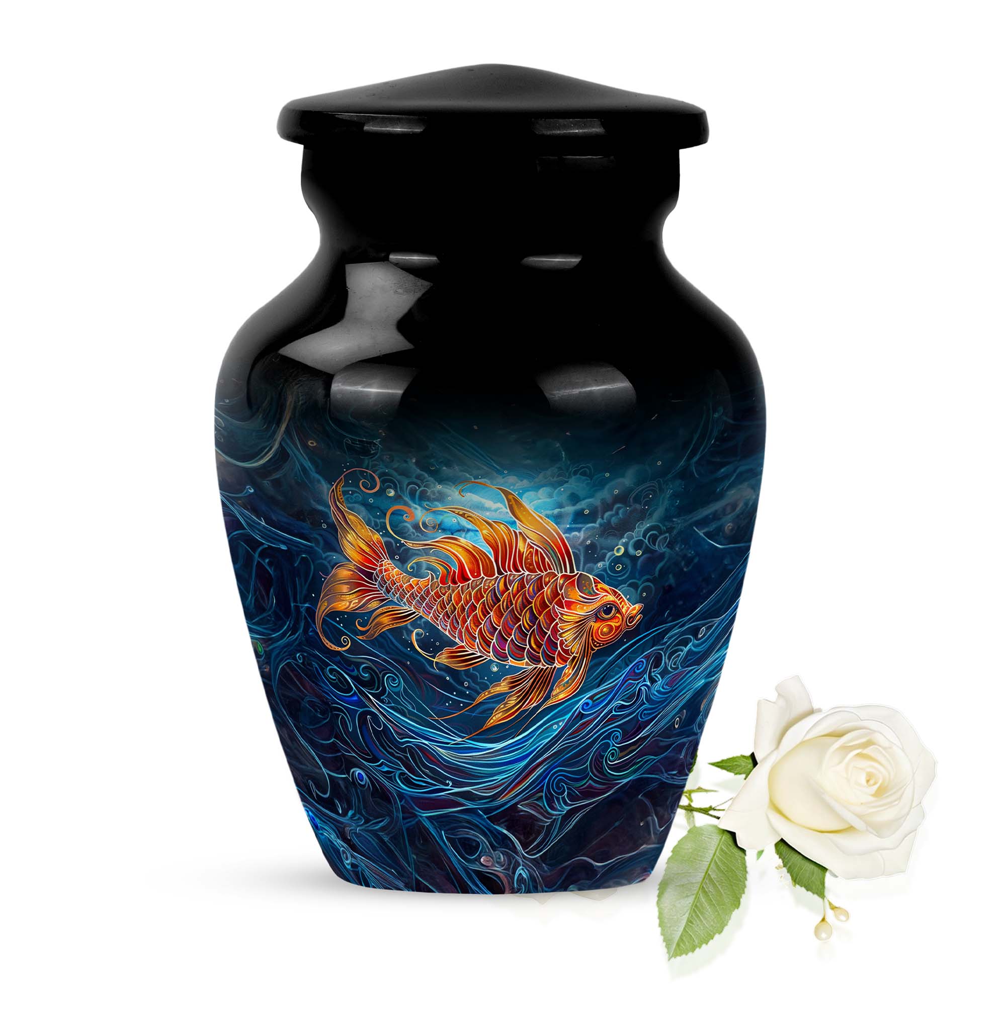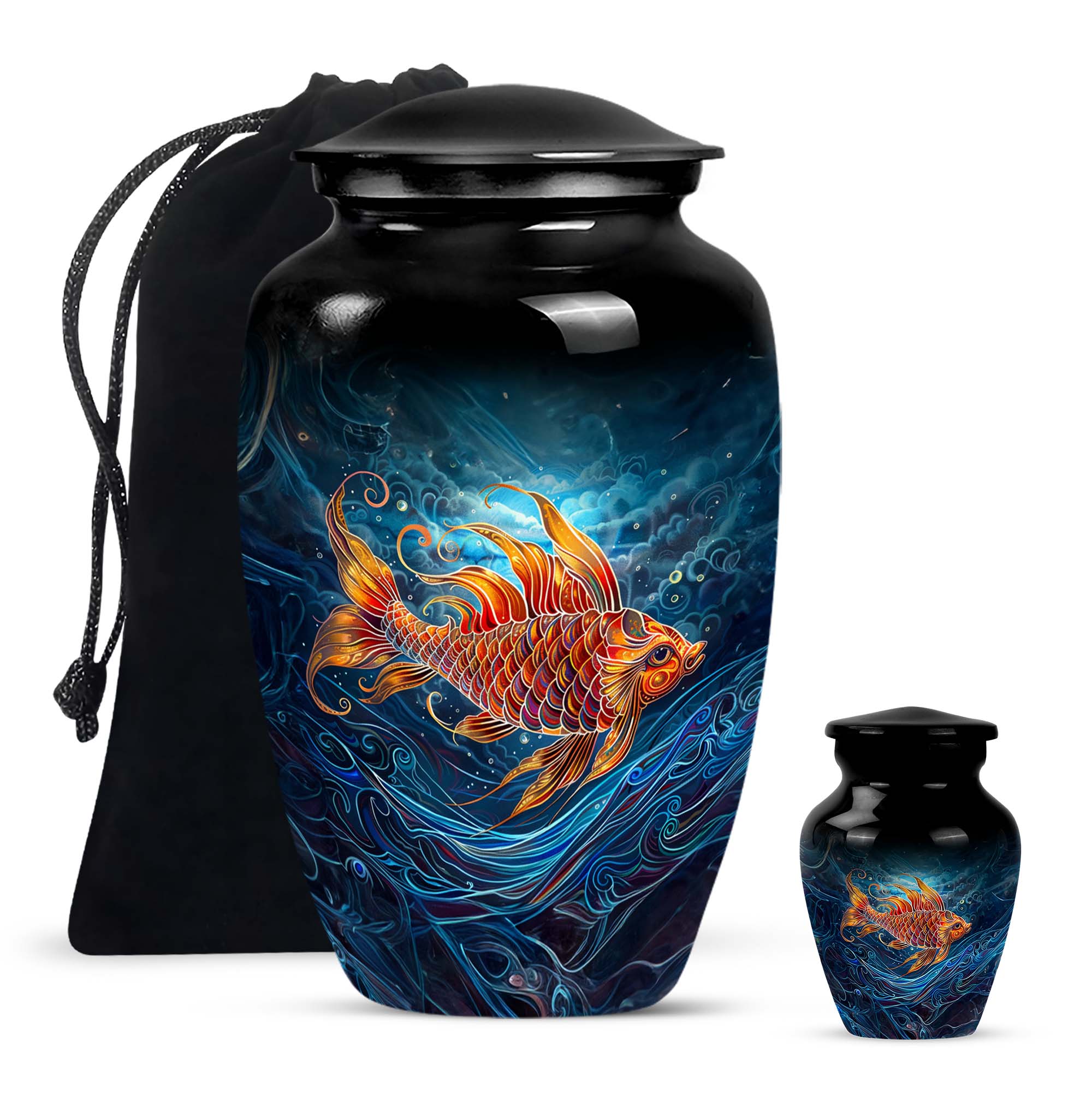 Experience a profound sense of peace and tranquility with this Classic 10-Inch Aluminium Fish Urn, an ideal tribute to your beloved, available under our Memorial Ceremony Supplies collection. Ideal for those in need of a cremation urn for dad or human urn for ashes, this urn carries a subtle abstract theme that discourses the depth of your emotions in a serene way. Weighing only 3.3 pounds, this large urn comfortably holds up to 200 cubic inches of ashes. Beyond just a cremation urn, it comes with a soft velvet pouch for respectful containment and transport of ashes. Customize this urn by engraving names to make it a more personalized memorial. When searching for 'fish urn' or 'burial ash urns for humans,' this high-quality aluminum artifact stands out due to its robustness and elegance. Do not just pay tribute; do it with love, attention, and dignity that transcends mortal boundaries.