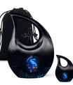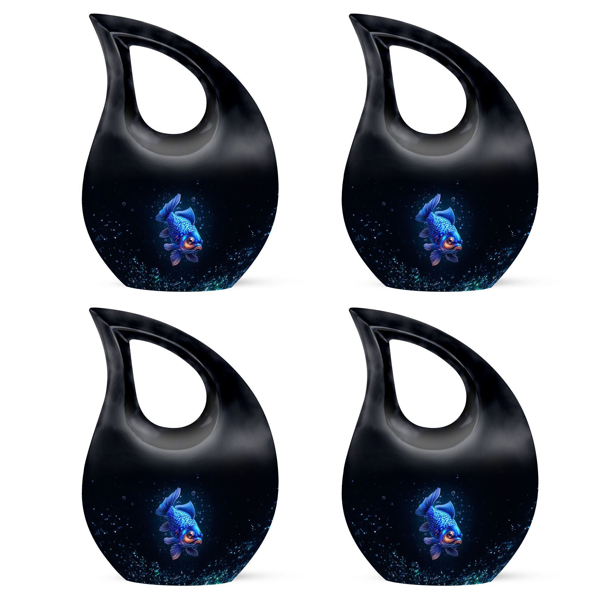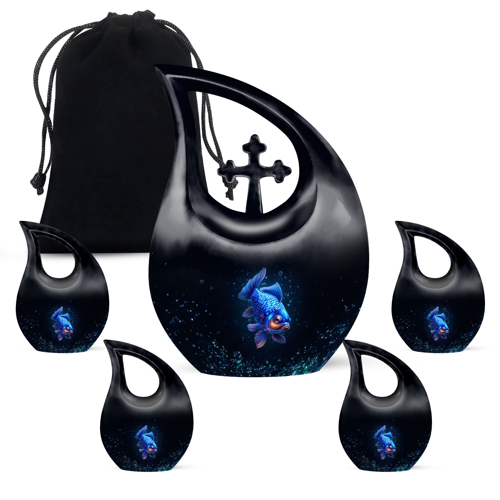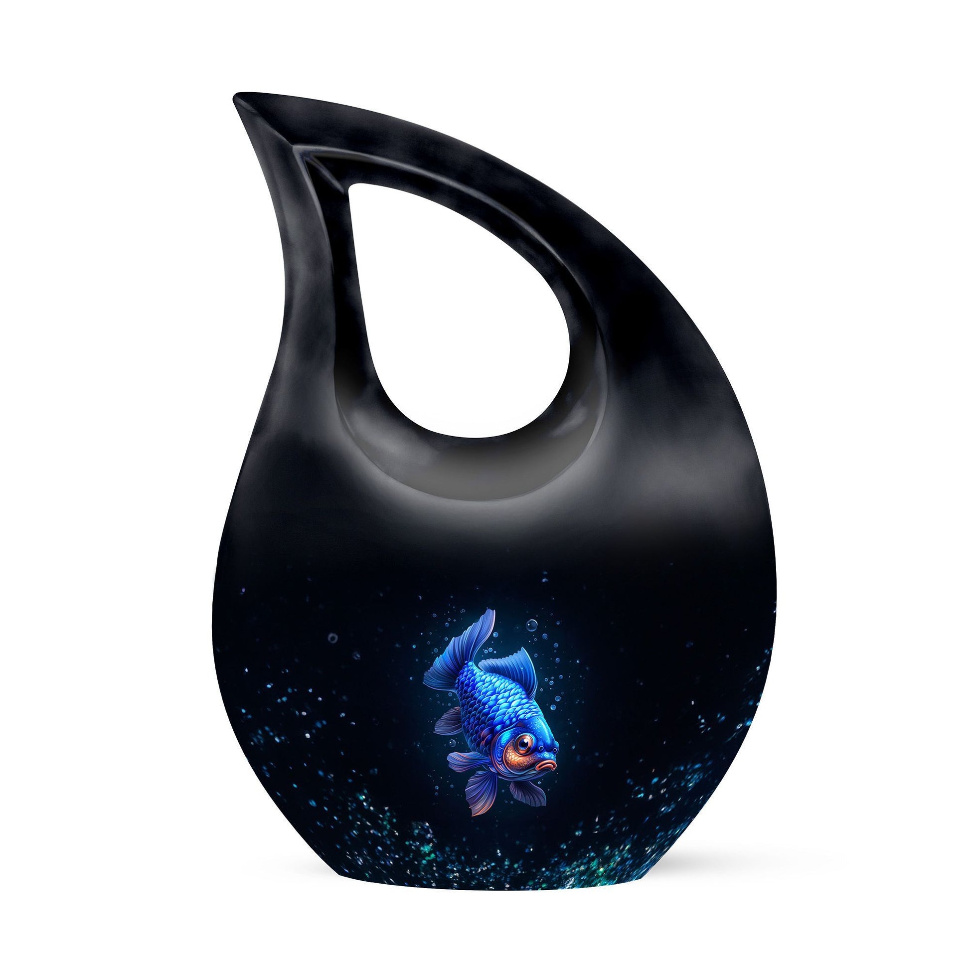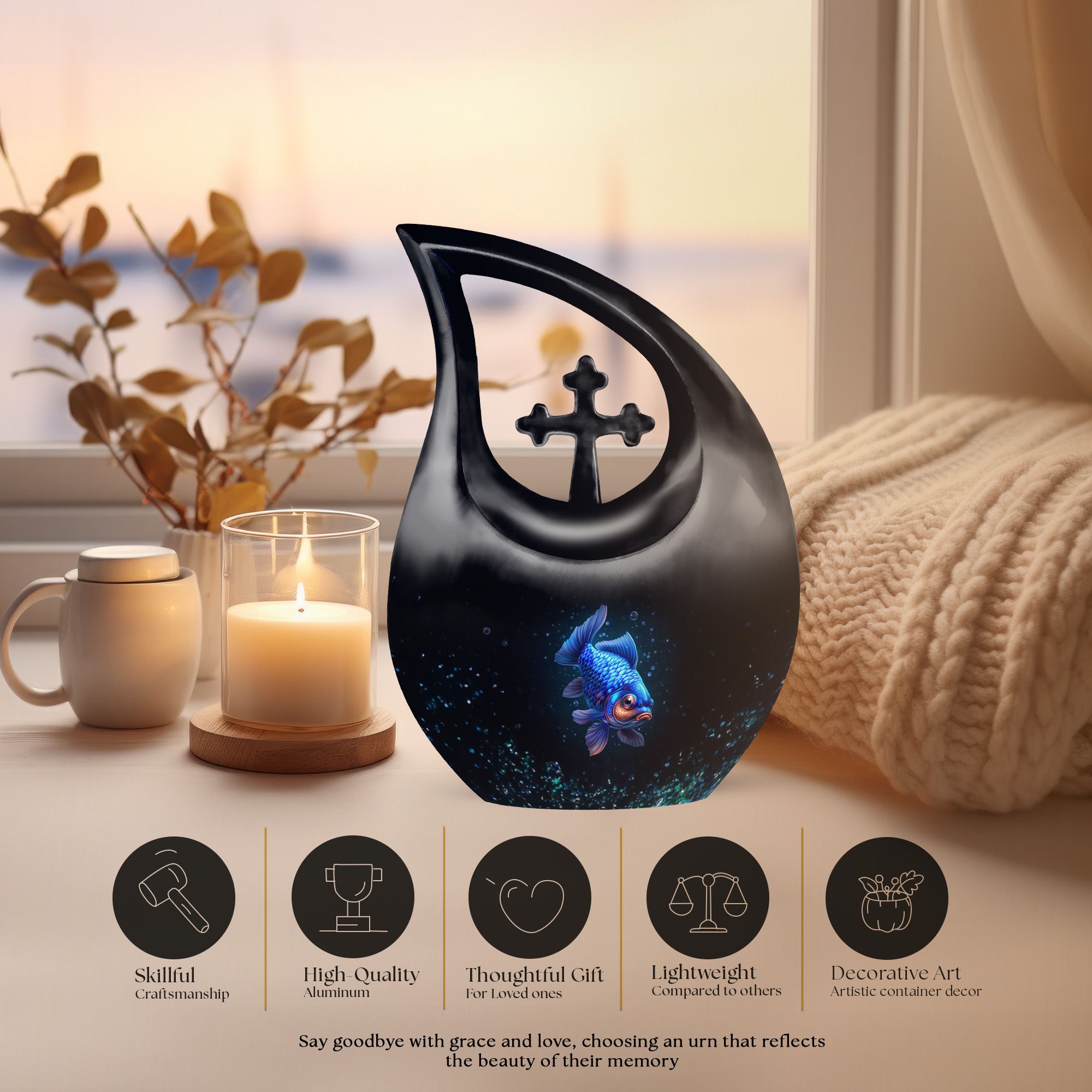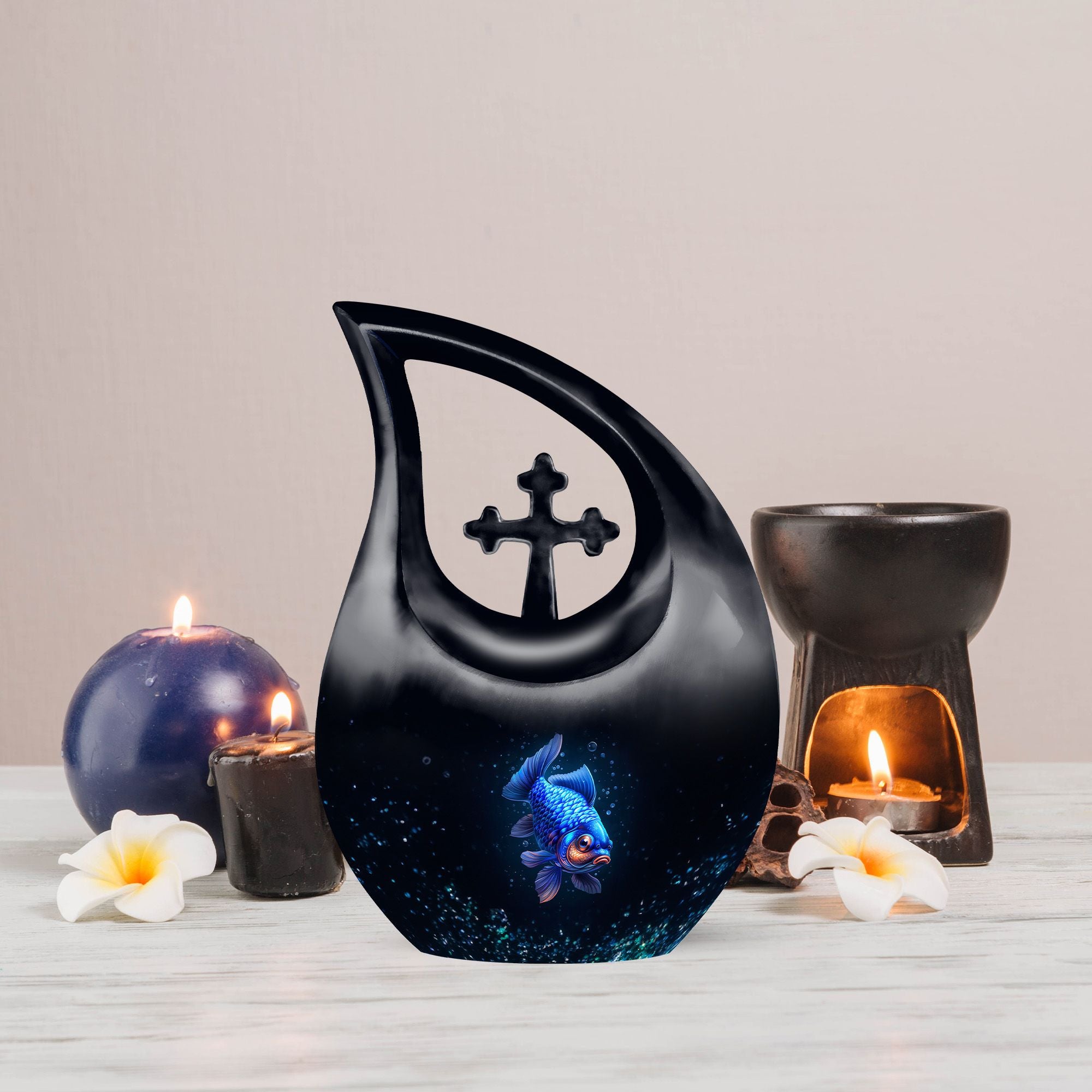 Honor your dearly departed with our unique 'Fish Urn,' a standout amongst memorial urns on the market. Constructed from resilient Aluminium, this large urn measures 10 inches in height and can house up to 200 cubic inches of ashes. The urn manages to blend solemnity with elegance, all while holding a deep significance for the religious or angling enthusiast, thanks to its intriguing fish theme. We offer you the opportunity to add a personalized touch with engraved names, making it a fitting tribute to your loved one. Our package comes complete with a velvet pouch to securely hold the ashes. Each urn weighs a sturdy 3.3 pounds, embodying the weight of shared memory and lasting love. Popularly searched as 'Urns for Human Ashes', 'Pink urns for Human Ashes', 'Urn for Mom, Butterfly urns for ashes', and 'Angel urn', our carefully crafted fish urn stands apart with its unique cross drop. Experience a tasteful blend of sacred reverence and affectionate remembrance with our exclusive Fish Urn - a harmonious blend of grief, faith, and love.