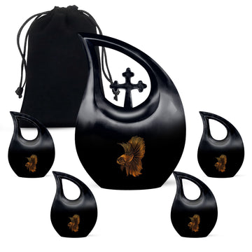 Experience a unique way to immortalise your loved ones with our Fish Urn, a standout in our range of memorial urns. This large size, 10-inch Cremation Box allows you to safeguard their ashes in an area of 200 cubic inches, providing a spacious containment for your precious remembrance. Crafted meticulously from robust aluminium, this urn ensures long-lasting durability, while its Cross Drop theme adds a significant touch of solemn elegance. Its weight of 3.3 pounds signifies robust construction and quality, promising an enduring tribute to your beloved. With your purchase, you'll receive a velvet pouch to securely keep the ashes. To add a deeper level of intimacy, personalize this urn with engraved names, turning it into a special memorial unique to your loved one. This product does not only serve the purpose of an urn, but it also serves as a testament to the legacy left behind by your loved one. Note: Keywords for searches that could be relevant—Purple Urns, Small Urns For Ashes, Urns For Ashes, Mini Urns For Ashes.