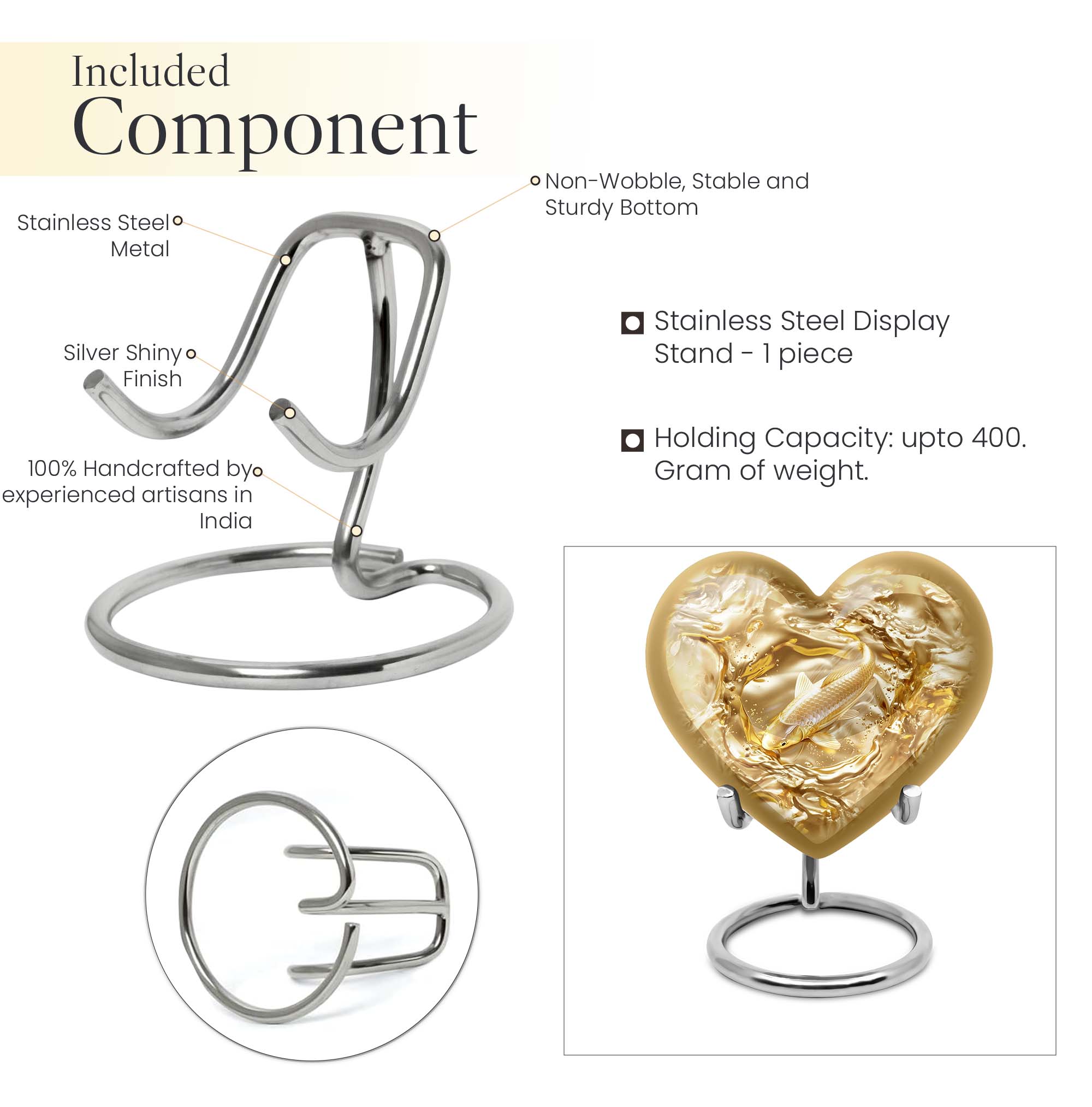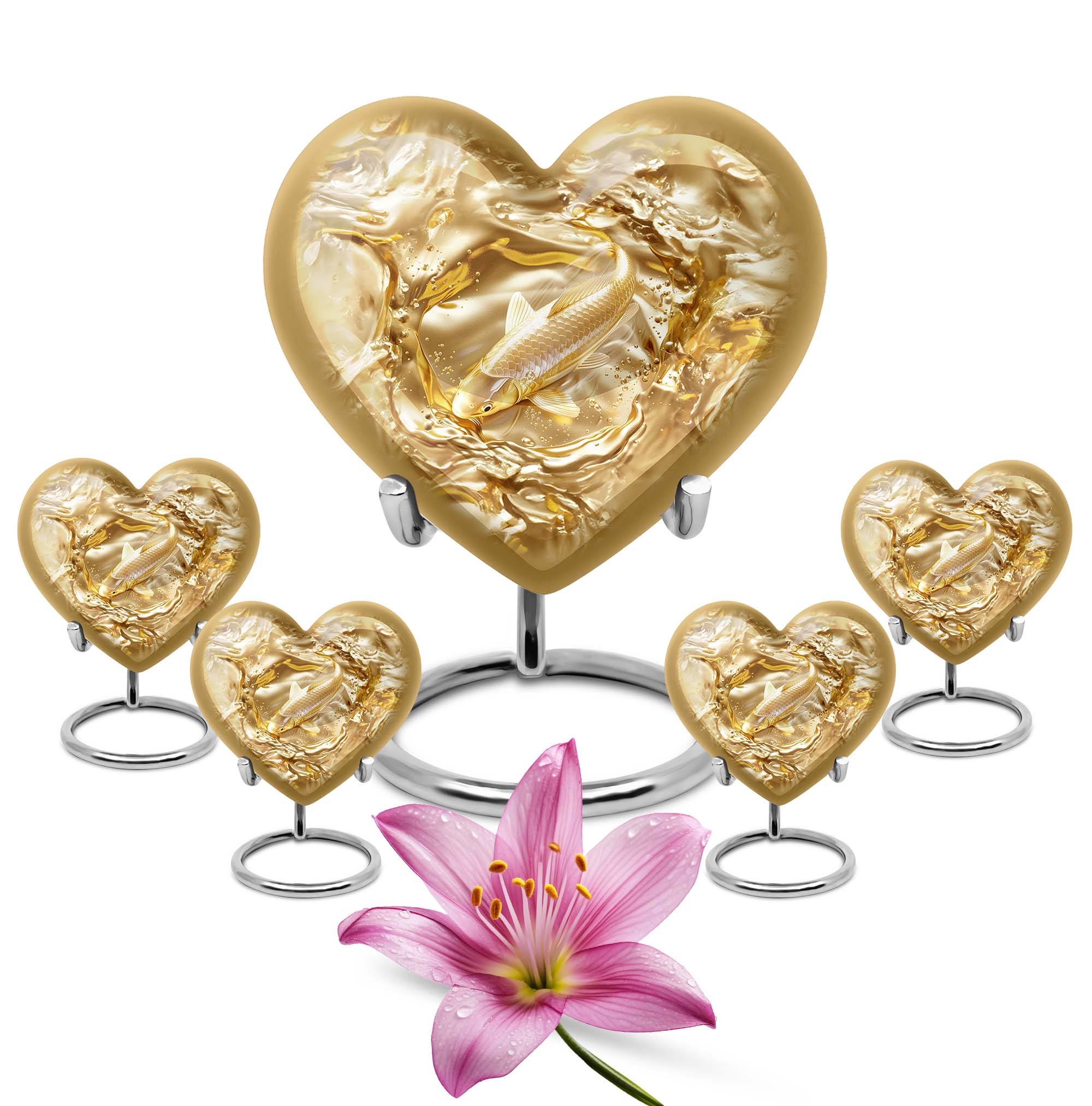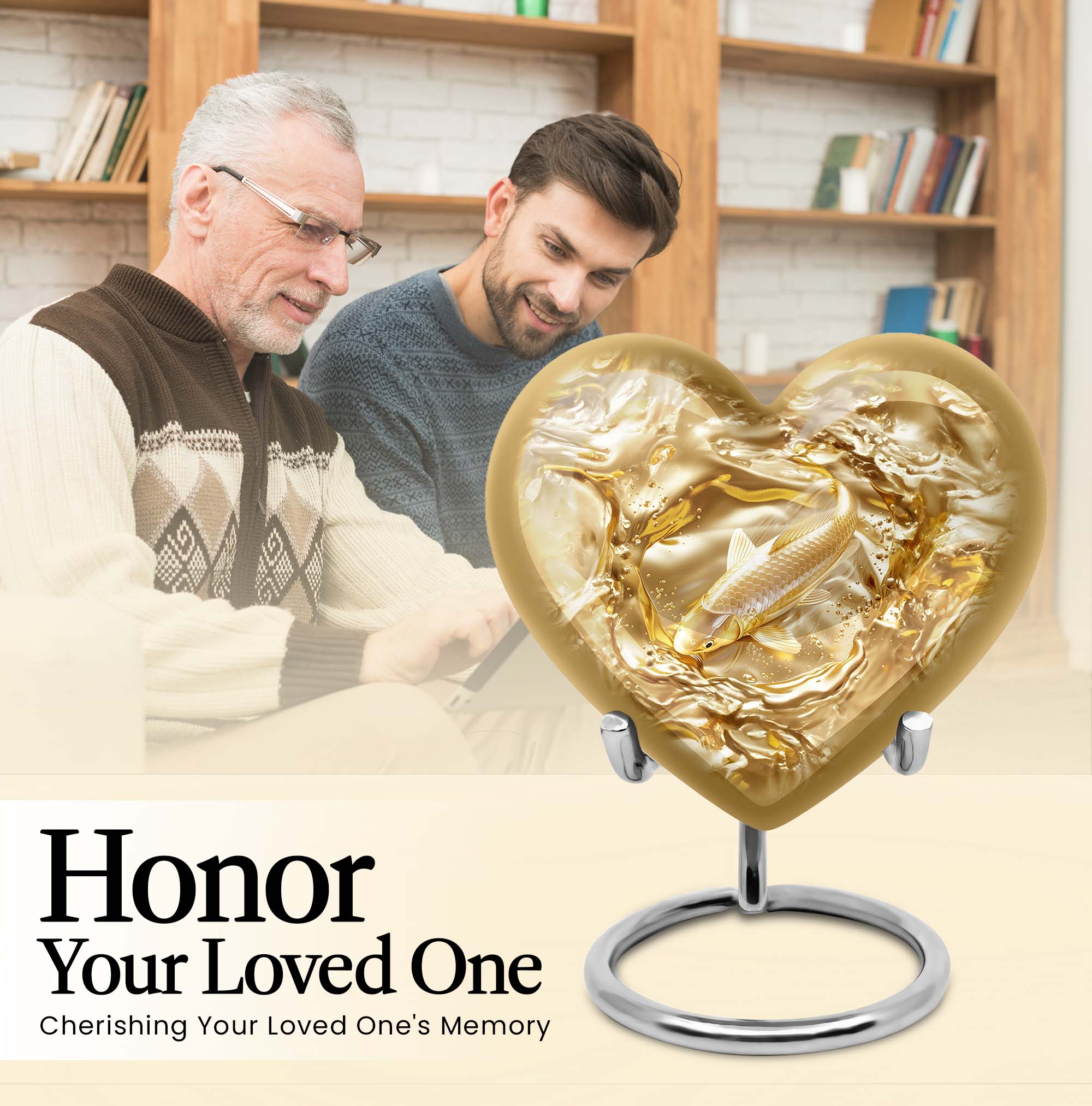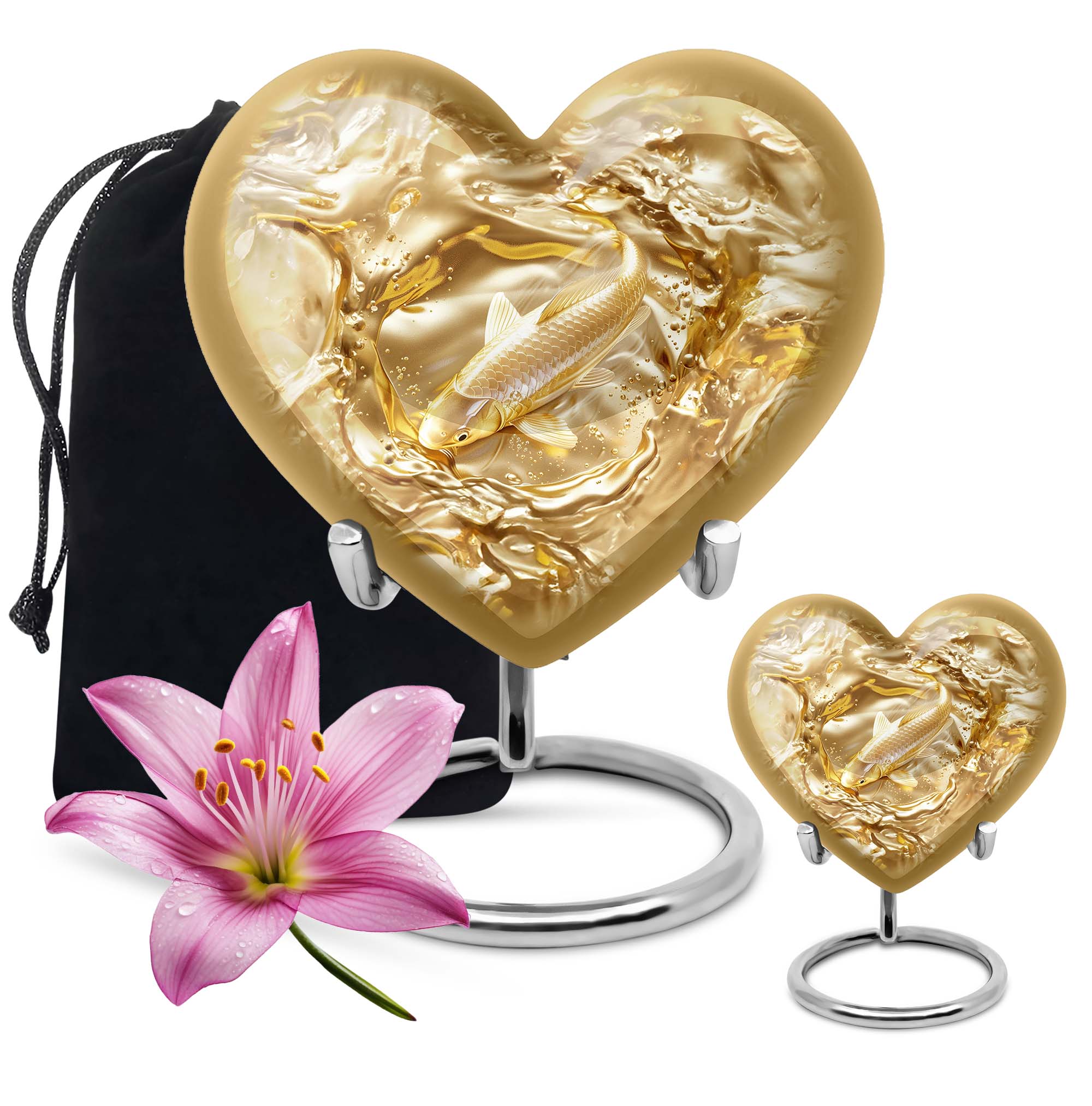 This meticulously crafted 'Gold Fish Urn' rekindles your sentiments for your departed loved ones. It comes in a heart urn themed design, with enchanting butterfly motifs to celebrate their free spirits. This 10-inch large urn, weighing 3.3 pounds, is capable of efficiently containing up to 200 cubic inches of ashes. Made from durable aluminium, this burial urn promises longevity, a dignified homage to your beloved. Each urn arrives with a specially designed velvet pouch to carefully contain the ashes. Highly customizable, it offers the unique feature of personalizing it with engraved names. Its striking allure and robust construction make it an ideal choice for memorial urns and funeral extra large urns alike. As a cremation urn for adult ashes, it appropriately commemorates both men and women, serving as a tangible memory of the departed. Shop this exquisite item to keep the sacred ashes of your humans urn ashes with dignity and love.