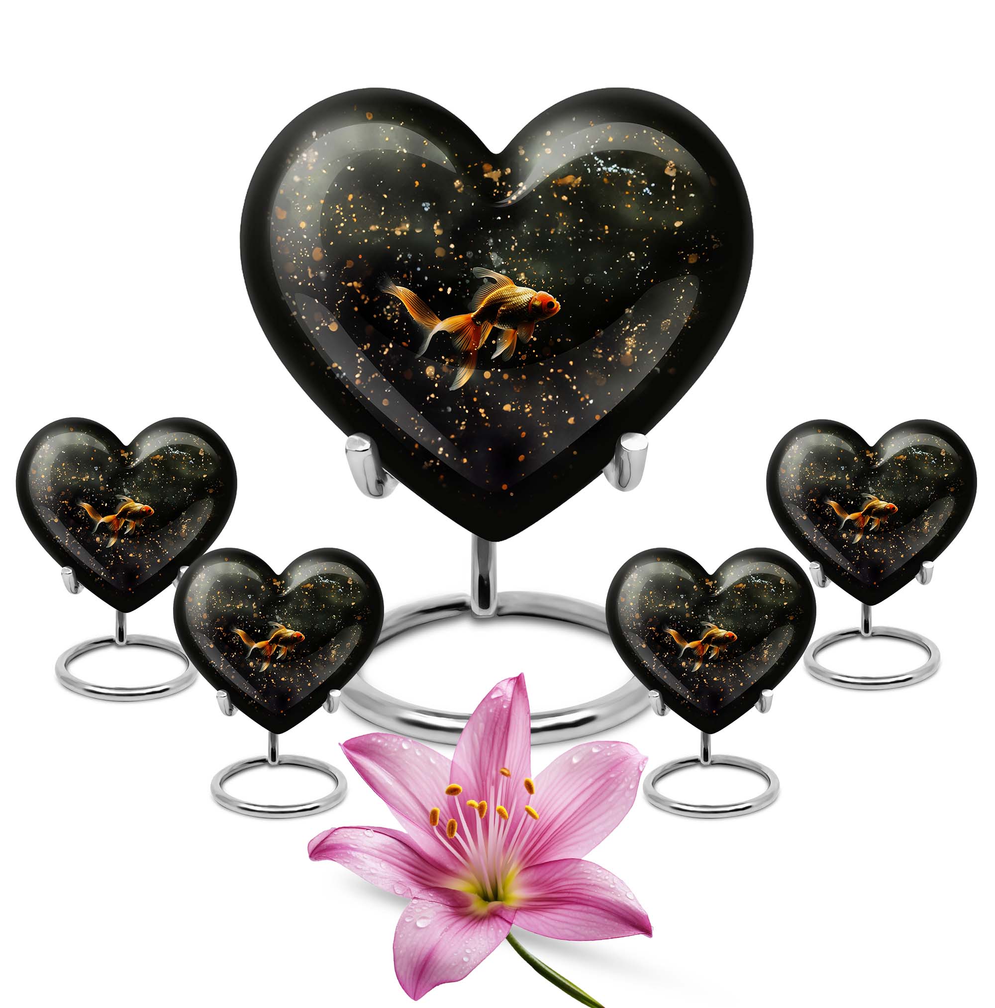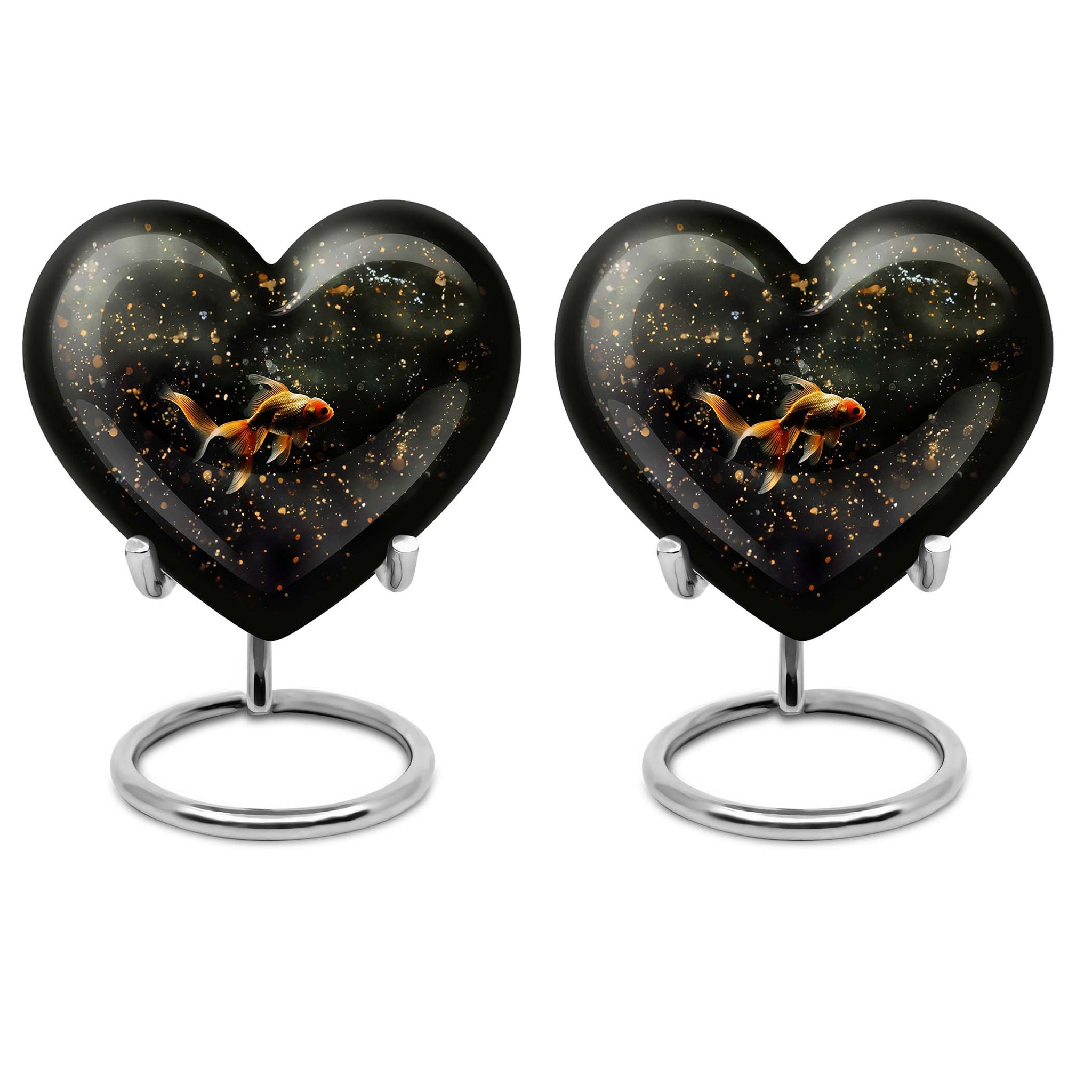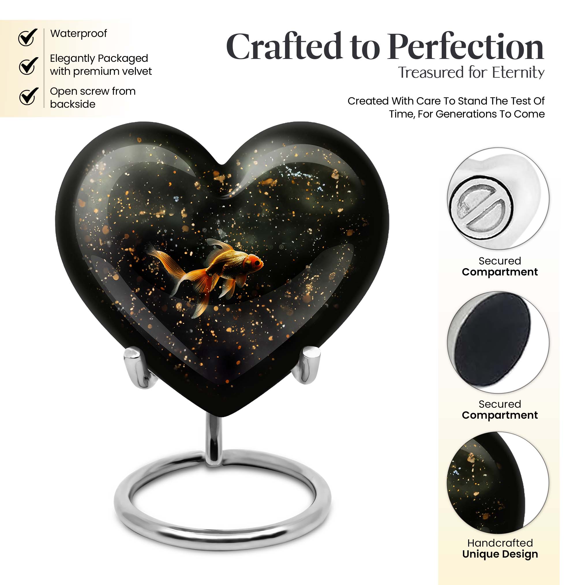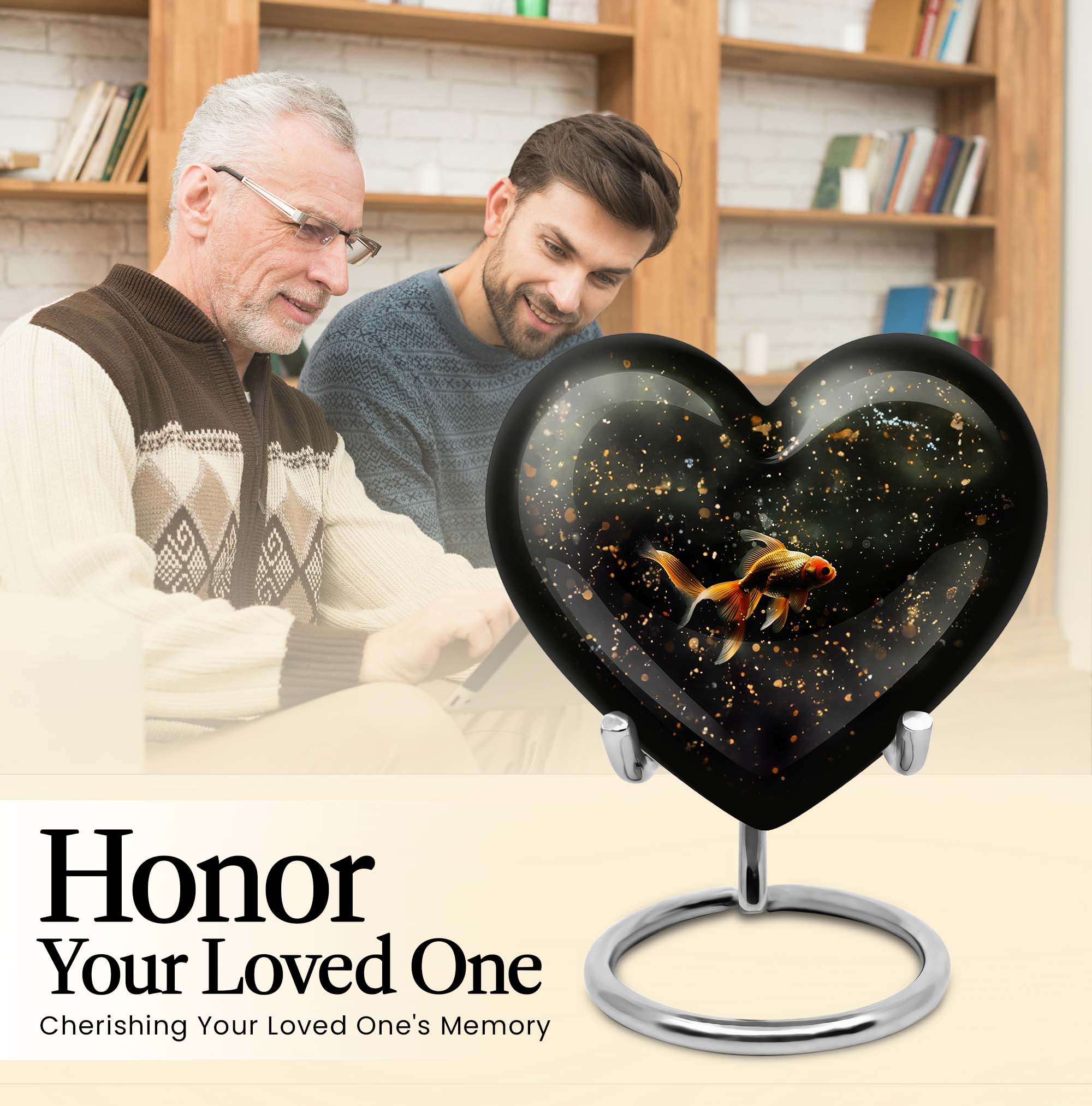 Commemorate your loved ones with our stunning 10-inch gold fish urn, the perfect resting place for cremation ashes. This ethereal heart urn, crafted from durable aluminium, embodies a tender motif of delicate butterflies, symbolizing transformation and rebirth. With an impressive capacity of 200 cubic inches, it is categorized among the large urns, accommodating adult human ashes subtly and respectfully. Weighing 3.3 pounds, this burial urn stands majestically at a height of 10 inches. Personalize this urn with the names of your dearly departed, adding a layer of intimacy and fond remembrance. Moreover, the urn is accompanied by a velvet pouch that serves as a dignified containment for the ashes. Honor your departed with this memorable piece that artistically combines a sacred aura with tasteful aesthetics. Frequently searched under 'memorial urns', 'cremation urns for burial', or 'cremation urn for human ashes', this urn serves as a testament to life lived and cherished.