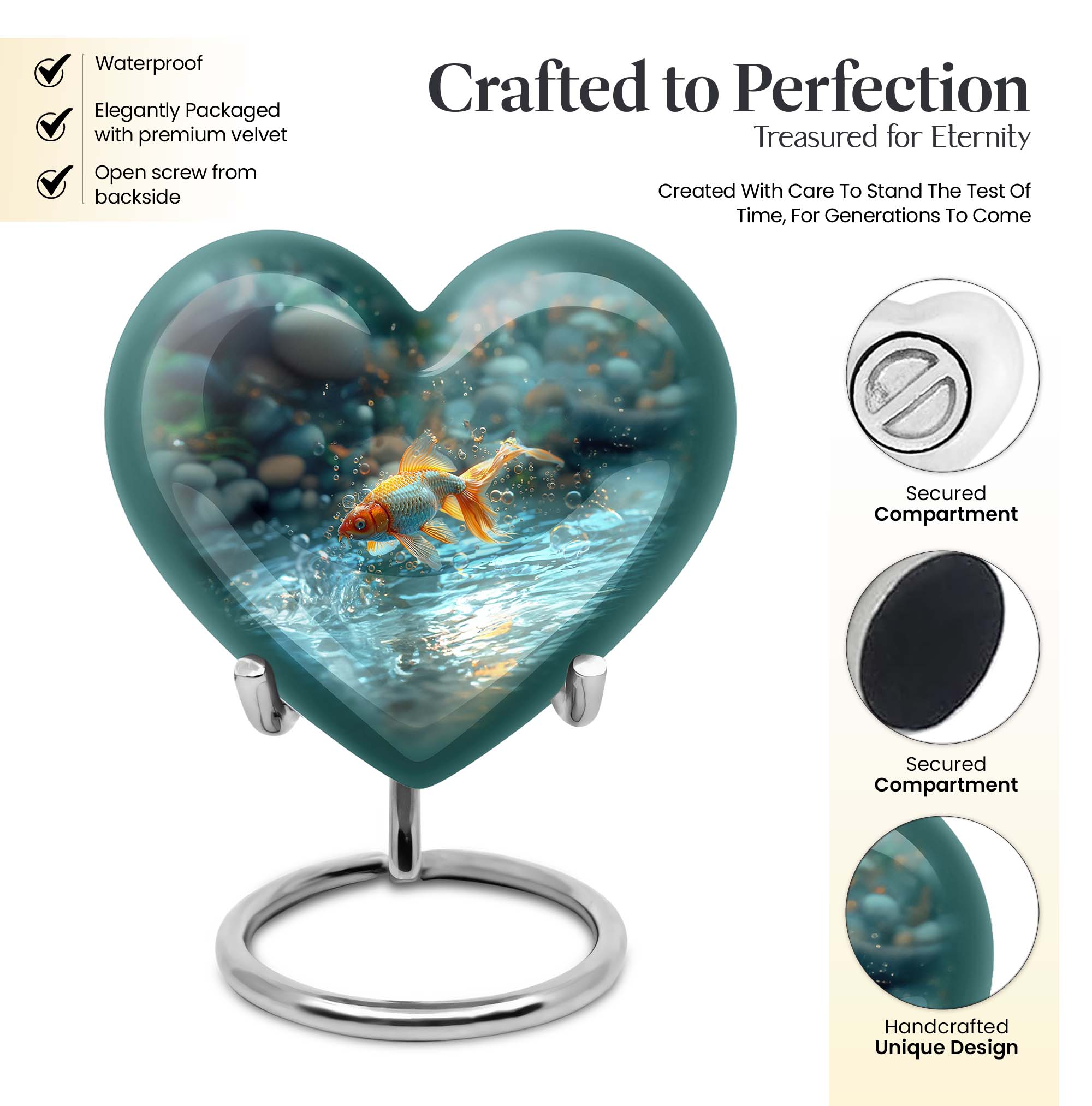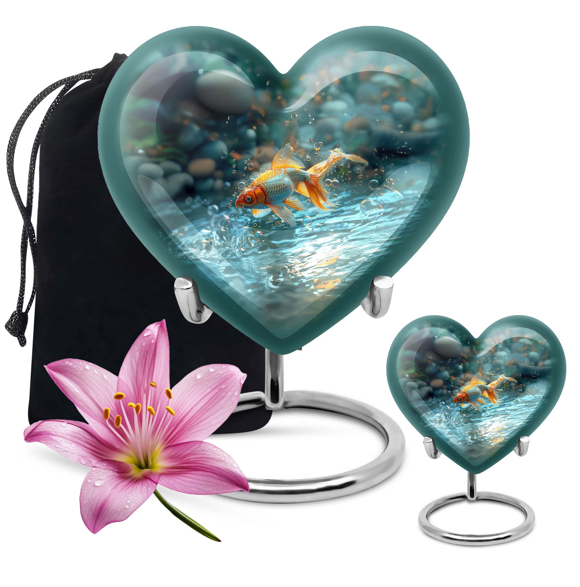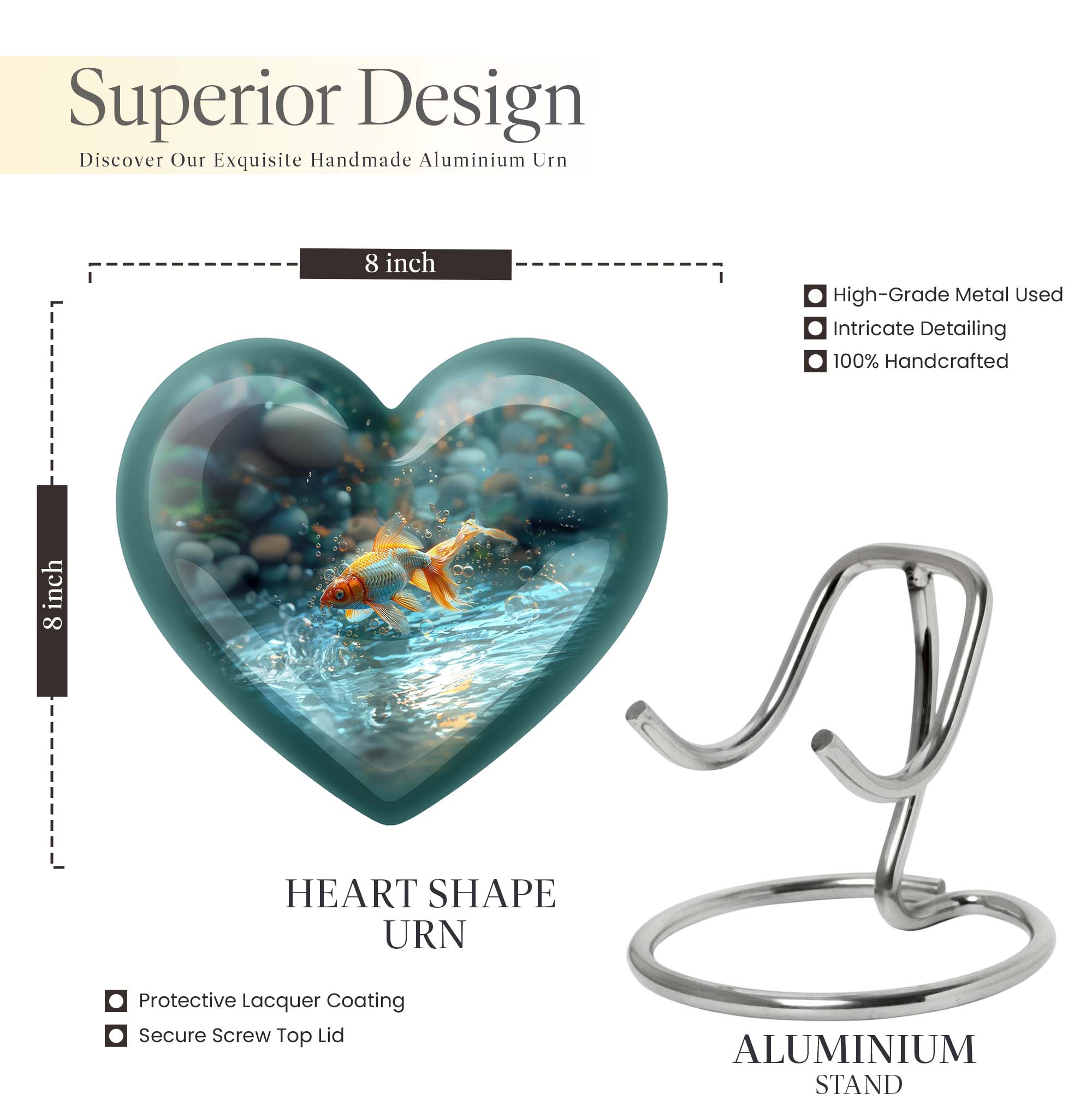 Presenting our handcrafted gold fish urn, a heartfelt memento to honor and remember your loved ones. This large urn showcases a symbolic butterfly theme, adding a serene and peaceful touch. It is carefully created from robust aluminium material which stands 10 inches tall, weighing only a mere 3.3 pounds. With a remarkable capacity of 200 cubic inches, this urn for cremation ashes is roomy enough to hold ashes securely. The product comes with a delicate velvet pouch, assuring containment of ashes and easy transportation. Personalize this piece further with engraved names, elevating its uniqueness and sentimental value. This cremation urn is not only just an urn, but a memorable keepsake that forever encapsulates the love and affection you hold. The urn mirrors the infinite bond you shared, making it a perfect tribute to your loved one. Commonly searched terms for our product include 'memorial urns', 'burial large urn', 'ash adult funeral urns', and 'funeral cremation urn'.