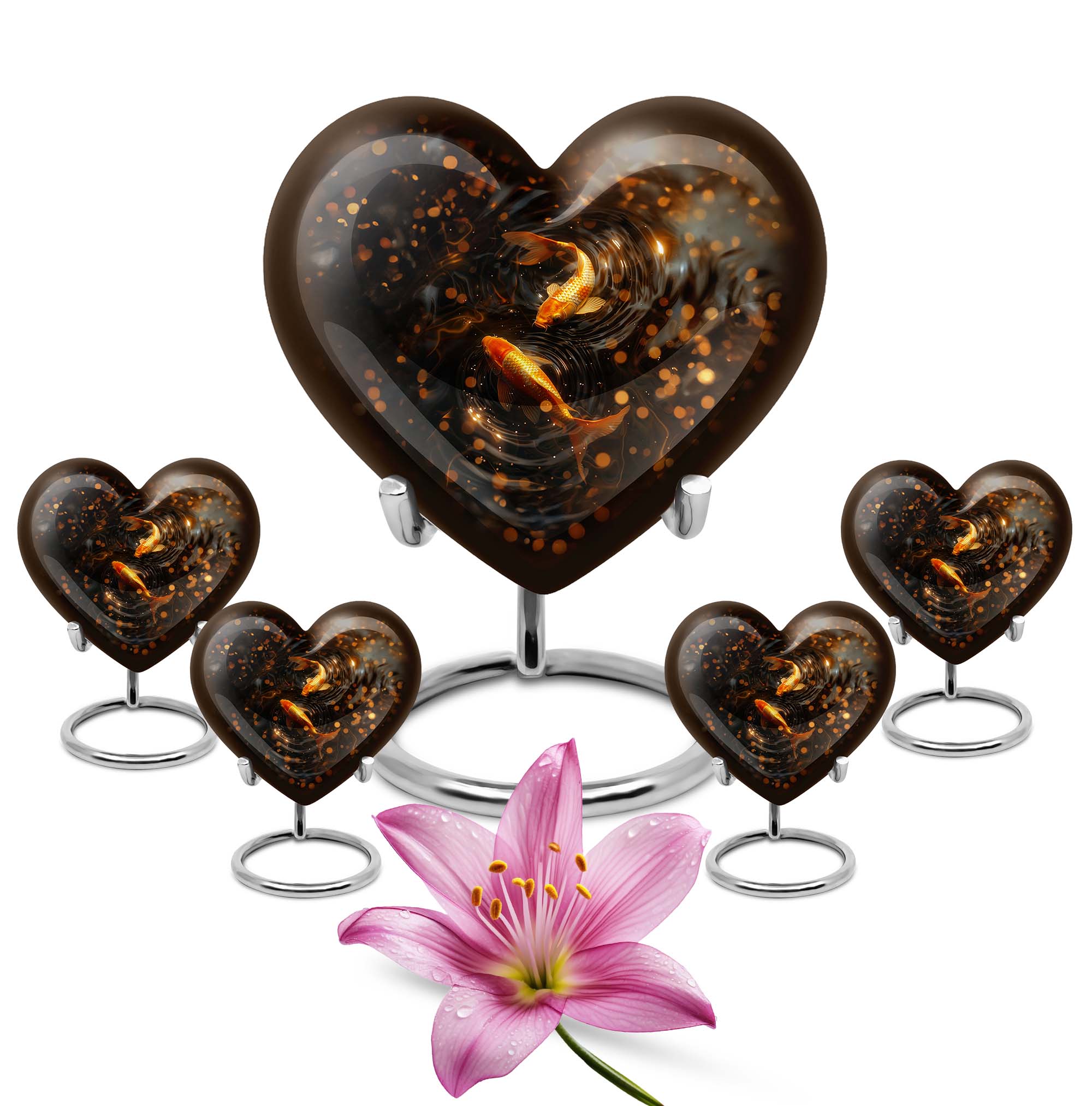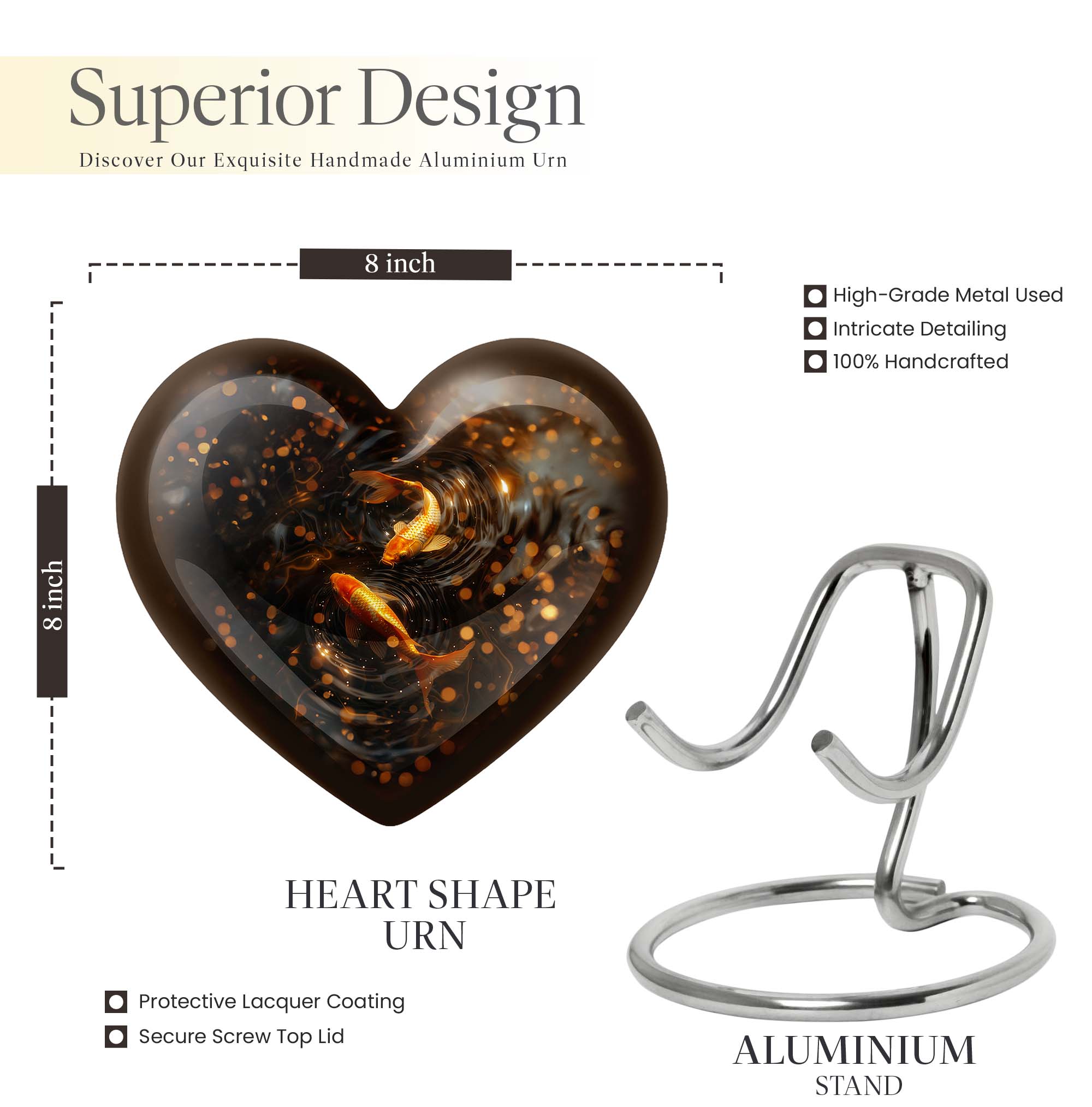 Honor the memory of your loved ones with our finely crafted 'Gold Fish Urn'. Tailored for individuals seeking memorial urns for ashes of an adult female, this exquisite artefact is made of robust aluminium – symbolising both the strength and resilience of enduring memories. Its heart urn theme lends it a soaring aura of affection and nobility, further gilded by an enchanting butterfly motif. With dimensions standing at 10 inches and a capacity of 200 cubic inches, this Large Urn provides a roomy haven for the cherished ashes. Weighing a modest 3.3 pounds, it is easily manoeuvrable, easing the burden on your bereaved heart. We offer the option to personalize this cremation urn with engraved names, adding an intimate touch to your remembrance. A velvet pouch accompanies the package for effortless containment of ashes. Amid your pursuit of cremation medium urns for human ashes, or shape boxes for gifts, let our heart urn serve as an emblem of your enduring love and remembrance, making the grieving process feel a smidgen lighter.