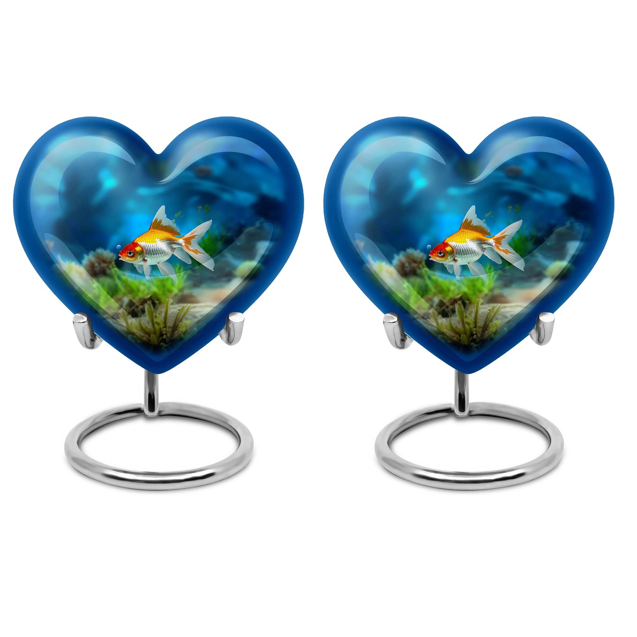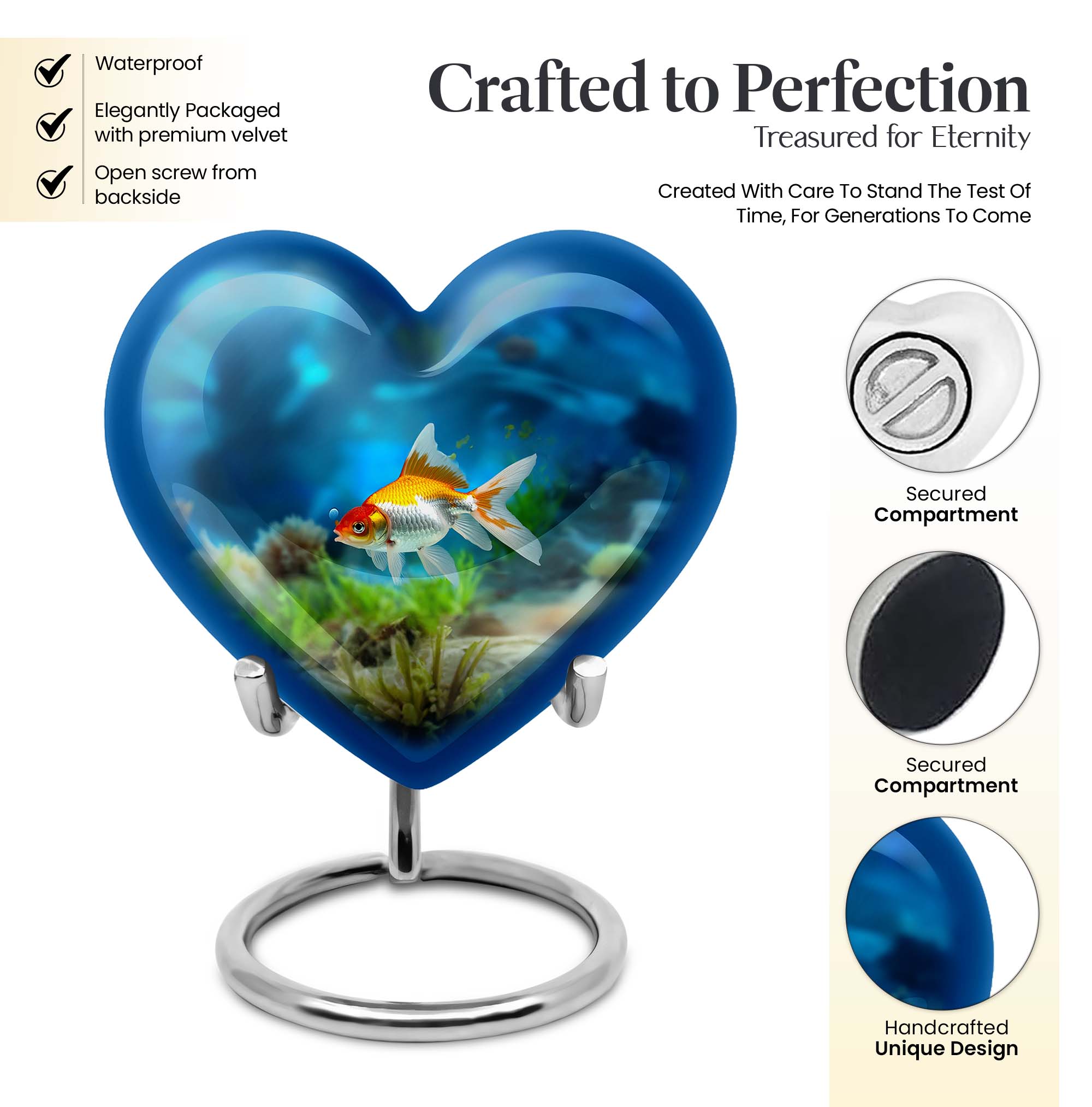 Elevate your remembrance ceremony with this exquisite Gold Fish Urn, a beacon of hope and love during a time of profound sadness. With a height of 10 inches and a weighing an easy 3.3 pounds, the urn is substantial yet manageable. The heart-shaped urn, skillfully crafted from robust aluminium, reflects the eternal love and connection shared. It even allows a touch of personalization by engraving names, creating a unique tribute. Offering a considerable capacity of 200 cubic inches, it's suitable for containing ashes of adult individuals of either gender impeccably. Each purchase includes a velvet pouch, enhancing the urn's portability while ensuring safety for the treasured contents it holds. The butterfly theme imparts a sense of serenity, in keeping with the solemnity of the occasion. People in search of 'funeral decorative urns' or 'memorial urns for human ashes adult female,' will find this heart urn meets their needs and beyond. Express your loving remembrance with this truly memorable 'cremation urn'