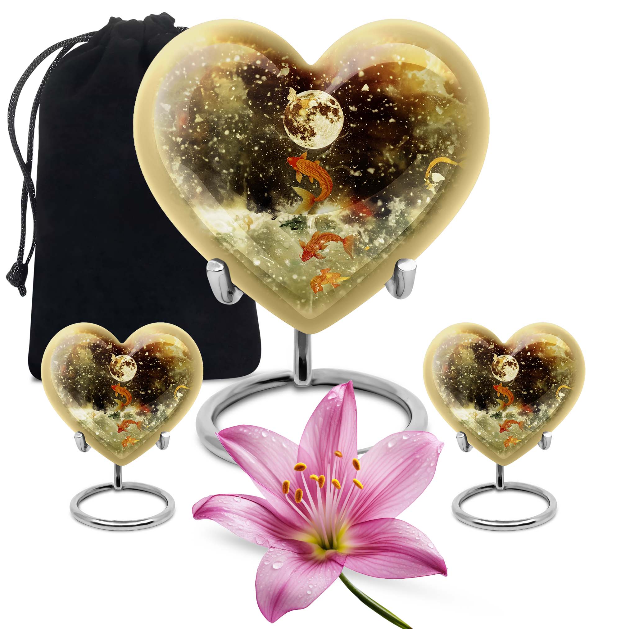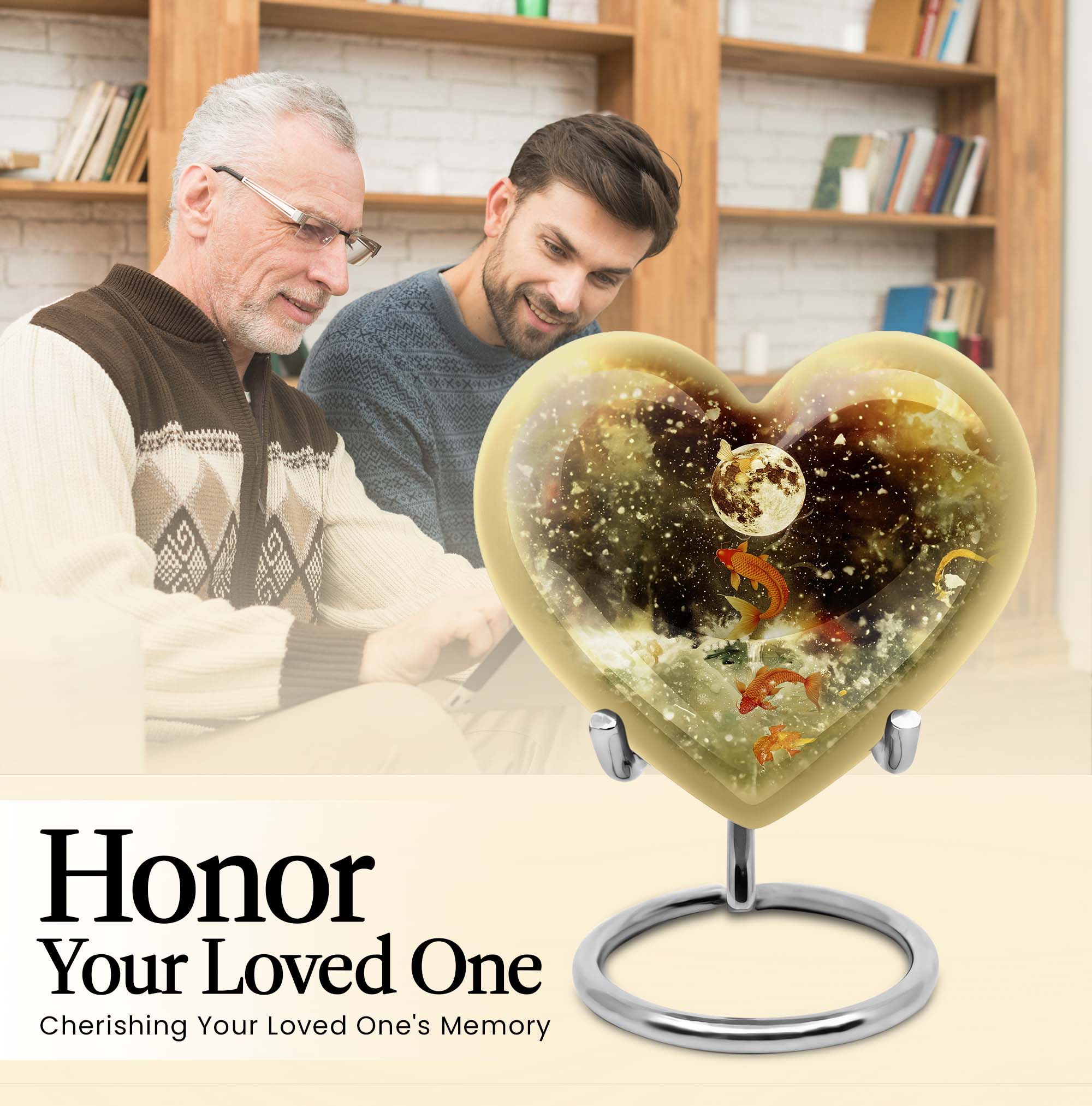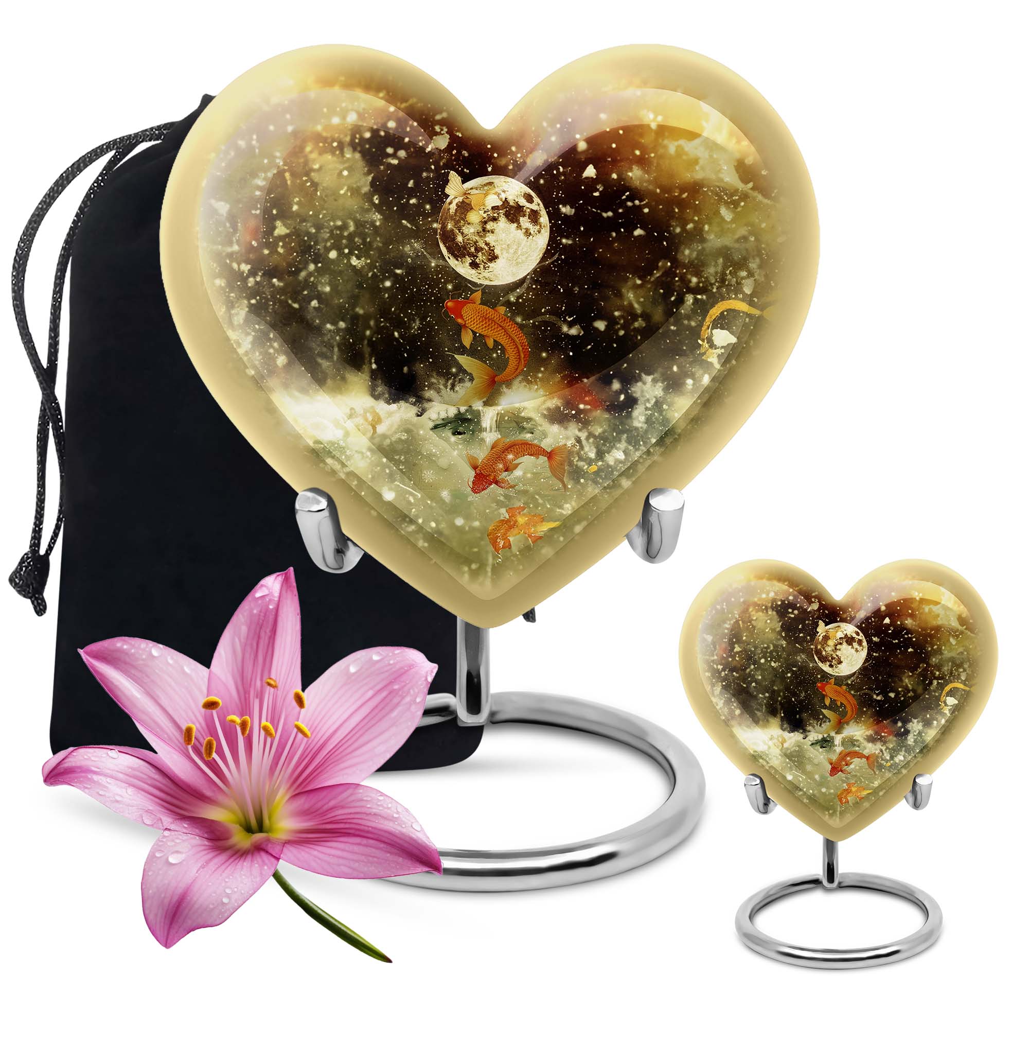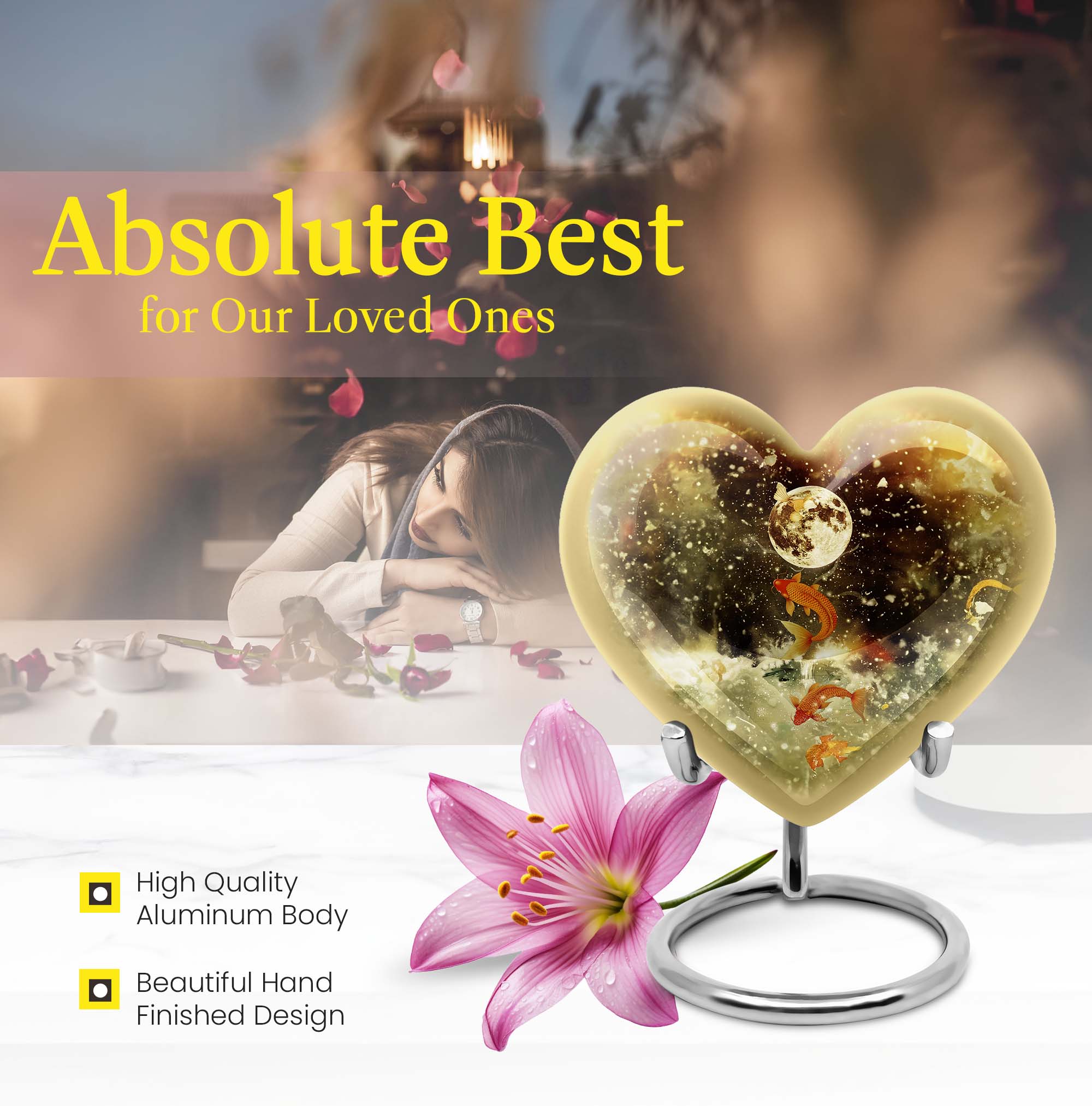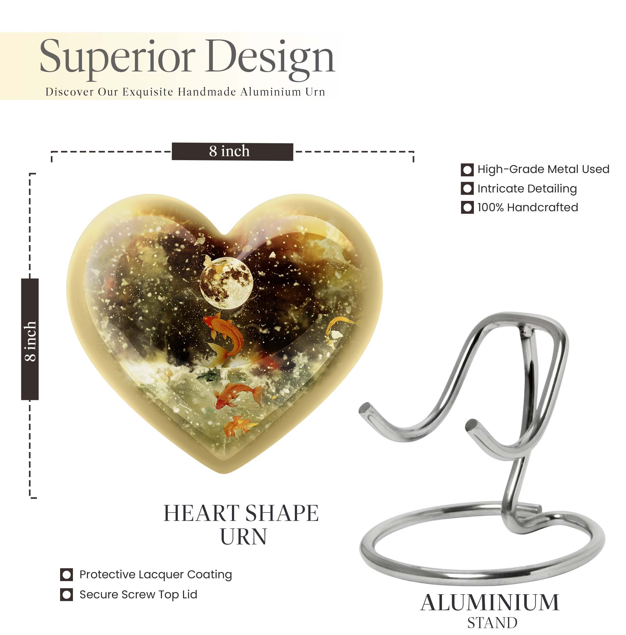 Experience a beautiful and lasting tribute to your cherished loved one with our unique 10-inch Heart Urn. Exquisitely crafted from high-quality aluminium, this large capacity urn effortlessly blends the abstract theme with a heartfelt message. It effortlessly accommodates up to 200 cubic inches of ashes, making it a suitable choice for funeral urns for ashes adult. Dignified and solemn, the urn comes with a soft velvet pouch providing an extra layer of protection and containment of the ashes. Weighing just 3.3 pounds, this urn effortlessly combines beauty with durability. Savour the option to personalize it with the engraved names of your dear departed – a heartfelt reminder of the vibrant reminiscences. This urn goes beyond traditional memorial urns, offering a versatile solution for commemorating your loved one's legacy. It serves as an excellent choice for those searching for fish Urn or funeral urns for adult male dad, bringing a sense of peace and solace during the toughest of times.