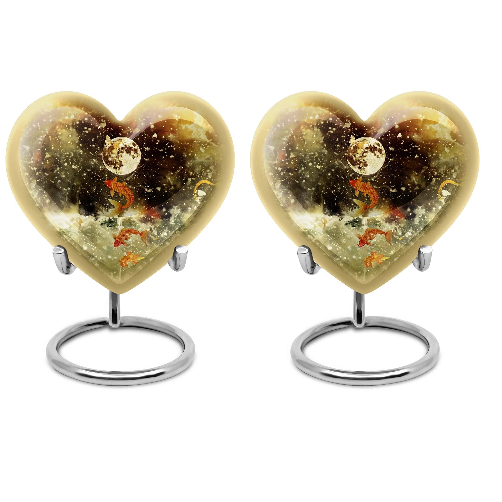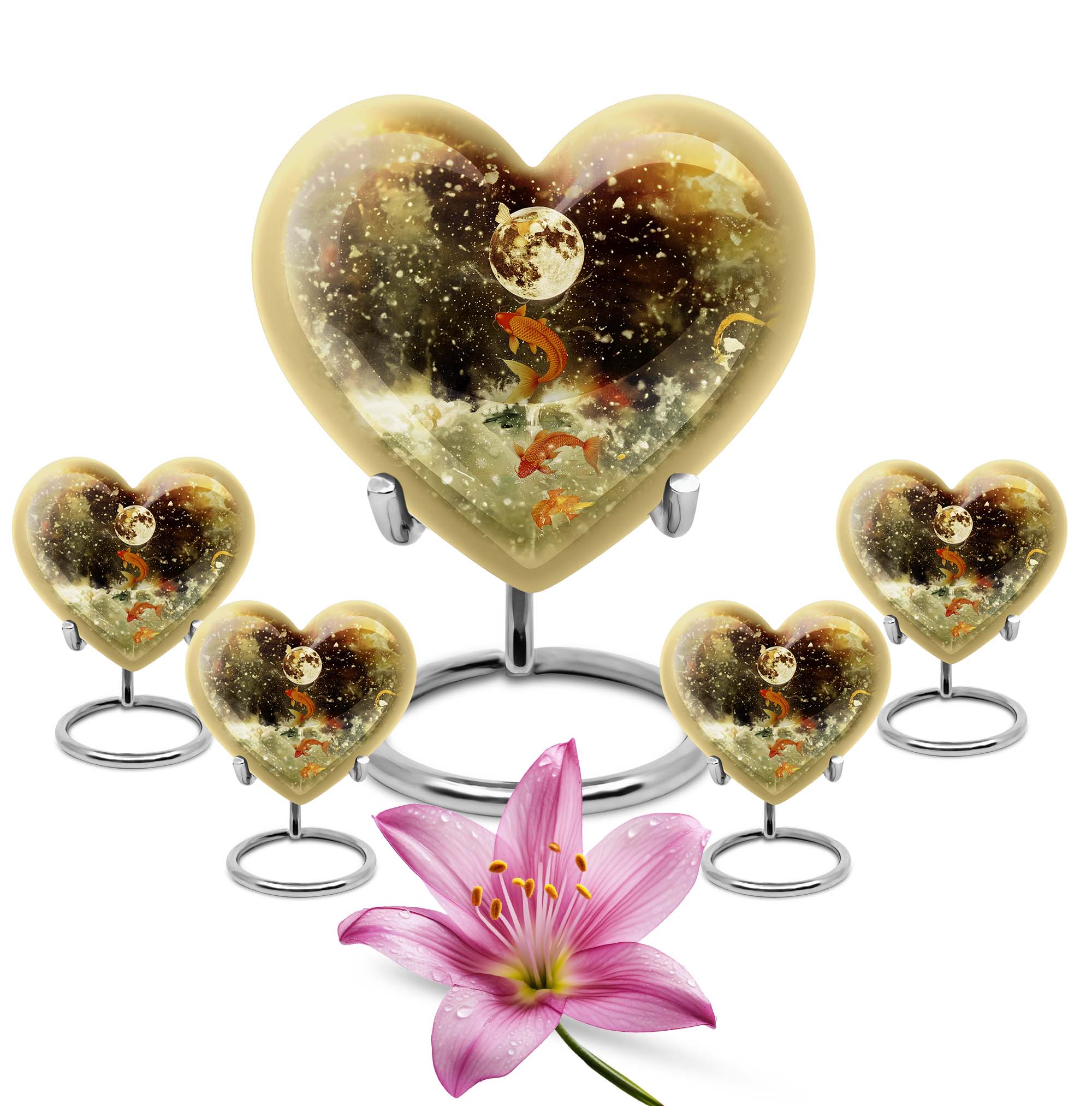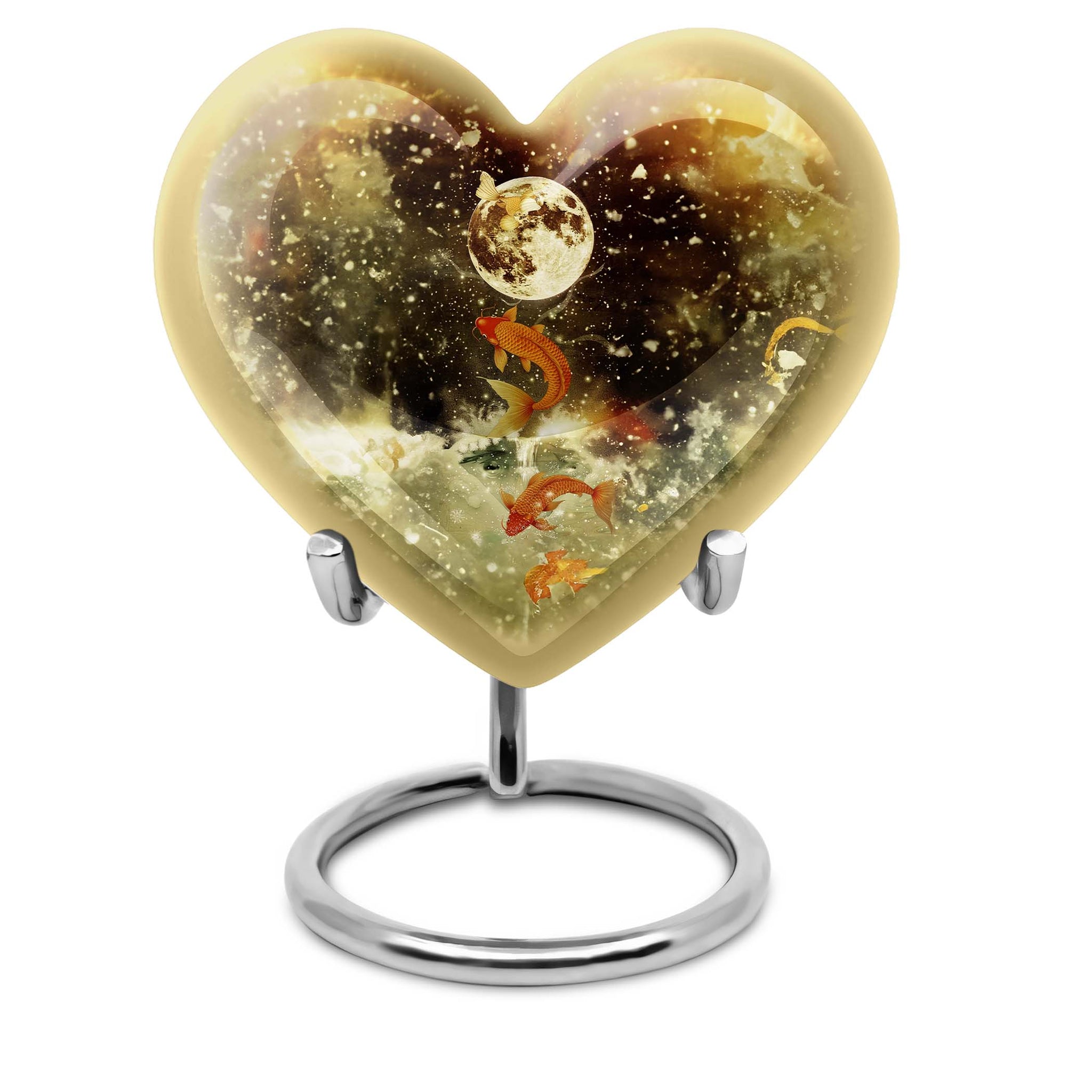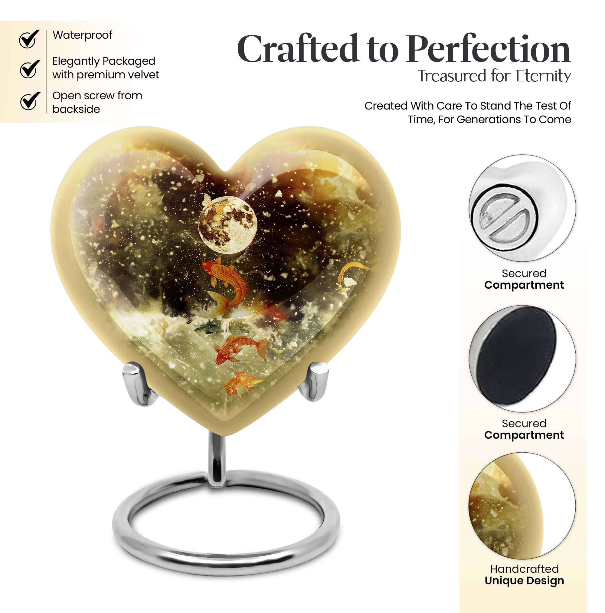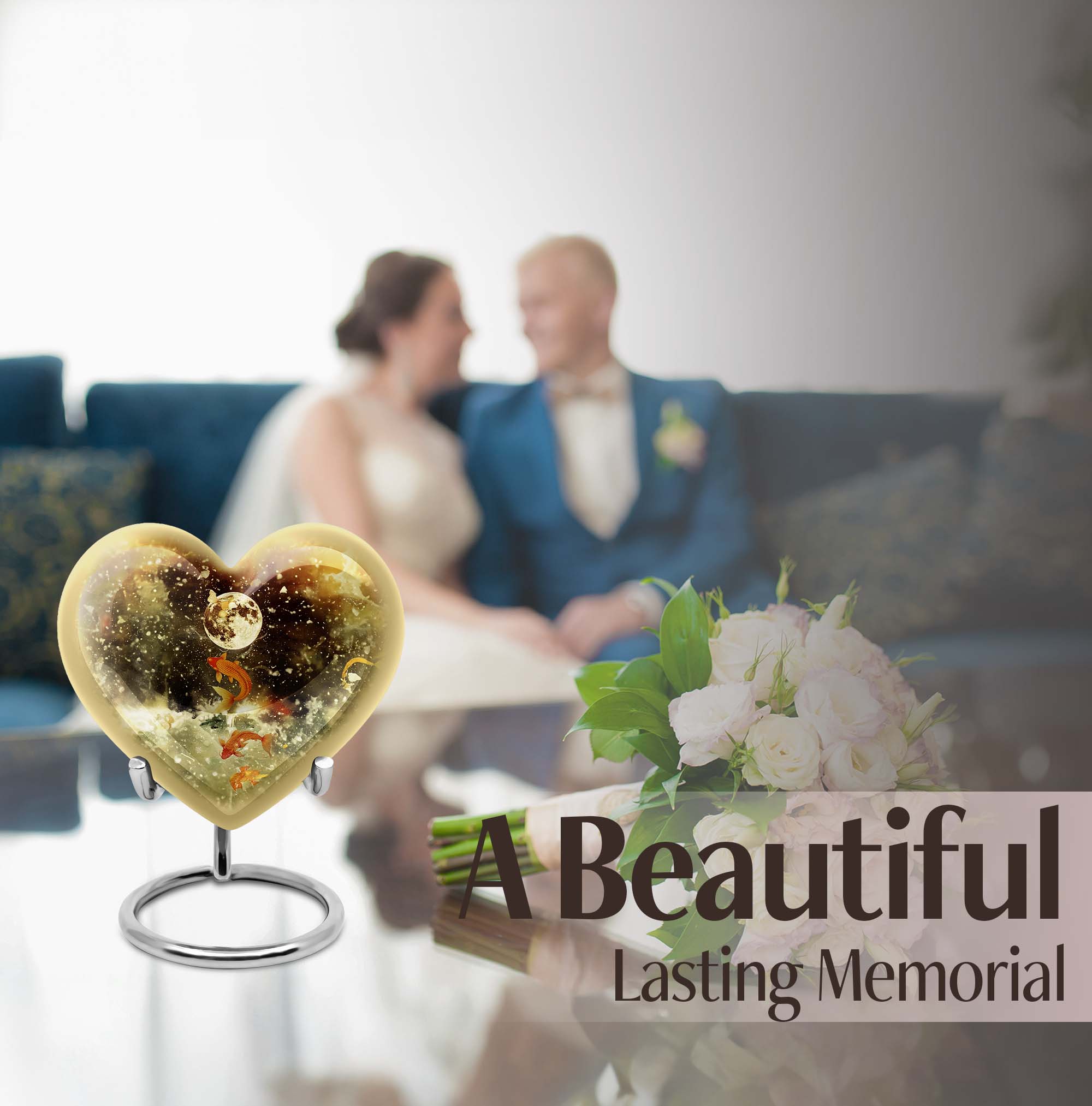 Experience a beautiful and lasting tribute to your cherished loved one with our unique 10-inch Heart Urn. Exquisitely crafted from high-quality aluminium, this large capacity urn effortlessly blends the abstract theme with a heartfelt message. It effortlessly accommodates up to 200 cubic inches of ashes, making it a suitable choice for funeral urns for ashes adult. Dignified and solemn, the urn comes with a soft velvet pouch providing an extra layer of protection and containment of the ashes. Weighing just 3.3 pounds, this urn effortlessly combines beauty with durability. Savour the option to personalize it with the engraved names of your dear departed – a heartfelt reminder of the vibrant reminiscences. This urn goes beyond traditional memorial urns, offering a versatile solution for commemorating your loved one's legacy. It serves as an excellent choice for those searching for fish Urn or funeral urns for adult male dad, bringing a sense of peace and solace during the toughest of times.