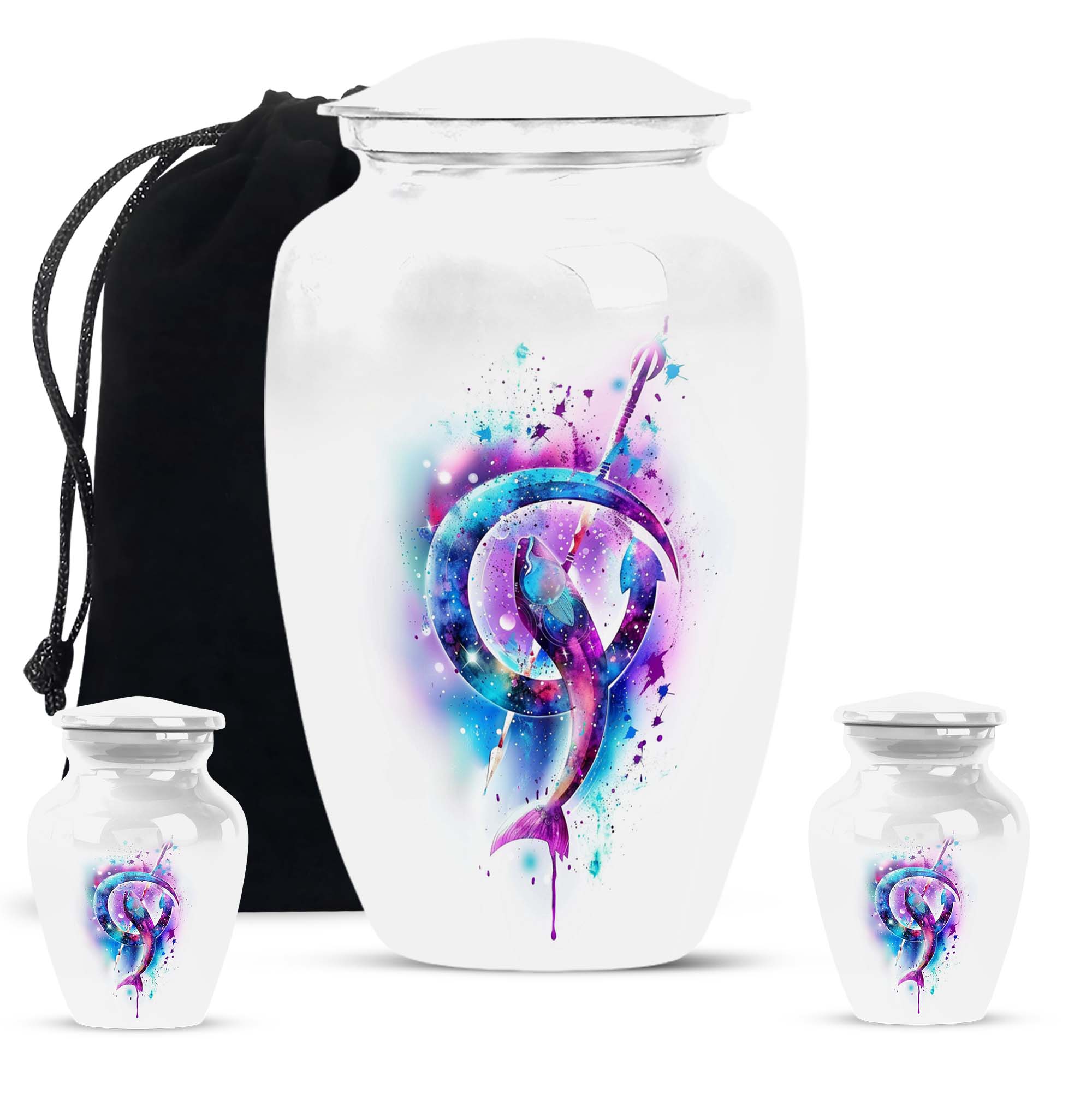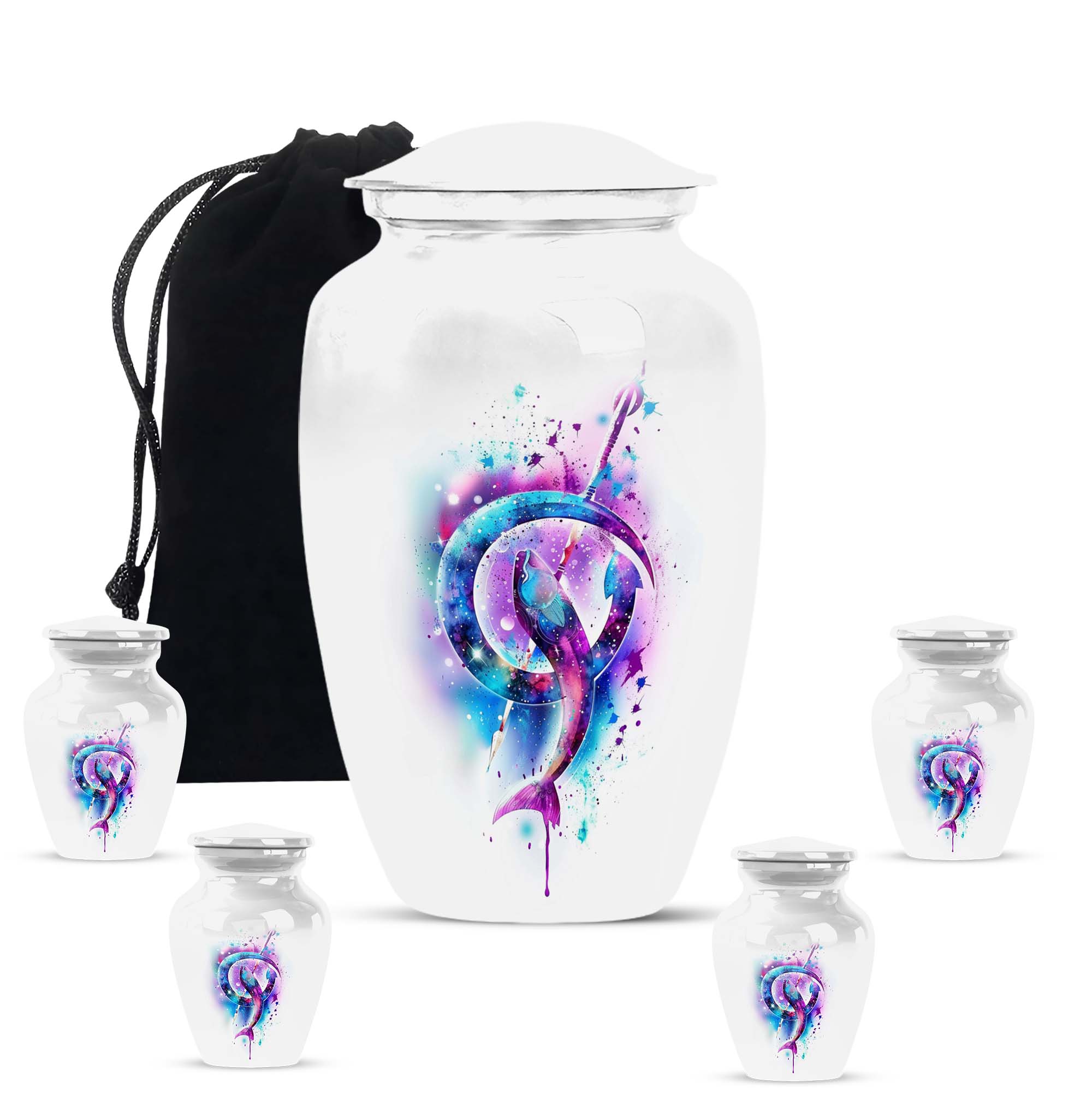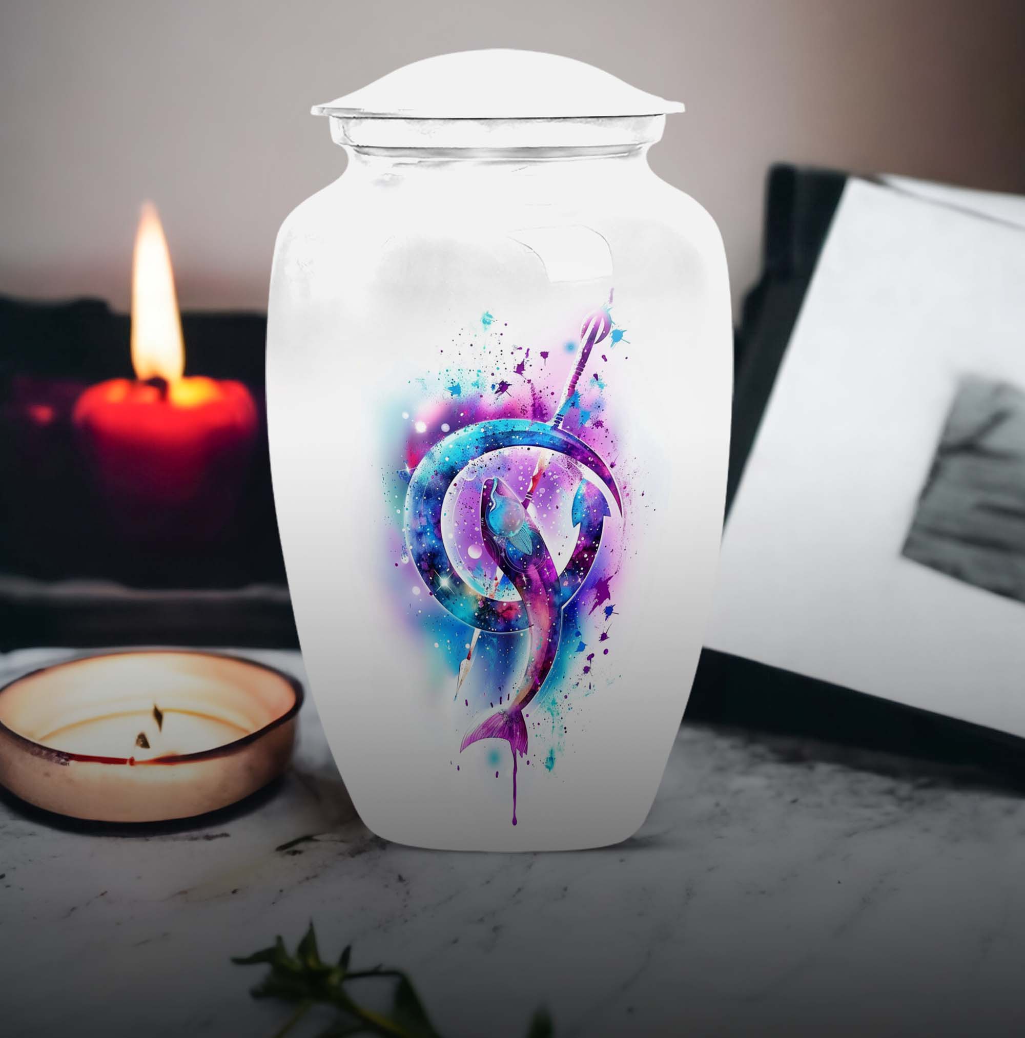 Rediscover the absolute tranquility of a lost loved one with our 10-inch abstract-themed fish Urn. This urn is not just any regular memorial urn for an adult male. It's a tribute, a token to remember them dearly in a unique and unforgettable way. Crafted from premium aluminium, each urn is robust and holds significance, weighing 3.3 pounds. The urn can hold up to 200 cubic inches of ashes, offering ample space. This large urn extends the possibility of personalizing with engraved names. It unfolds a velvet pouch for suitable containment of ashes. Our cremation urn is specifically designed to serve as a respectful and custom memorial urn. They speak volumes about your love and connection with the departed. This masterpiece perfectly fits the profile of funeral medium size urns for human ashes. Considered as one of the companion cremation urns for 2 adults, it can also serve as a subtle, yet highly valuable urn for human ashes adult. The product is curated with the utmost care, consuming thorough attention to detail, ensuring longevity and operational performance.