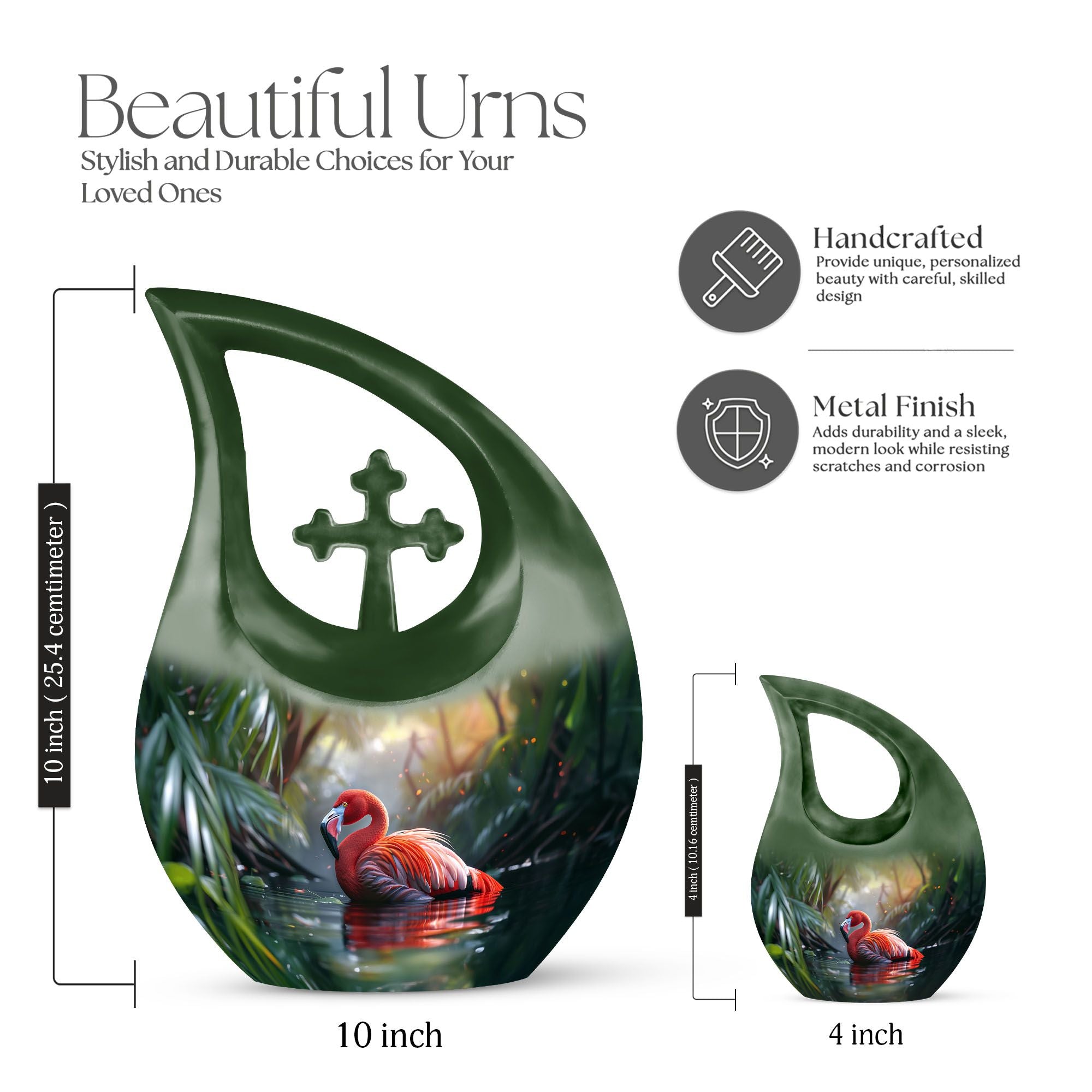 Crafted from durable aluminum, this 10 inch urn features delicate flamingo artwork symbolizing love, beauty, and serenity. Its smooth finish, secure screw-top lid, and elegant form make it ideal for families looking for tiny urns for women & men, a urn for adult male & female, or beautifully designed small urns women and women adult urn options. A perfect balance of artistry and durability, it serves as a heartfelt remembrance piece for display or memorial ceremonies.